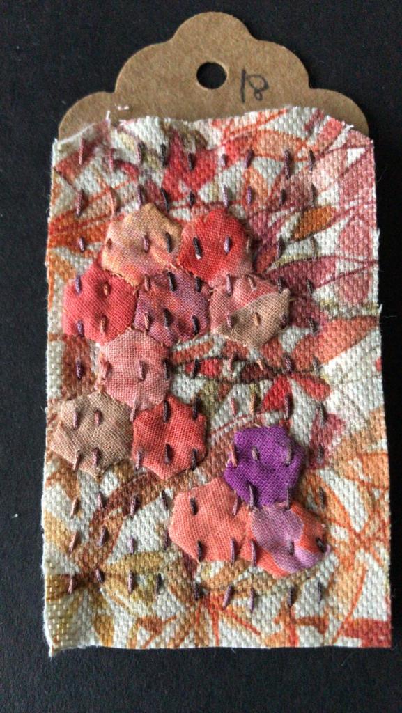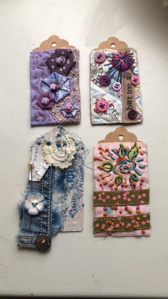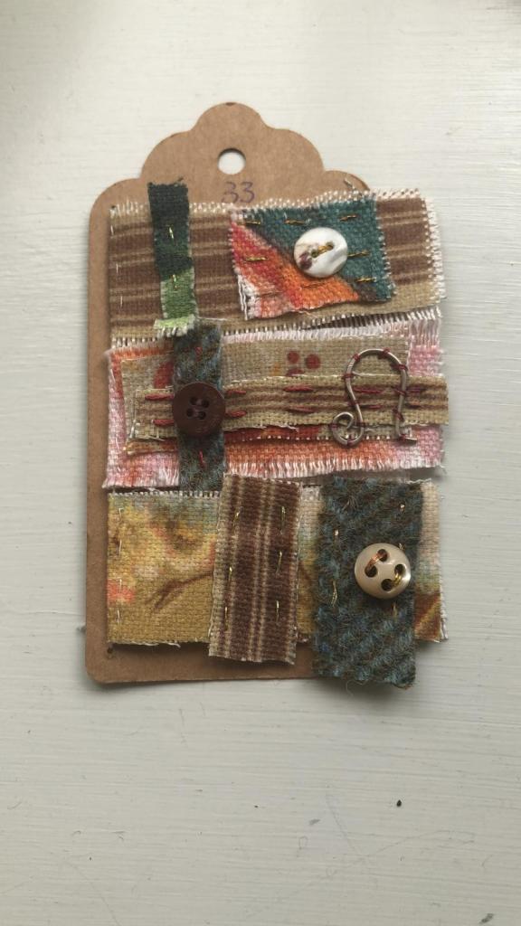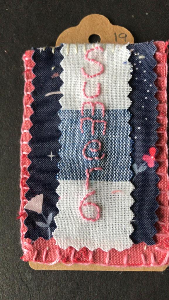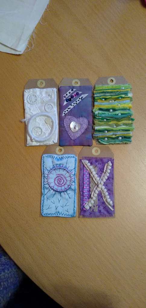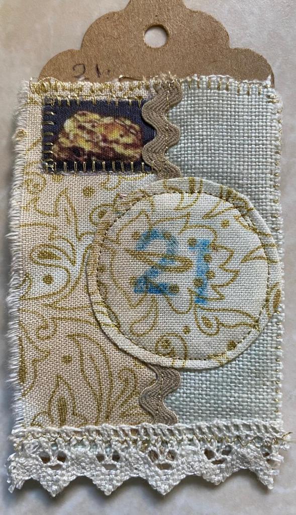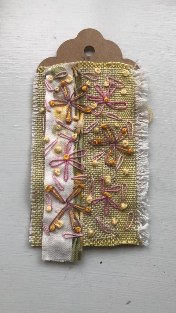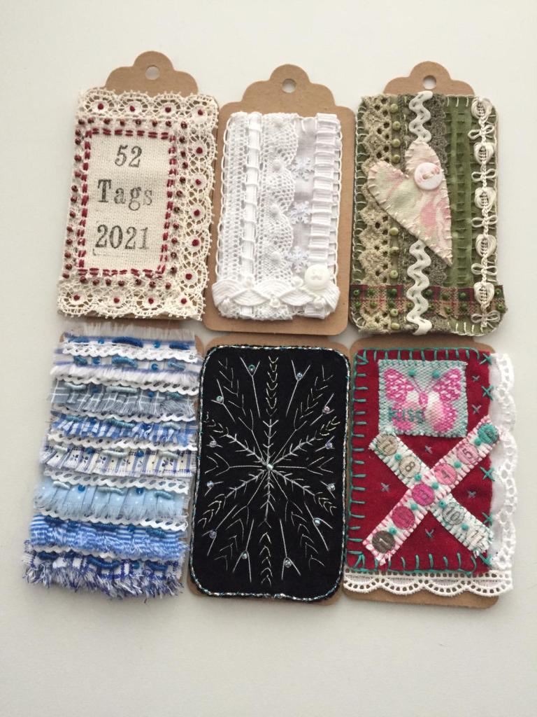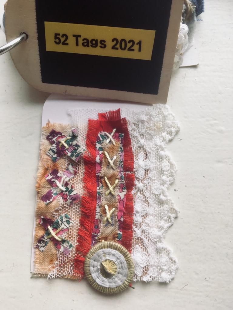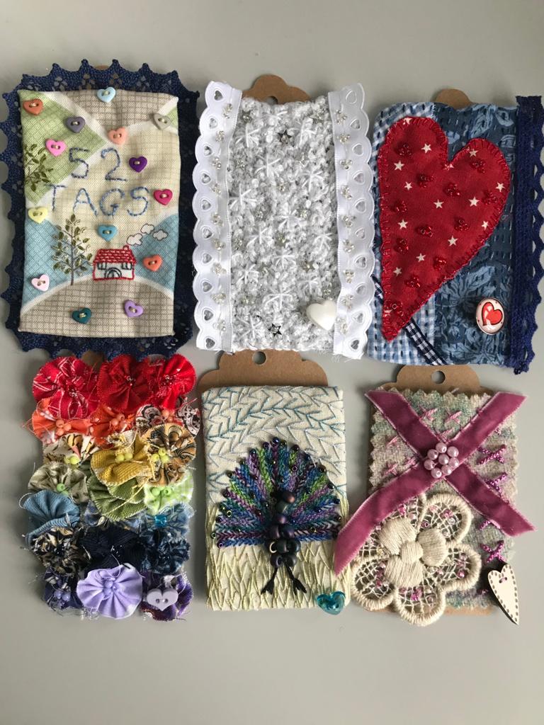 Our 2021 project was based on a challenge set by textile artist Anne Brooke, Sue V coordinated the project for our group. We created a series of mini stitched pieces, one a week for 52 weeks, each with a theme given by Anne Brooke which we attached to a luggage label or similar with the date and a memory of that week written on the reverse of the label.