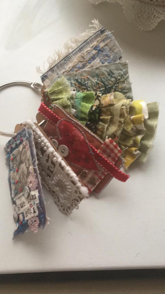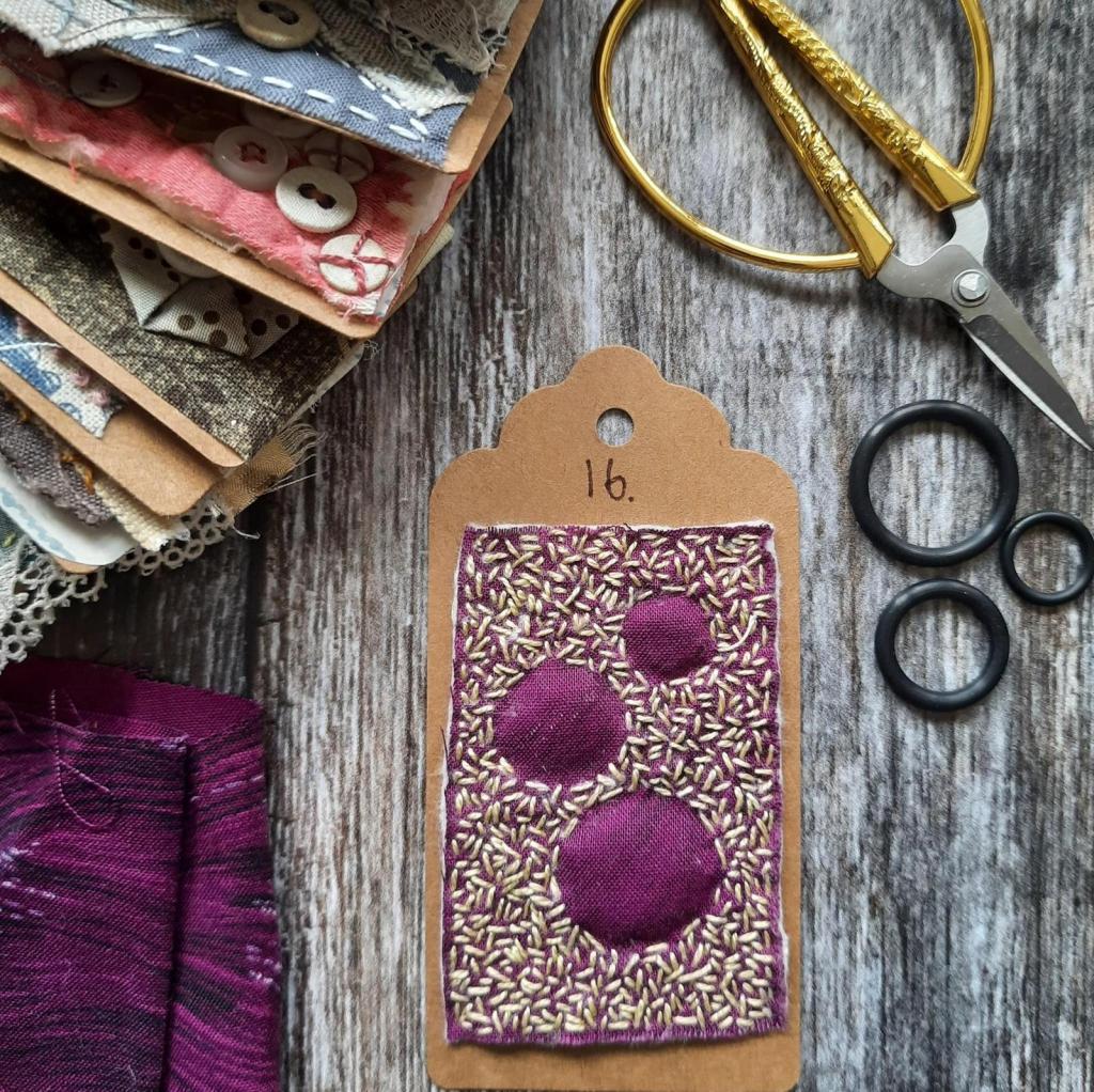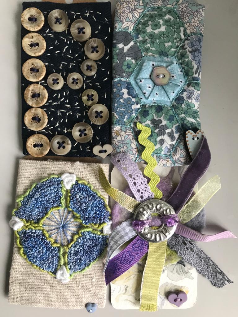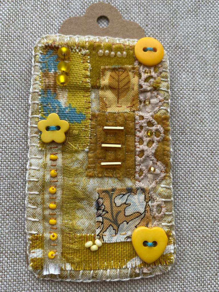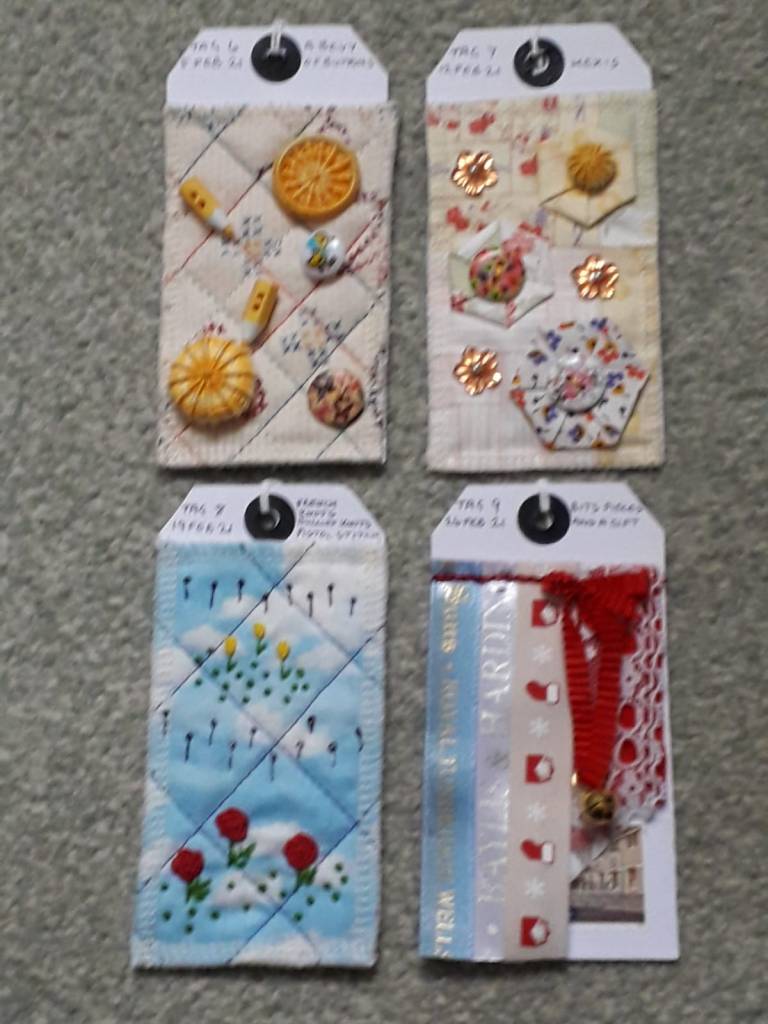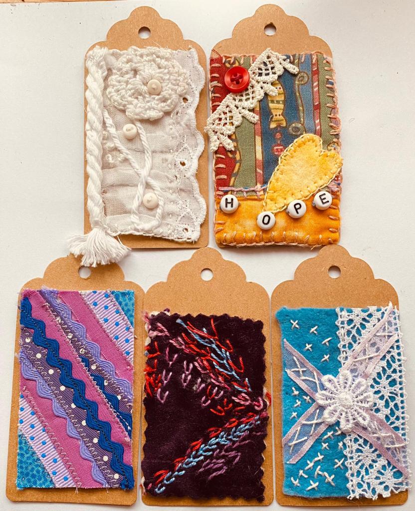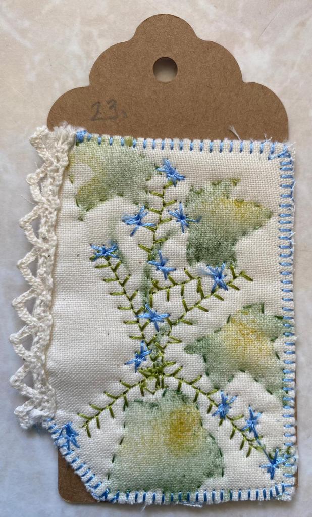 Our 2021 project was based on a challenge set by textile artist Anne Brooke, Sue V coordinated the project for our group. We created a series of mini stitched pieces, one a week for 52 weeks, each with a theme given by Anne Brooke which we attached to a luggage label or similar with the date and a memory of that week written on the reverse of the label.