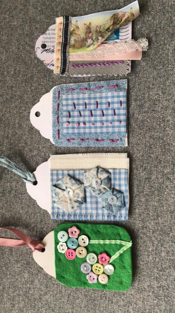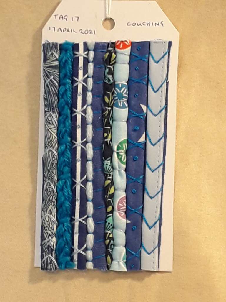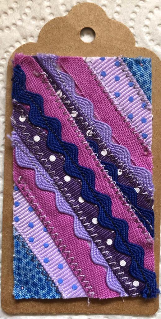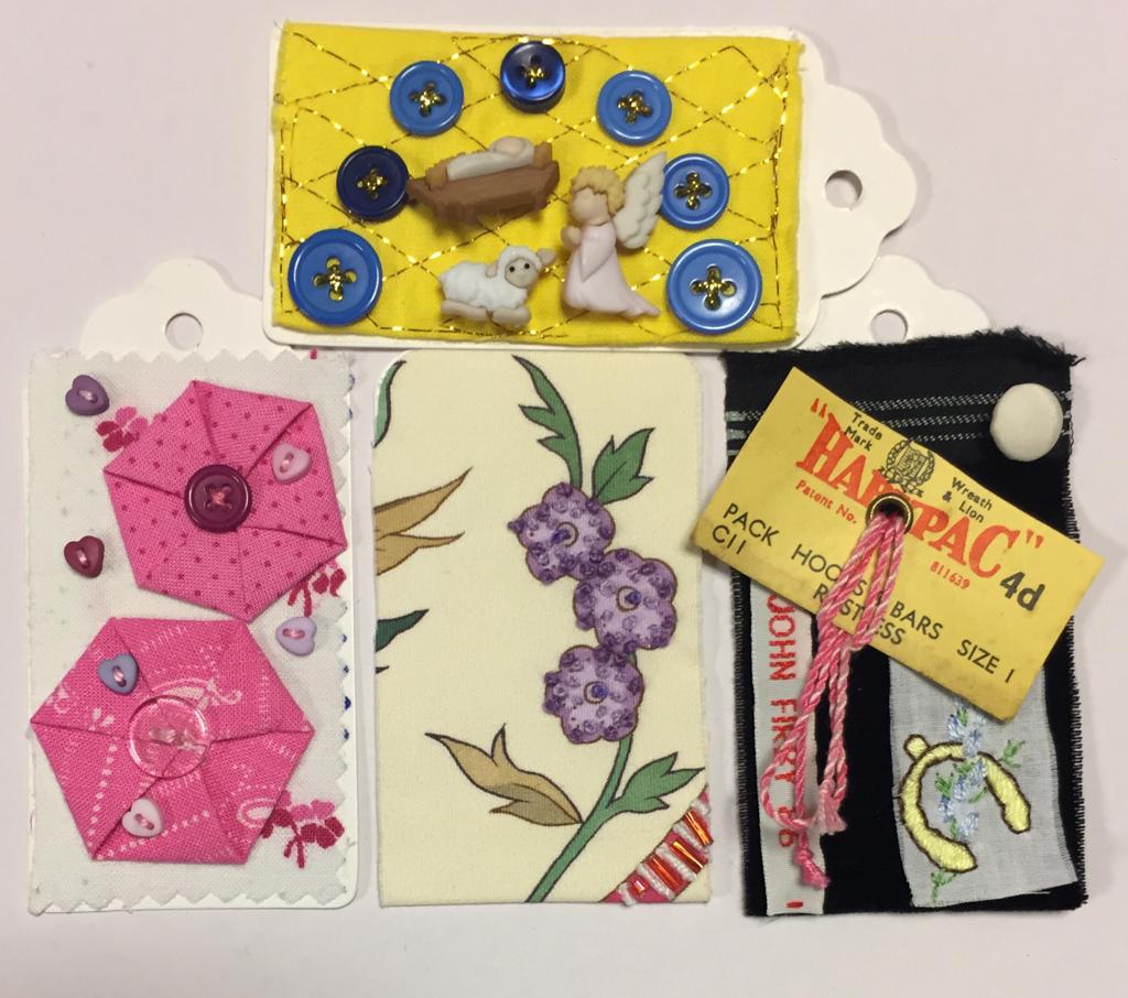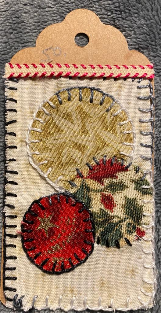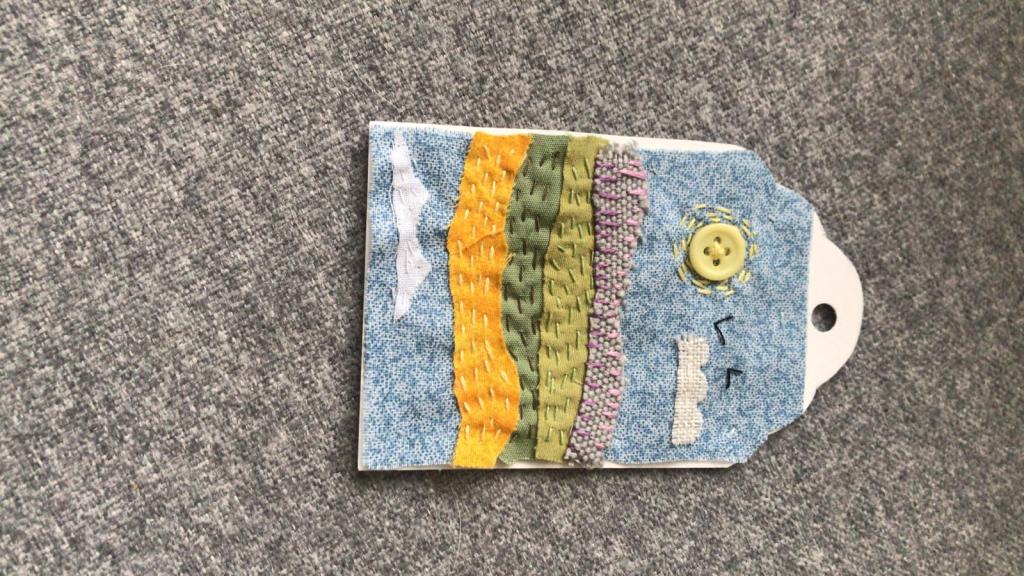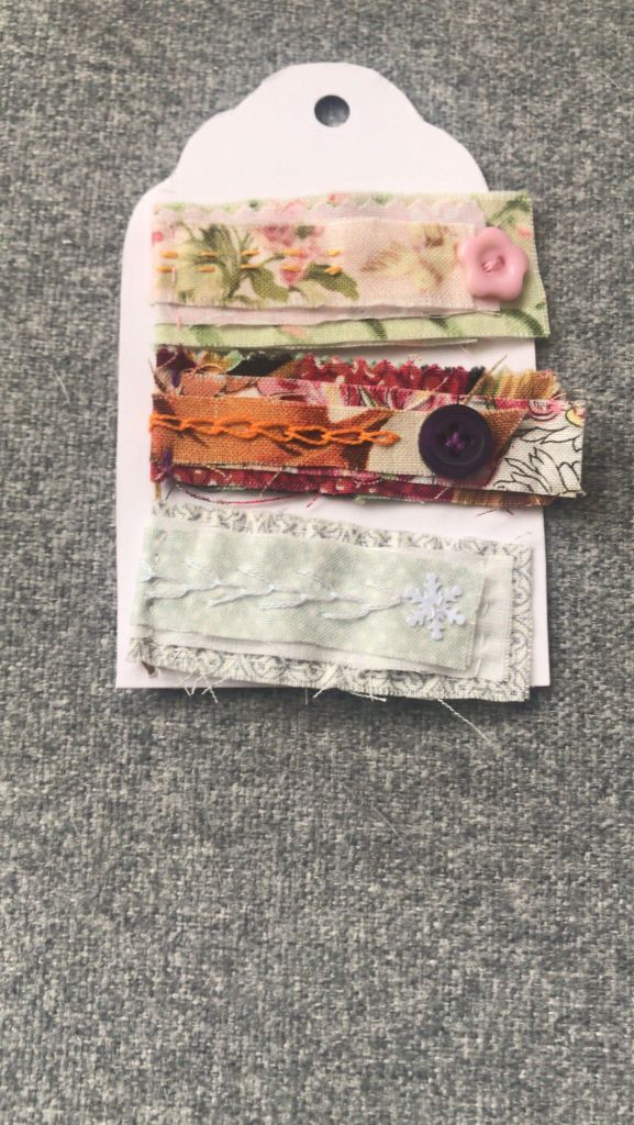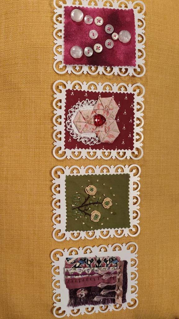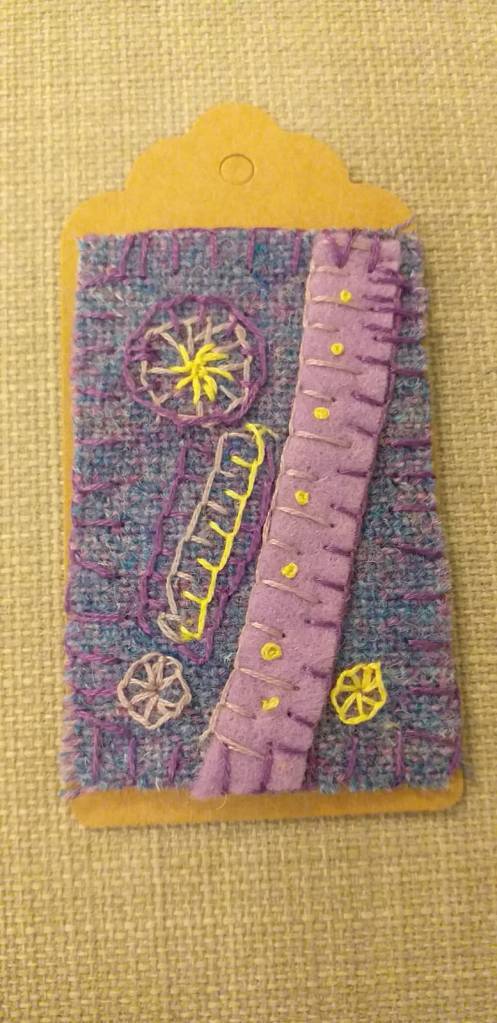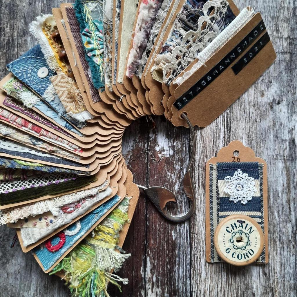 Our 2021 project was based on a challenge set by textile artist Anne Brooke, Sue V coordinated the project for our group. We created a series of mini stitched pieces, one a week for 52 weeks, each with a theme given by Anne Brooke which we attached to a luggage label or similar with the date and a memory of that week written on the reverse of the label.