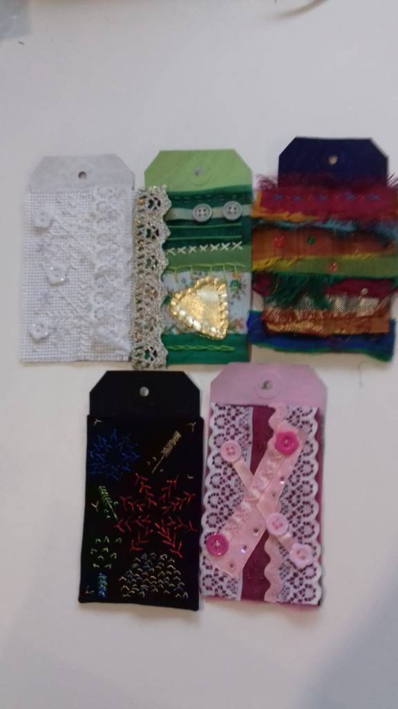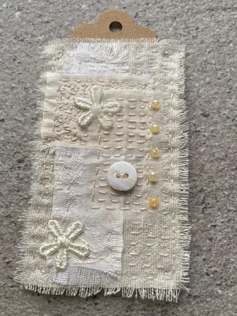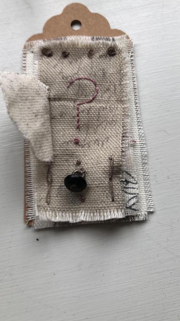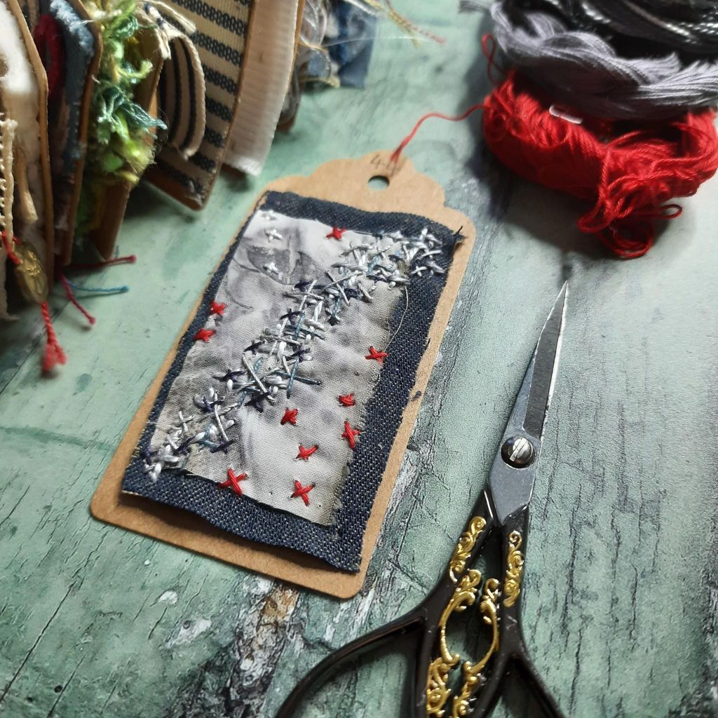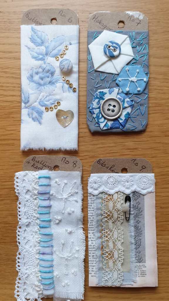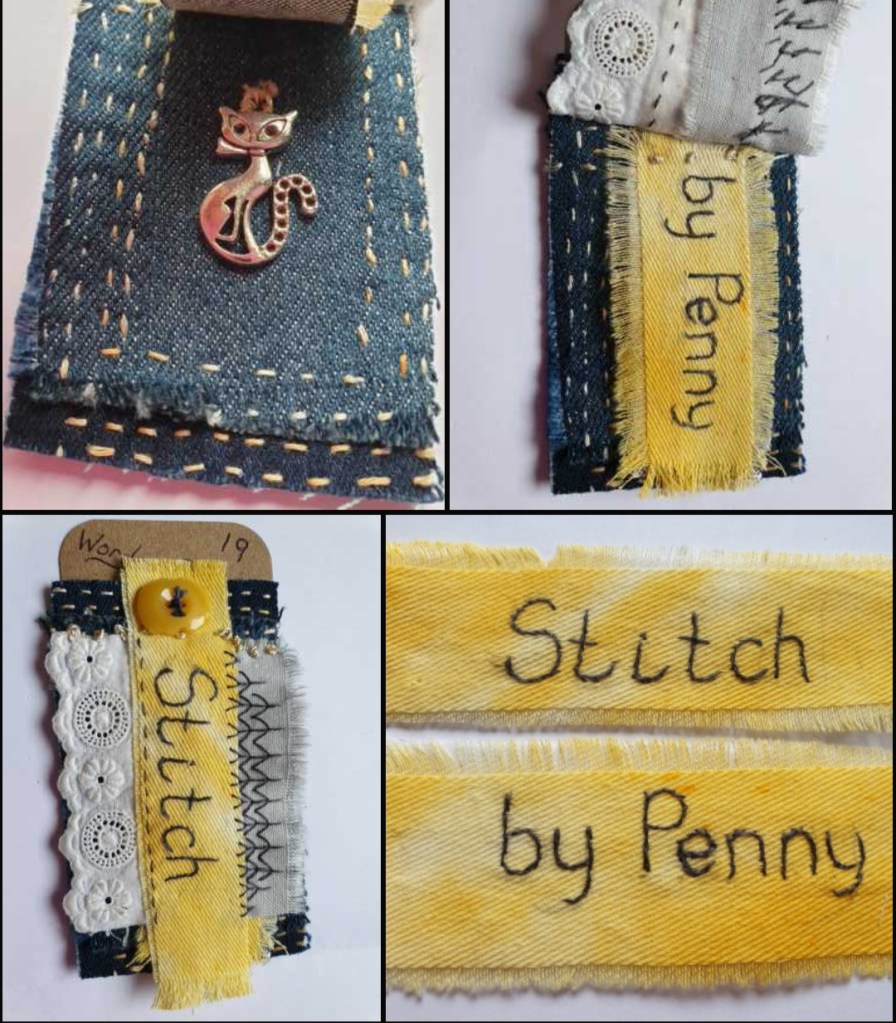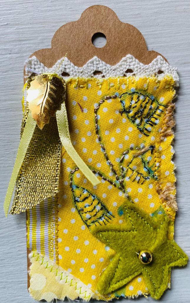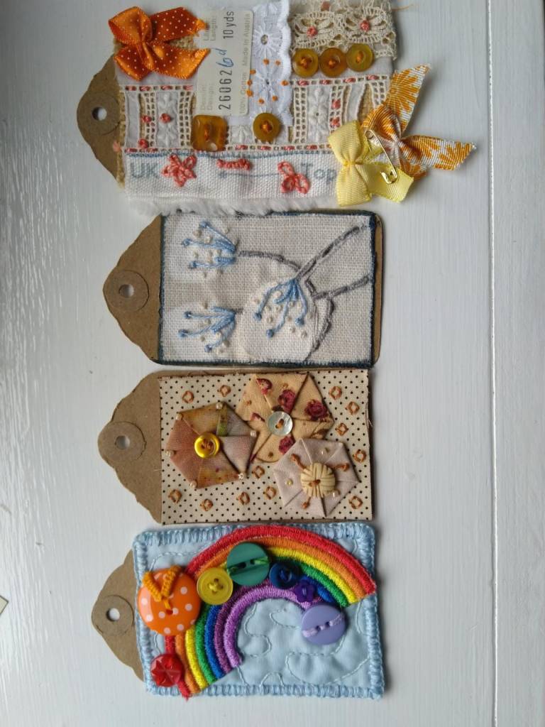 Our 2021 project was based on a challenge set by textile artist Anne Brooke, Sue V coordinated the project for our group. We created a series of mini stitched pieces, one a week for 52 weeks, each with a theme given by Anne Brooke which we attached to a luggage label or similar with the date and a memory of that week written on the reverse of the label.
