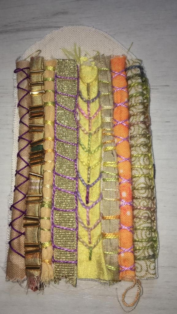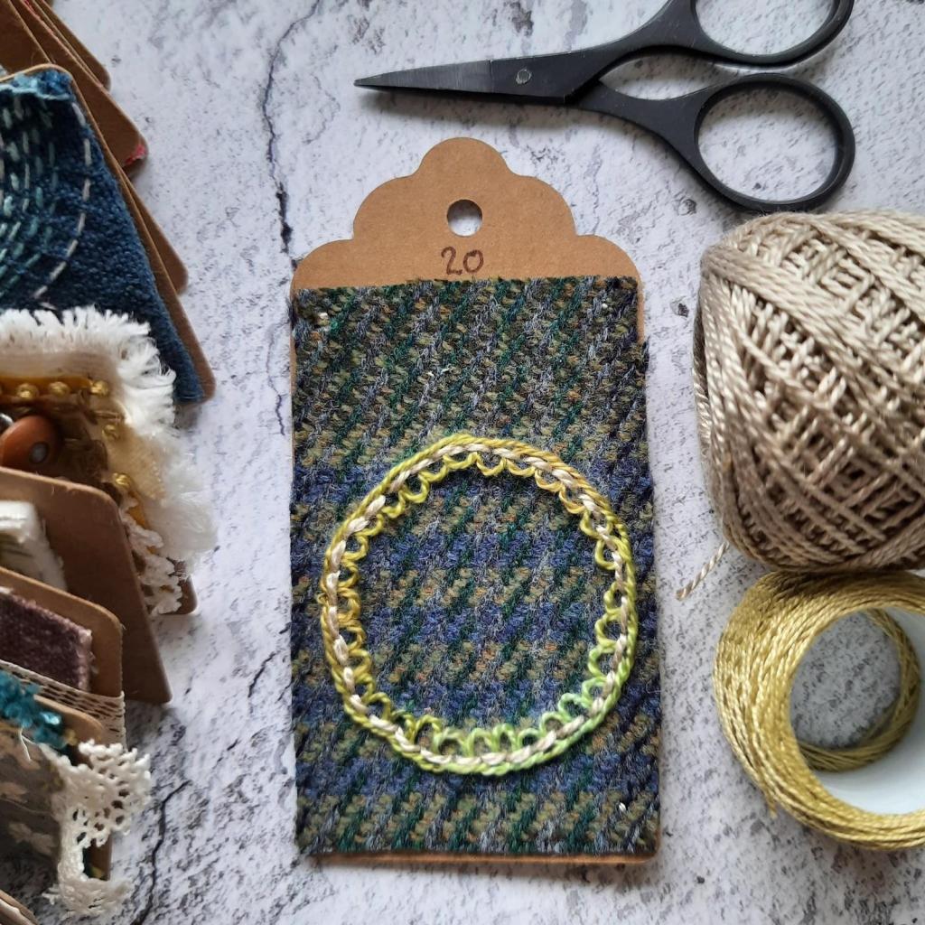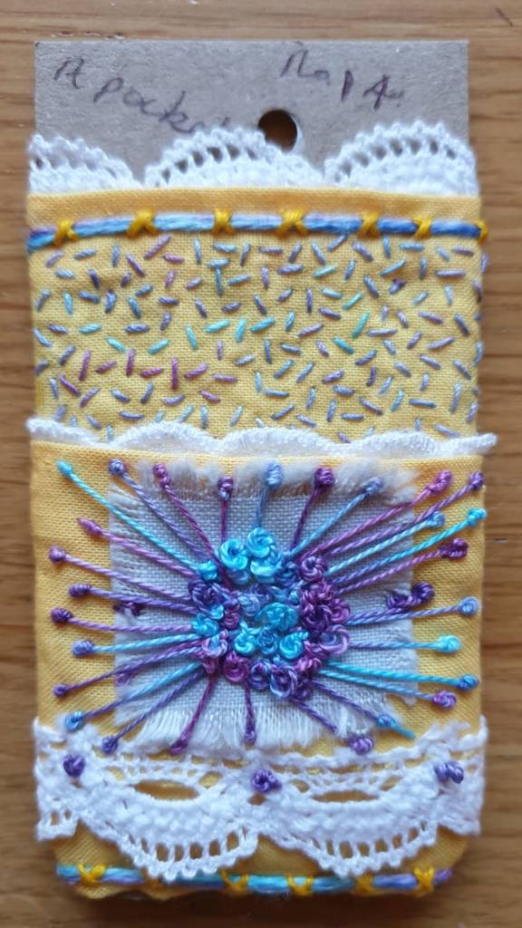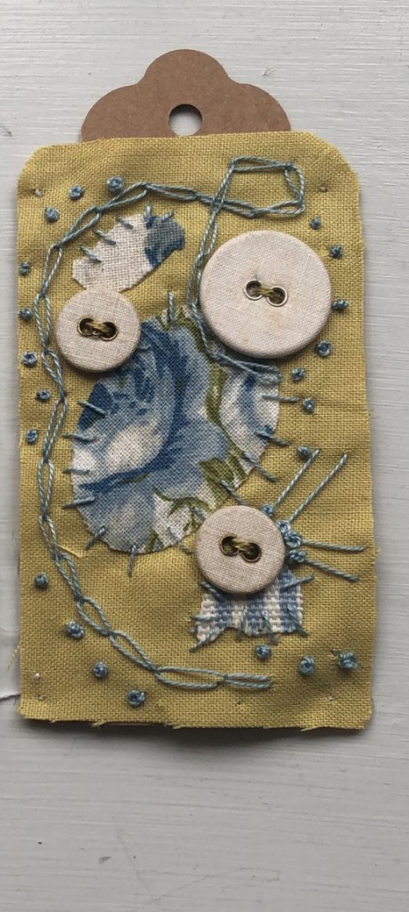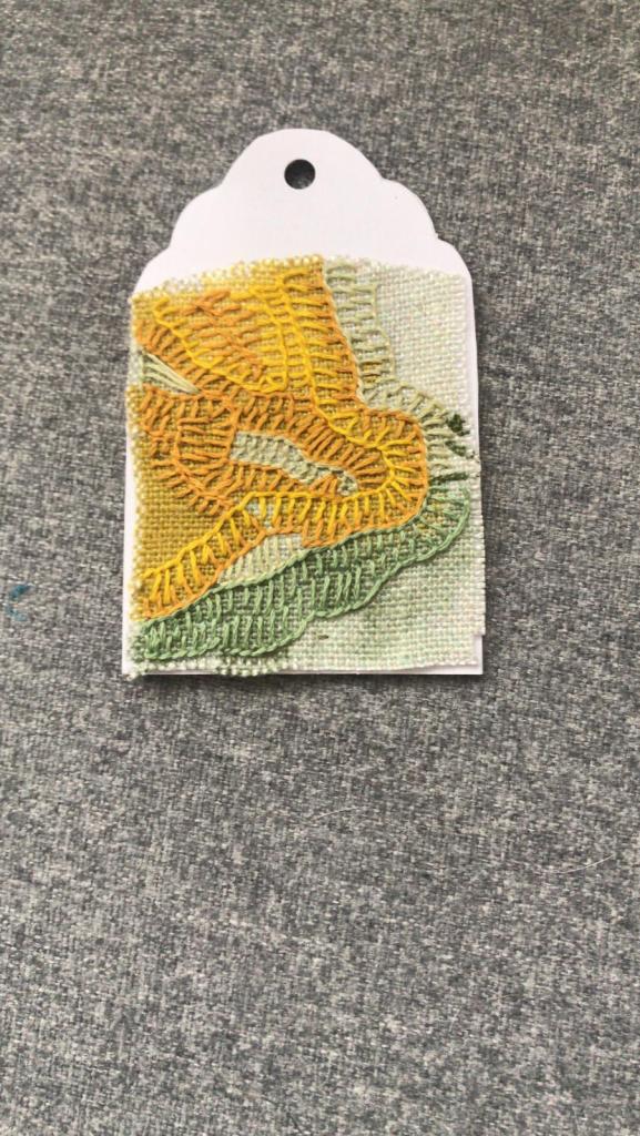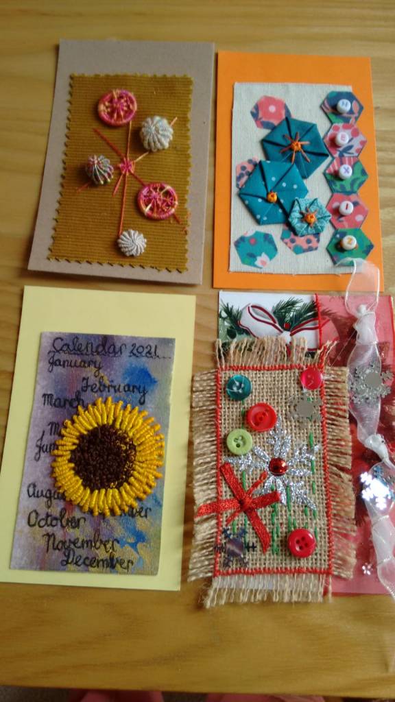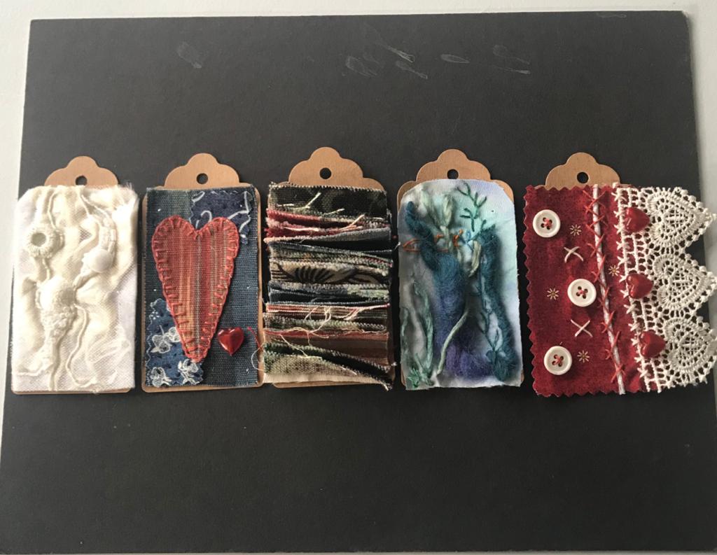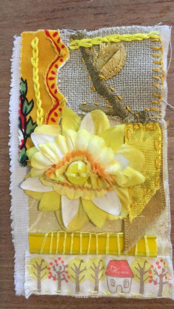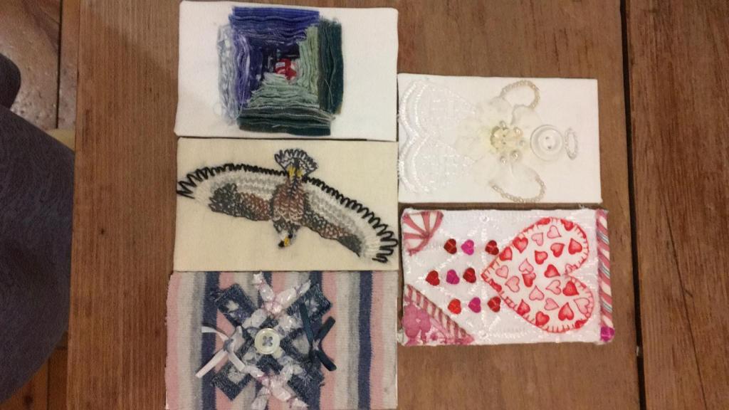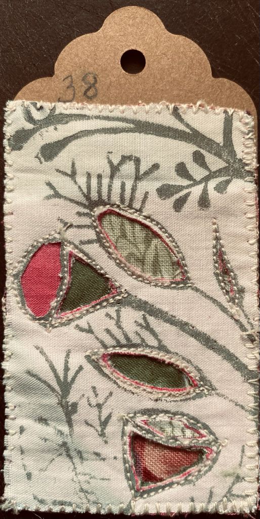 Our 2021 project was based on a challenge set by textile artist Anne Brooke, Sue V coordinated the project for our group. We created a series of mini stitched pieces, one a week for 52 weeks, each with a theme given by Anne Brooke which we attached to a luggage label or similar with the date and a memory of that week written on the reverse of the label.