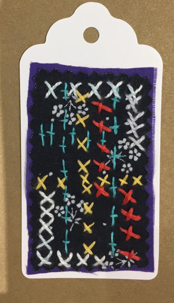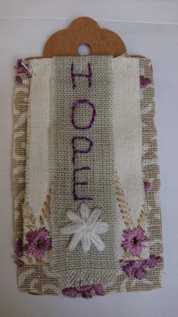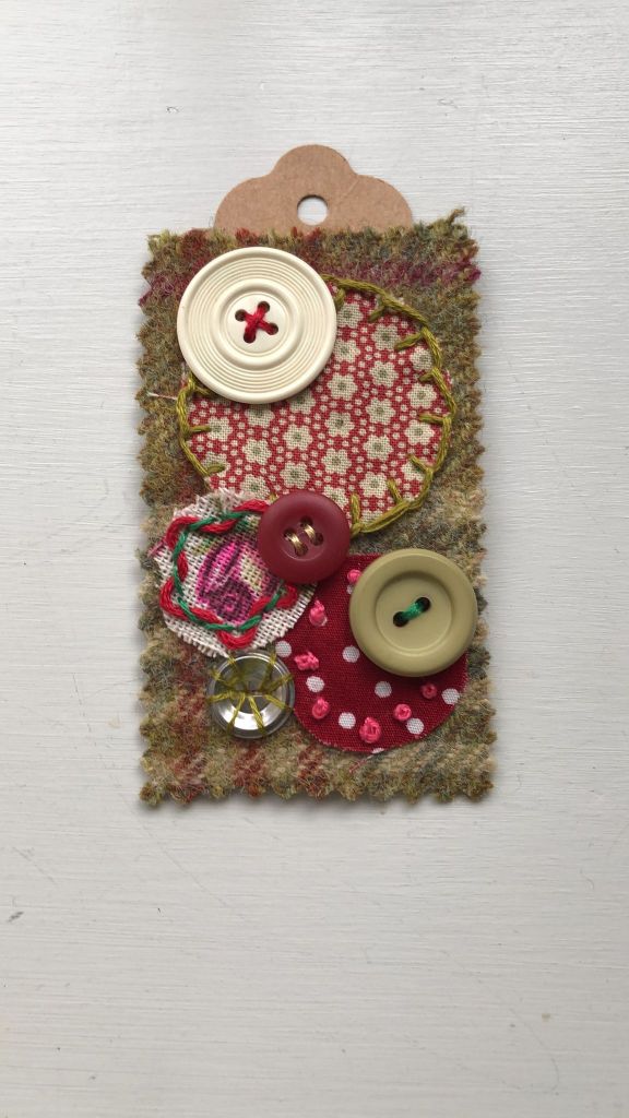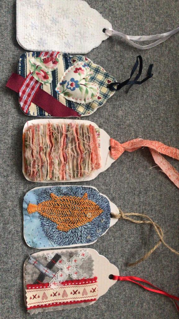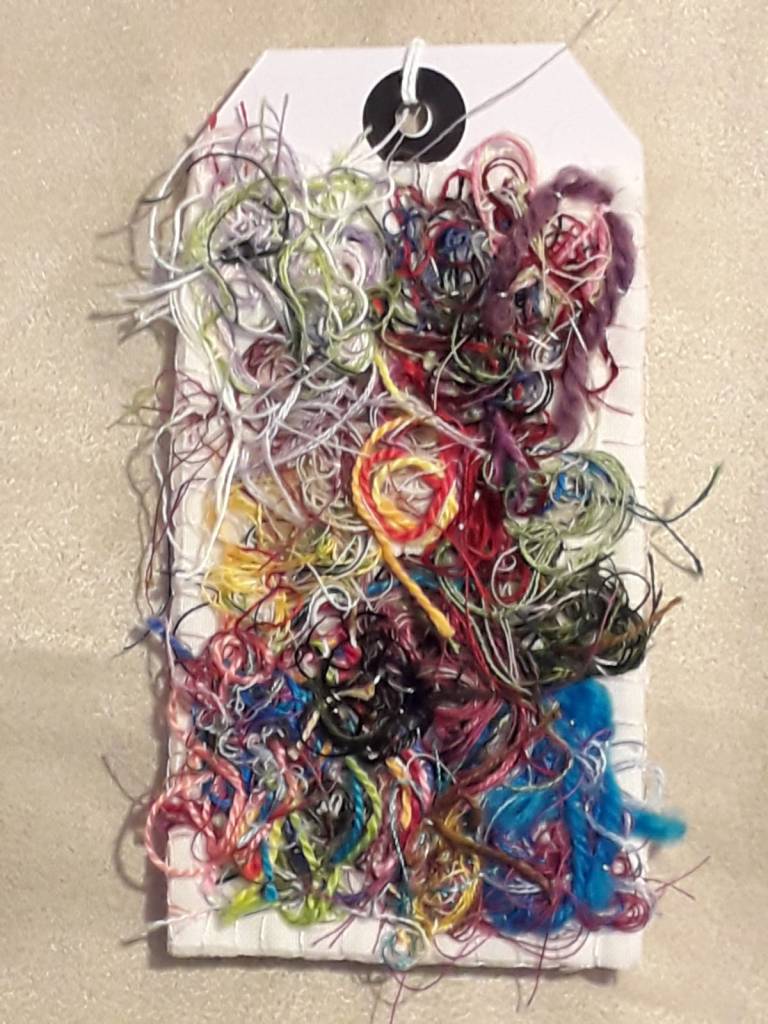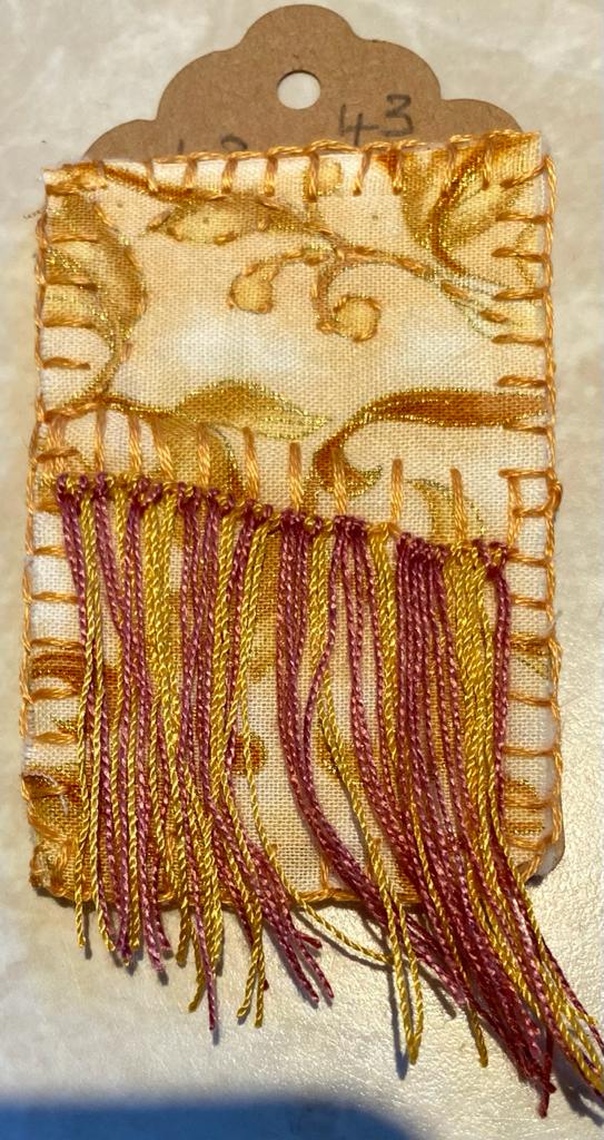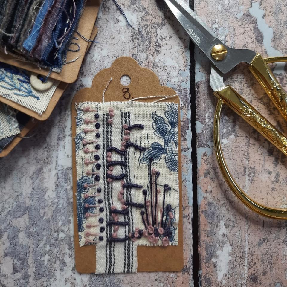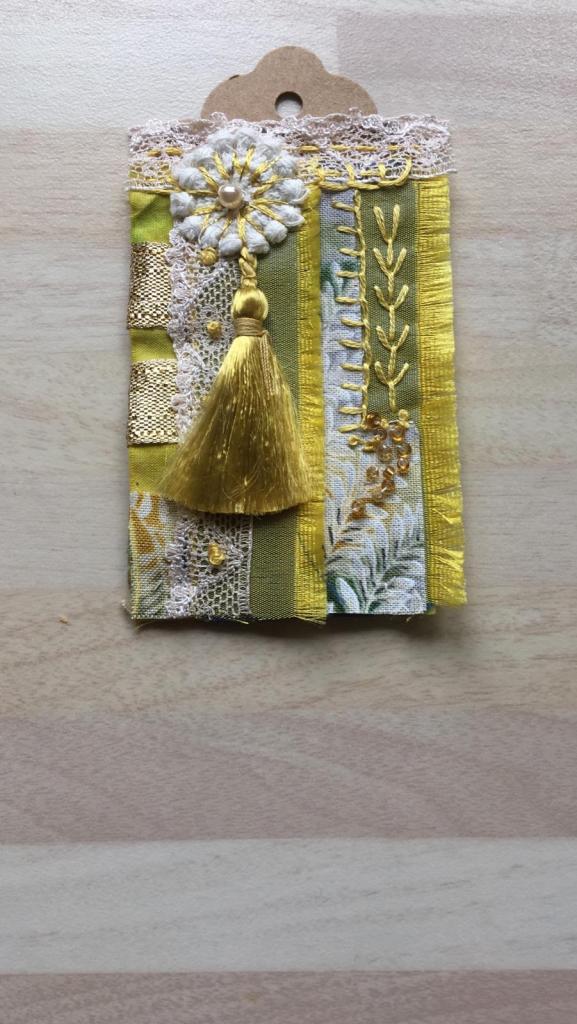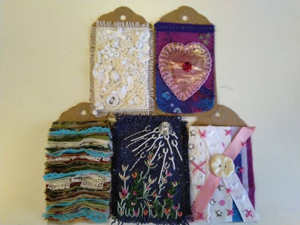 Our 2021 project was based on a challenge set by textile artist Anne Brooke, Sue V coordinated the project for our group. We created a series of mini stitched pieces, one a week for 52 weeks, each with a theme given by Anne Brooke which we attached to a luggage label or similar with the date and a memory of that week written on the reverse of the label.