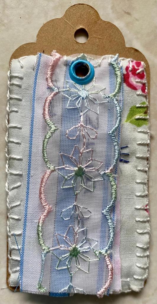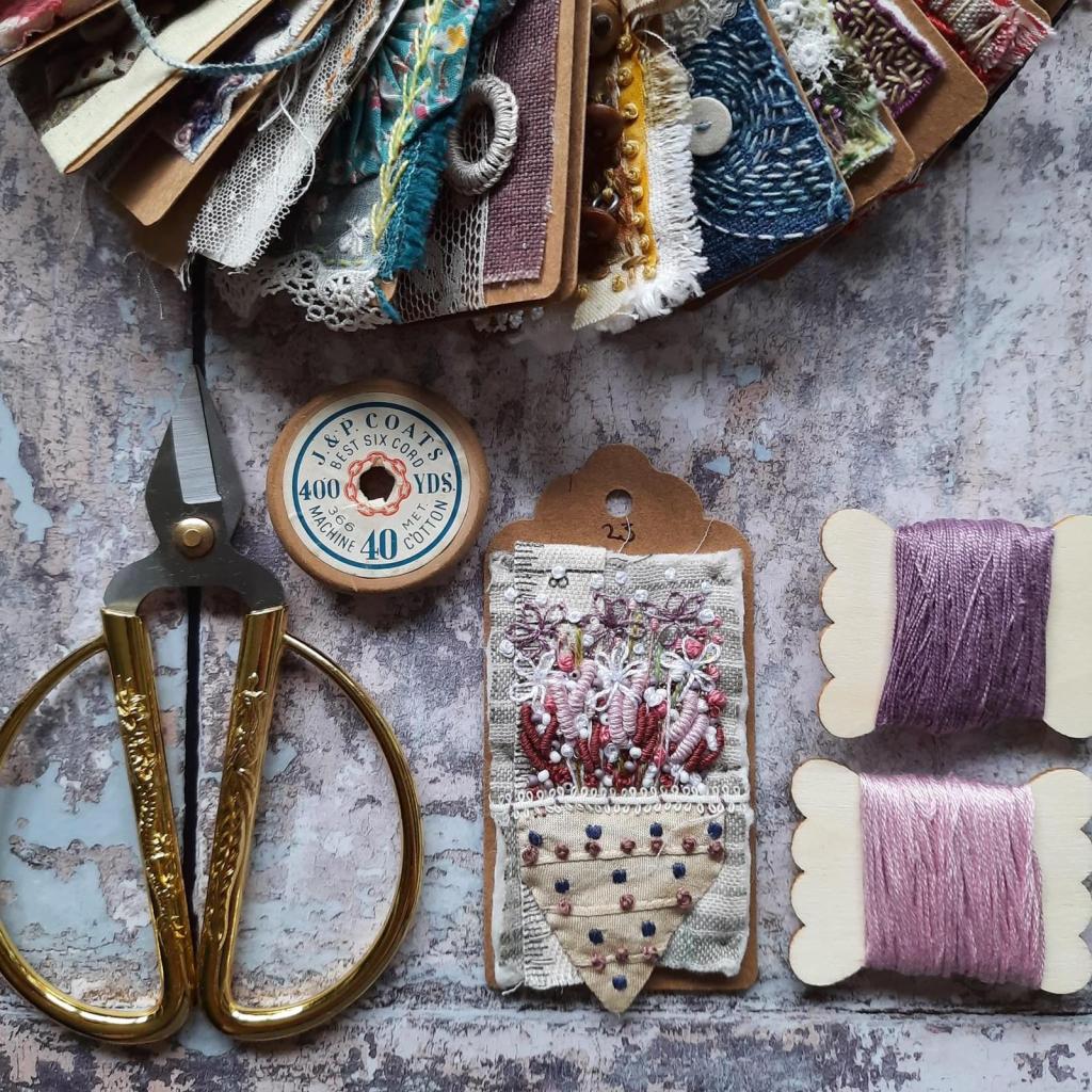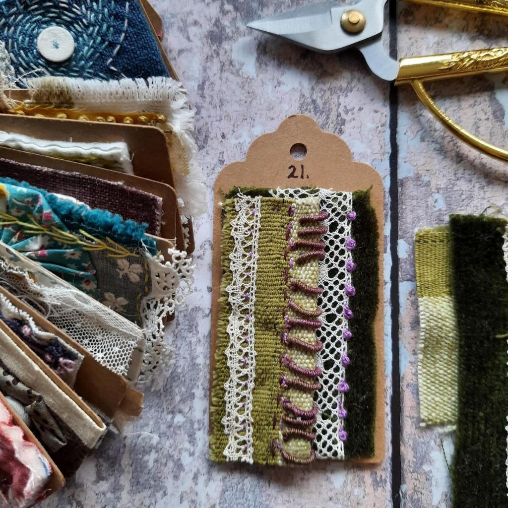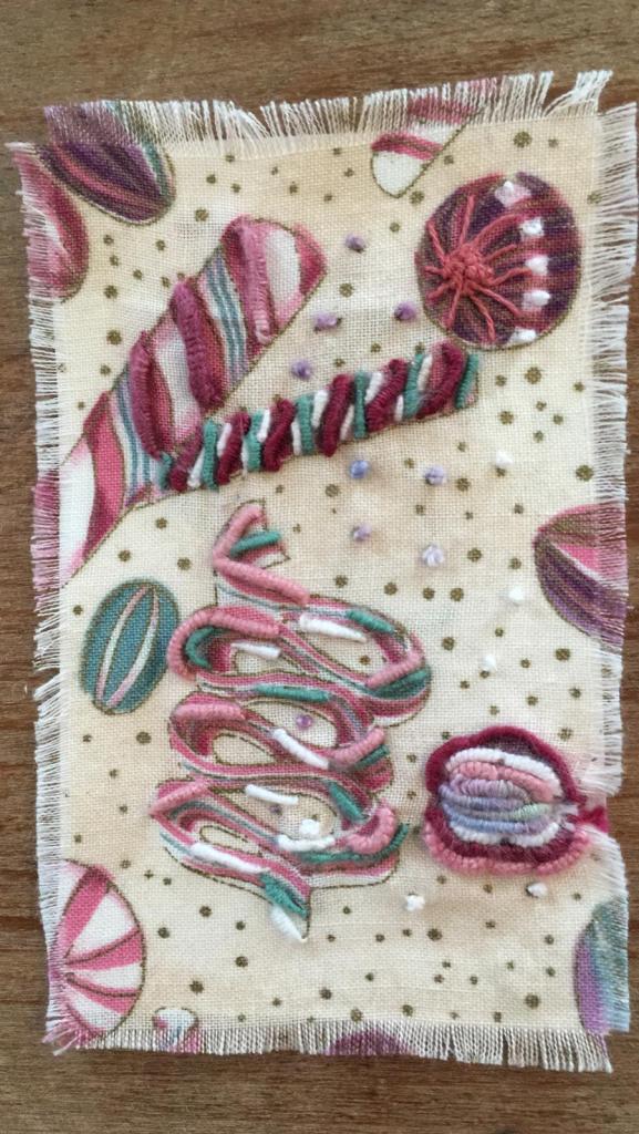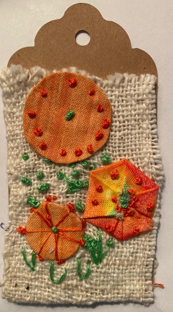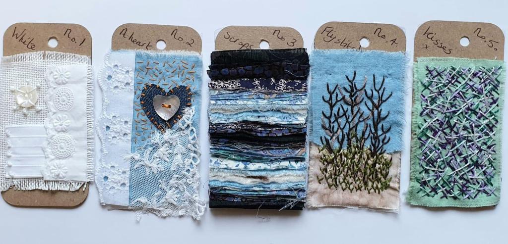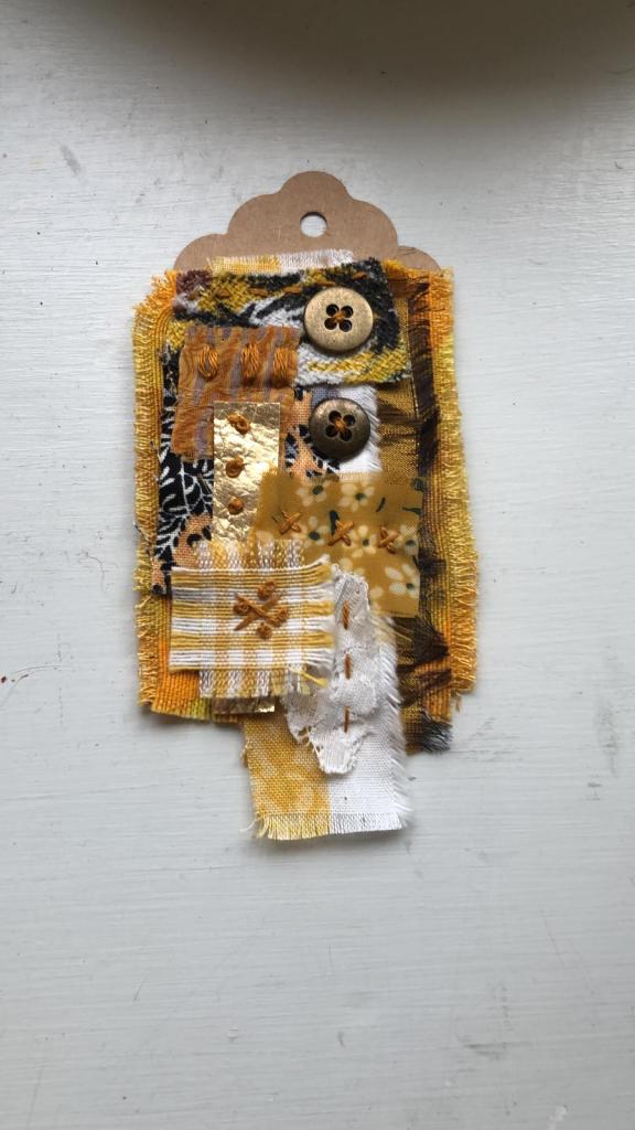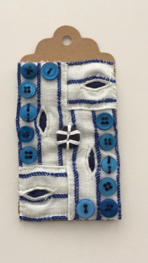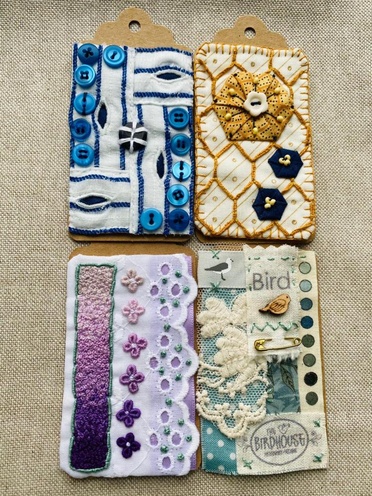 Our 2021 project was based on a challenge set by textile artist Anne Brooke, Sue V coordinated the project for our group. We created a series of mini stitched pieces, one a week for 52 weeks, each with a theme given by Anne Brooke which we attached to a luggage label or similar with the date and a memory of that week written on the reverse of the label.