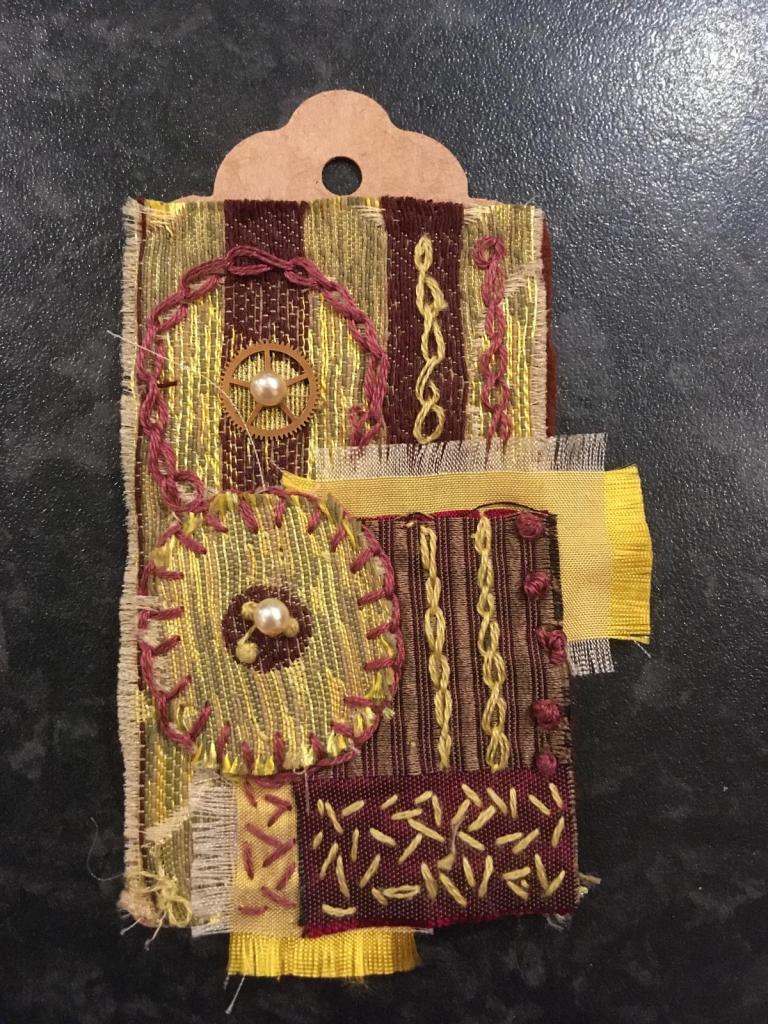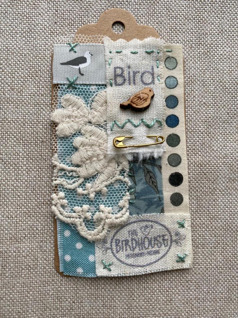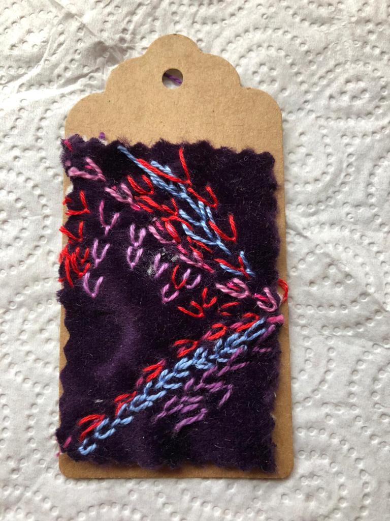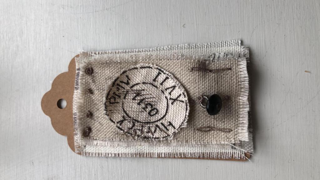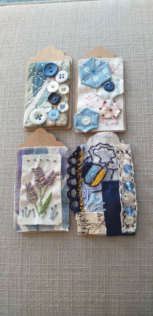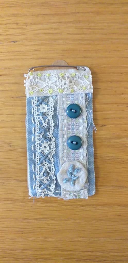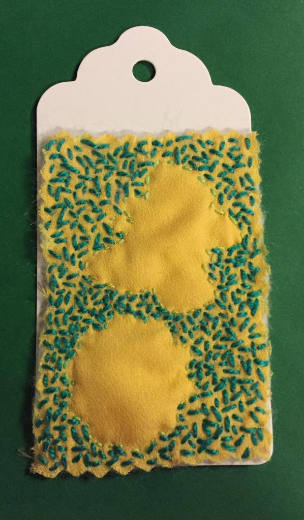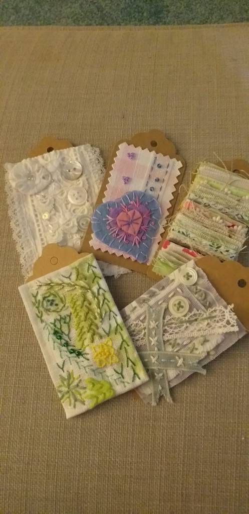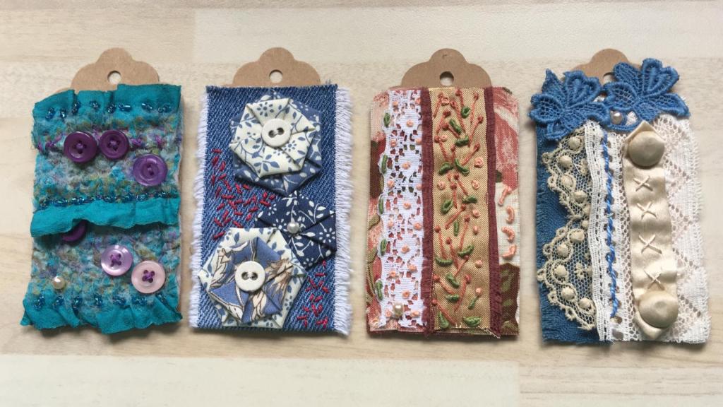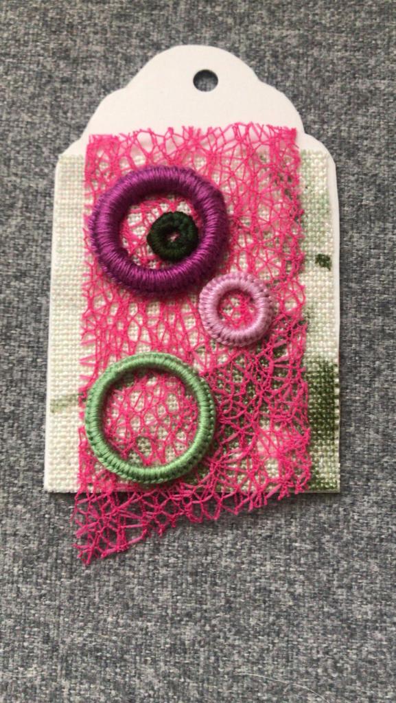 Our 2021 project was based on a challenge set by textile artist Anne Brooke, Sue V coordinated the project for our group. We created a series of mini stitched pieces, one a week for 52 weeks, each with a theme given by Anne Brooke which we attached to a luggage label or similar with the date and a memory of that week written on the reverse of the label.