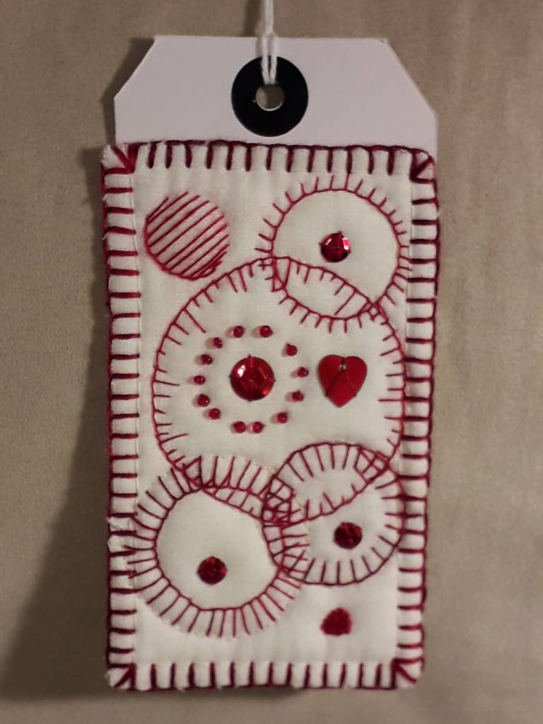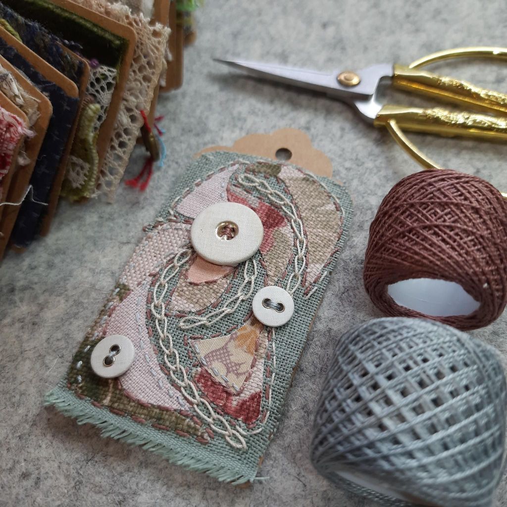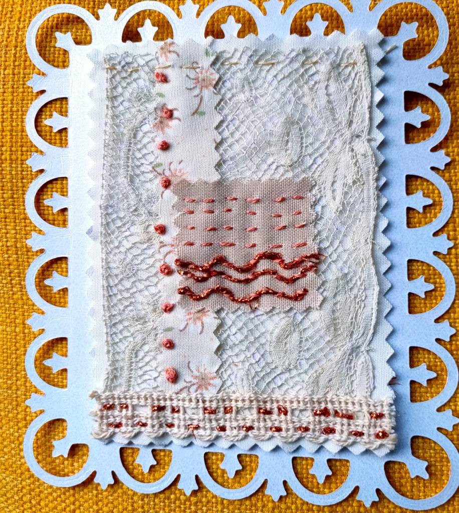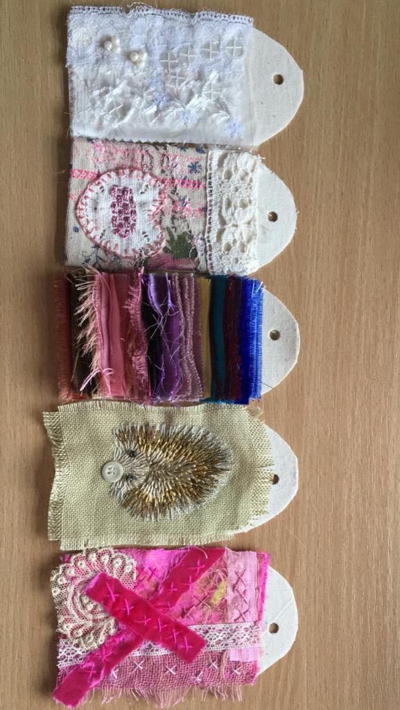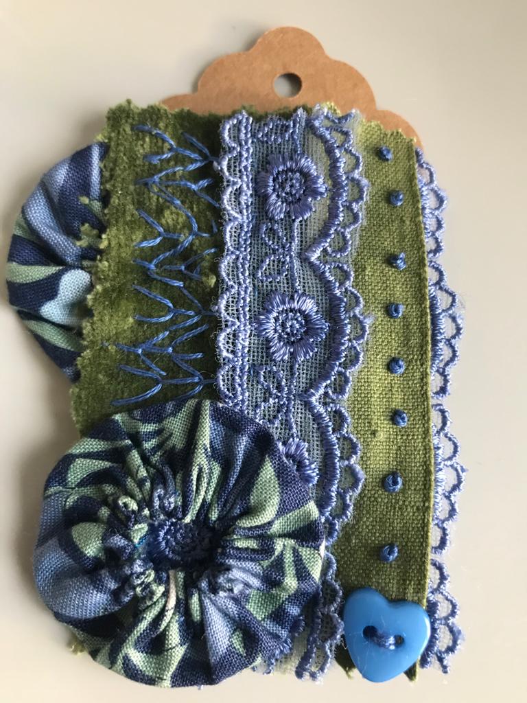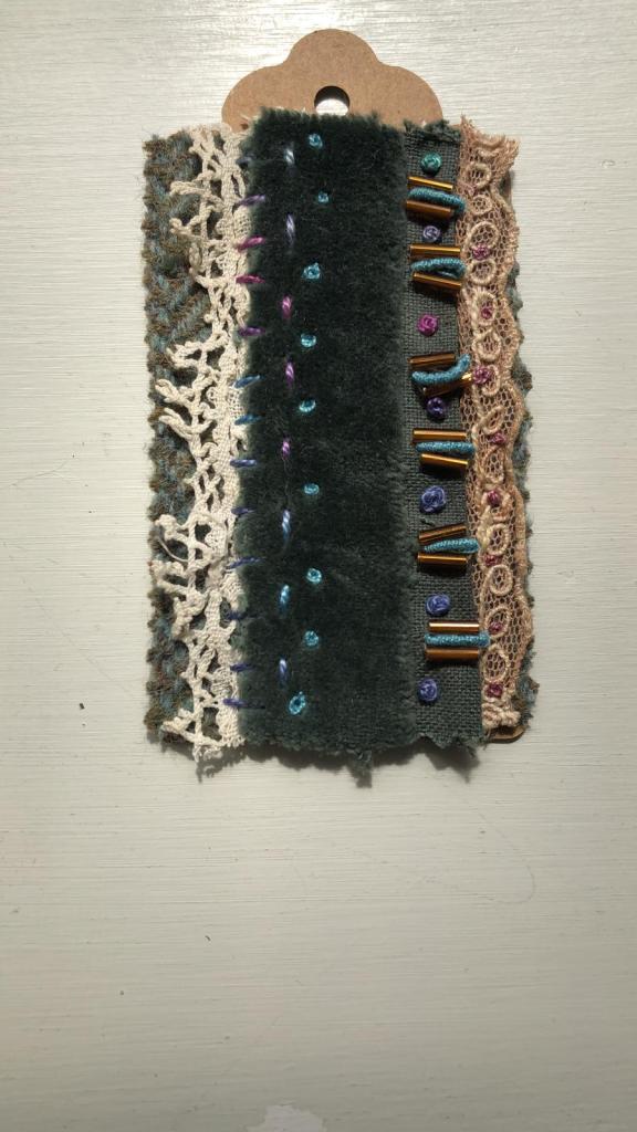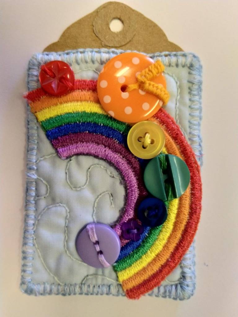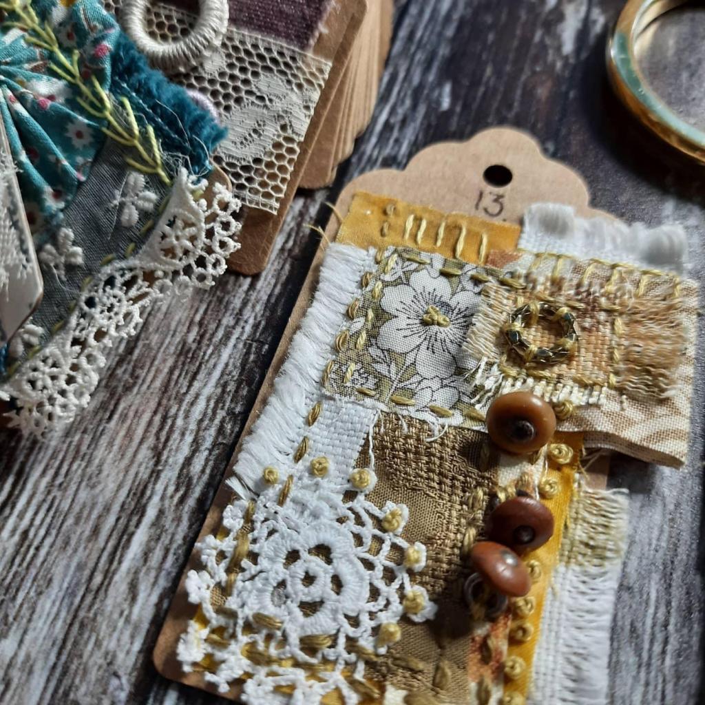 Our 2021 project was based on a challenge set by textile artist Anne Brooke, Sue V coordinated the project for our group. We created a series of mini stitched pieces, one a week for 52 weeks, each with a theme given by Anne Brooke which we attached to a luggage label or similar with the date and a memory of that week written on the reverse of the label.