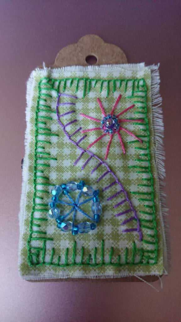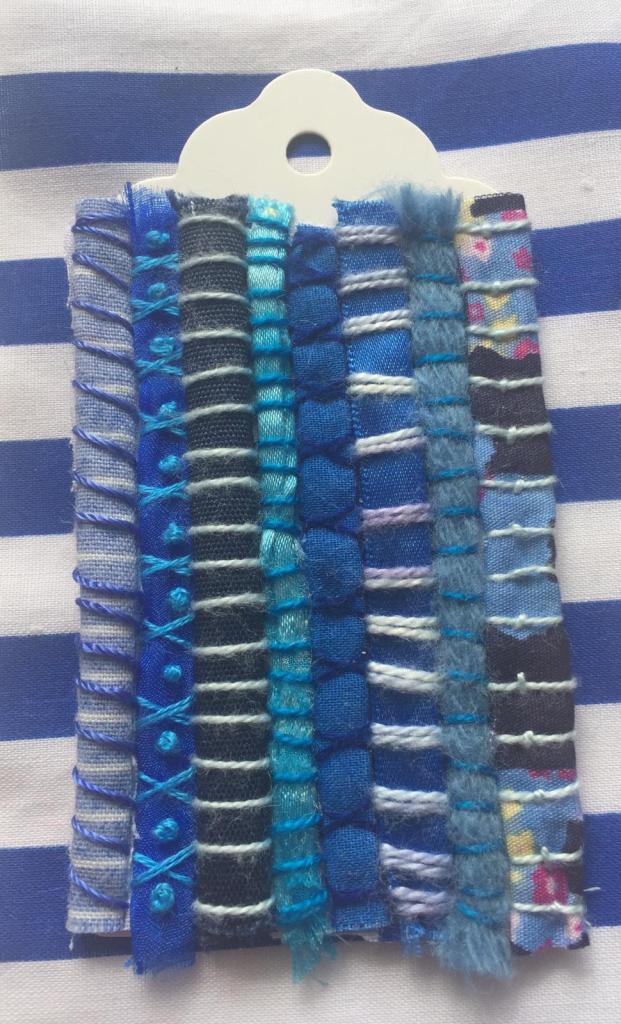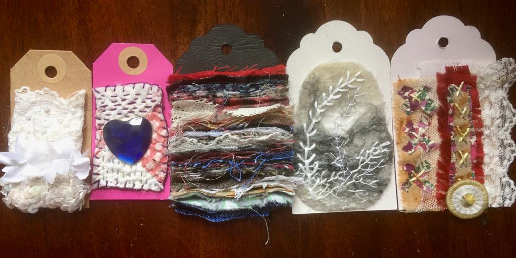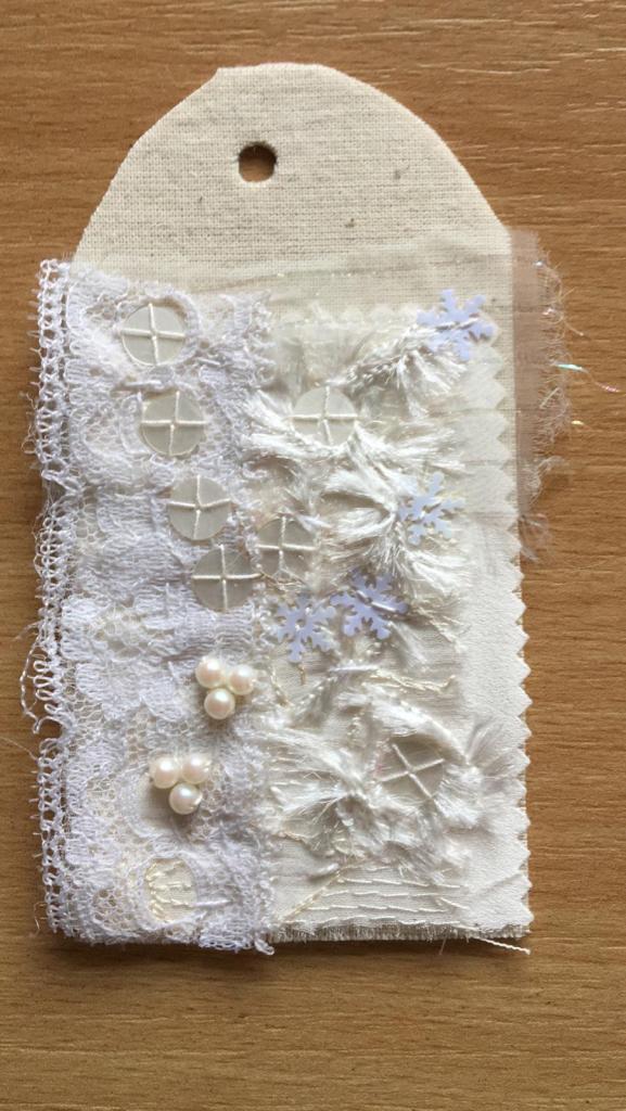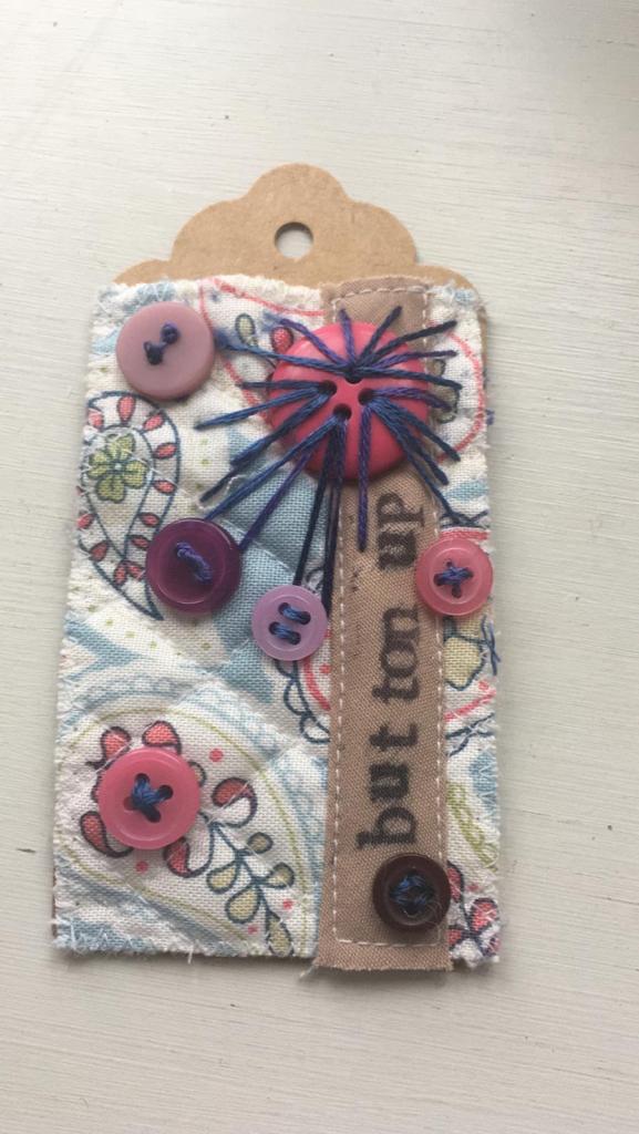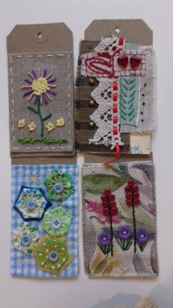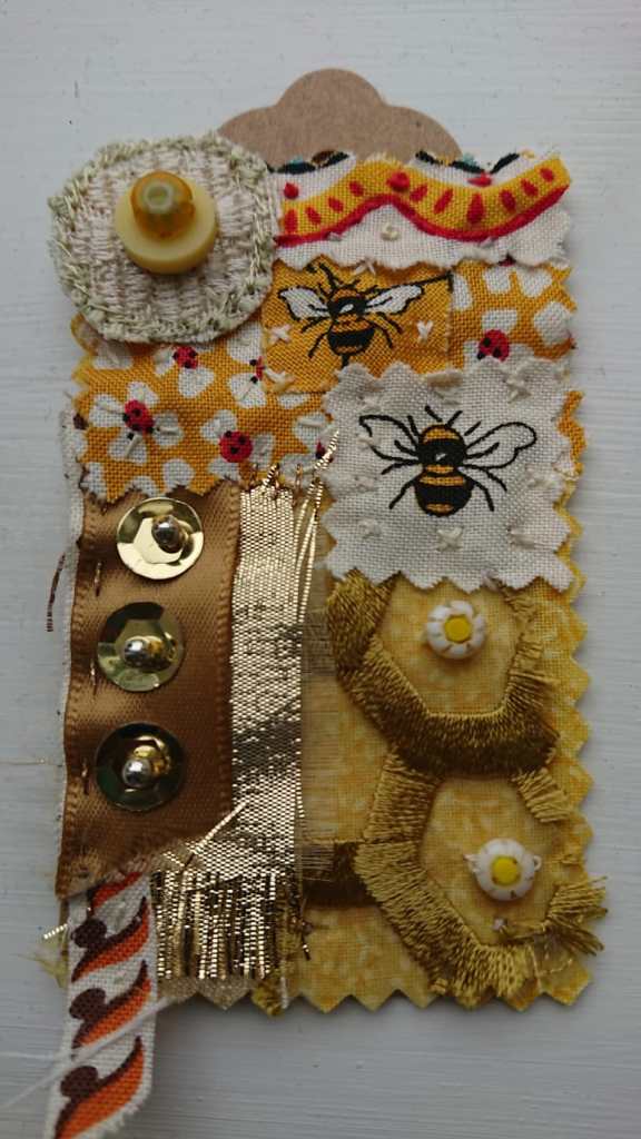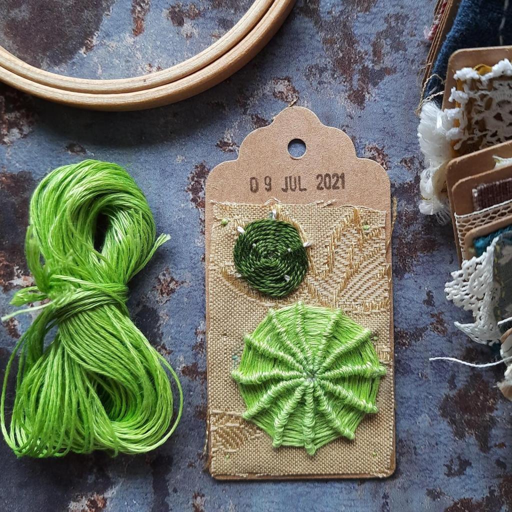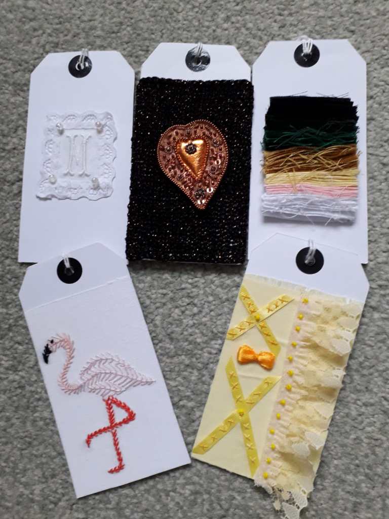 Our 2021 project was based on a challenge set by textile artist Anne Brooke, Sue V coordinated the project for our group. We created a series of mini stitched pieces, one a week for 52 weeks, each with a theme given by Anne Brooke which we attached to a luggage label or similar with the date and a memory of that week written on the reverse of the label.