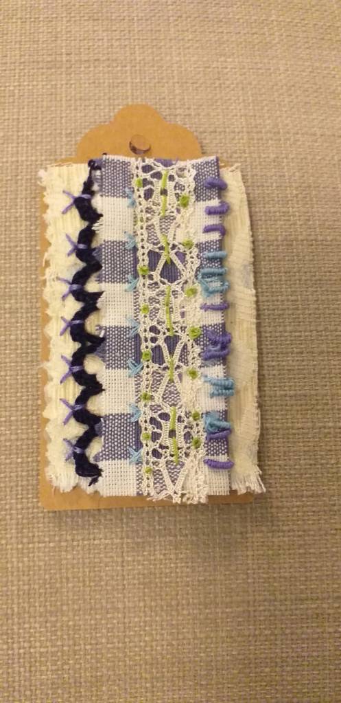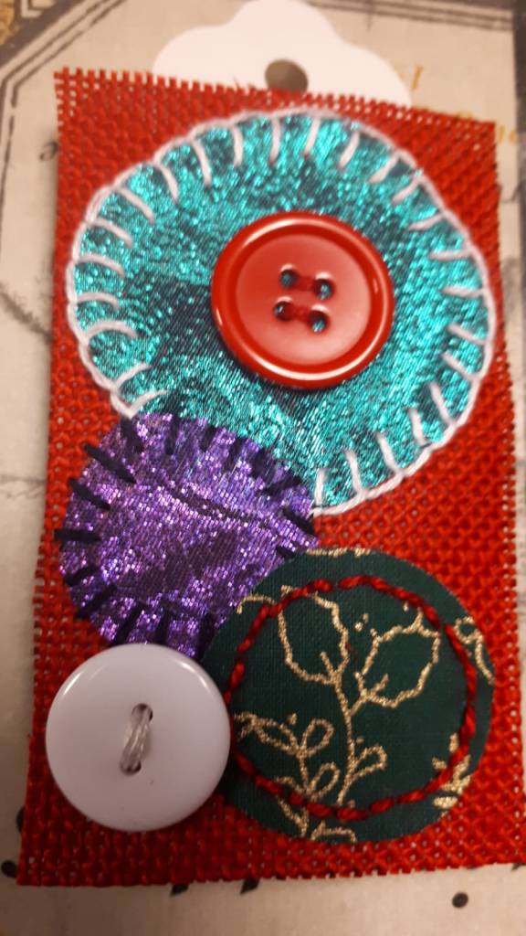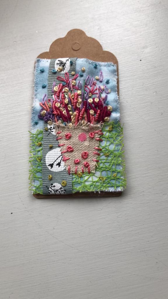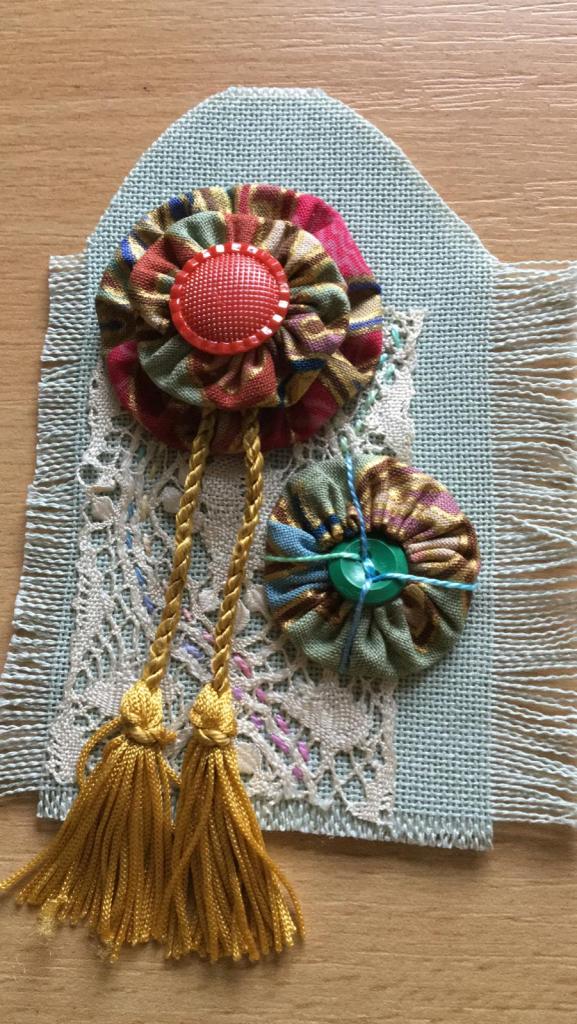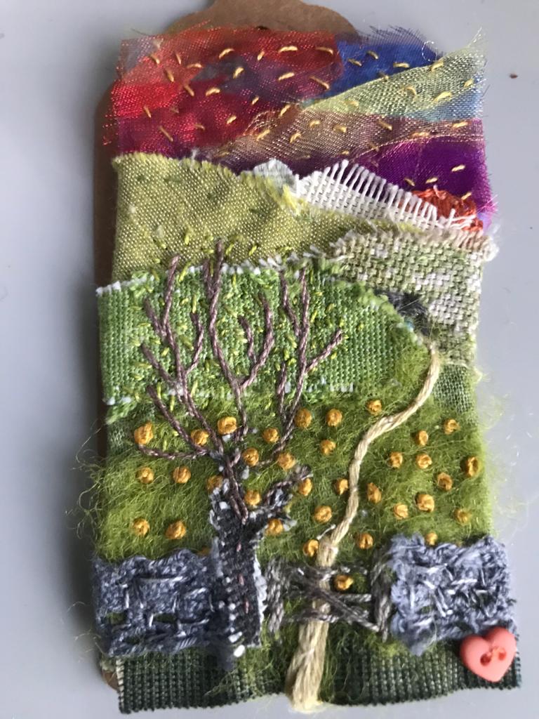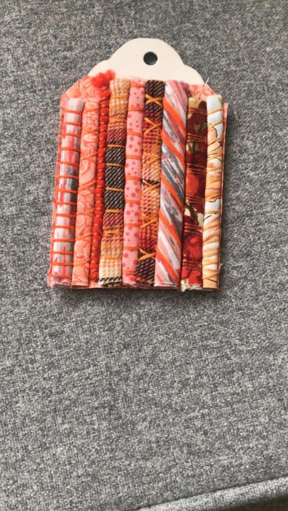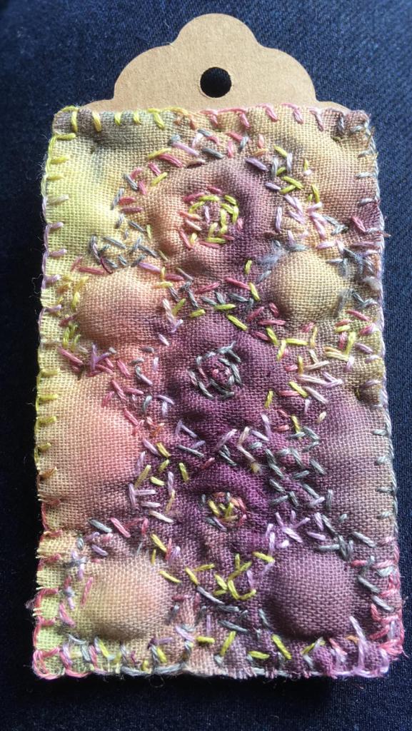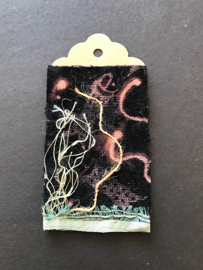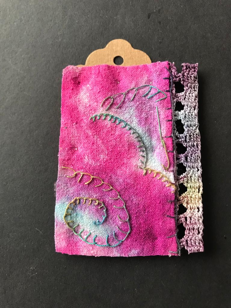 Our 2021 project was based on a challenge set by textile artist Anne Brooke, Sue V coordinated the project for our group. We created a series of mini stitched pieces, one a week for 52 weeks, each with a theme given by Anne Brooke which we attached to a luggage label or similar with the date and a memory of that week written on the reverse of the label.