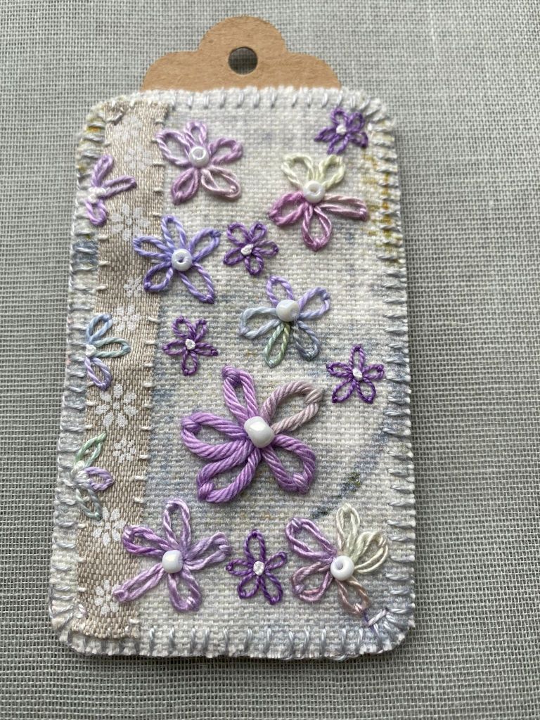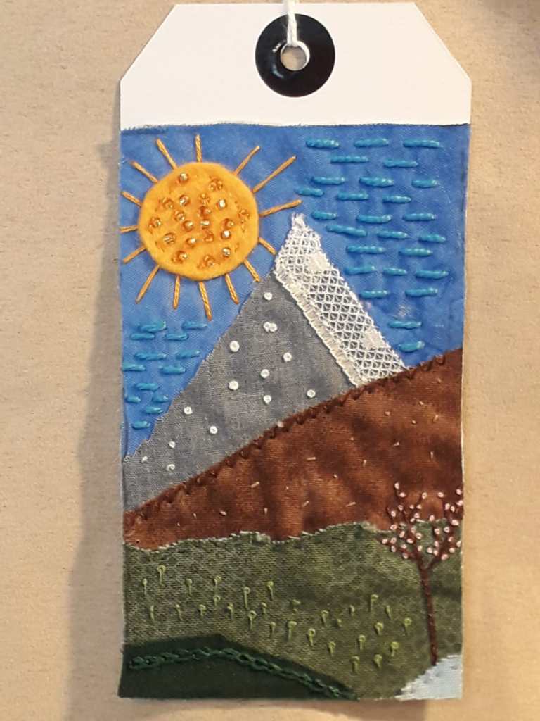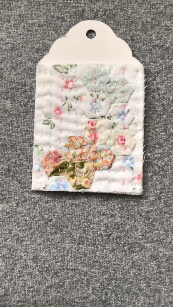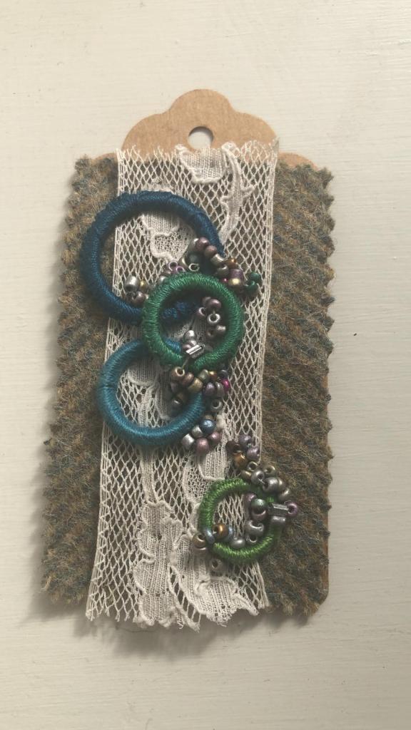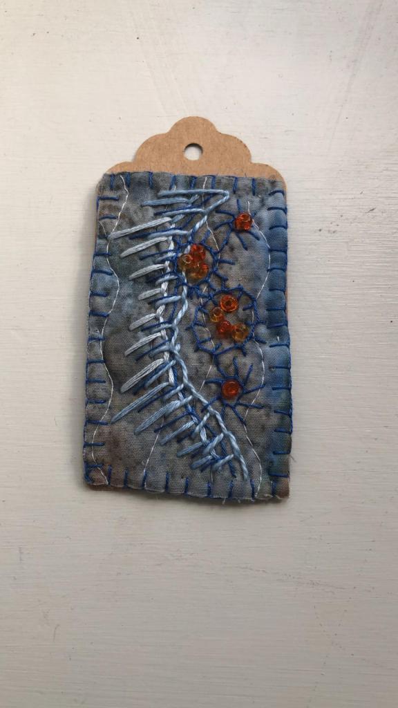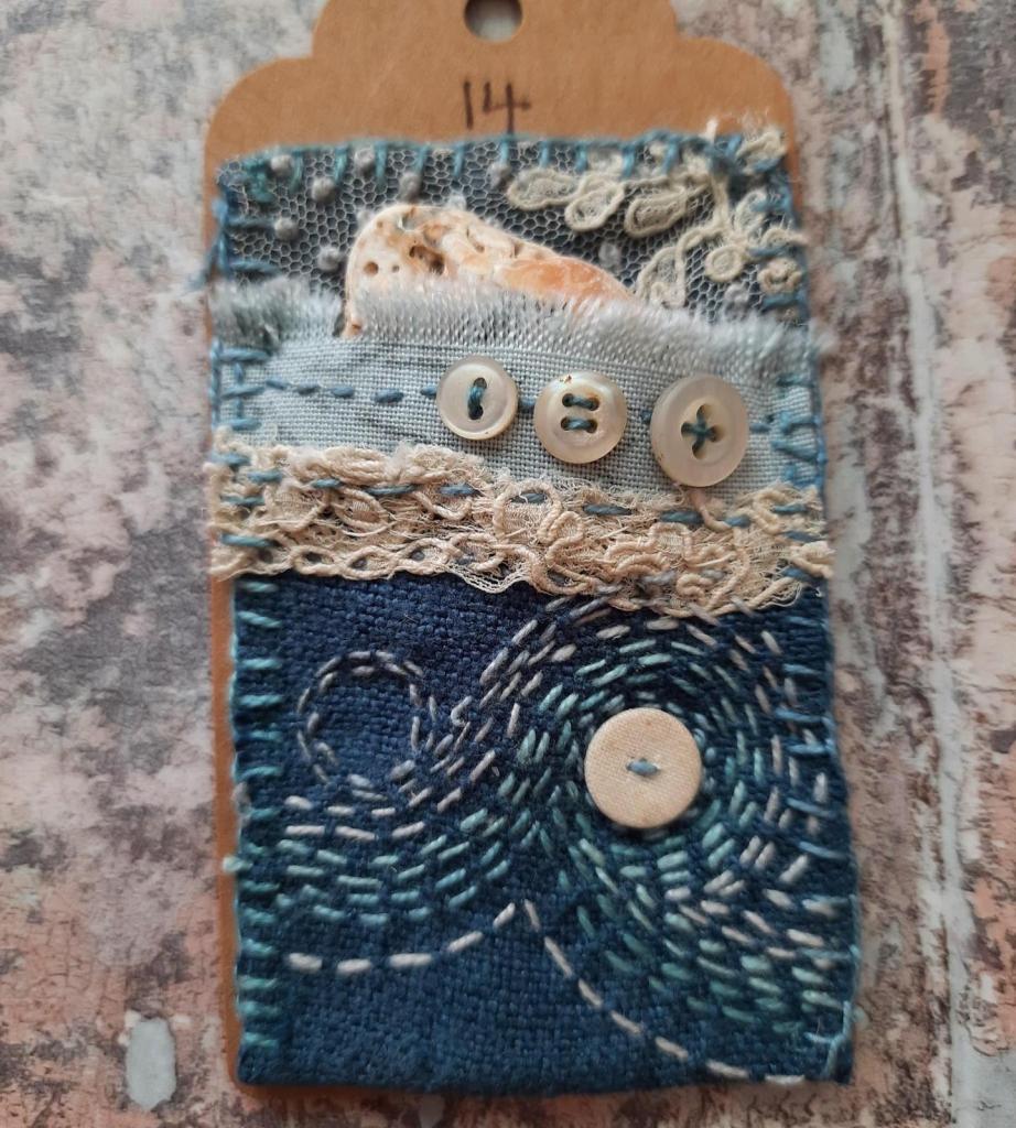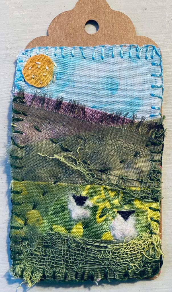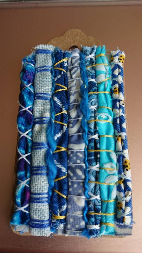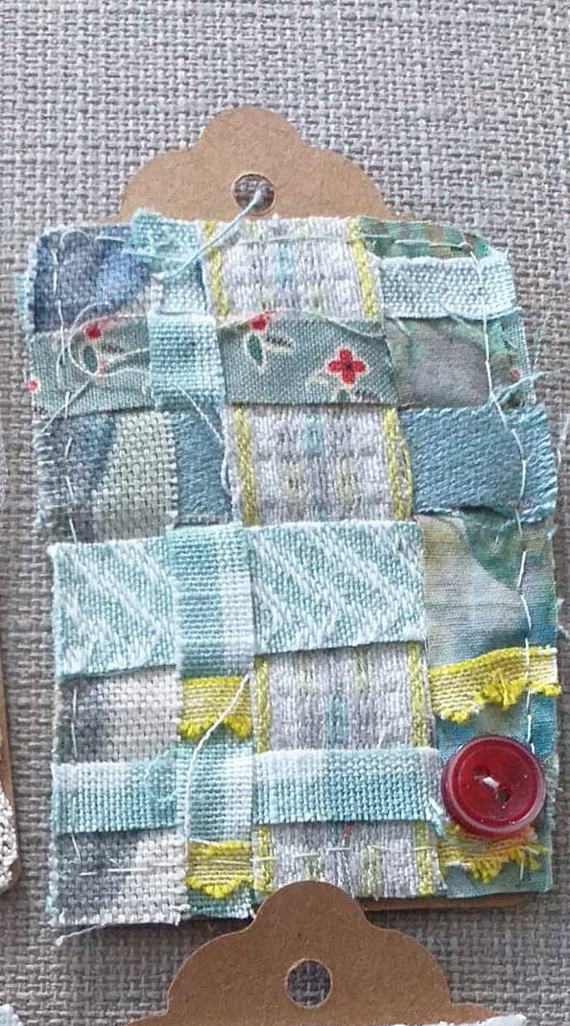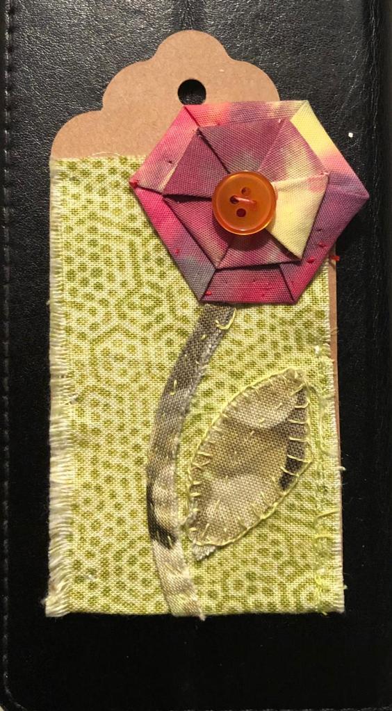 Our 2021 project was based on a challenge set by textile artist Anne Brooke, Sue V coordinated the project for our group. We created a series of mini stitched pieces, one a week for 52 weeks, each with a theme given by Anne Brooke which we attached to a luggage label or similar with the date and a memory of that week written on the reverse of the label.