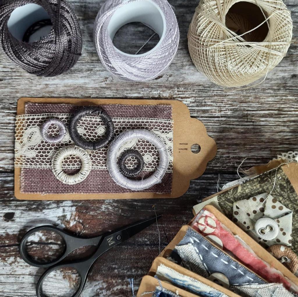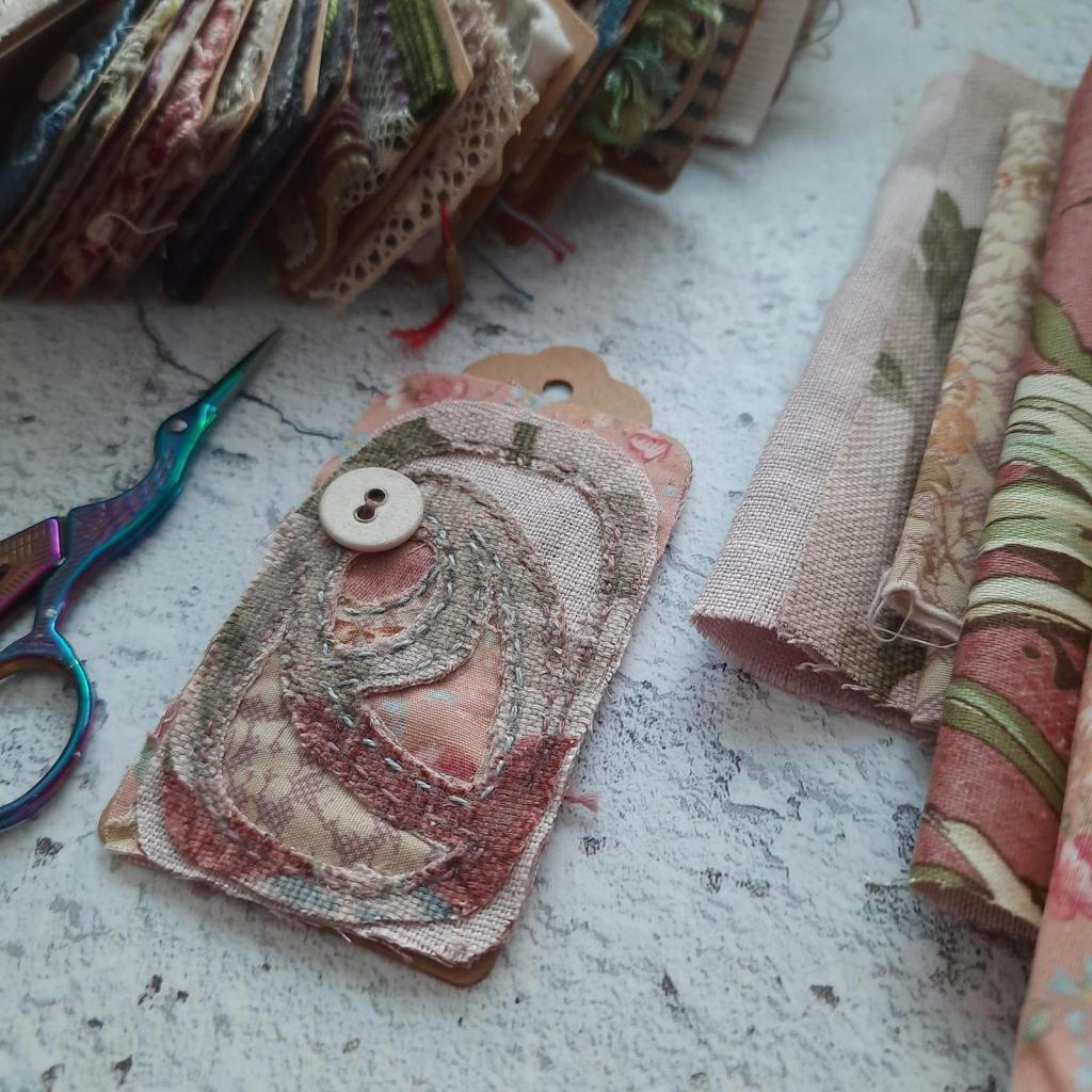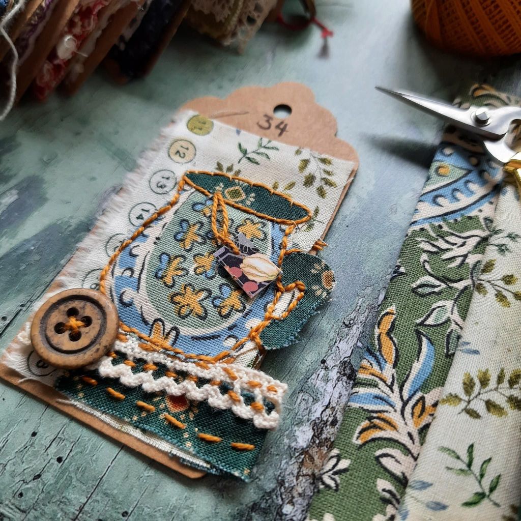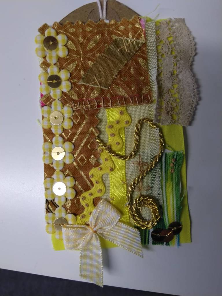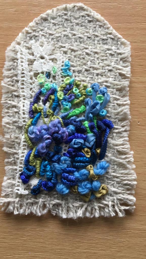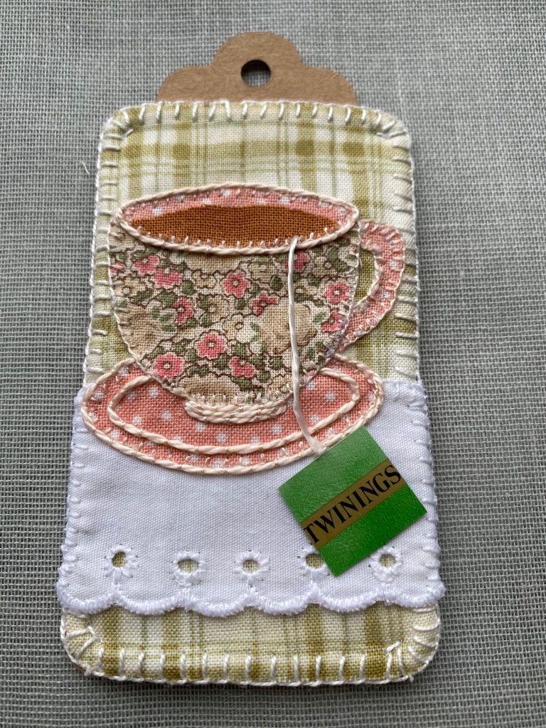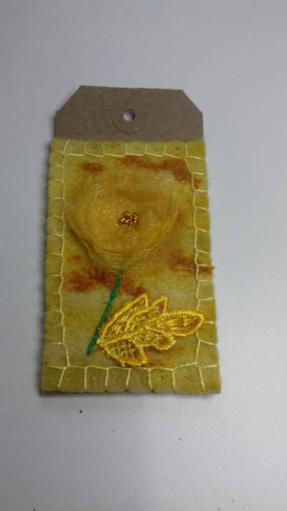 Our 2021 project was based on a challenge set by textile artist Anne Brooke, Sue V coordinated the project for our group. We created a series of mini stitched pieces, one a week for 52 weeks, each with a theme given by Anne Brooke which we attached to a luggage label or similar with the date and a memory of that week written on the reverse of the label.
