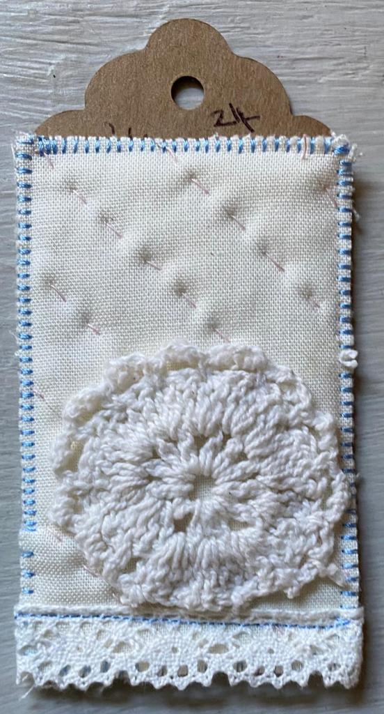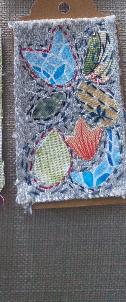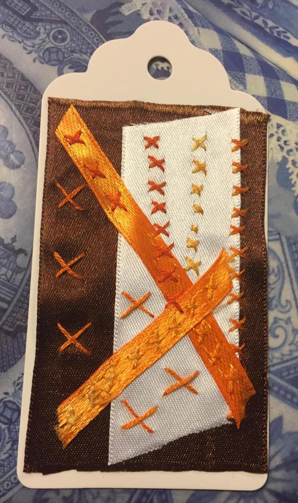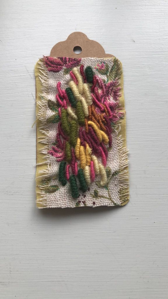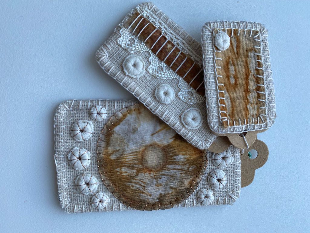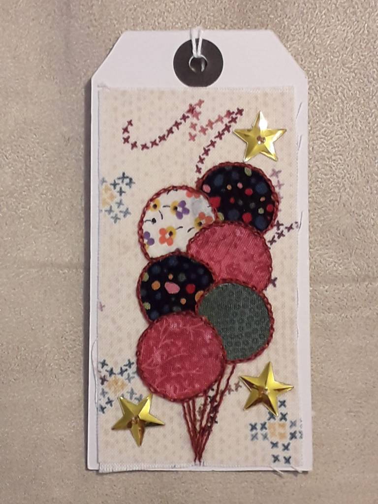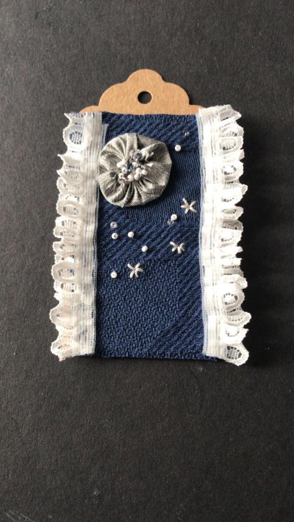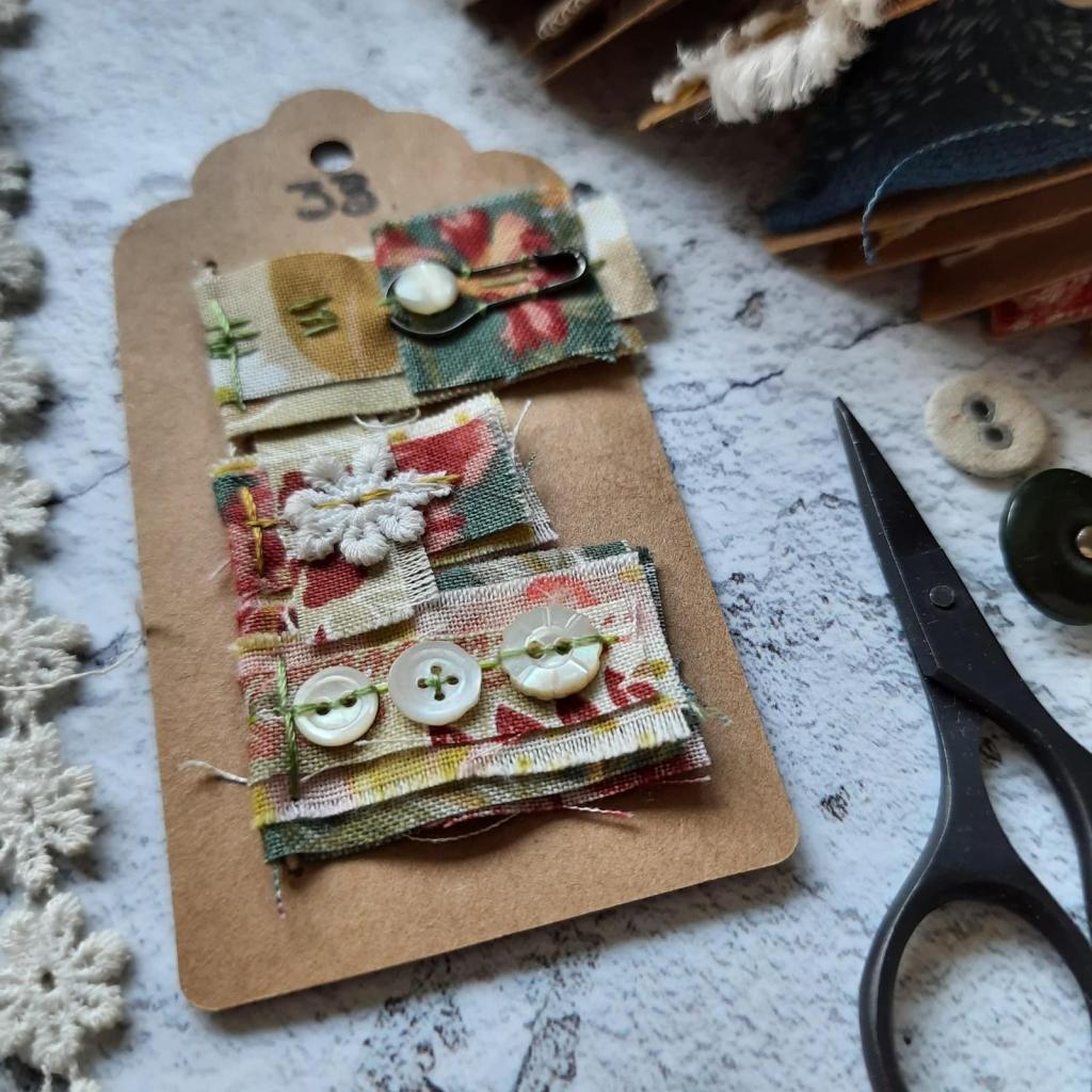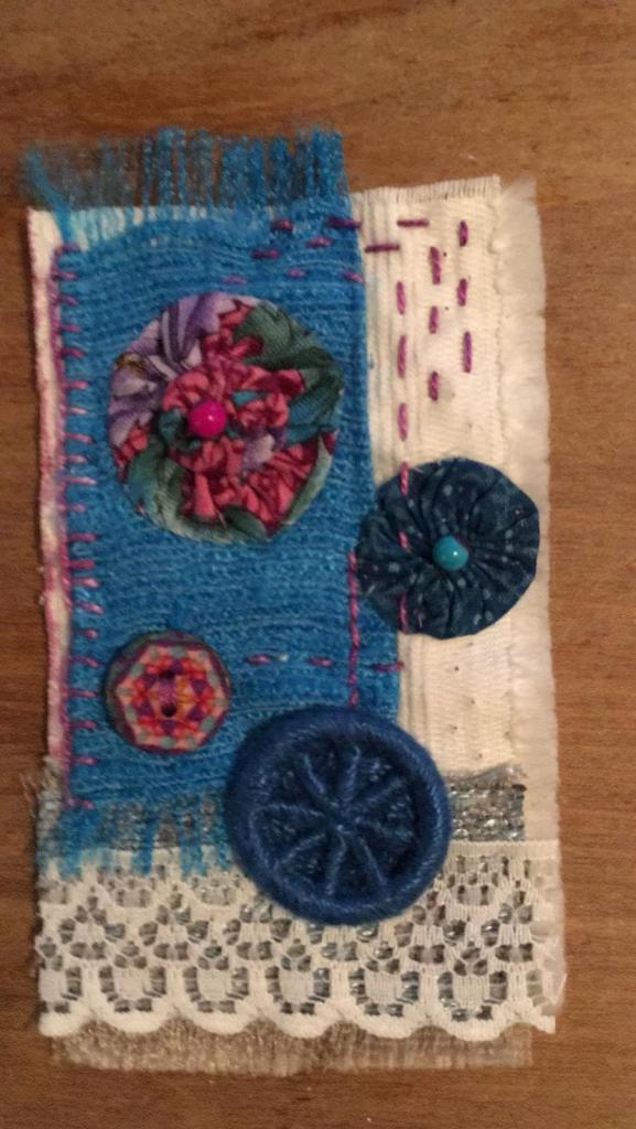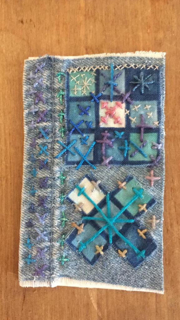 Our 2021 project was based on a challenge set by textile artist Anne Brooke, Sue V coordinated the project for our group. We created a series of mini stitched pieces, one a week for 52 weeks, each with a theme given by Anne Brooke which we attached to a luggage label or similar with the date and a memory of that week written on the reverse of the label.