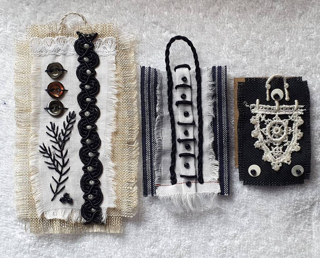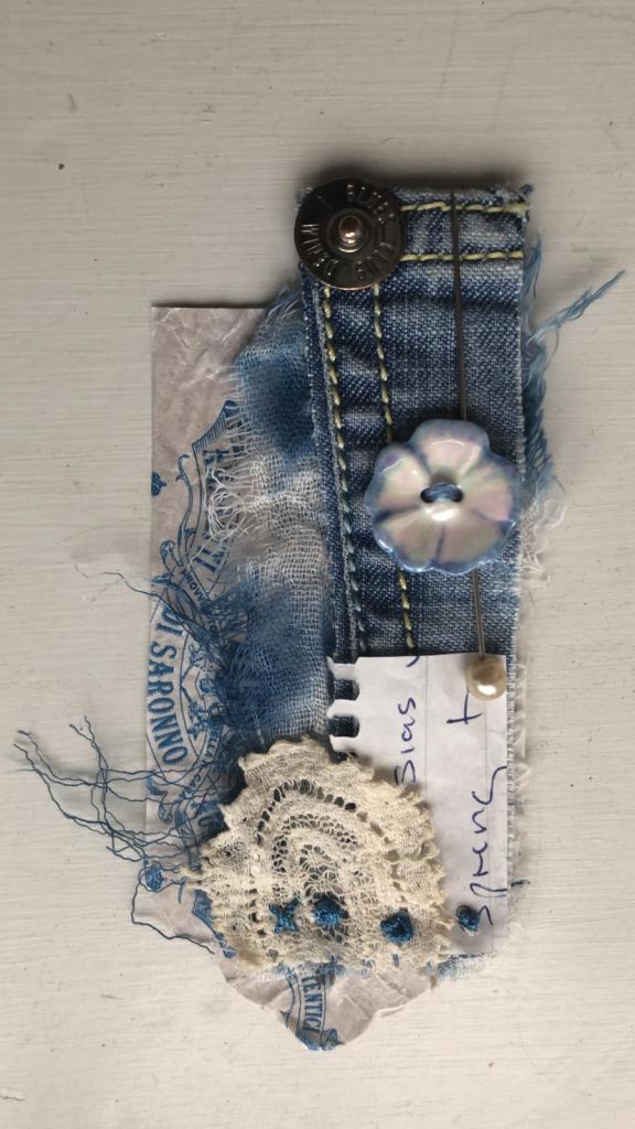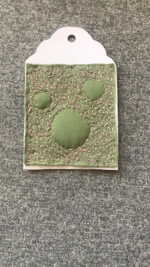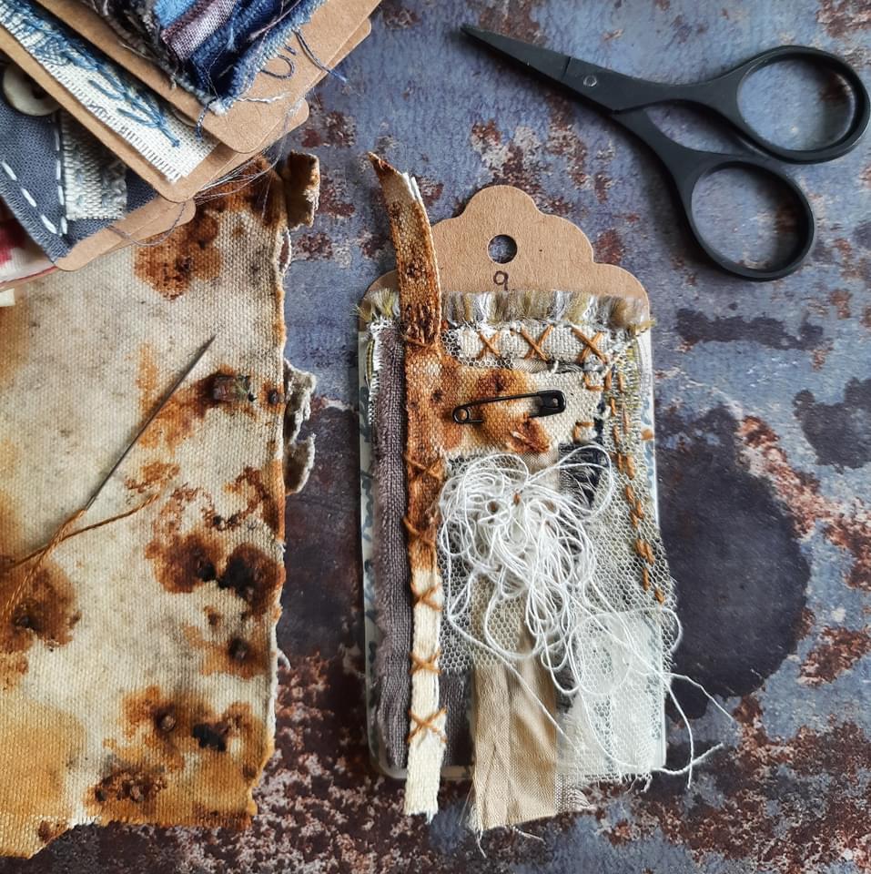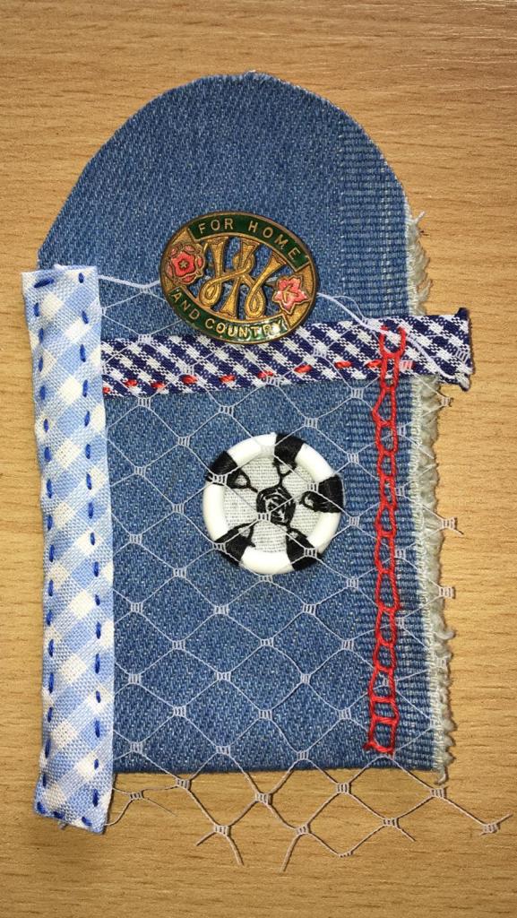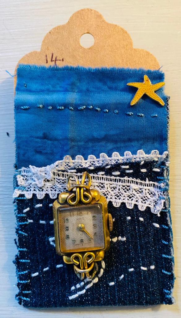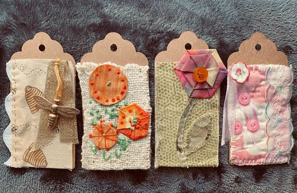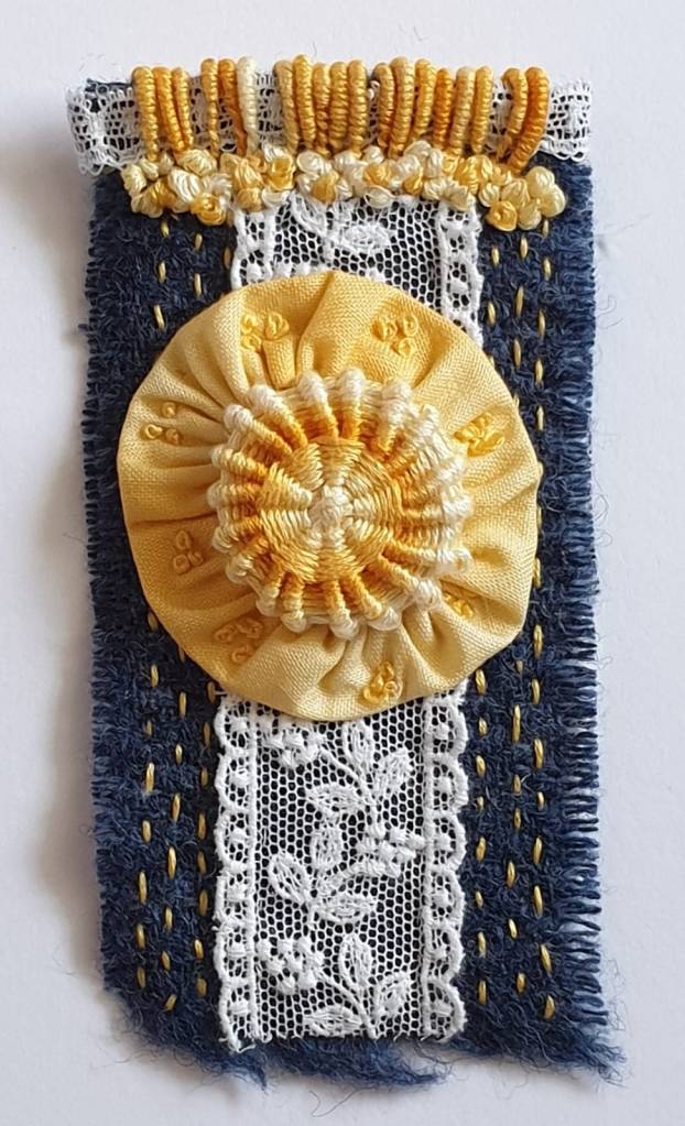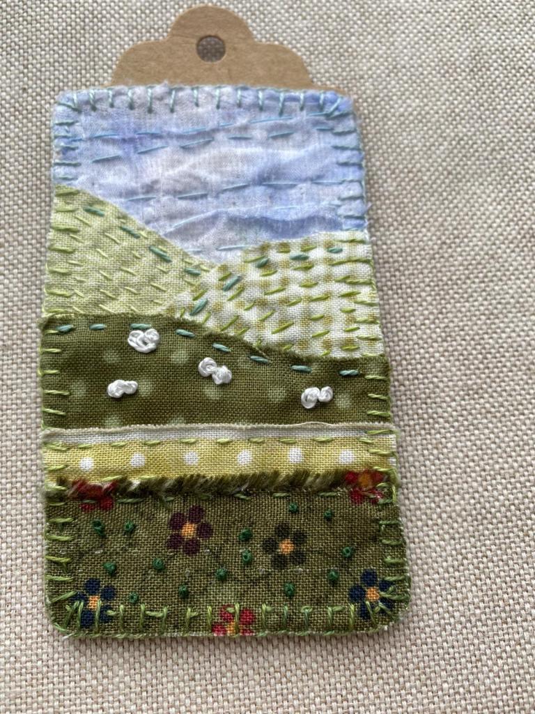 Our 2021 project was based on a challenge set by textile artist Anne Brooke, Sue V coordinated the project for our group. We created a series of mini stitched pieces, one a week for 52 weeks, each with a theme given by Anne Brooke which we attached to a luggage label or similar with the date and a memory of that week written on the reverse of the label.