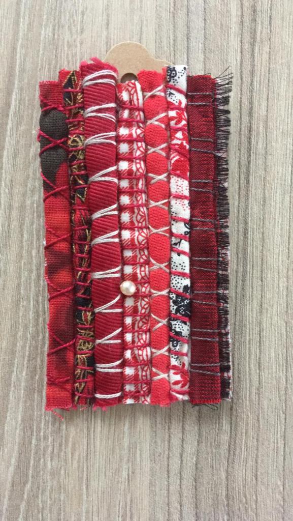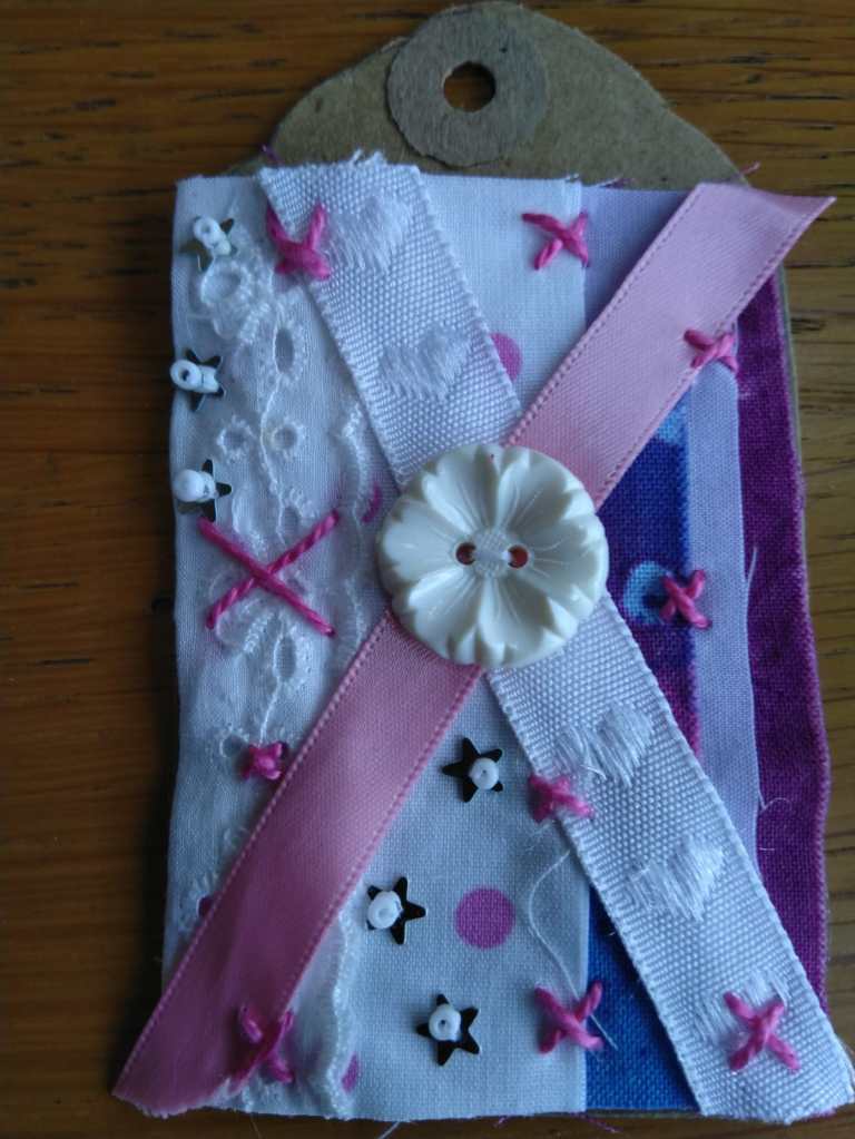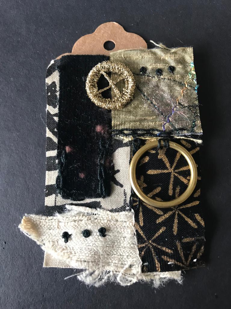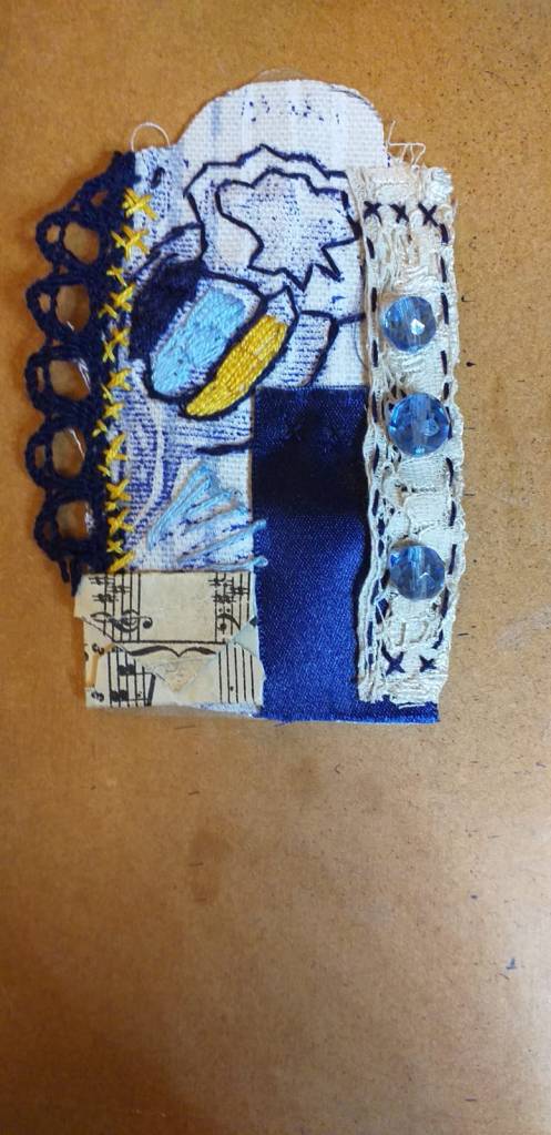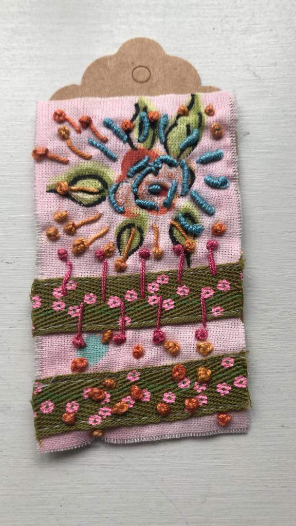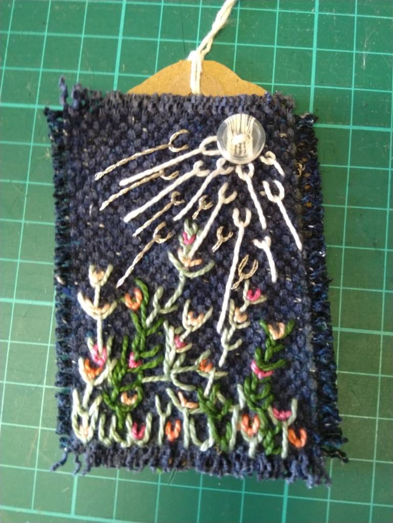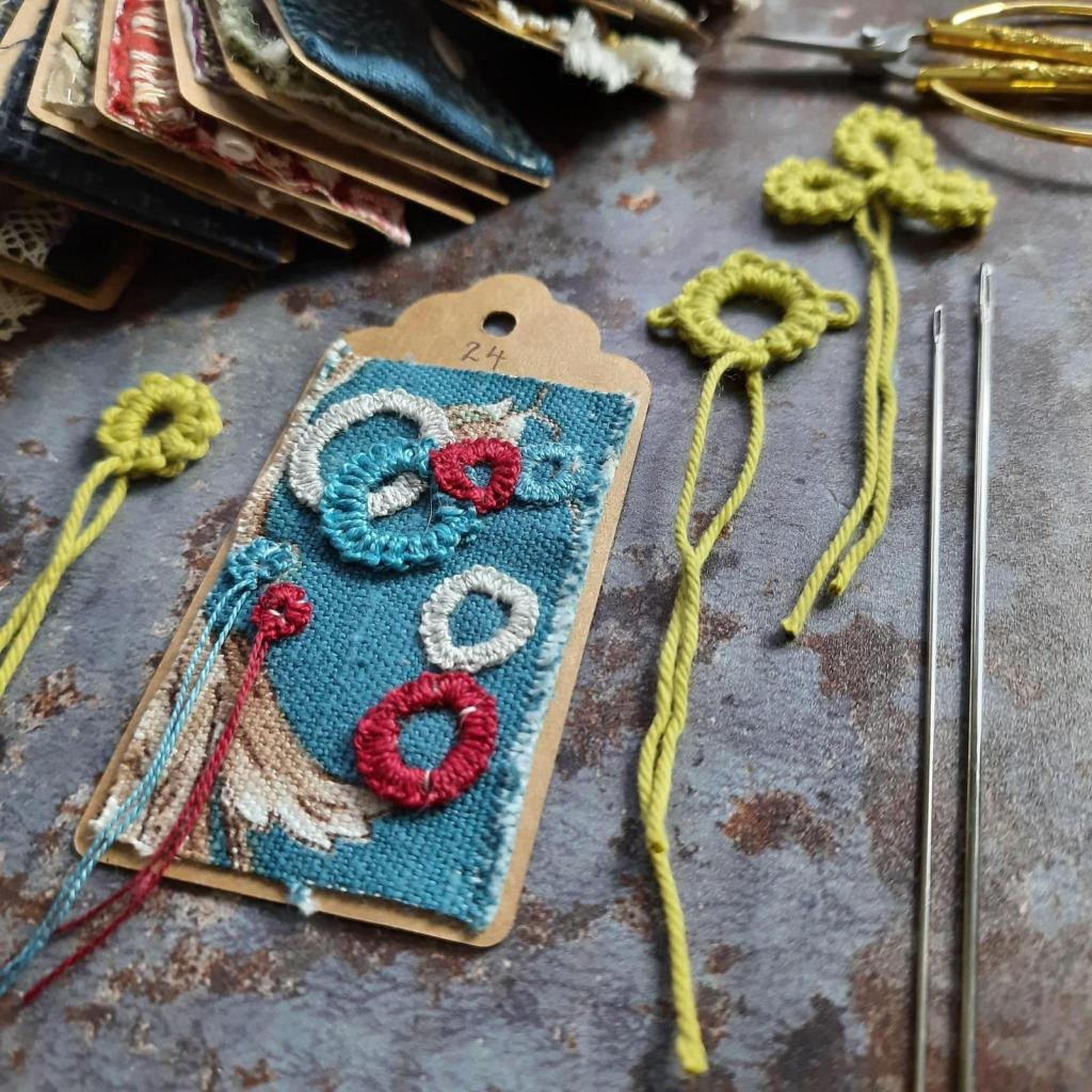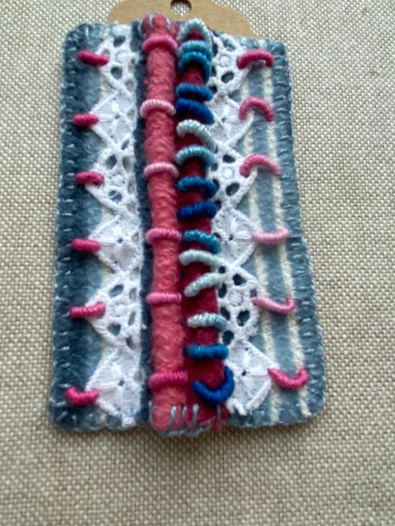 Our 2021 project was based on a challenge set by textile artist Anne Brooke, Sue V coordinated the project for our group. We created a series of mini stitched pieces, one a week for 52 weeks, each with a theme given by Anne Brooke which we attached to a luggage label or similar with the date and a memory of that week written on the reverse of the label.