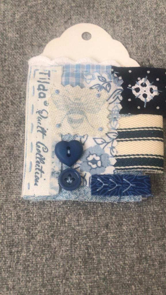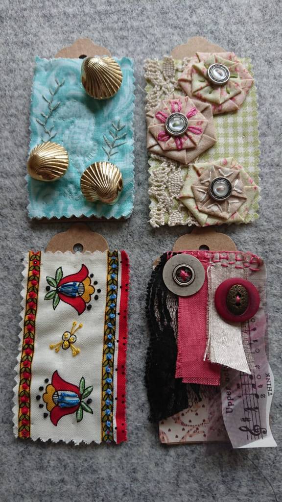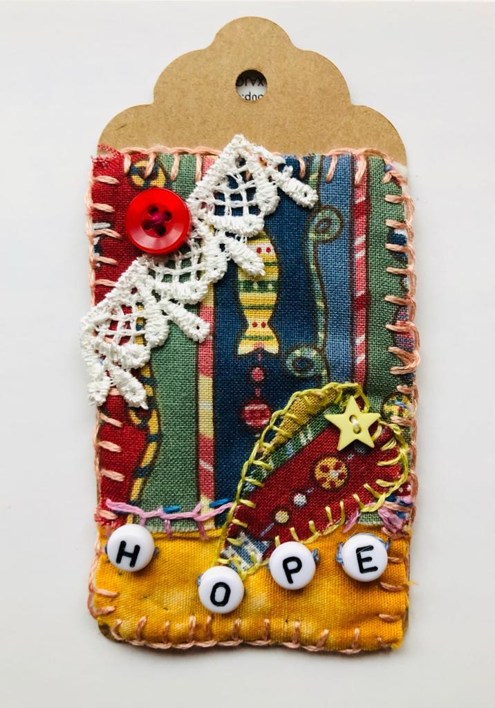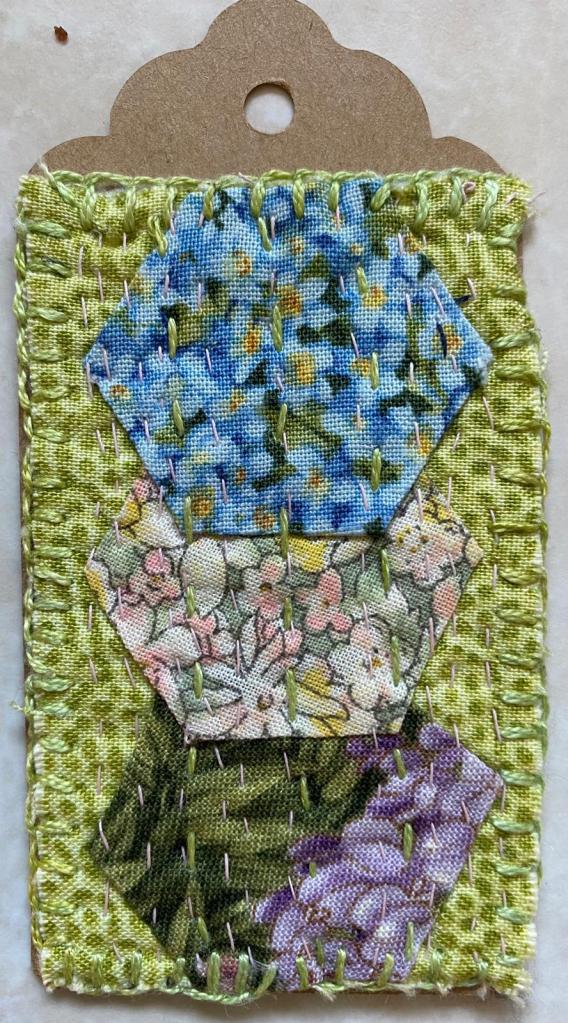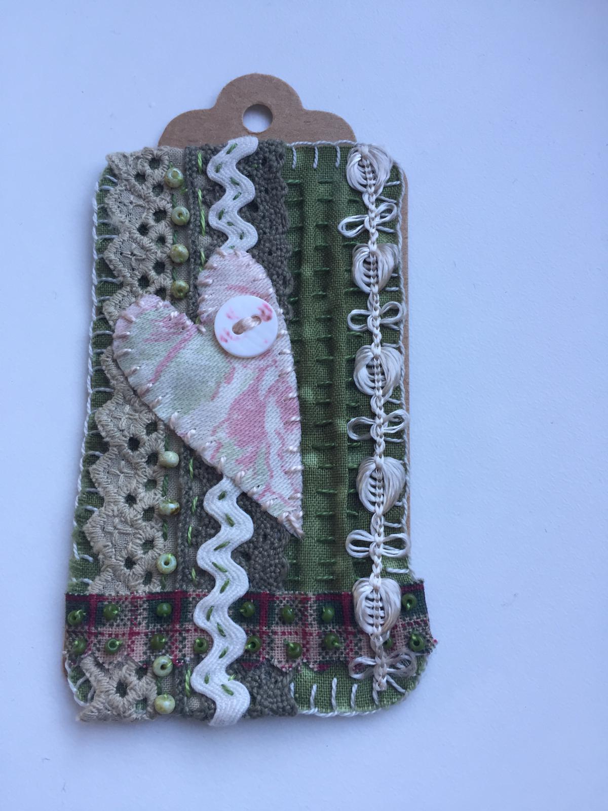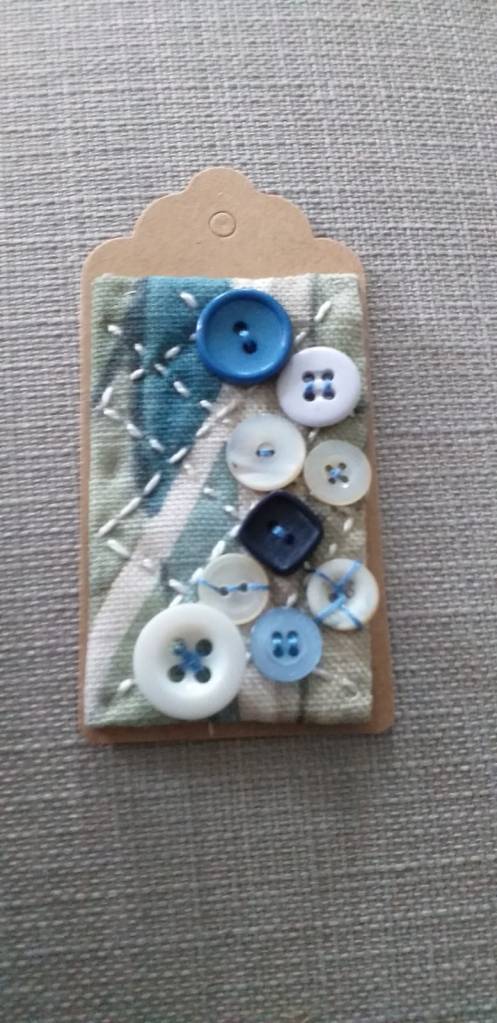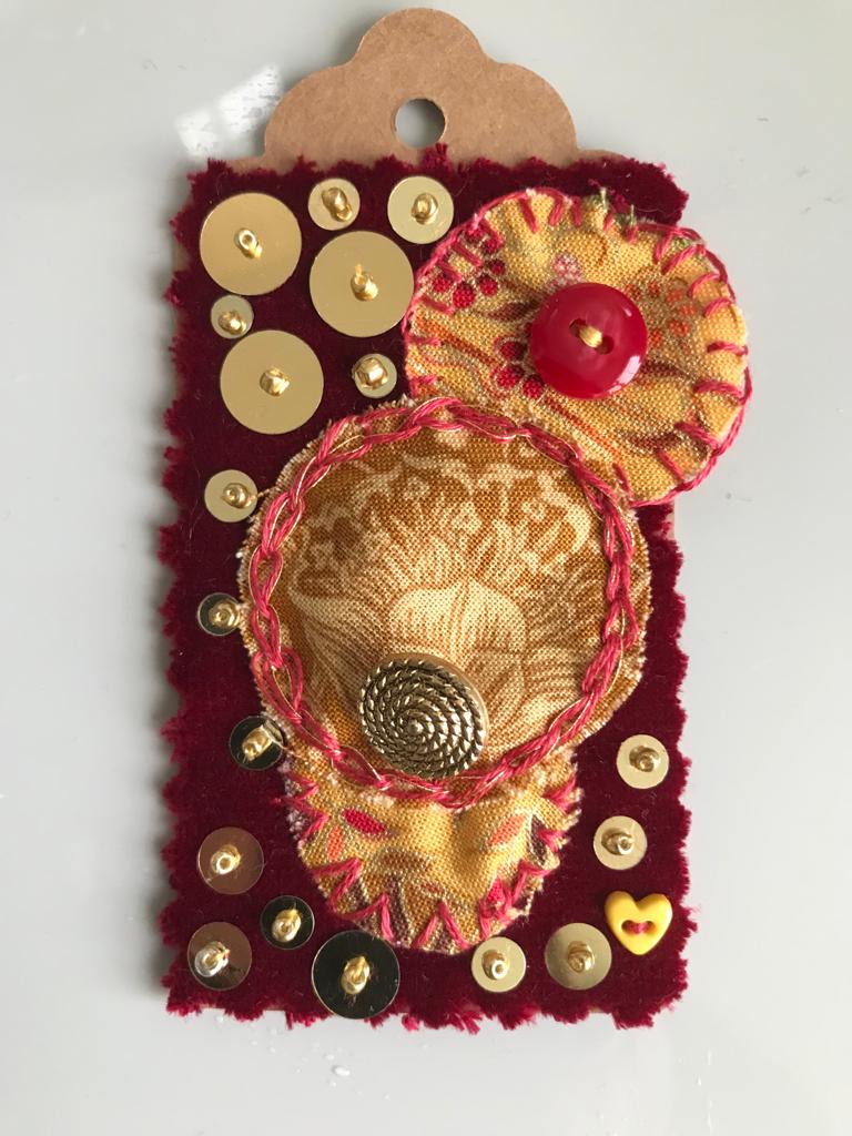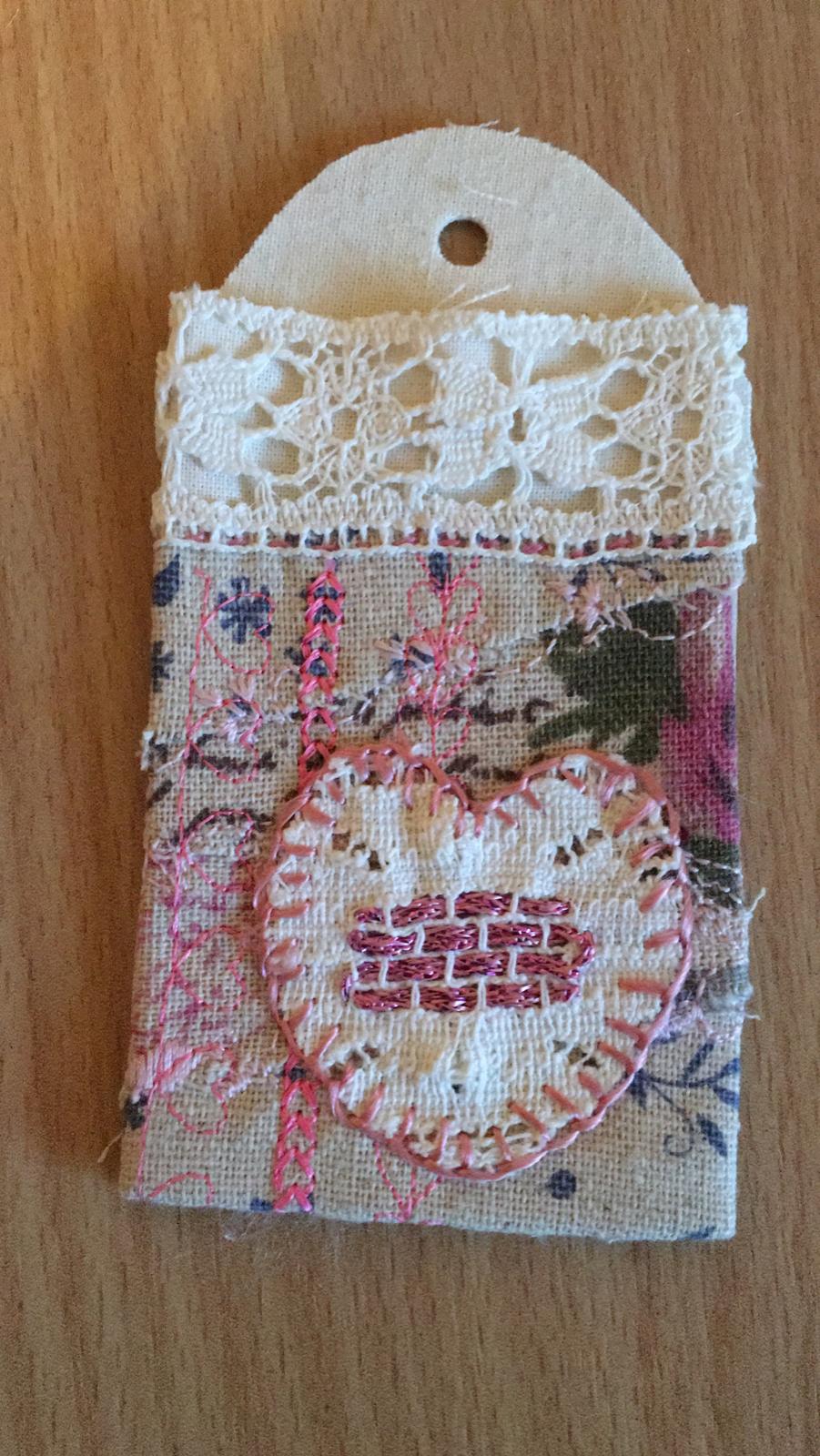 Our 2021 project was based on a challenge set by textile artist Anne Brooke, Sue V coordinated the project for our group. We created a series of mini stitched pieces, one a week for 52 weeks, each with a theme given by Anne Brooke which we attached to a luggage label or similar with the date and a memory of that week written on the reverse of the label.