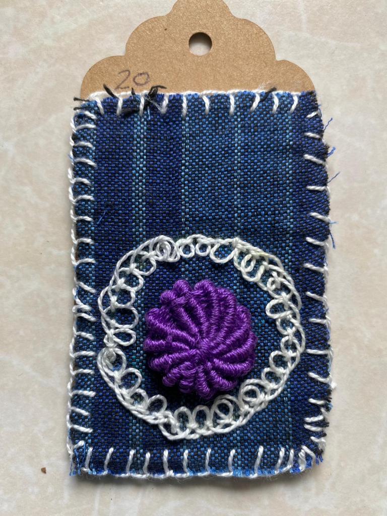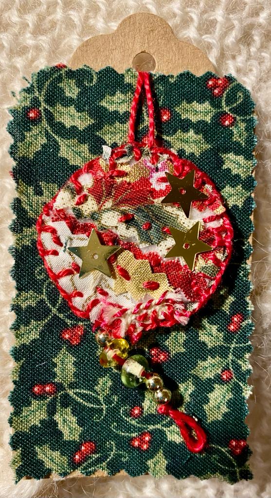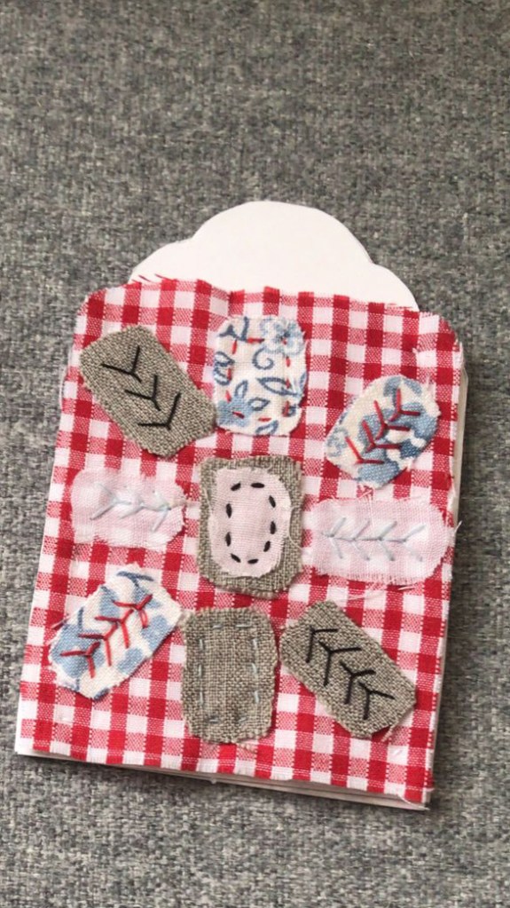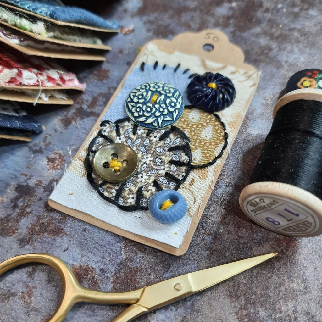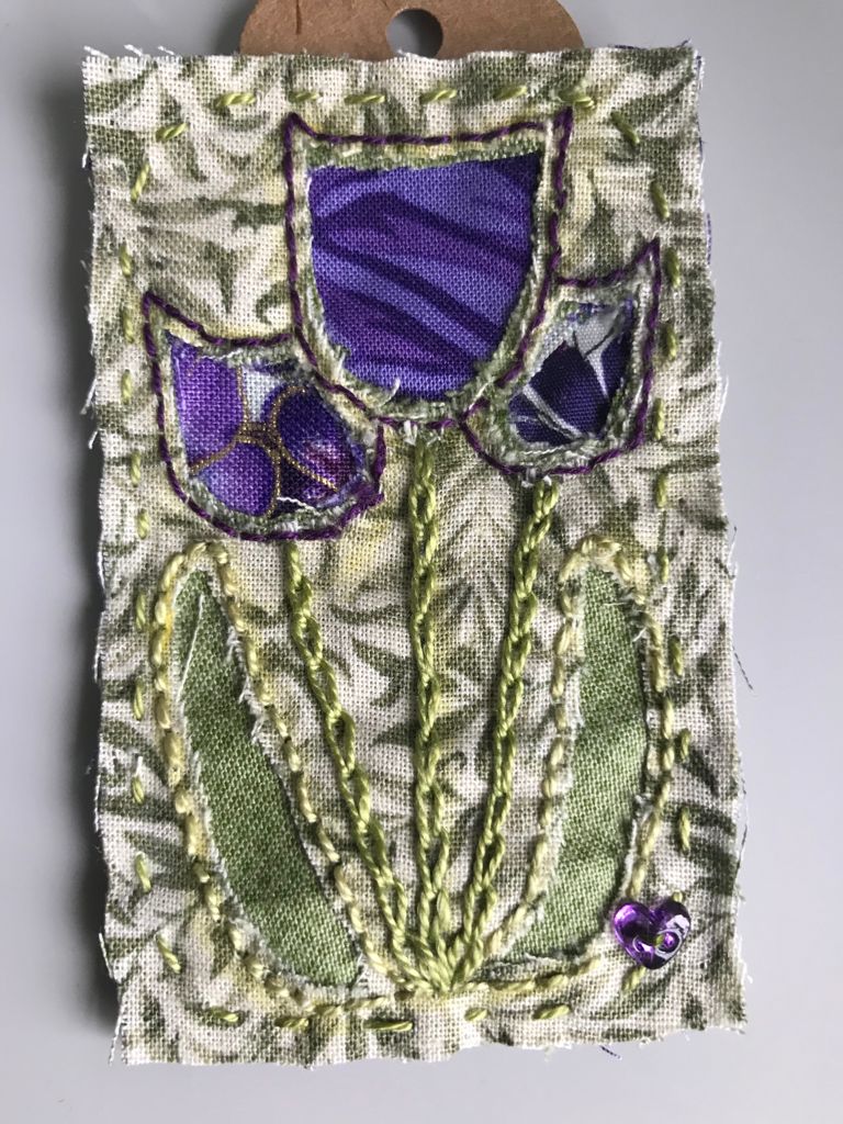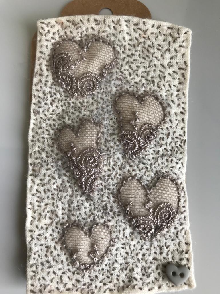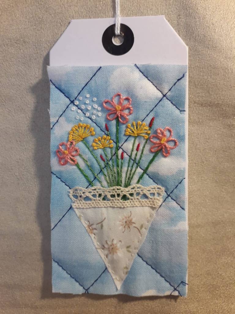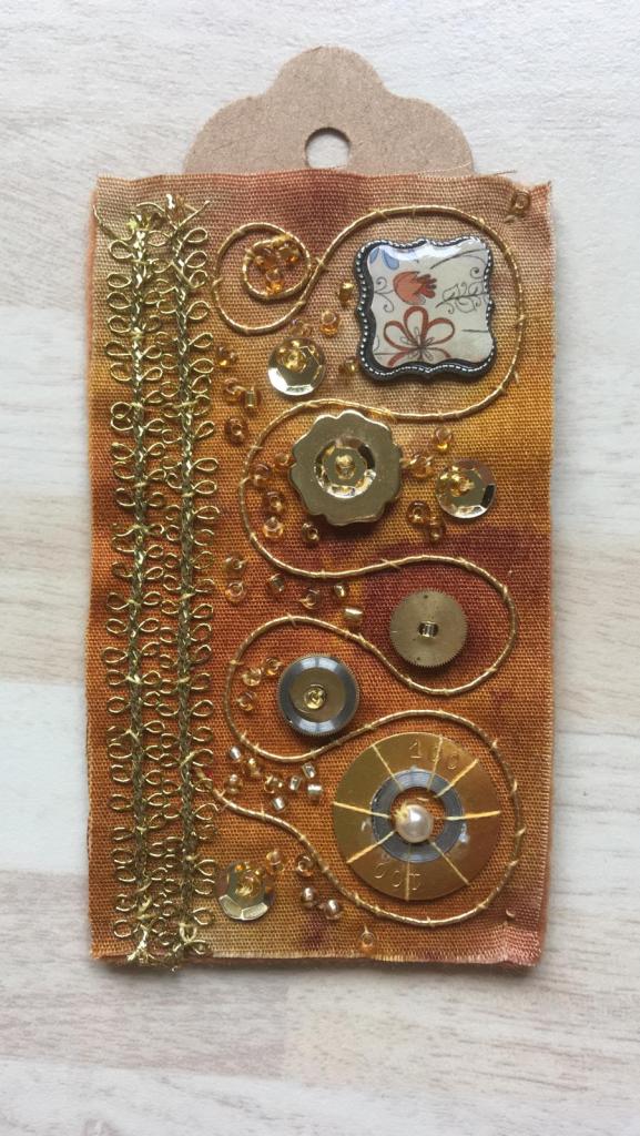 Our 2021 project was based on a challenge set by textile artist Anne Brooke, Sue V coordinated the project for our group. We created a series of mini stitched pieces, one a week for 52 weeks, each with a theme given by Anne Brooke which we attached to a luggage label or similar with the date and a memory of that week written on the reverse of the label.
