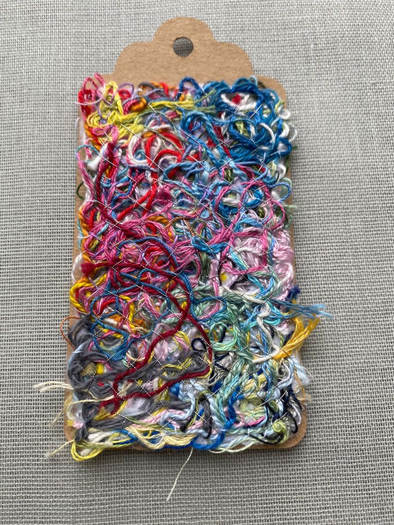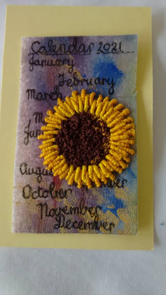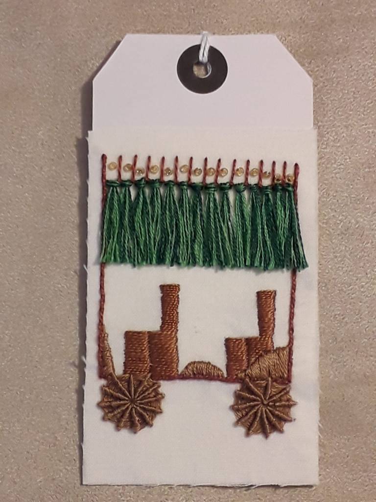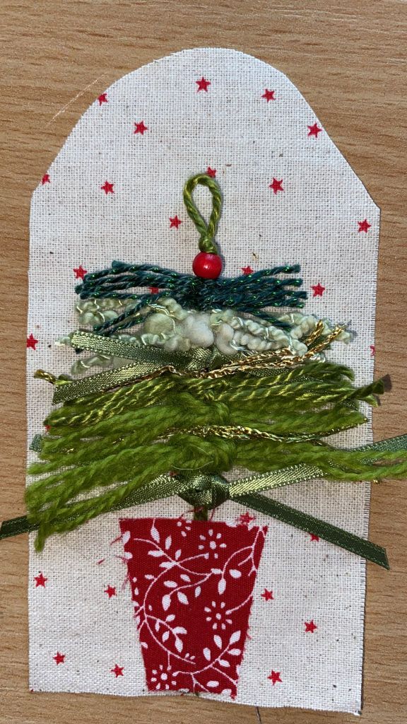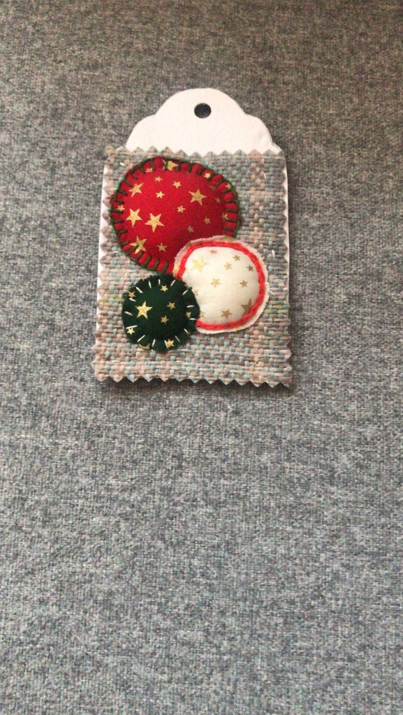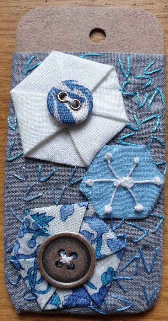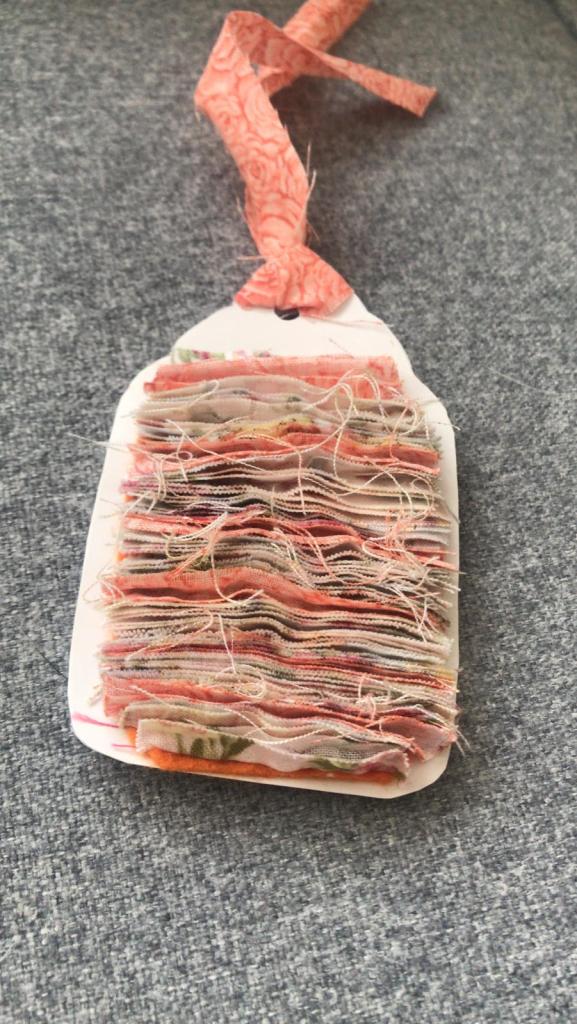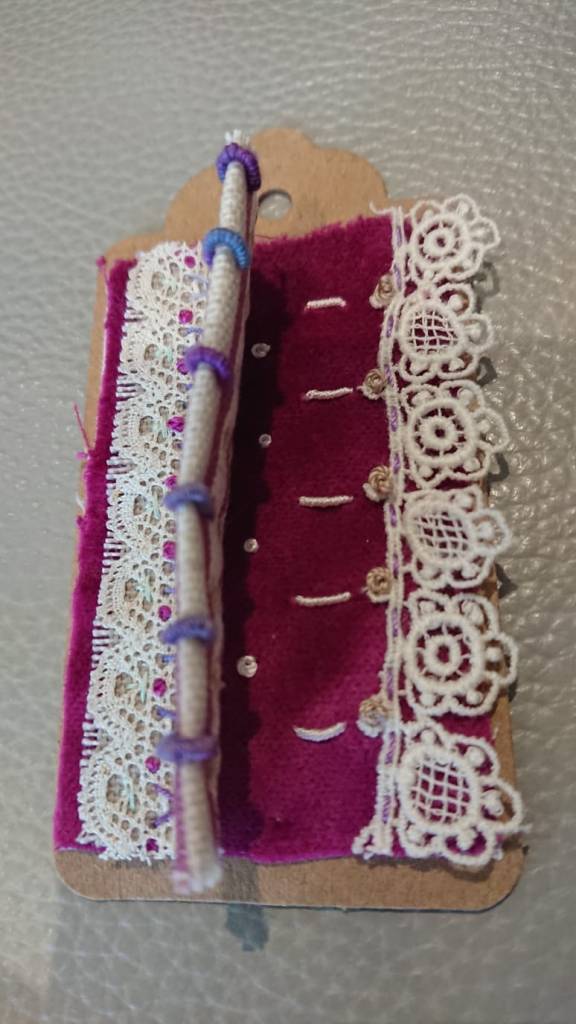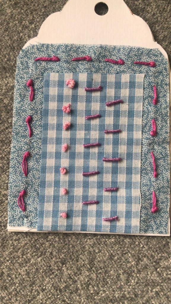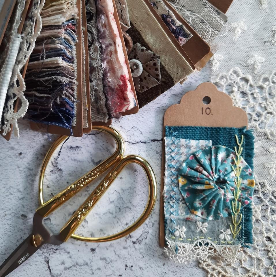 Our 2021 project was based on a challenge set by textile artist Anne Brooke, Sue V coordinated the project for our group. We created a series of mini stitched pieces, one a week for 52 weeks, each with a theme given by Anne Brooke which we attached to a luggage label or similar with the date and a memory of that week written on the reverse of the label.