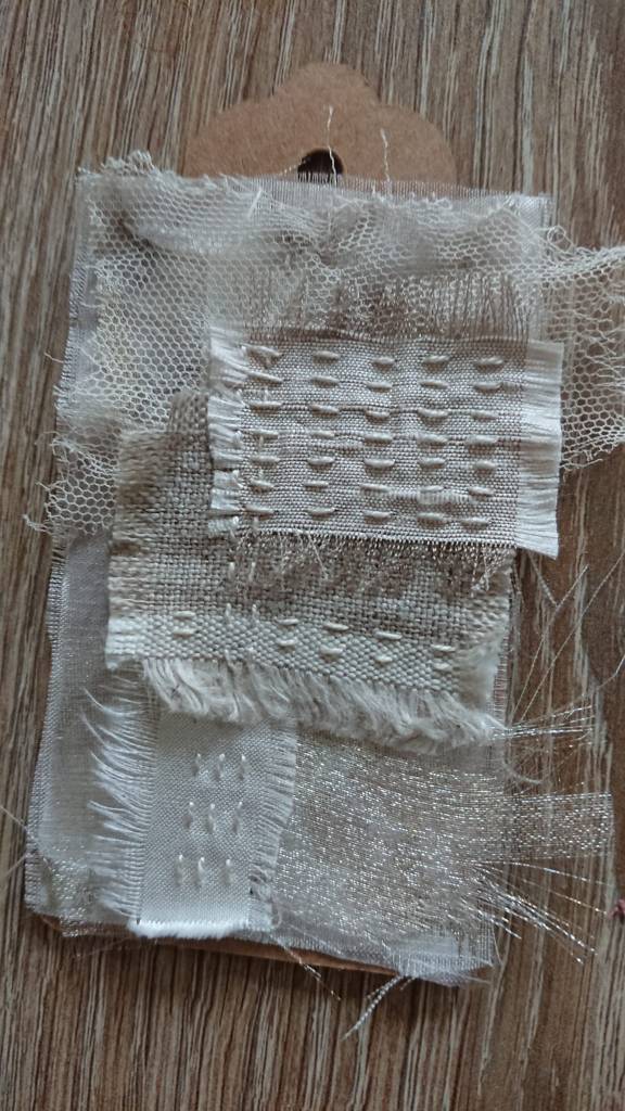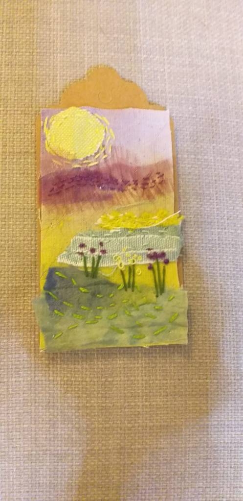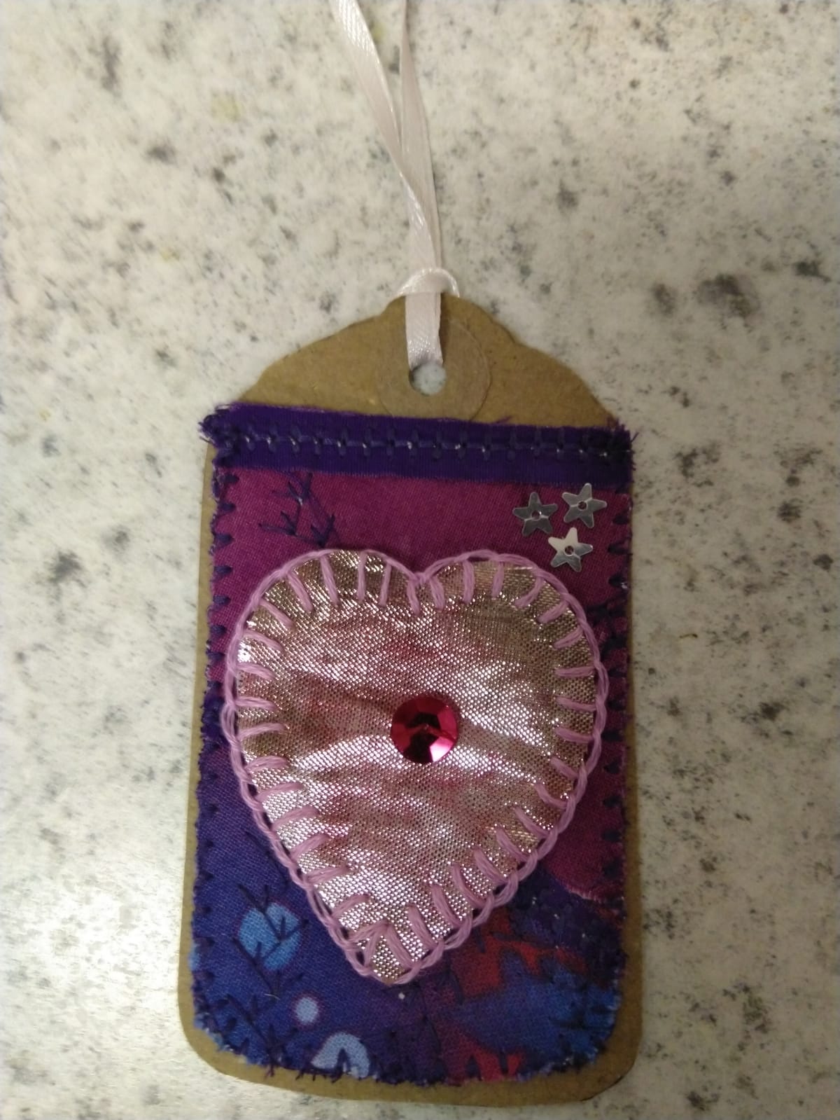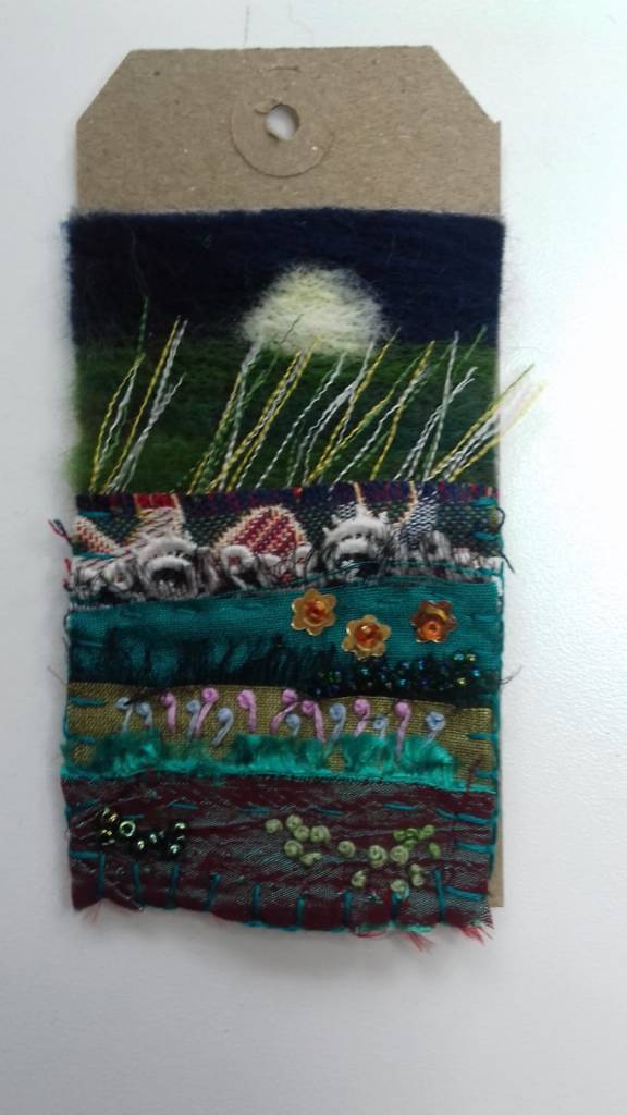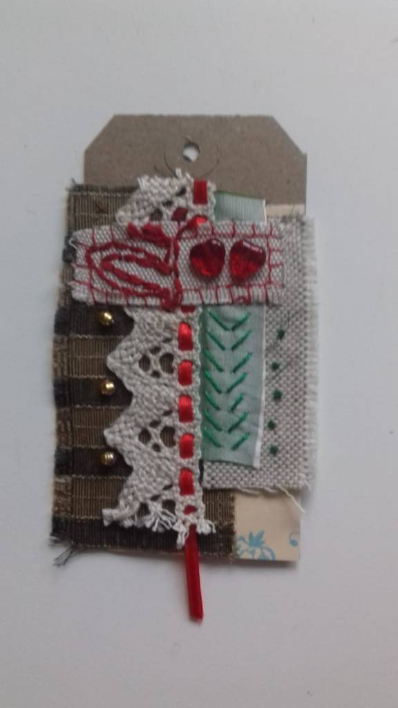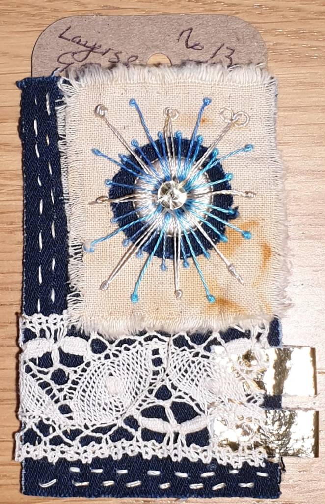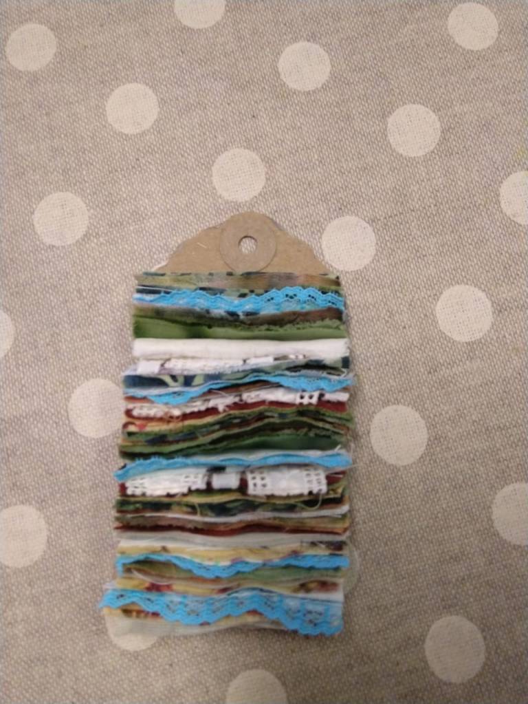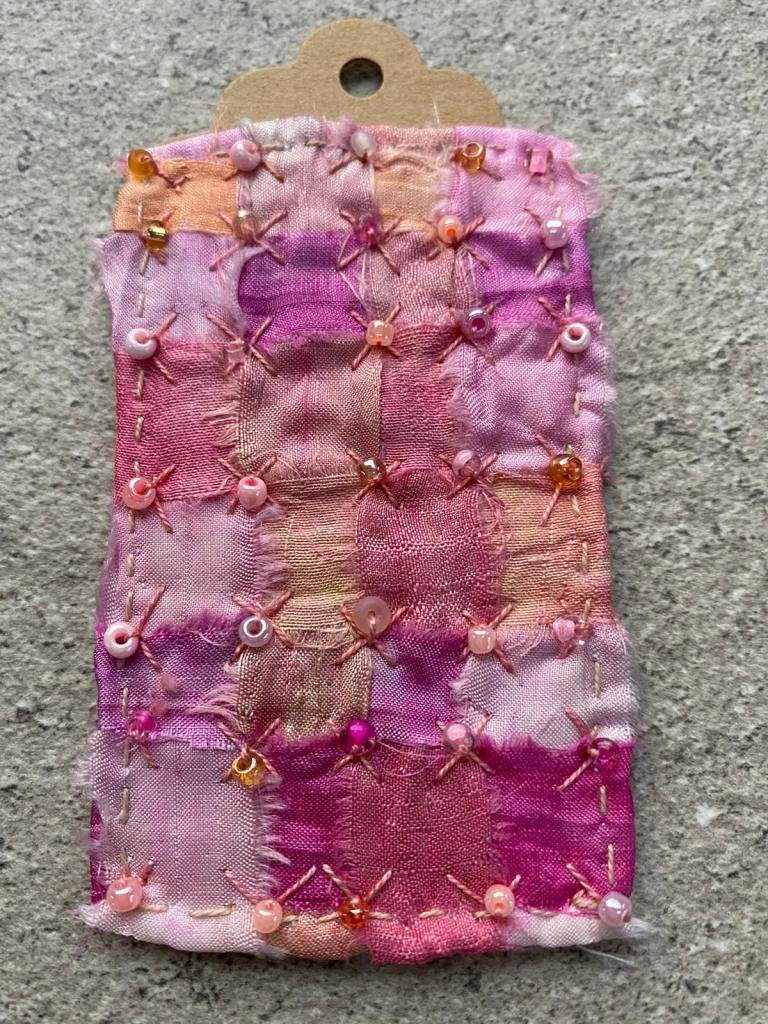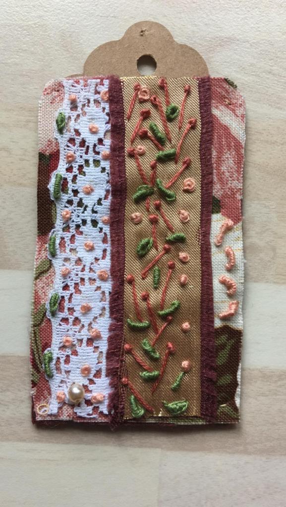 Our 2021 project was based on a challenge set by textile artist Anne Brooke, Sue V coordinated the project for our group. We created a series of mini stitched pieces, one a week for 52 weeks, each with a theme given by Anne Brooke which we attached to a luggage label or similar with the date and a memory of that week written on the reverse of the label.