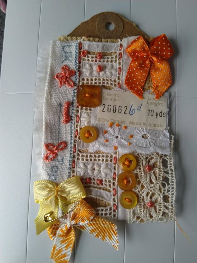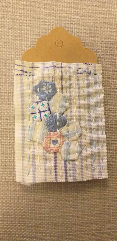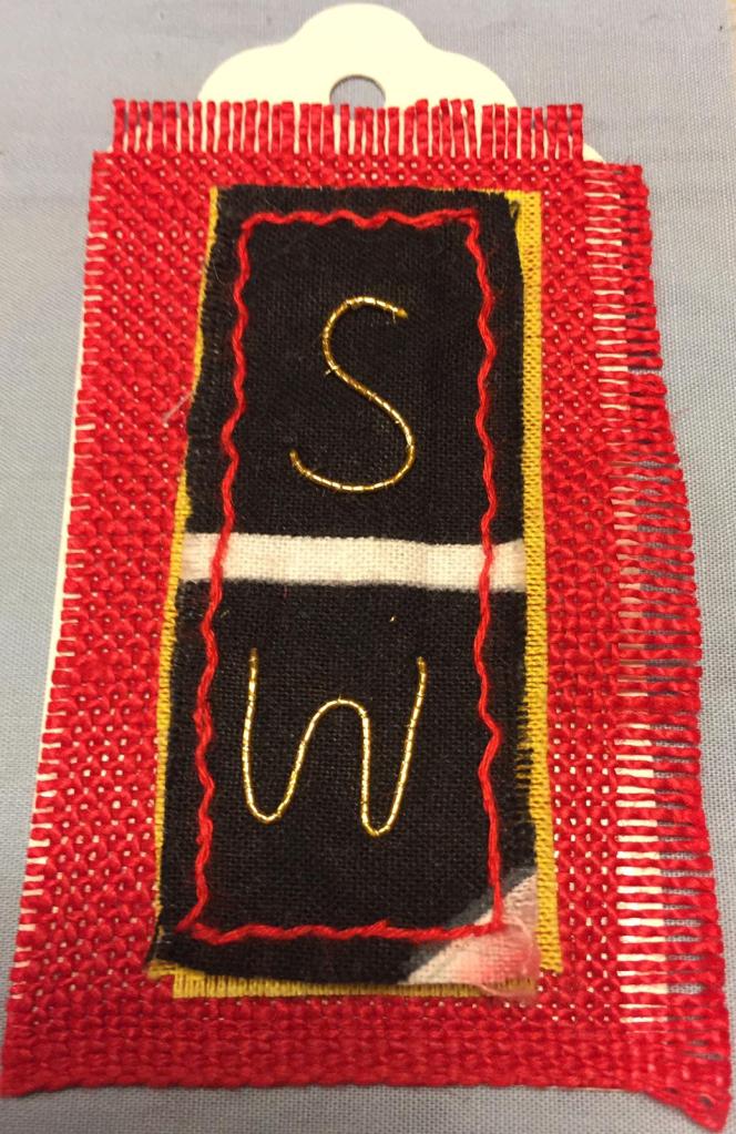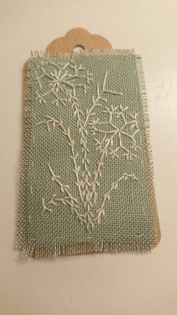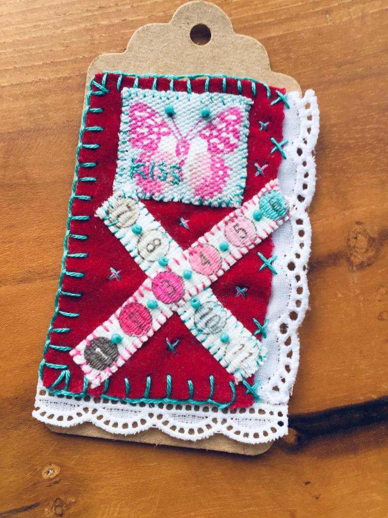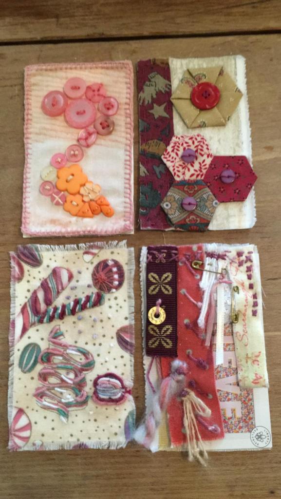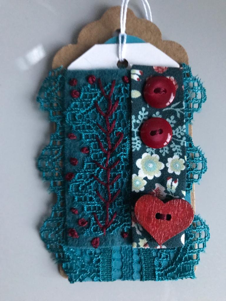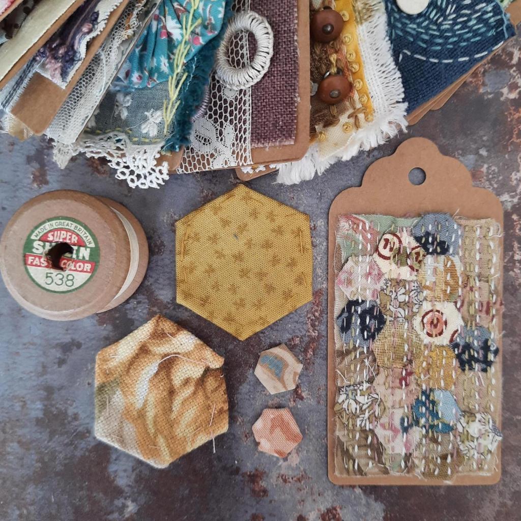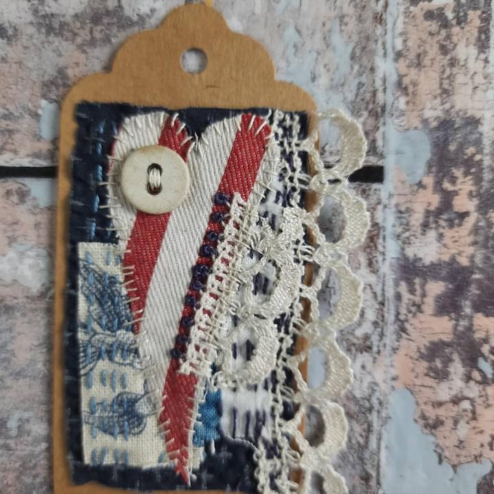 Our 2021 project was based on a challenge set by textile artist Anne Brooke, Sue V coordinated the project for our group. We created a series of mini stitched pieces, one a week for 52 weeks, each with a theme given by Anne Brooke which we attached to a luggage label or similar with the date and a memory of that week written on the reverse of the label.