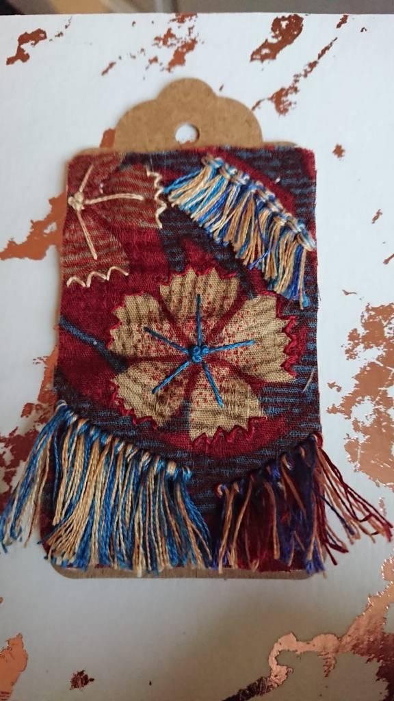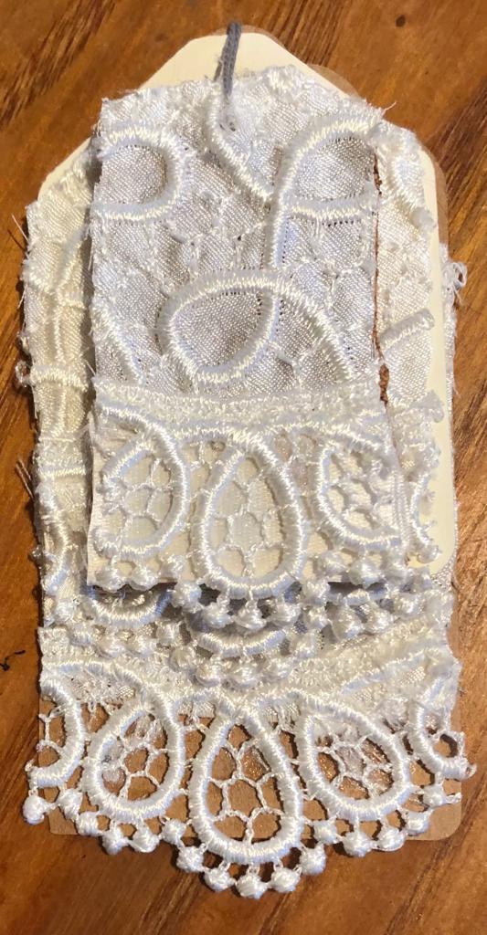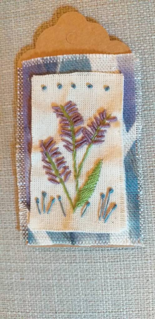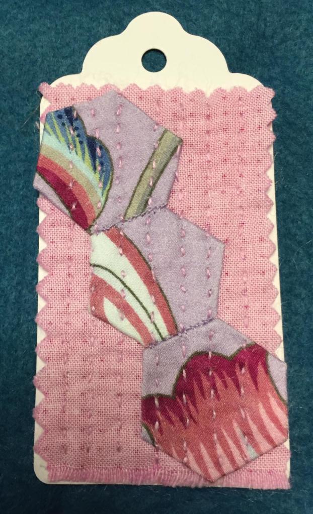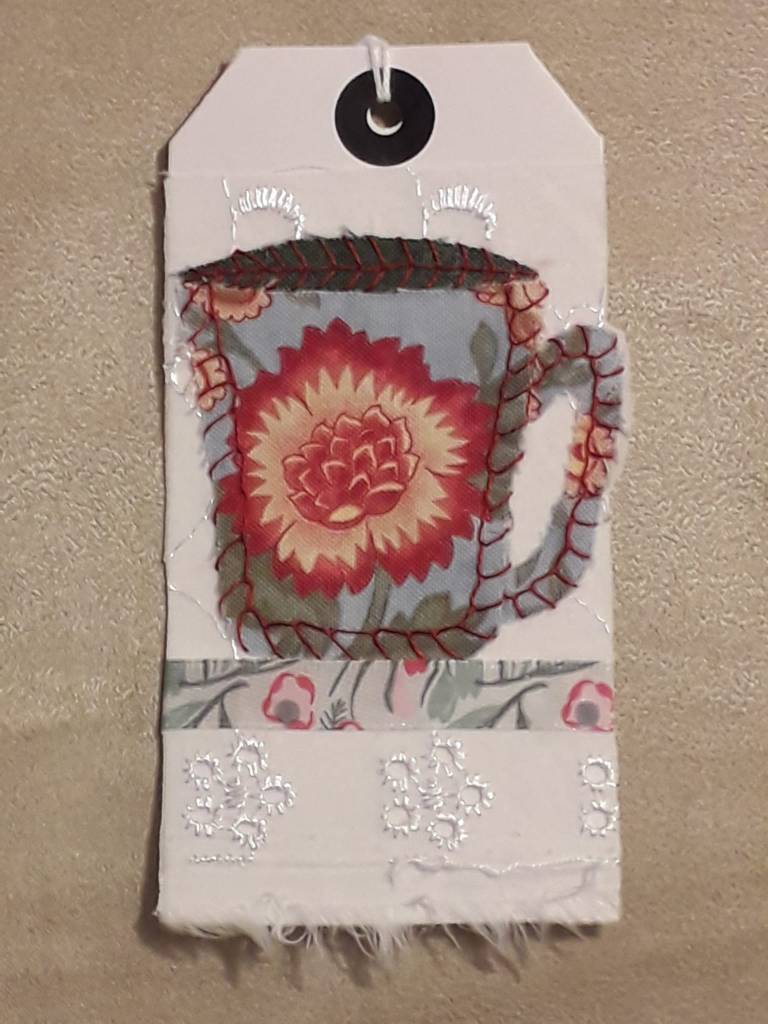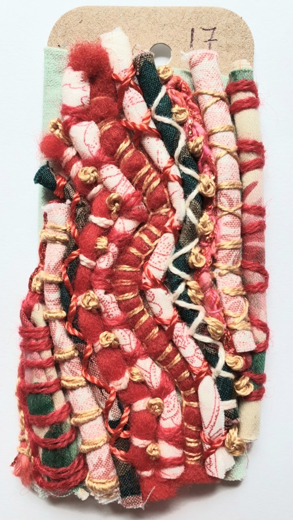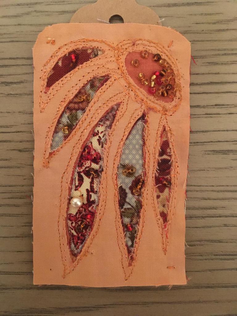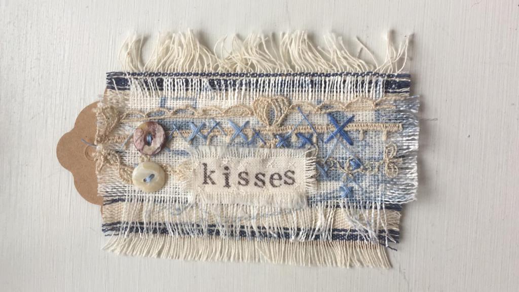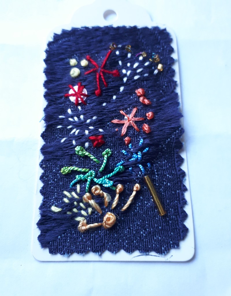 Our 2021 project was based on a challenge set by textile artist Anne Brooke, Sue V coordinated the project for our group. We created a series of mini stitched pieces, one a week for 52 weeks, each with a theme given by Anne Brooke which we attached to a luggage label or similar with the date and a memory of that week written on the reverse of the label.