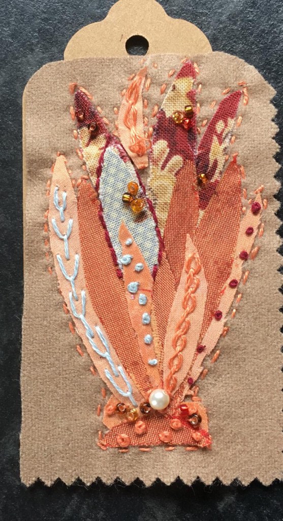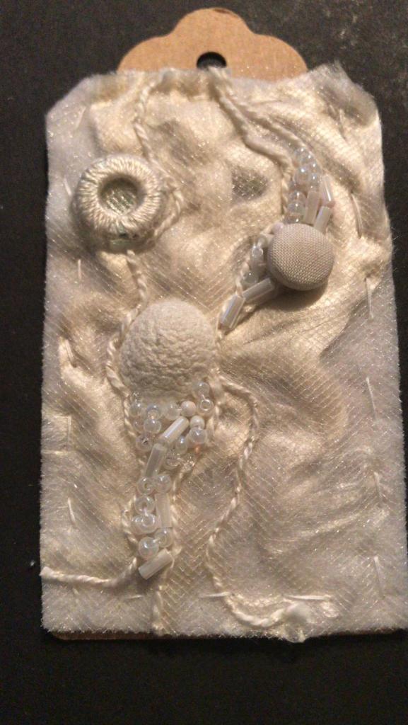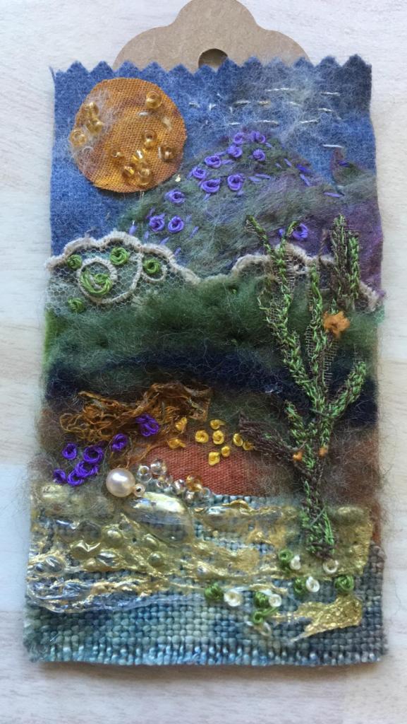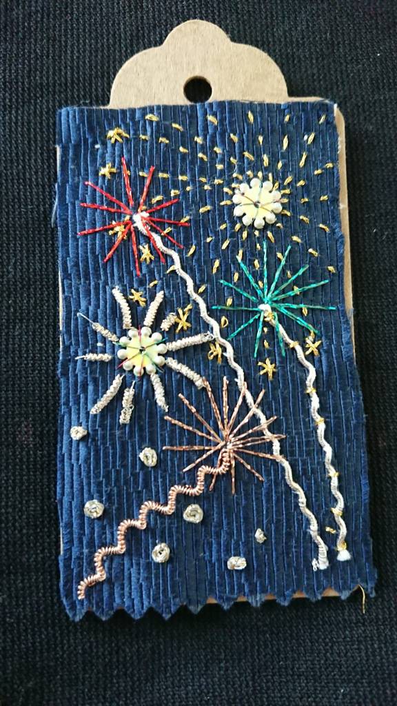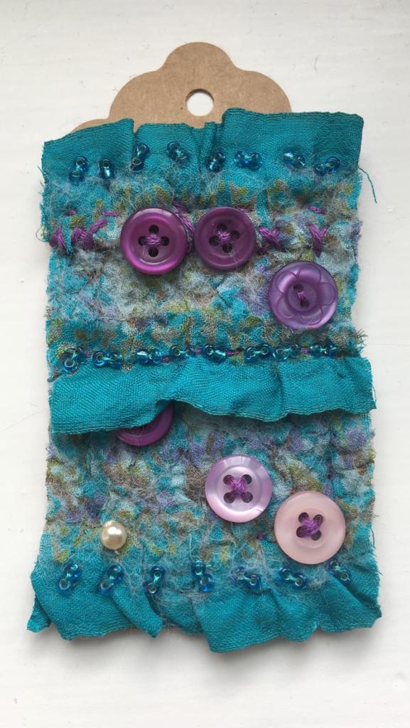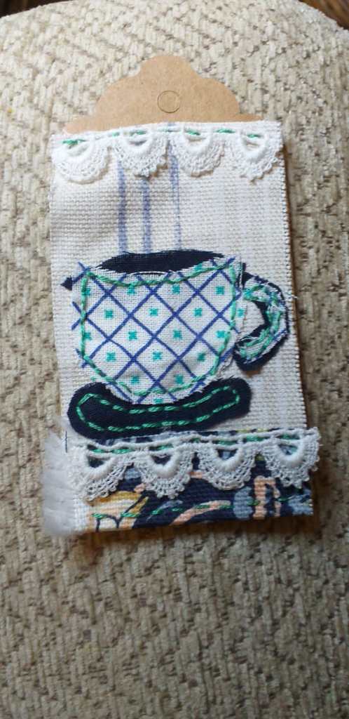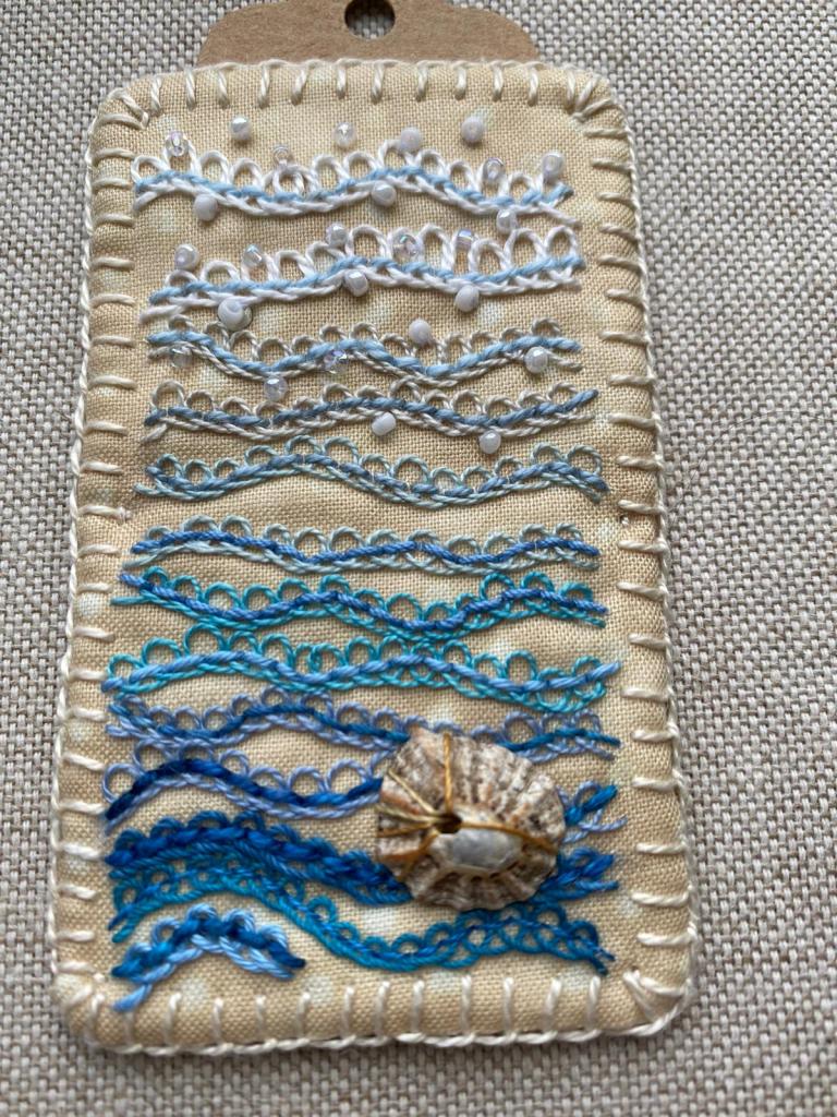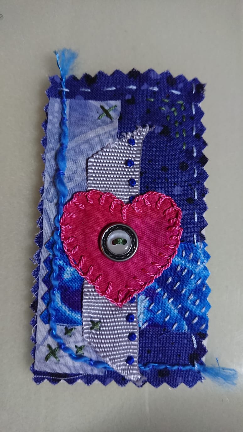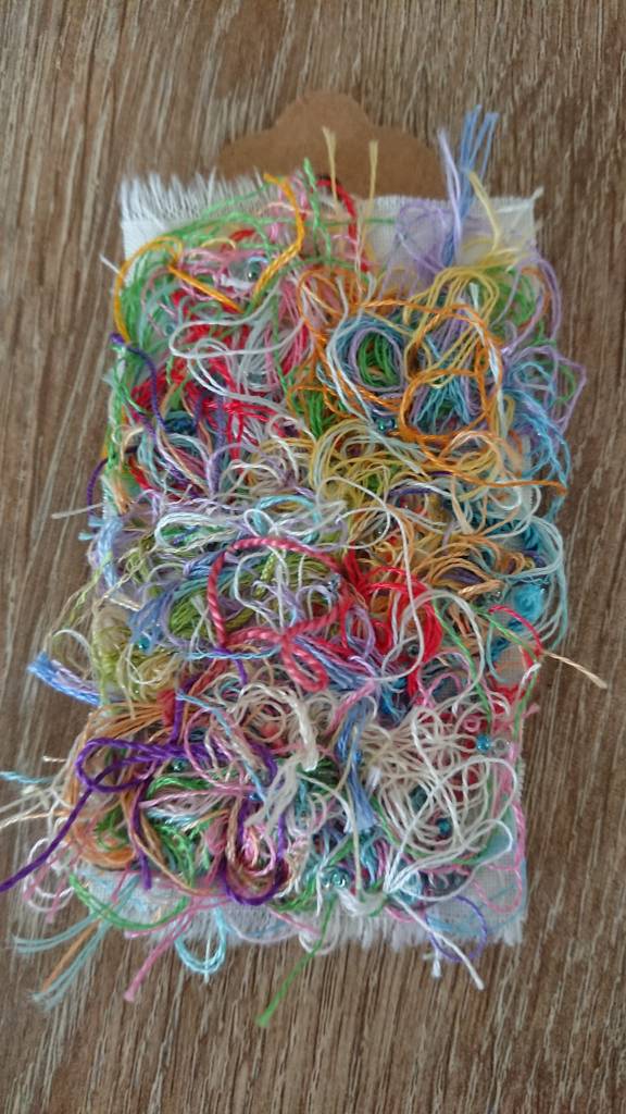 Our 2021 project was based on a challenge set by textile artist Anne Brooke, Sue V coordinated the project for our group. We created a series of mini stitched pieces, one a week for 52 weeks, each with a theme given by Anne Brooke which we attached to a luggage label or similar with the date and a memory of that week written on the reverse of the label.