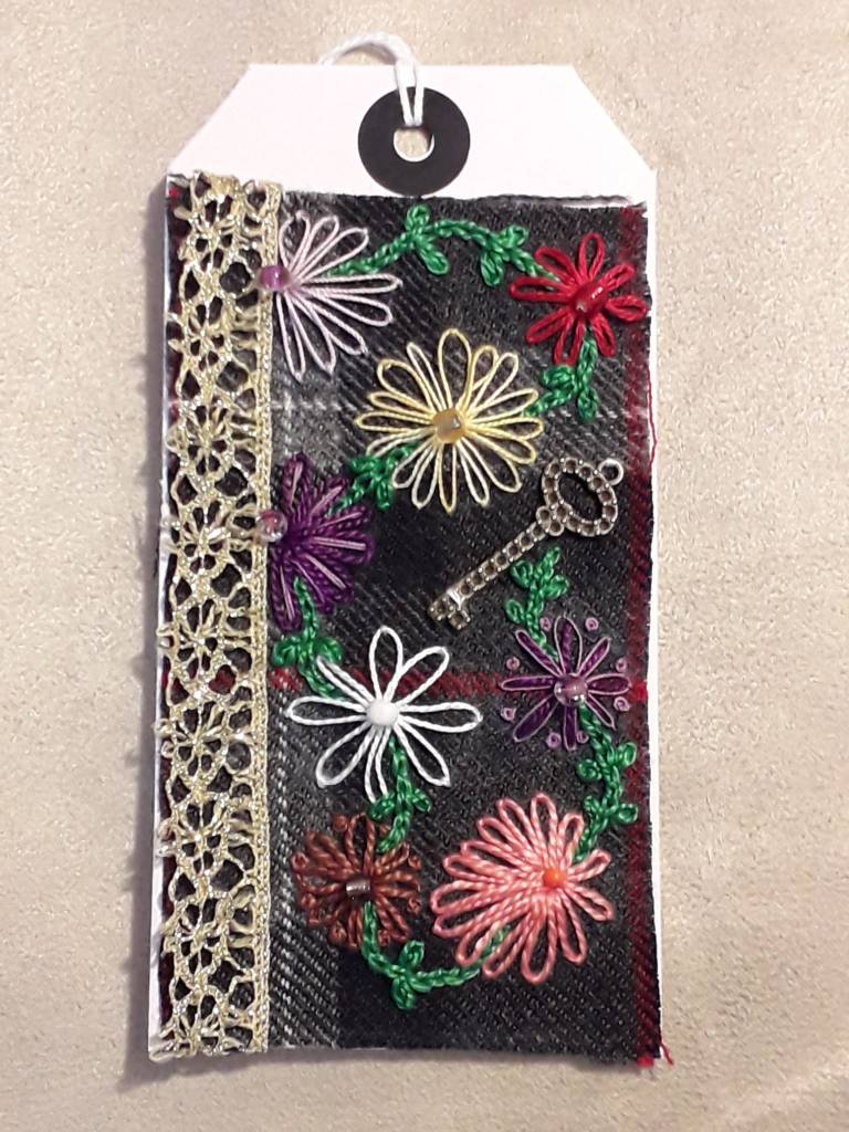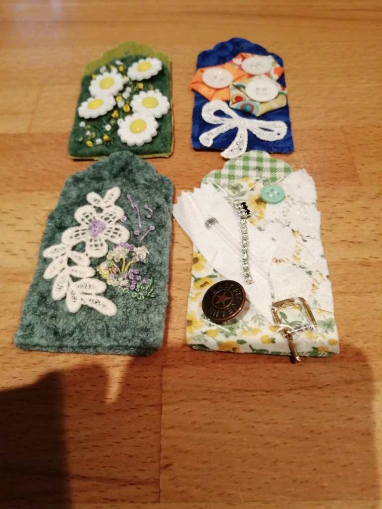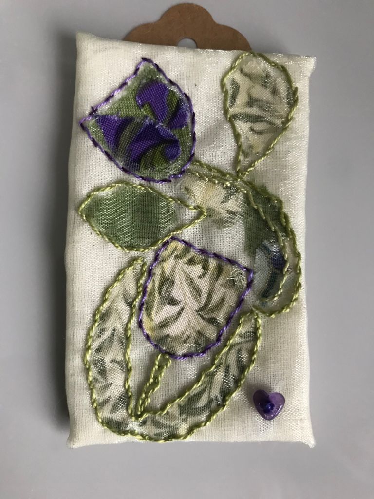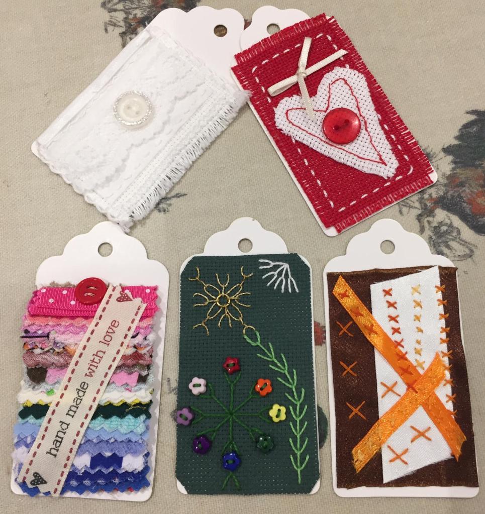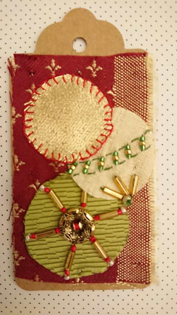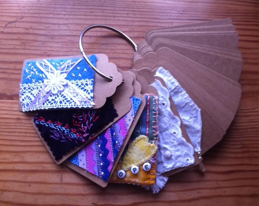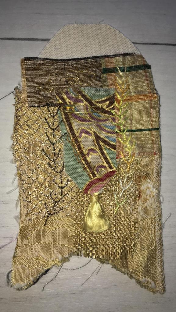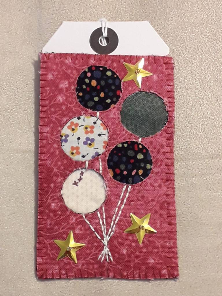 Our 2021 project was based on a challenge set by textile artist Anne Brooke, Sue V coordinated the project for our group. We created a series of mini stitched pieces, one a week for 52 weeks, each with a theme given by Anne Brooke which we attached to a luggage label or similar with the date and a memory of that week written on the reverse of the label.