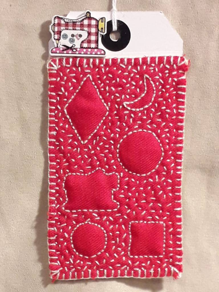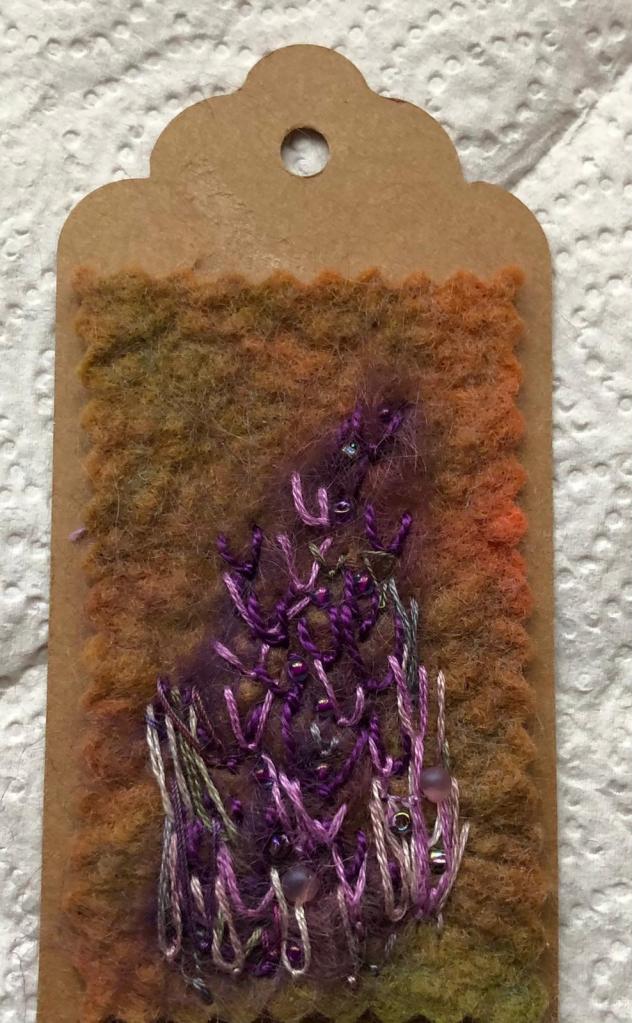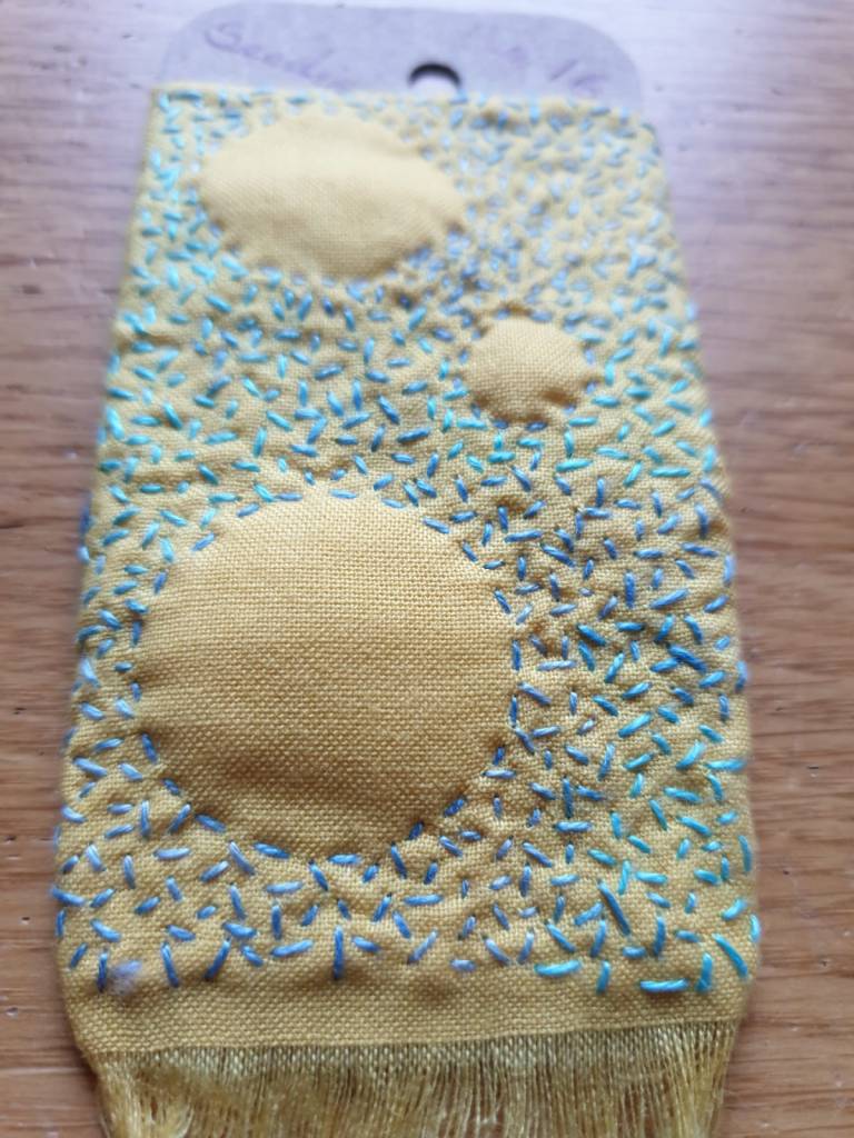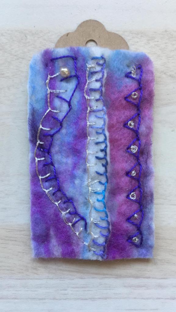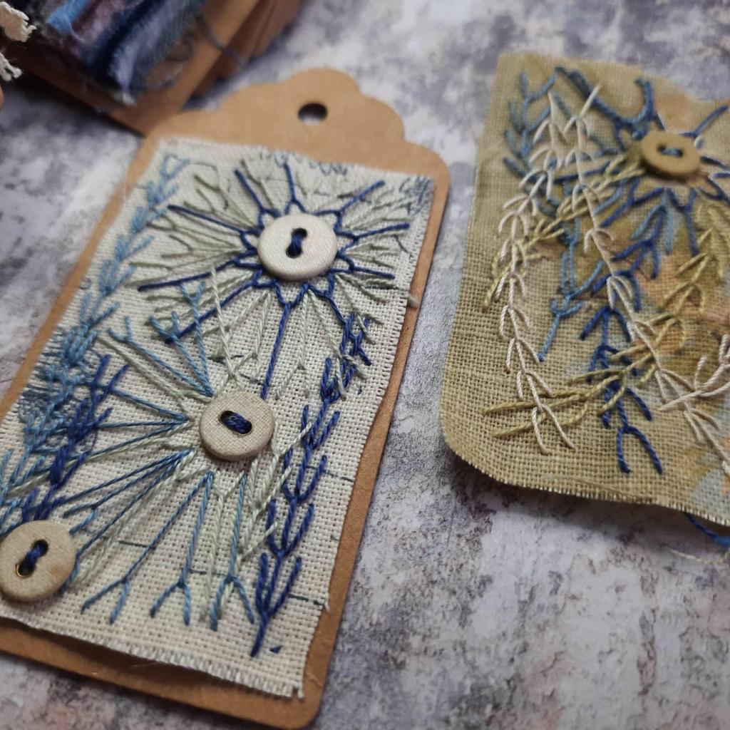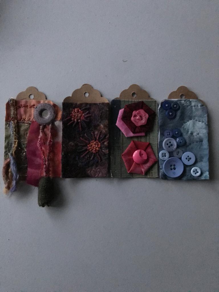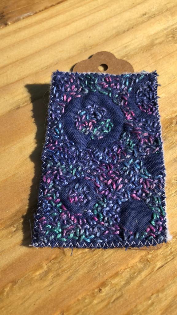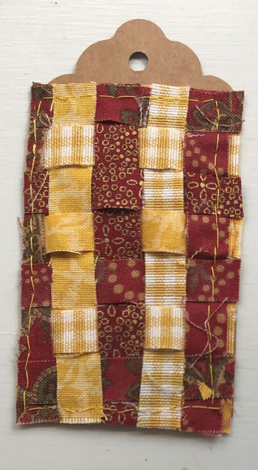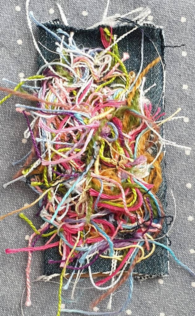 Our 2021 project was based on a challenge set by textile artist Anne Brooke, Sue V coordinated the project for our group. We created a series of mini stitched pieces, one a week for 52 weeks, each with a theme given by Anne Brooke which we attached to a luggage label or similar with the date and a memory of that week written on the reverse of the label.