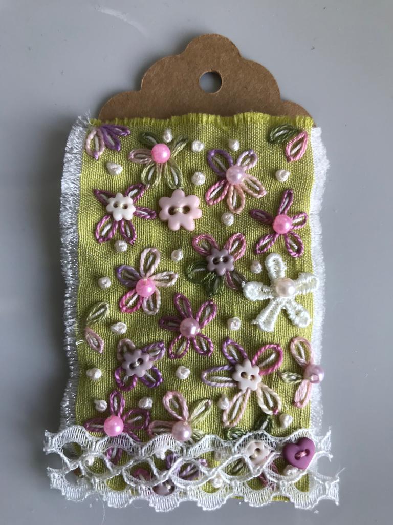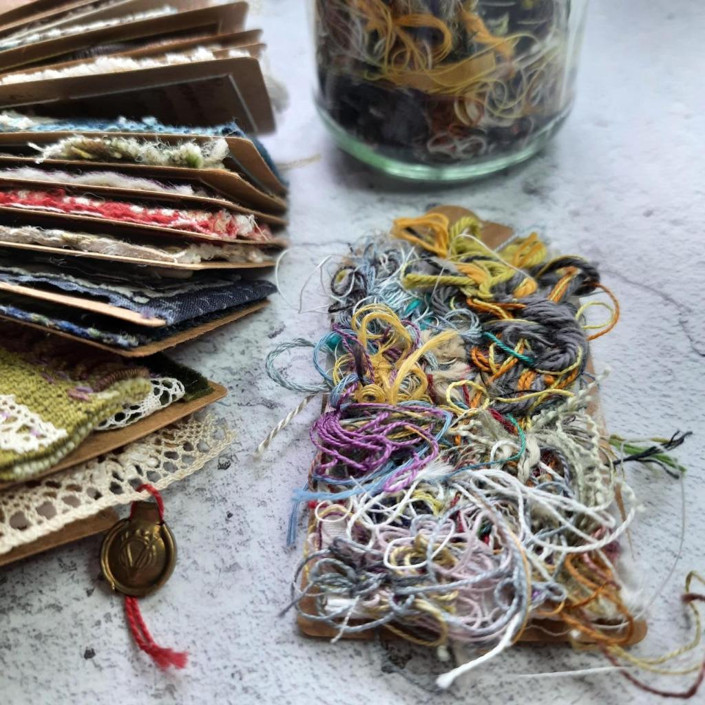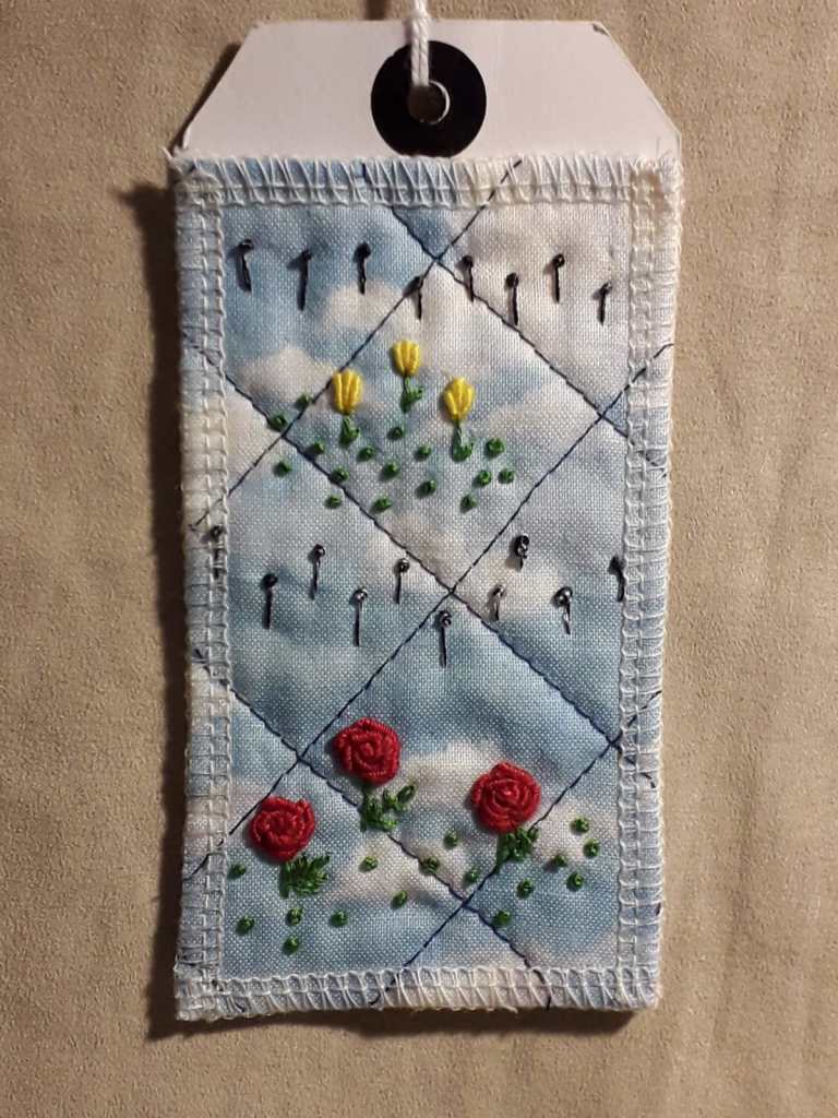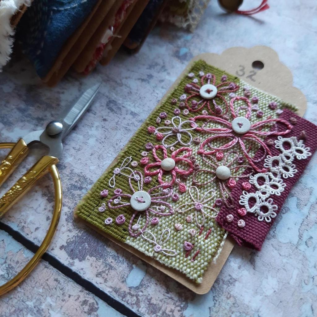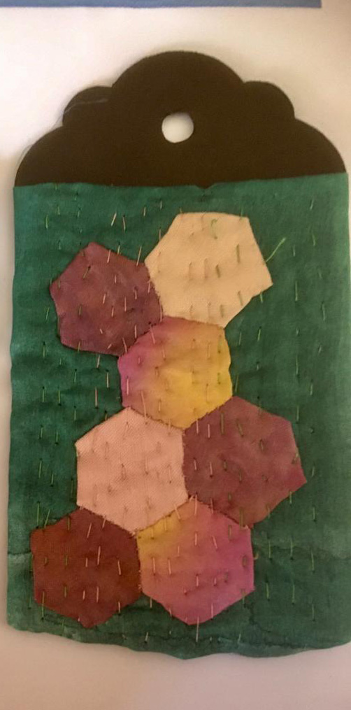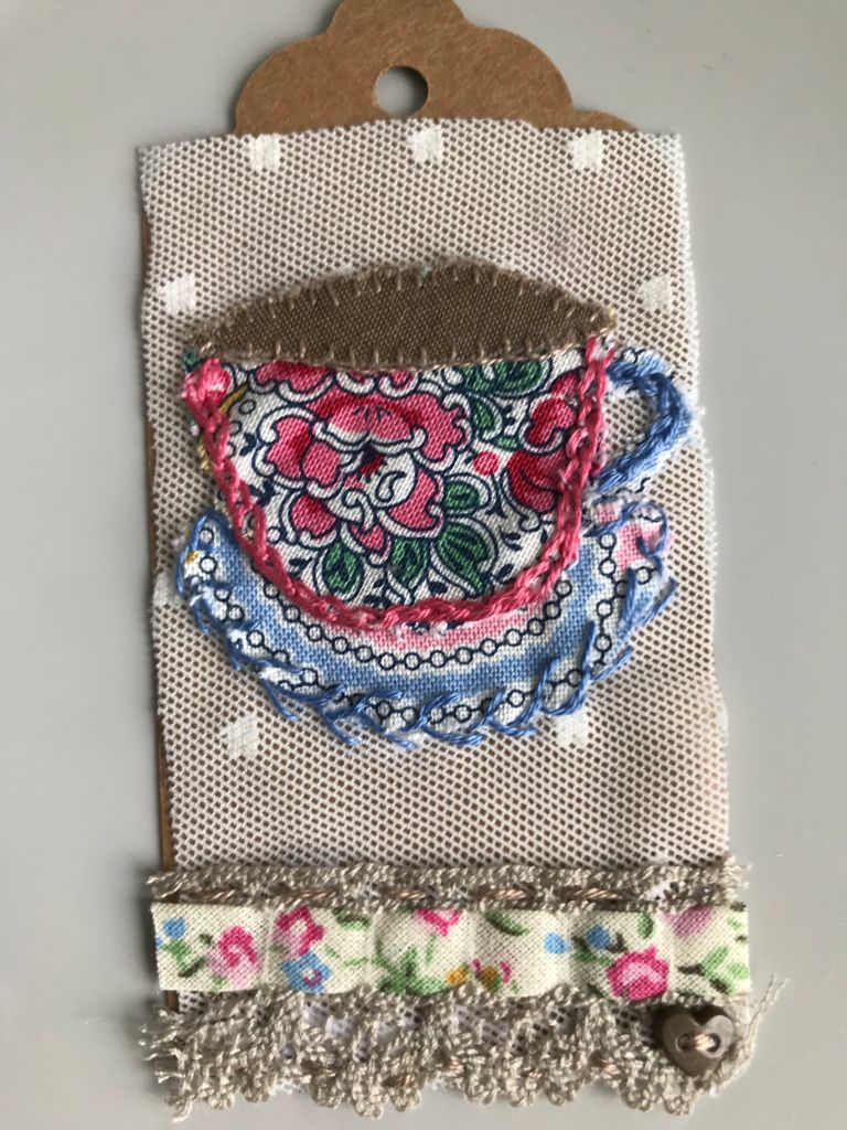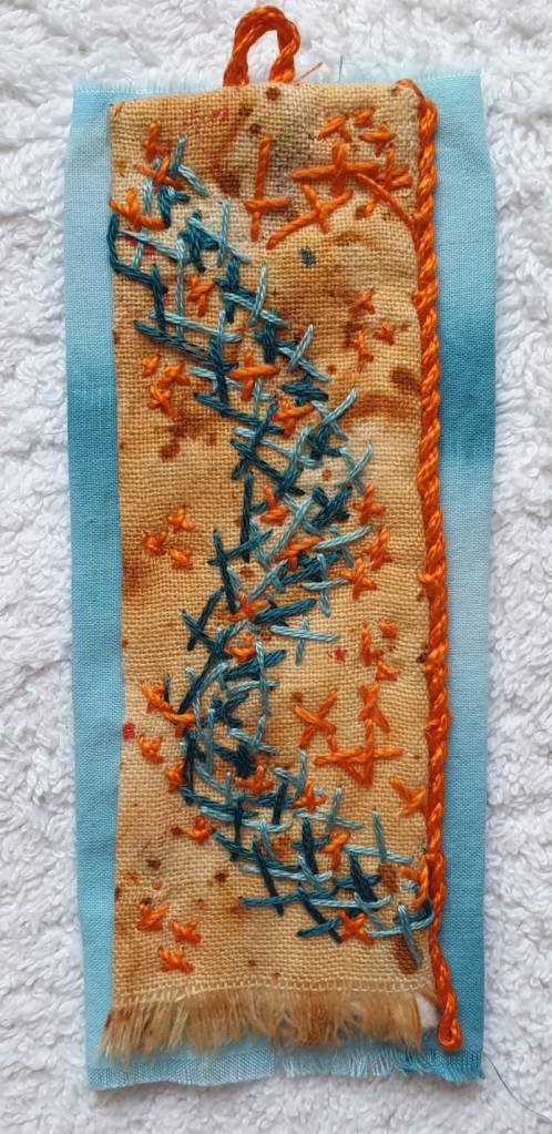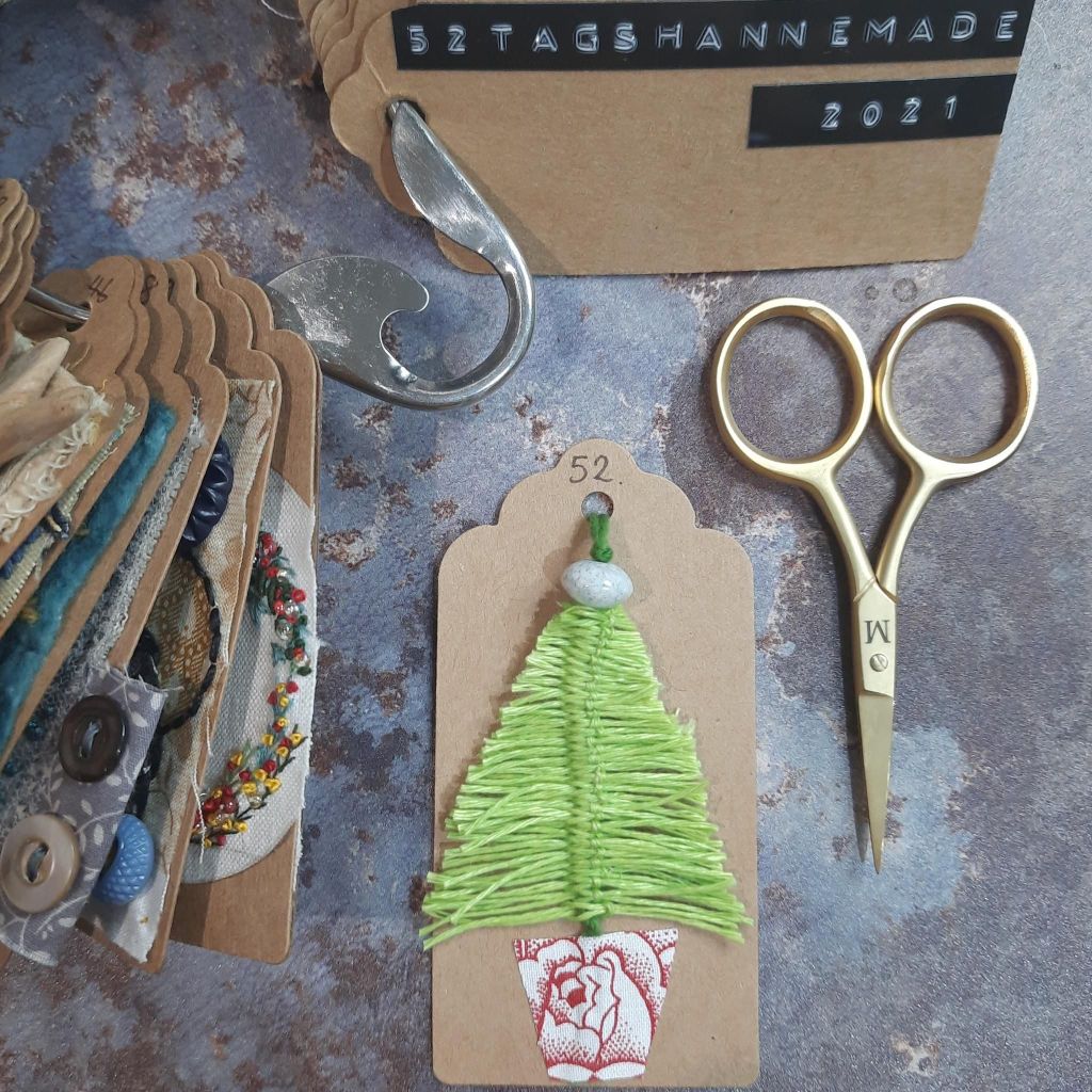 Our 2021 project was based on a challenge set by textile artist Anne Brooke, Sue V coordinated the project for our group. We created a series of mini stitched pieces, one a week for 52 weeks, each with a theme given by Anne Brooke which we attached to a luggage label or similar with the date and a memory of that week written on the reverse of the label.