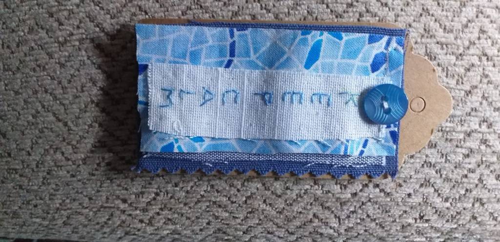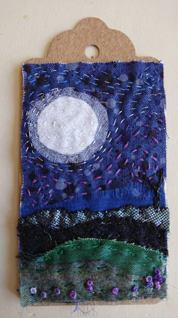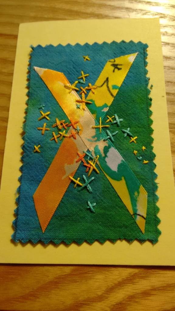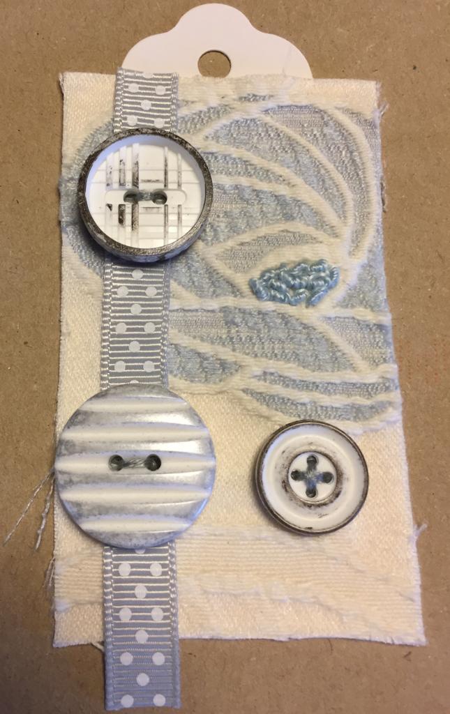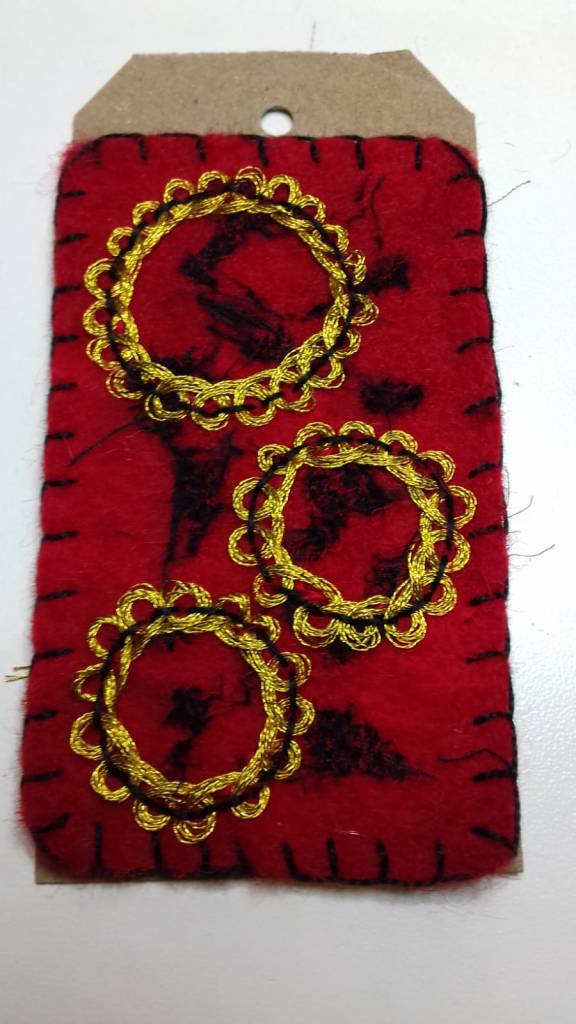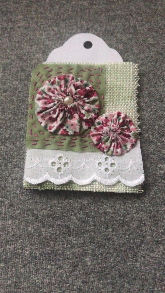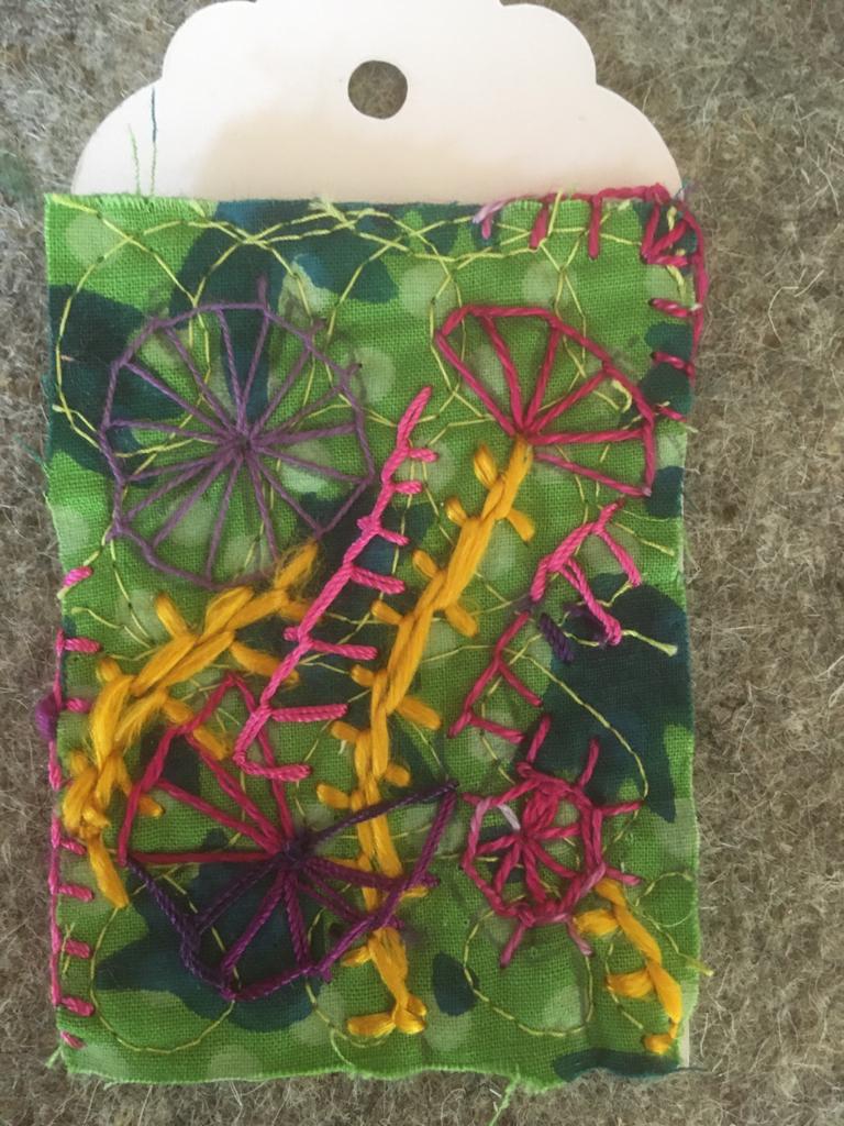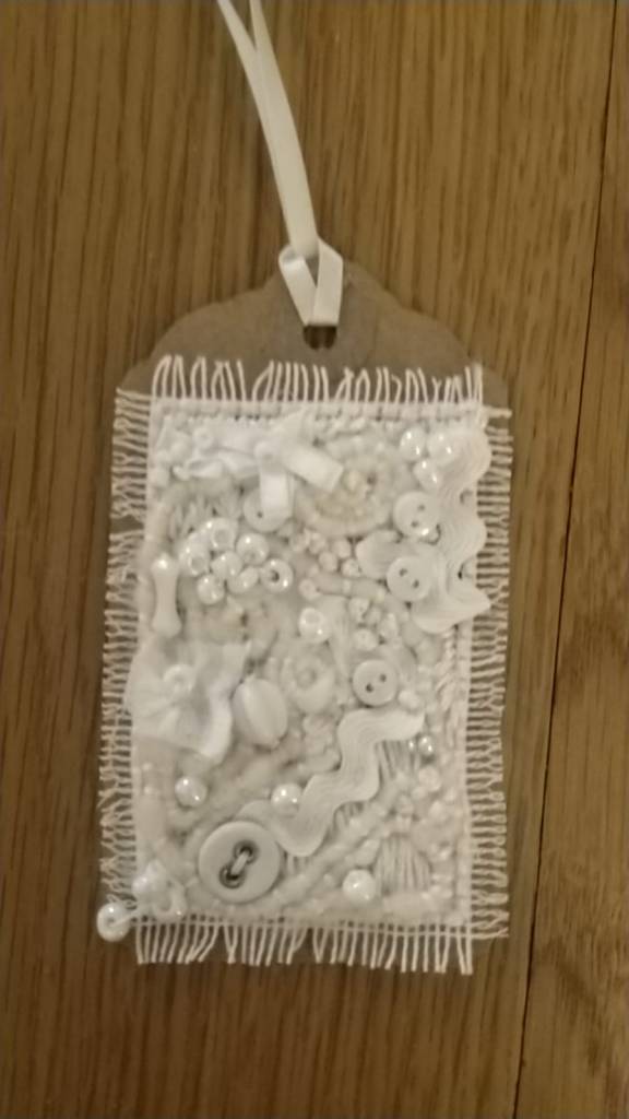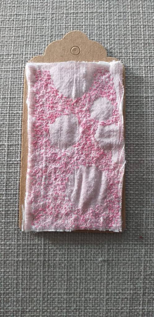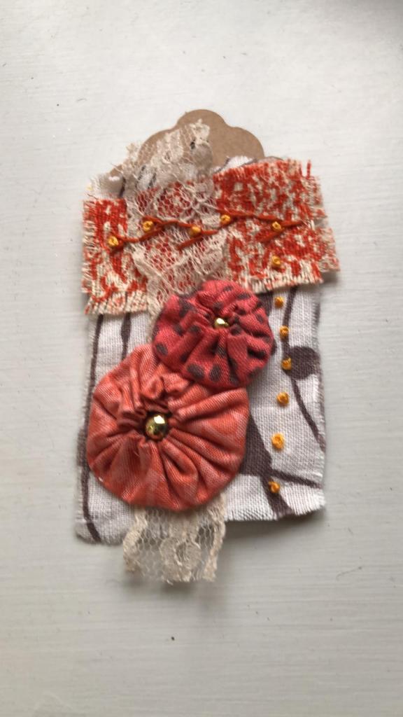 Our 2021 project was based on a challenge set by textile artist Anne Brooke, Sue V coordinated the project for our group. We created a series of mini stitched pieces, one a week for 52 weeks, each with a theme given by Anne Brooke which we attached to a luggage label or similar with the date and a memory of that week written on the reverse of the label.