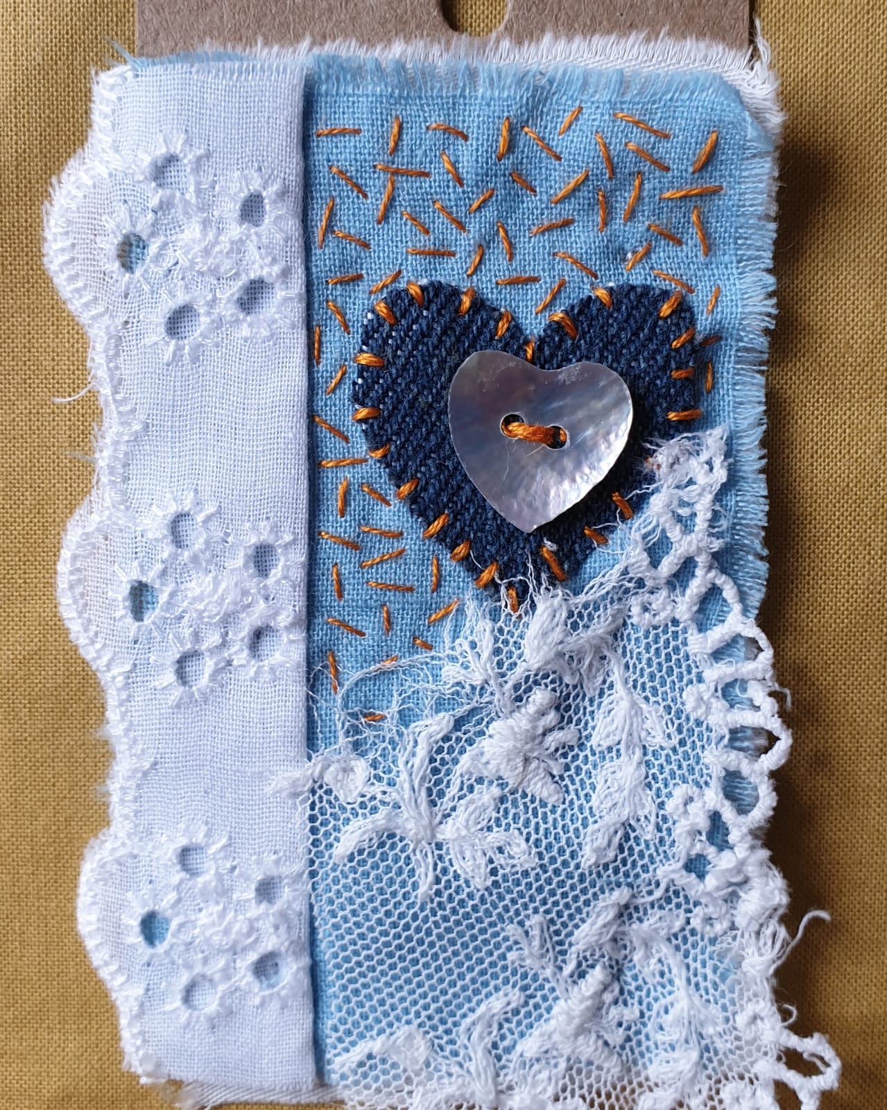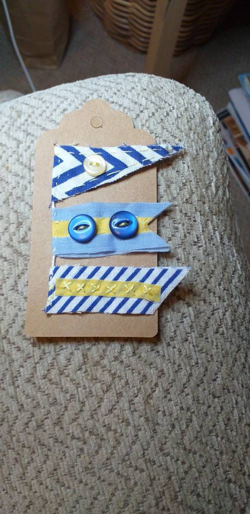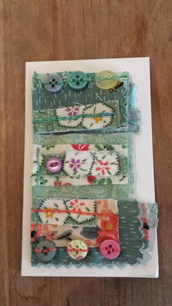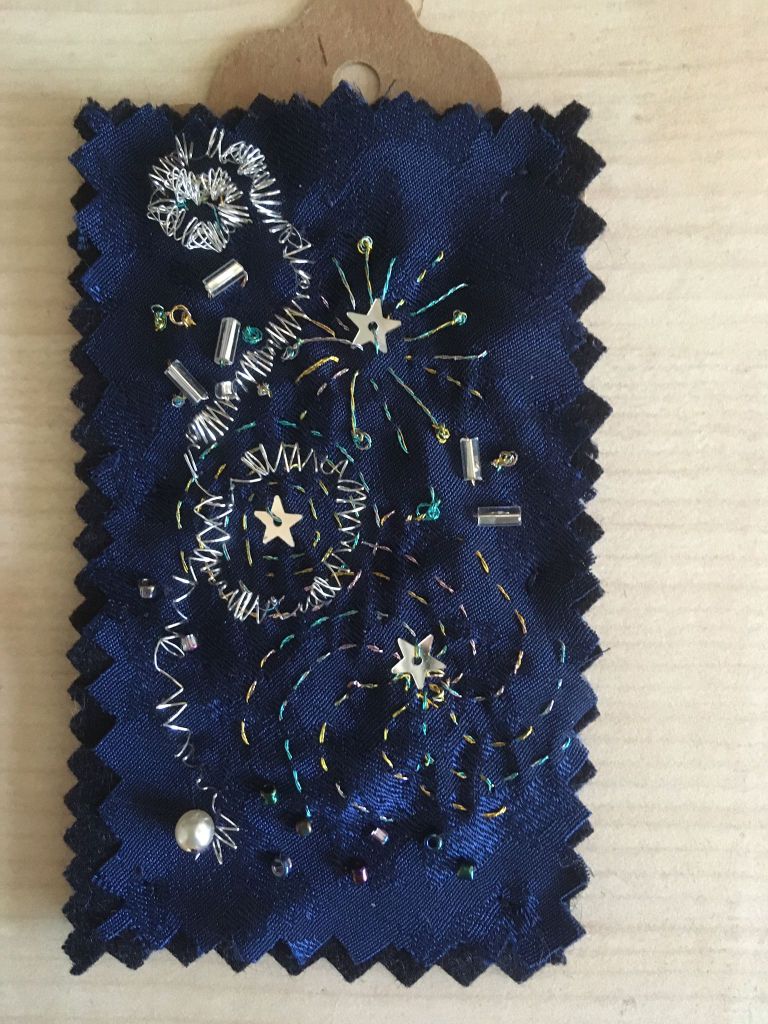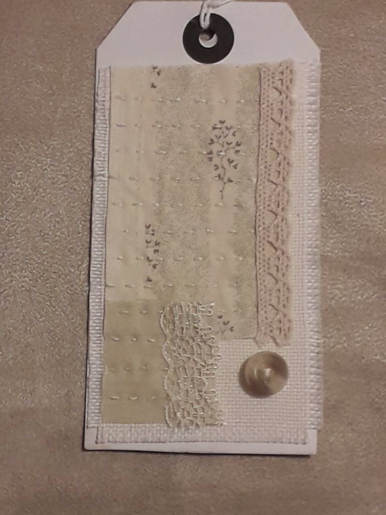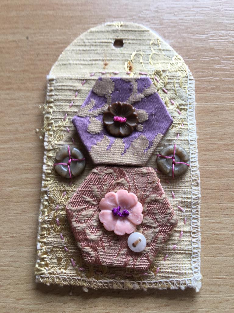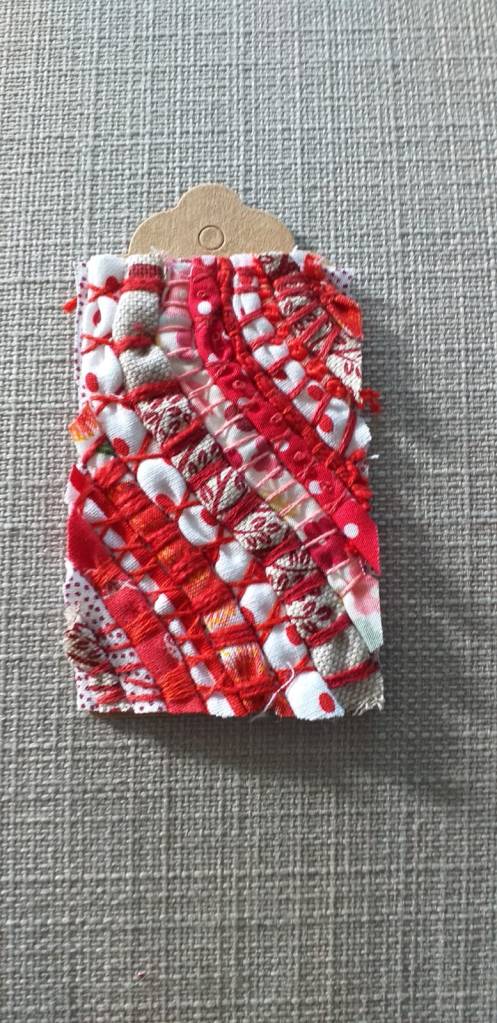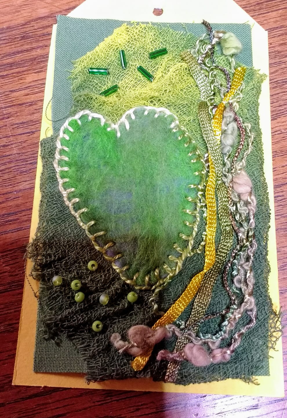 Our 2021 project was based on a challenge set by textile artist Anne Brooke, Sue V coordinated the project for our group. We created a series of mini stitched pieces, one a week for 52 weeks, each with a theme given by Anne Brooke which we attached to a luggage label or similar with the date and a memory of that week written on the reverse of the label.