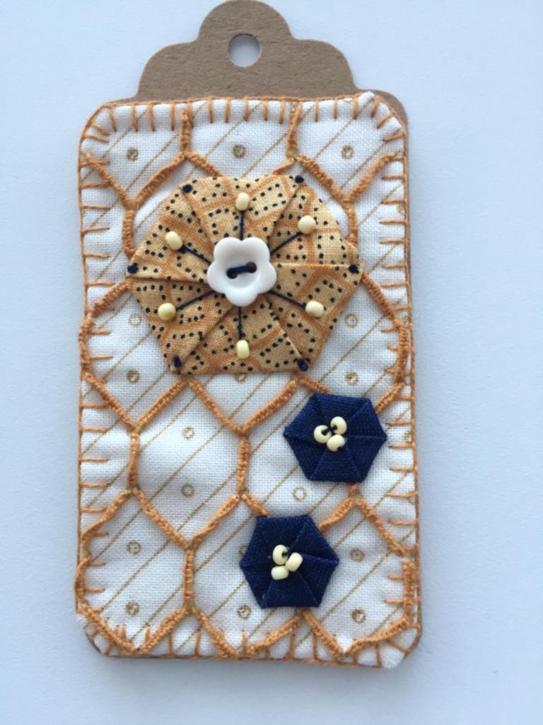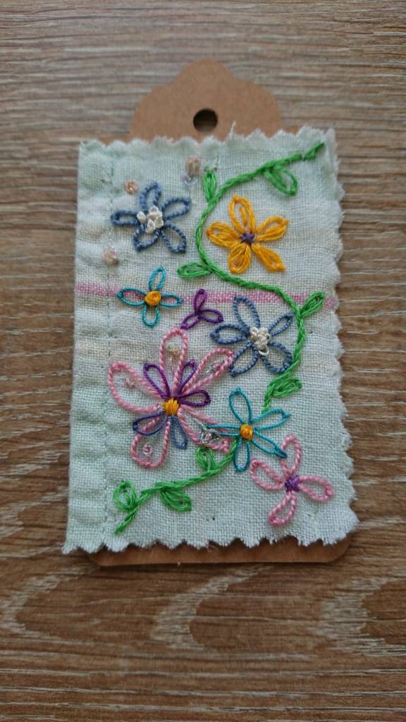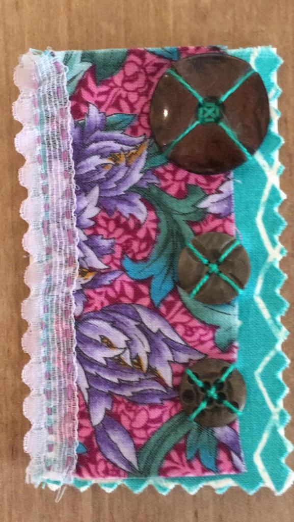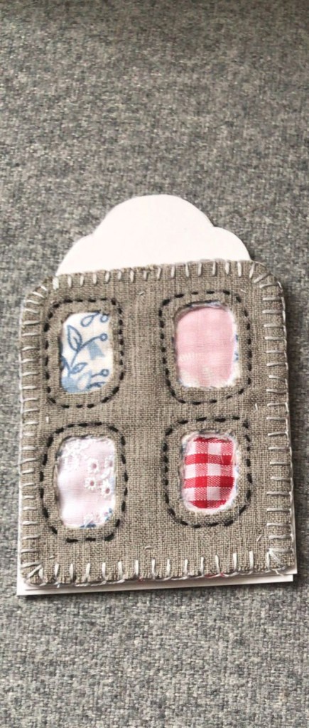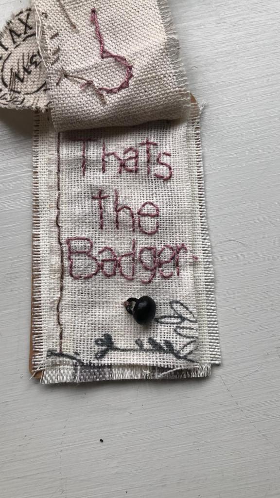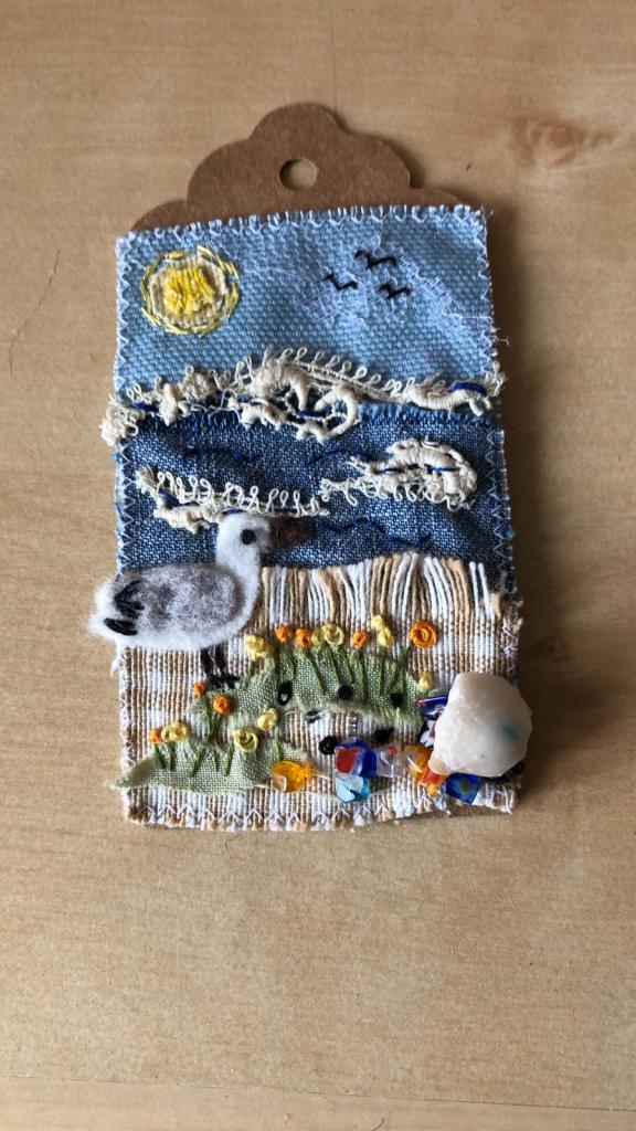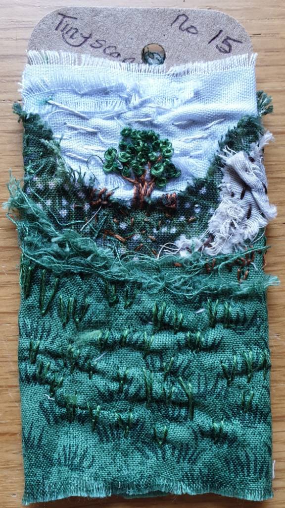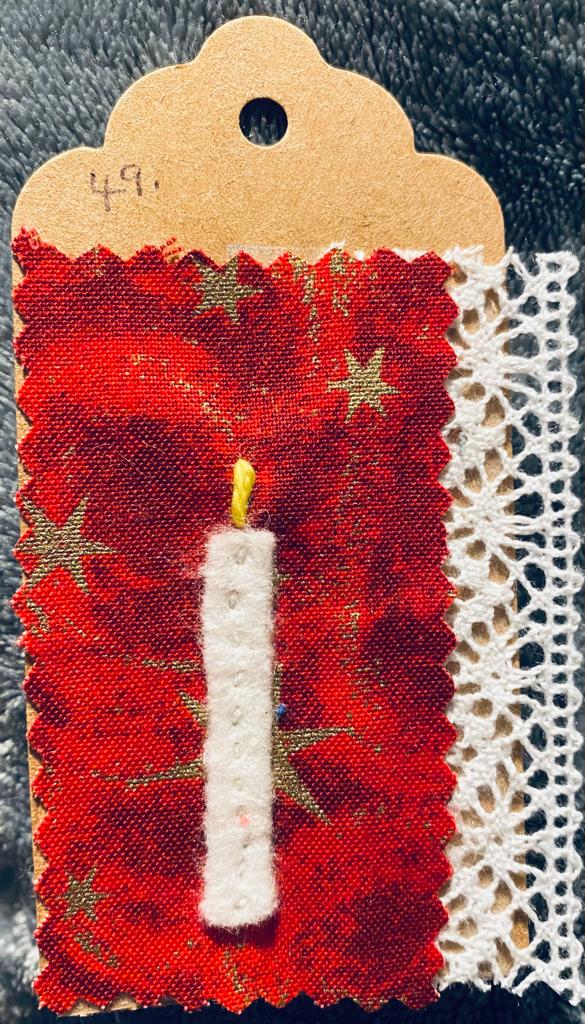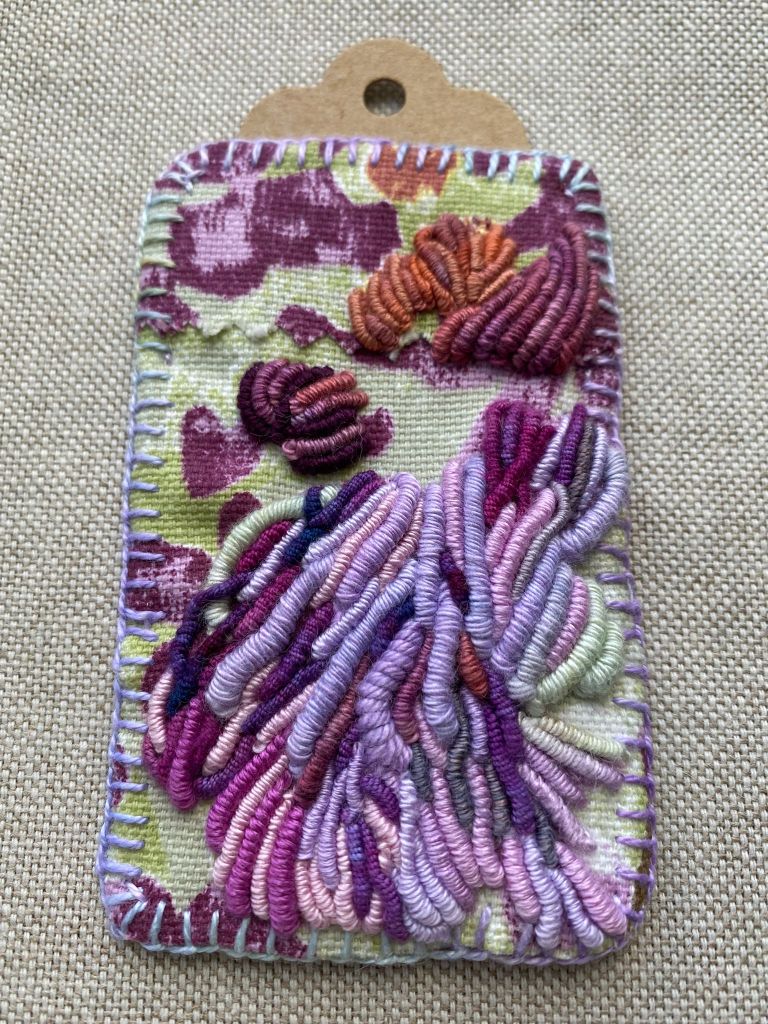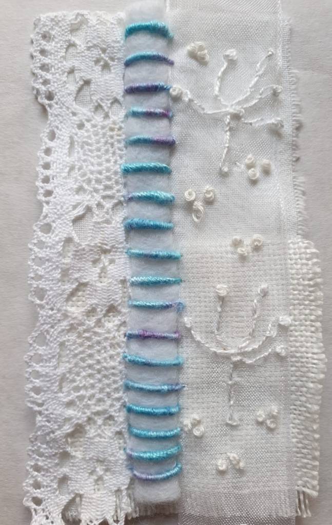 Our 2021 project was based on a challenge set by textile artist Anne Brooke, Sue V coordinated the project for our group. We created a series of mini stitched pieces, one a week for 52 weeks, each with a theme given by Anne Brooke which we attached to a luggage label or similar with the date and a memory of that week written on the reverse of the label.