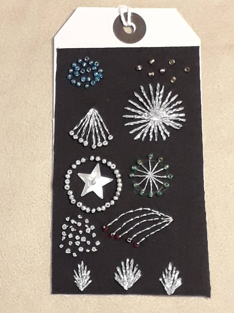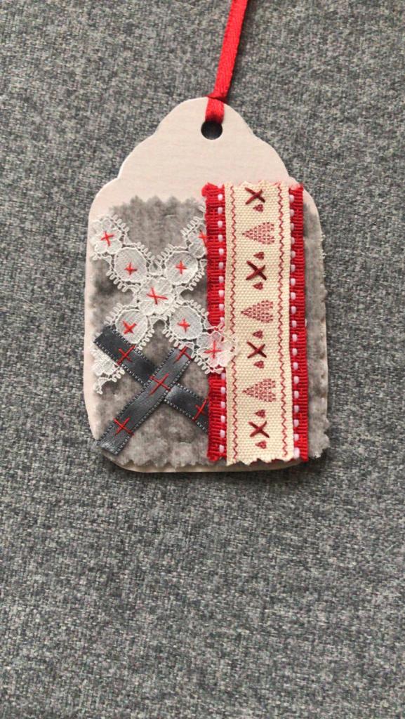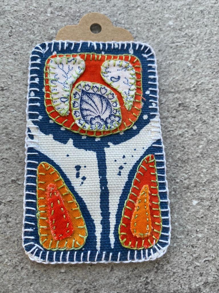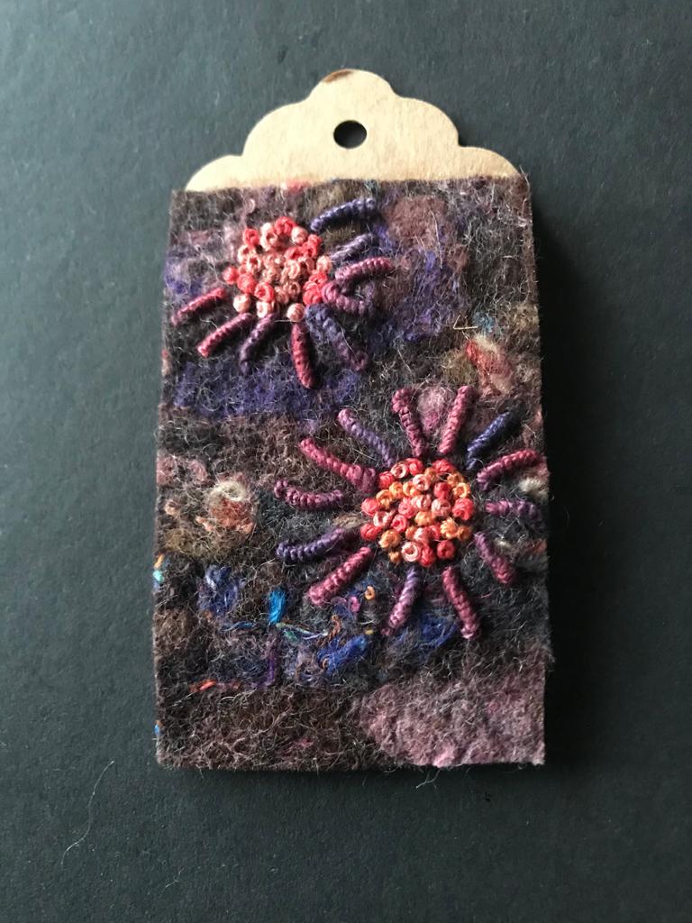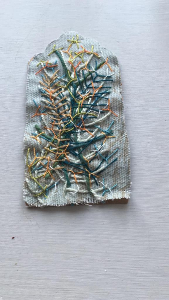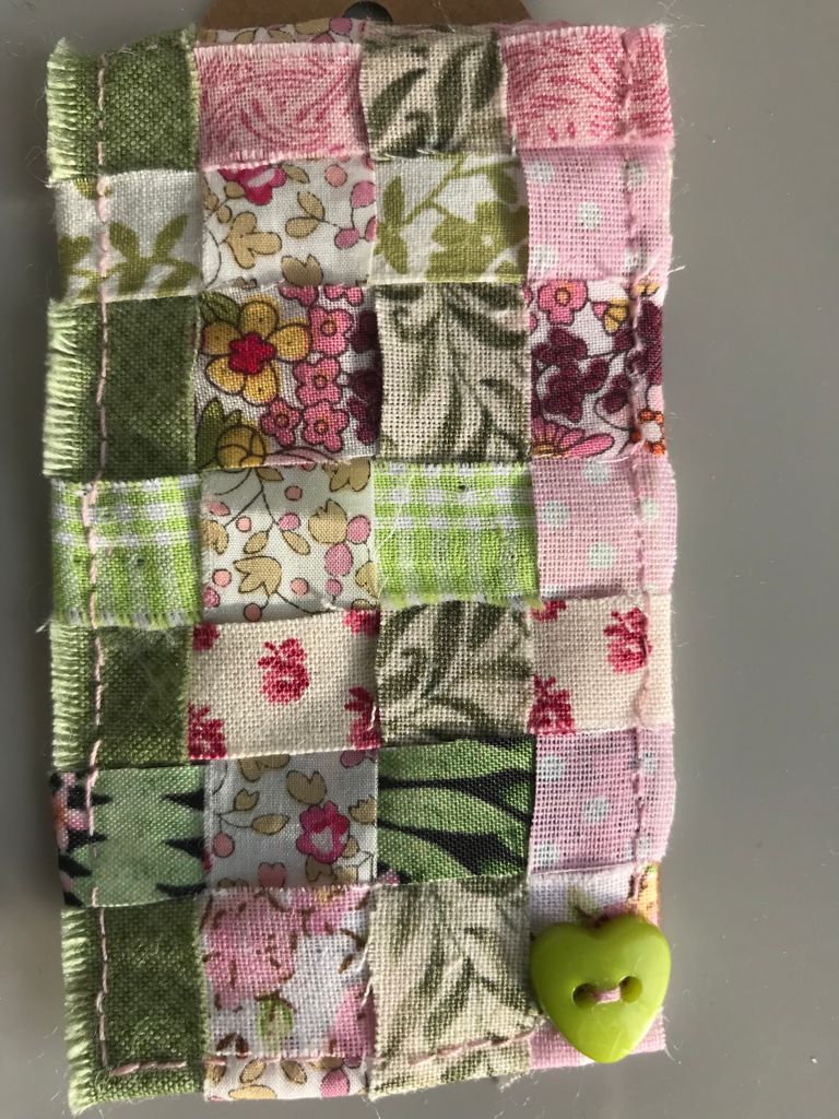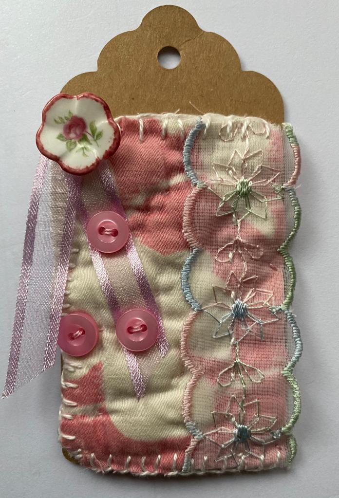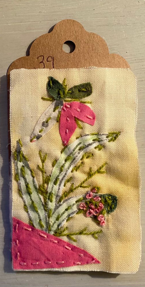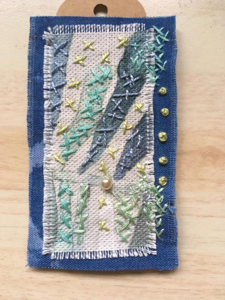 Our 2021 project was based on a challenge set by textile artist Anne Brooke, Sue V coordinated the project for our group. We created a series of mini stitched pieces, one a week for 52 weeks, each with a theme given by Anne Brooke which we attached to a luggage label or similar with the date and a memory of that week written on the reverse of the label.