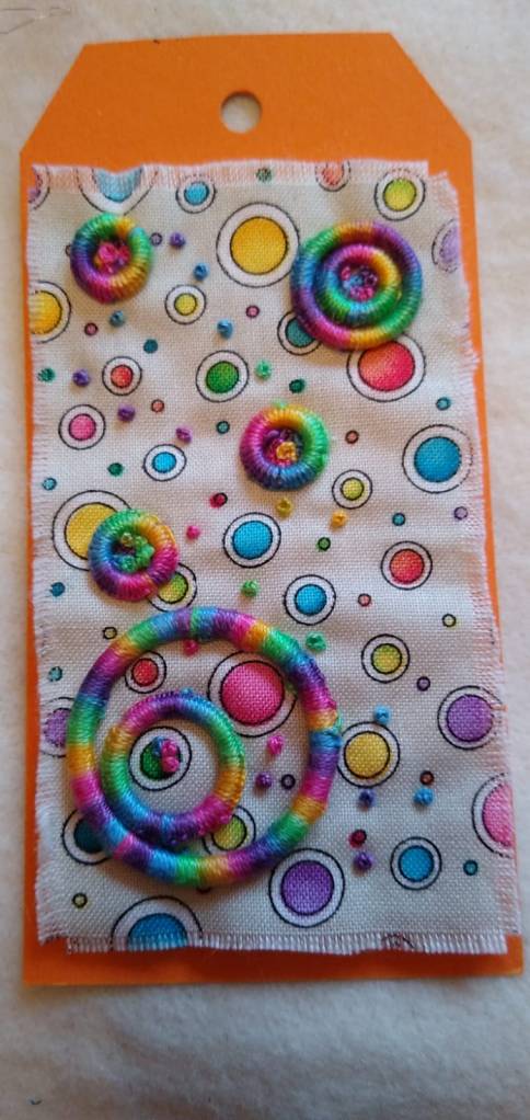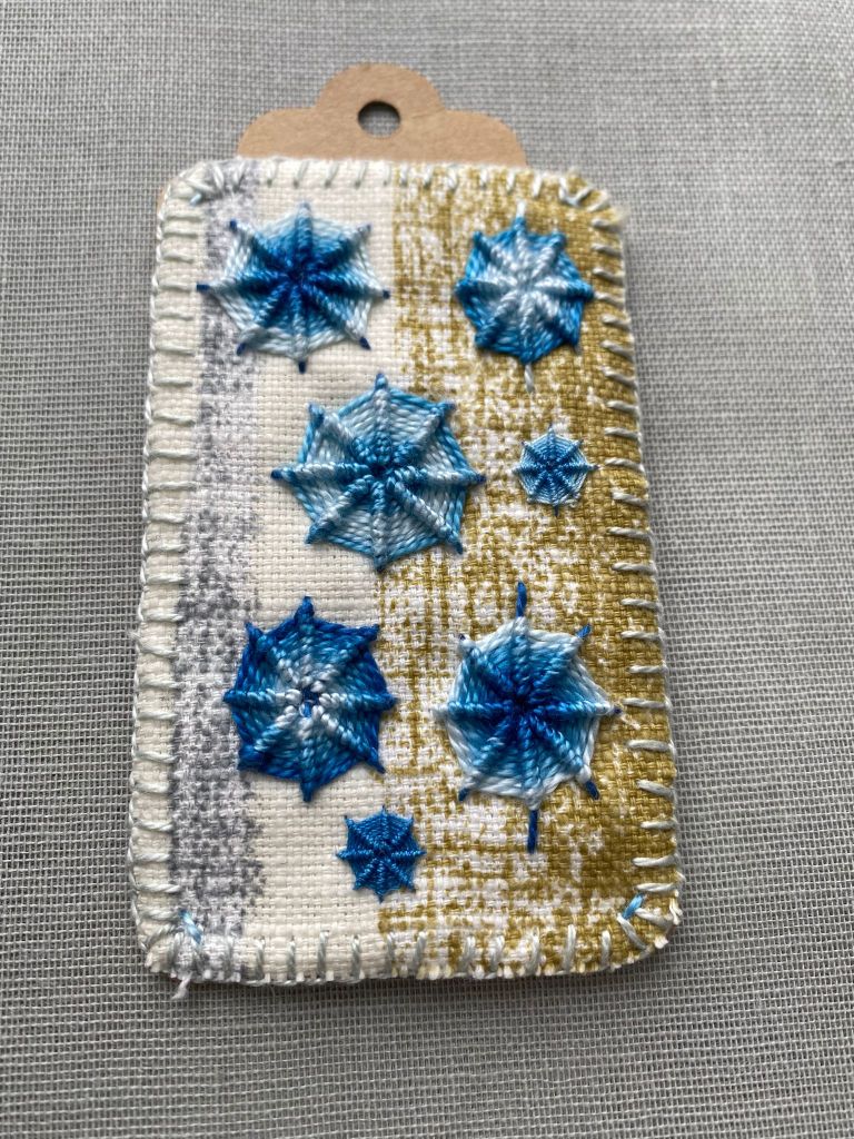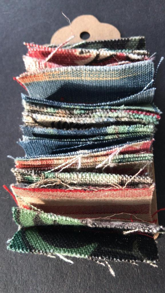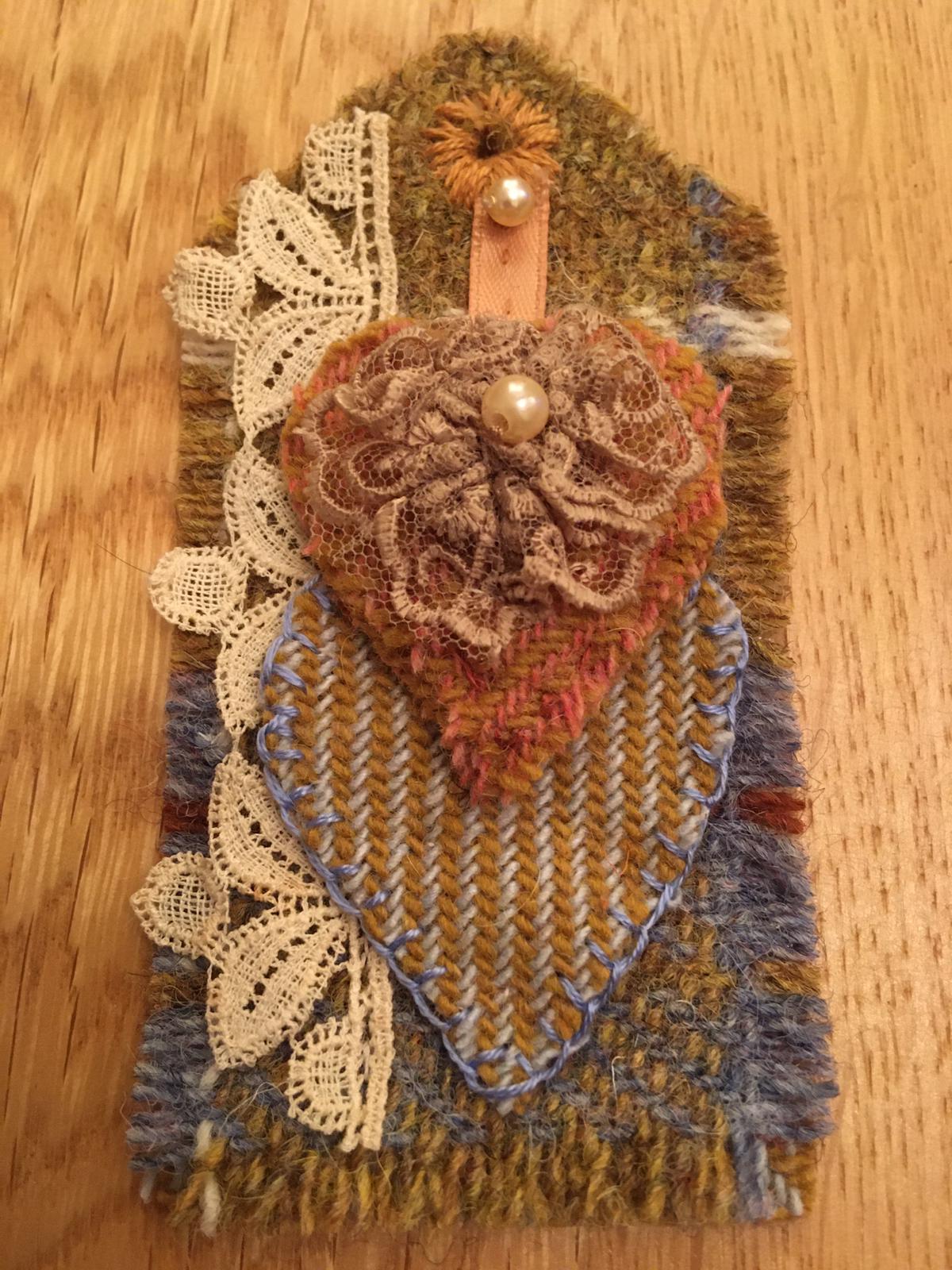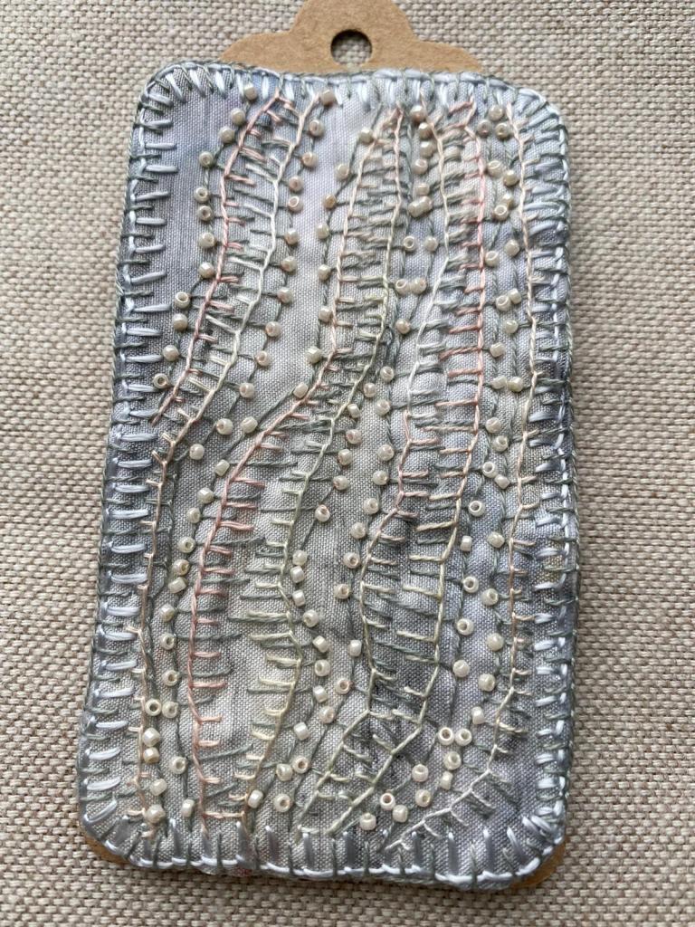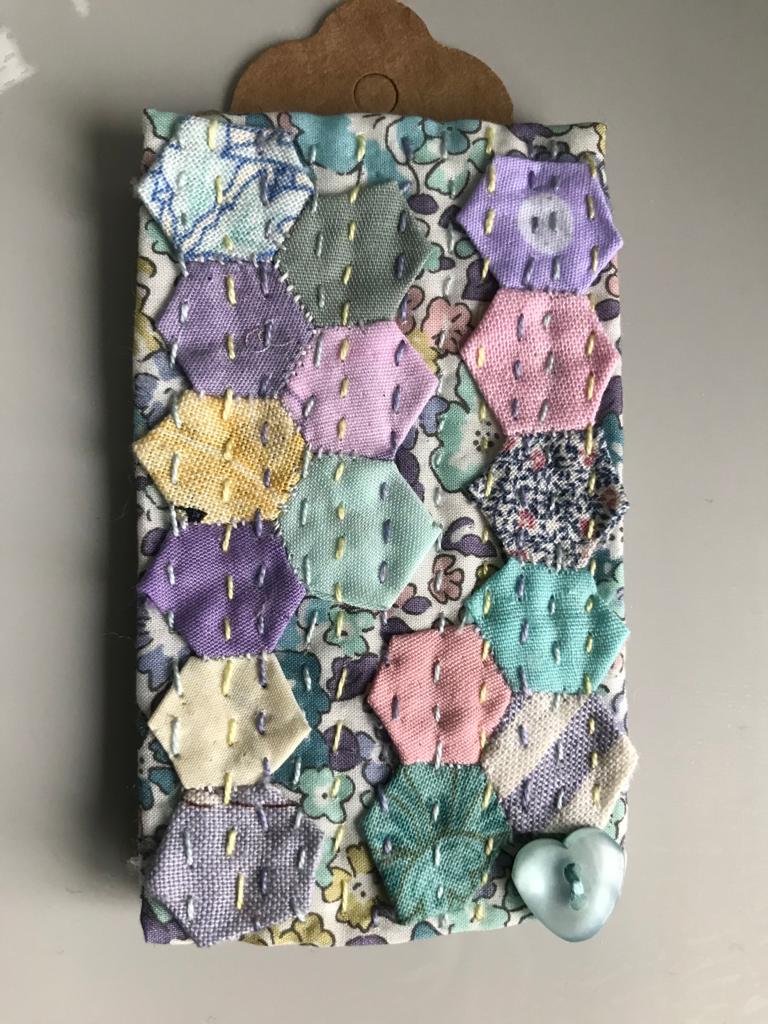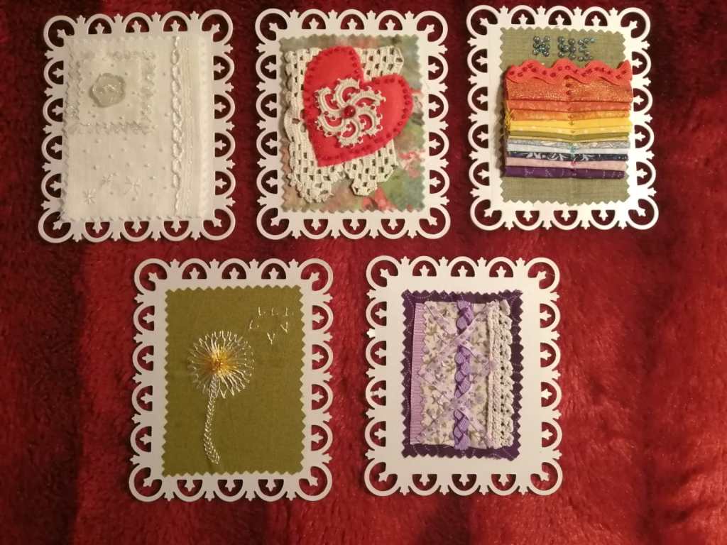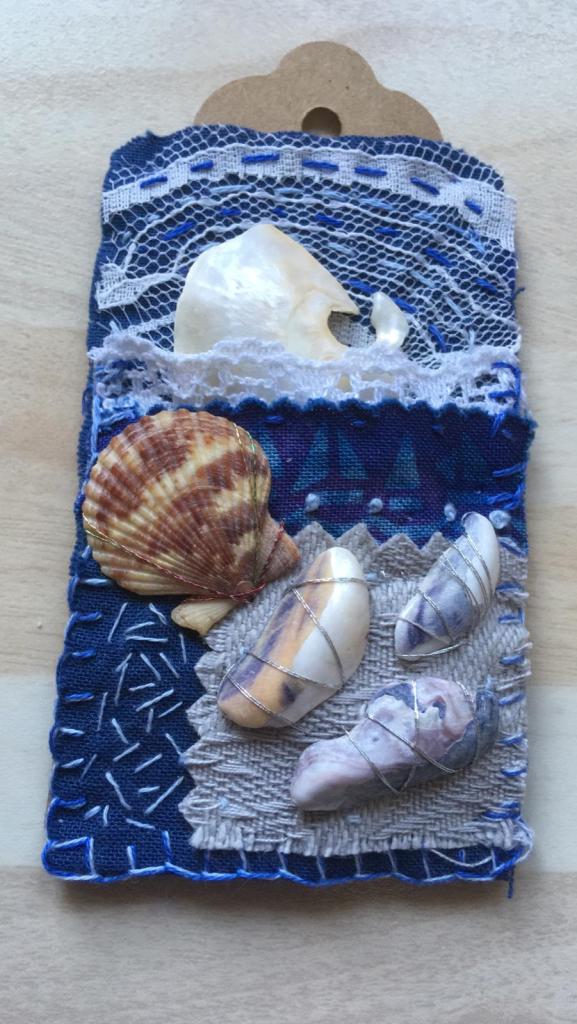 Our 2021 project was based on a challenge set by textile artist Anne Brooke, Sue V coordinated the project for our group. We created a series of mini stitched pieces, one a week for 52 weeks, each with a theme given by Anne Brooke which we attached to a luggage label or similar with the date and a memory of that week written on the reverse of the label.