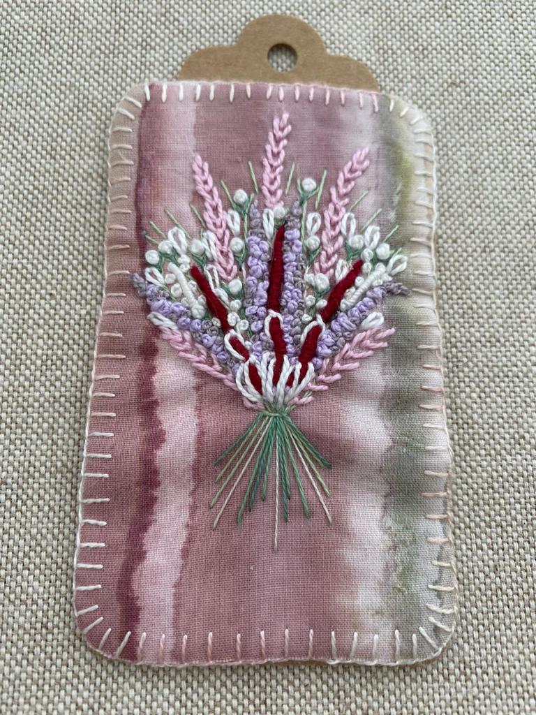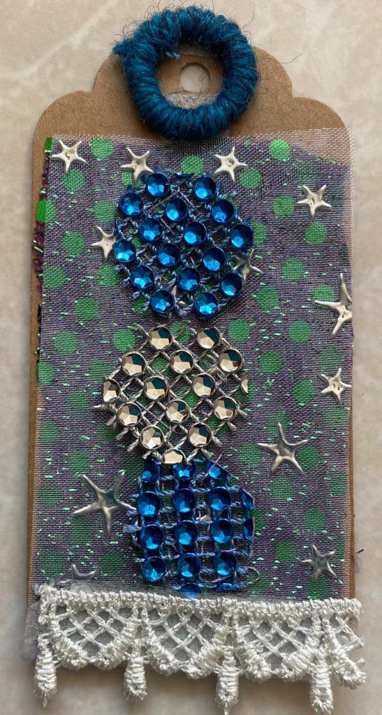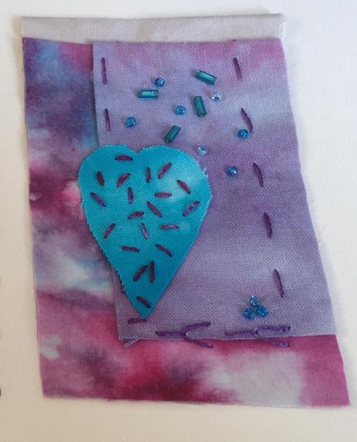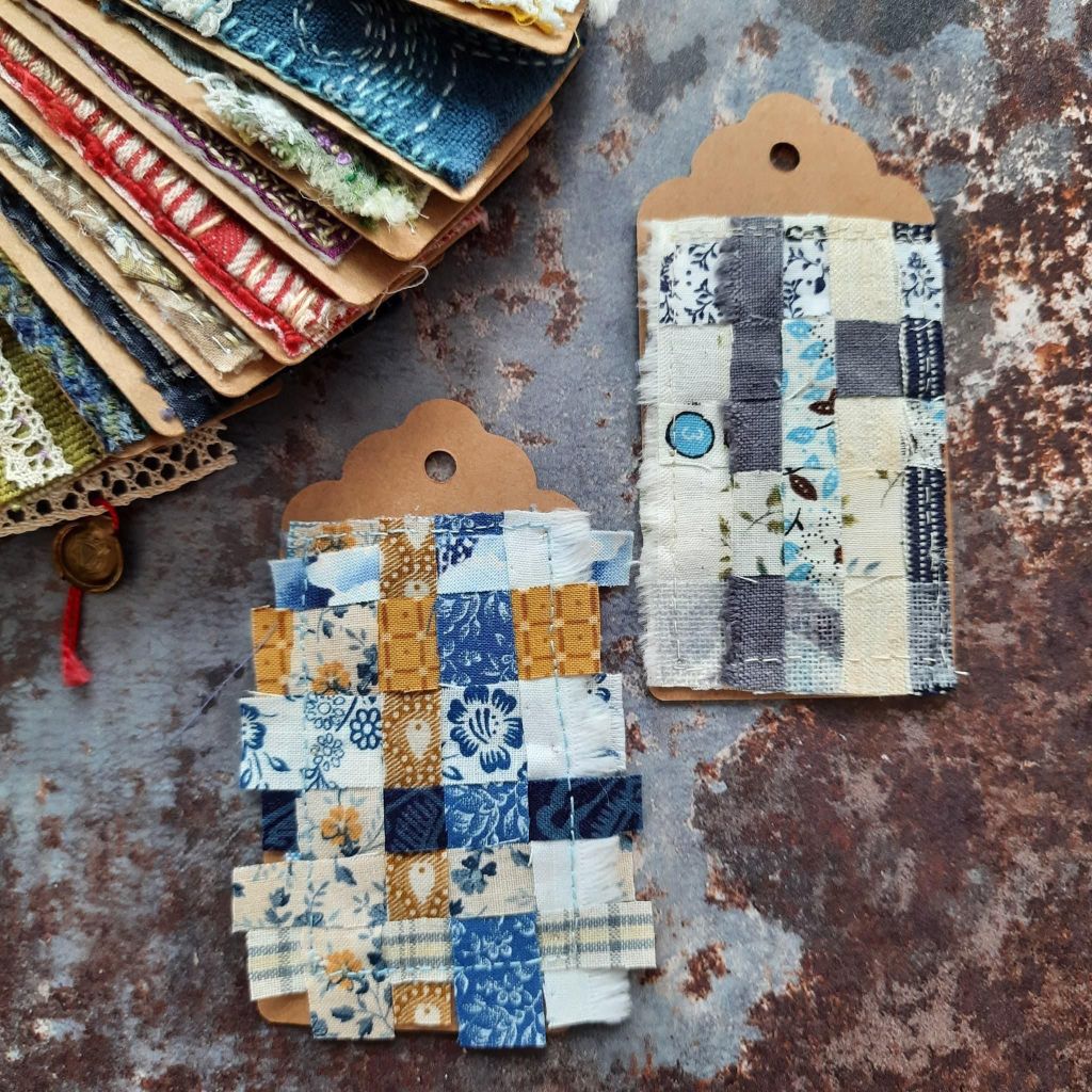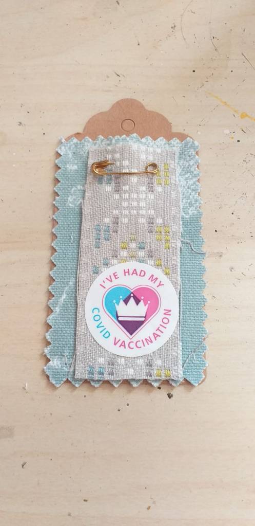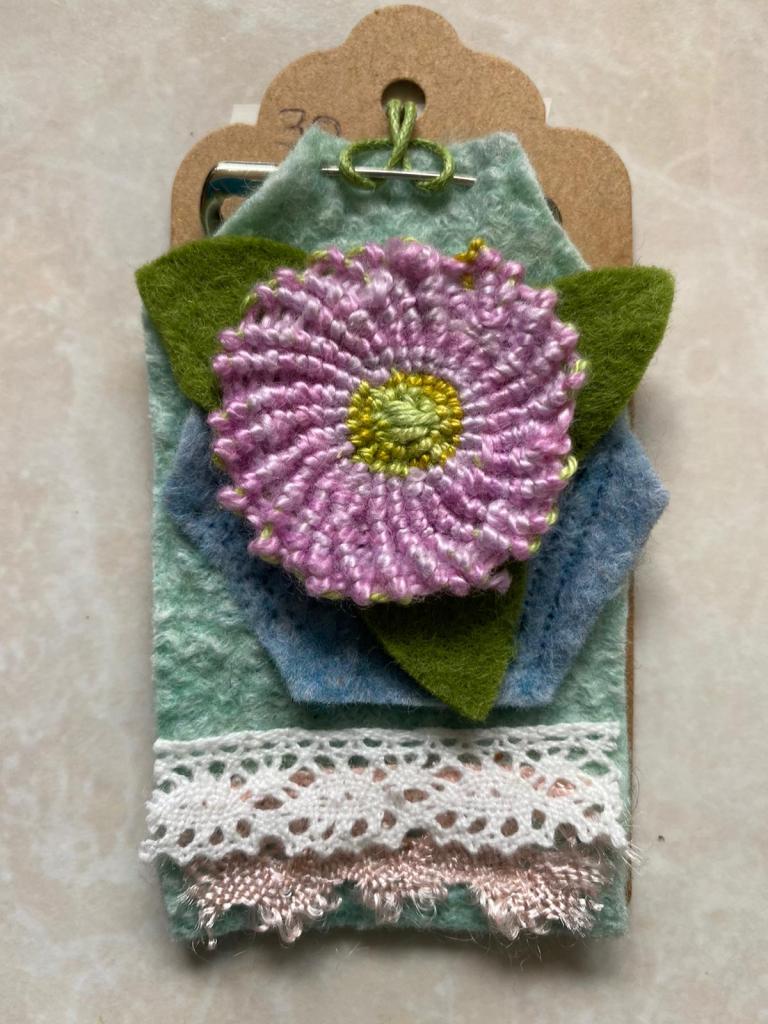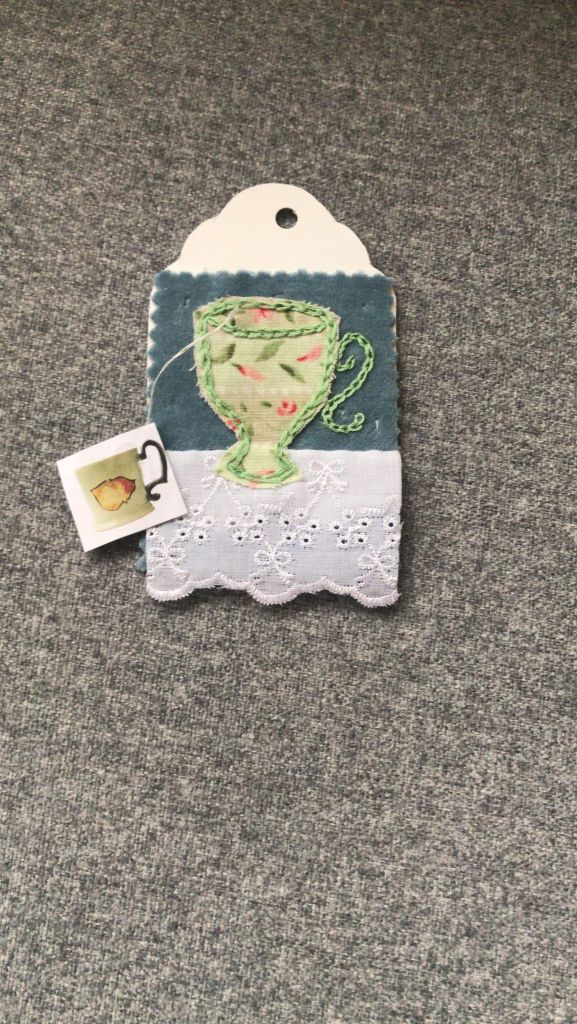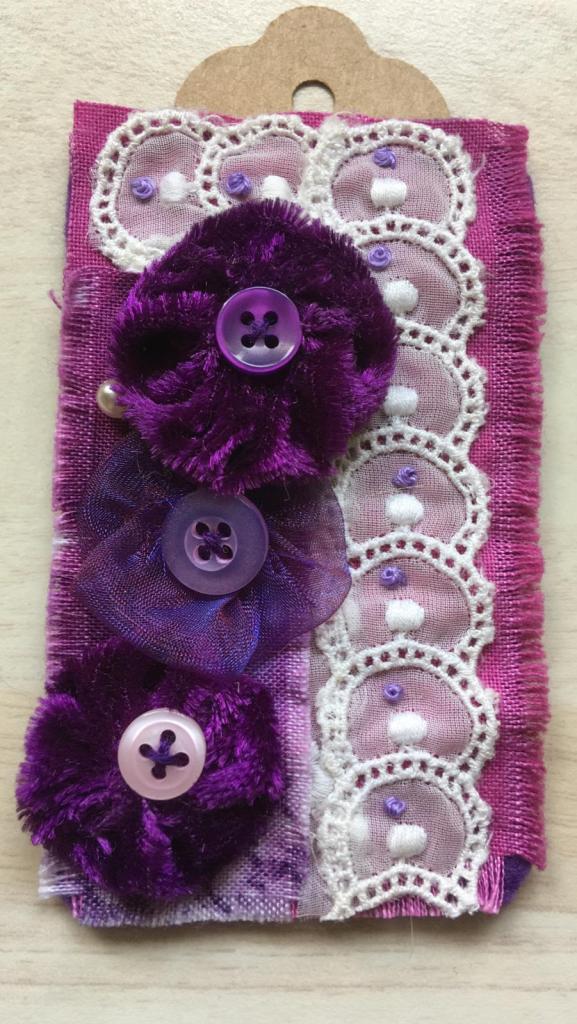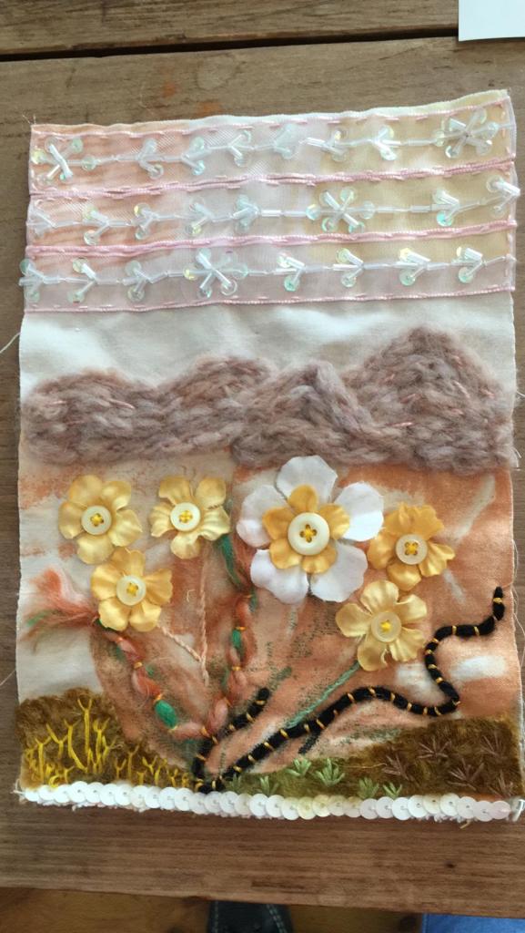 Our 2021 project was based on a challenge set by textile artist Anne Brooke, Sue V coordinated the project for our group. We created a series of mini stitched pieces, one a week for 52 weeks, each with a theme given by Anne Brooke which we attached to a luggage label or similar with the date and a memory of that week written on the reverse of the label.