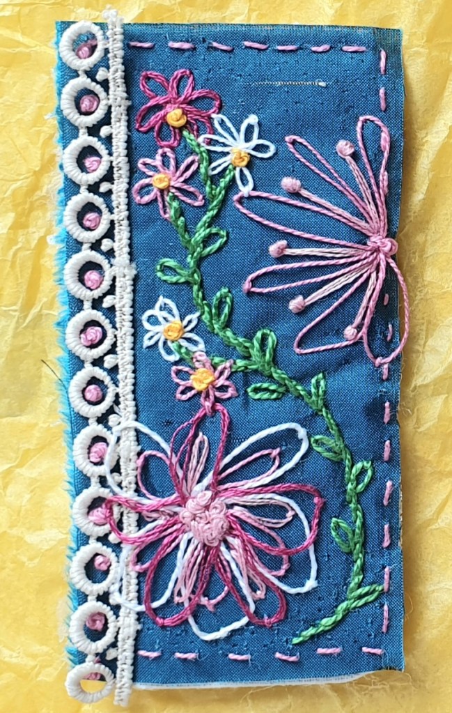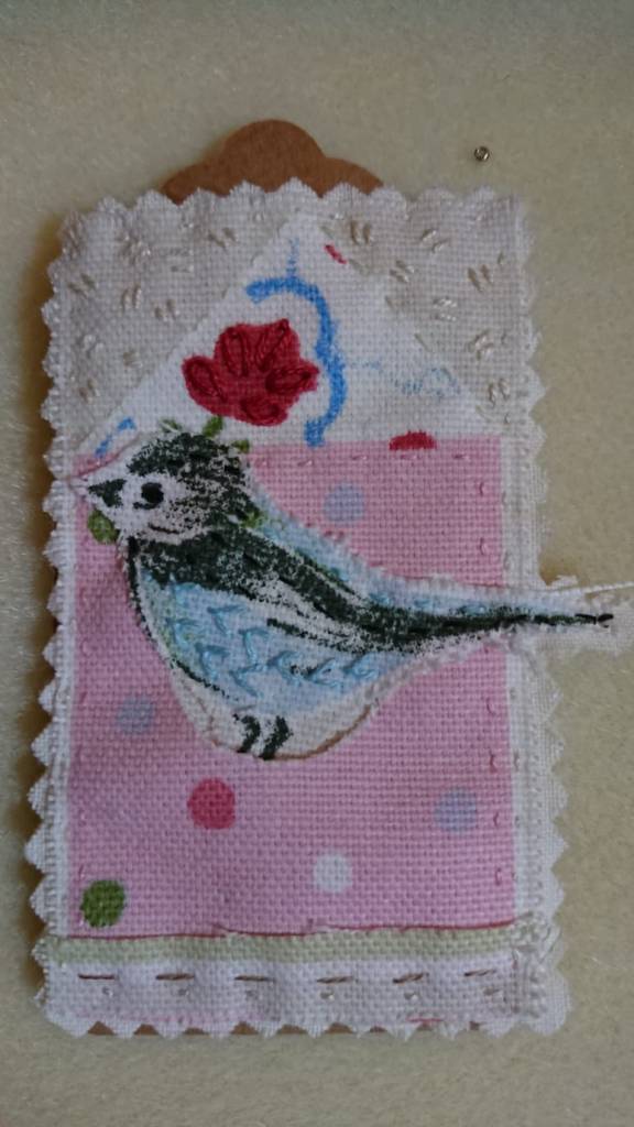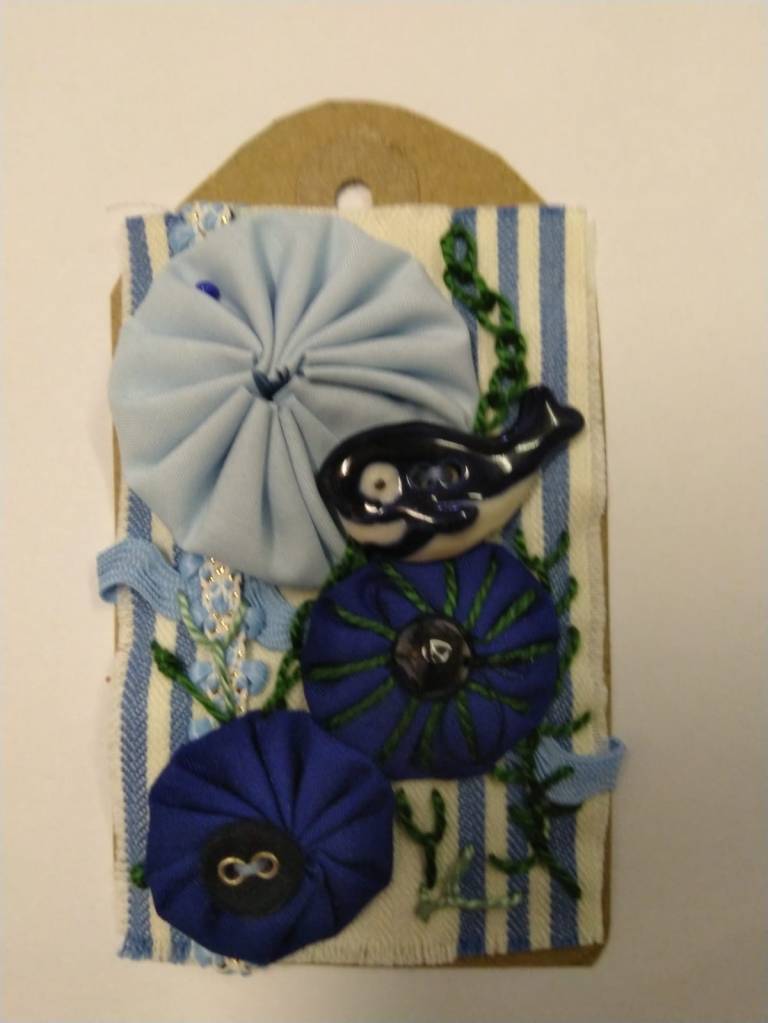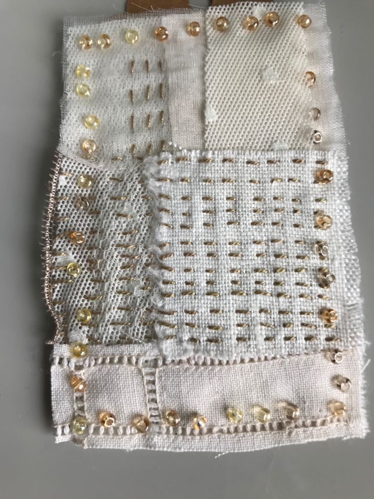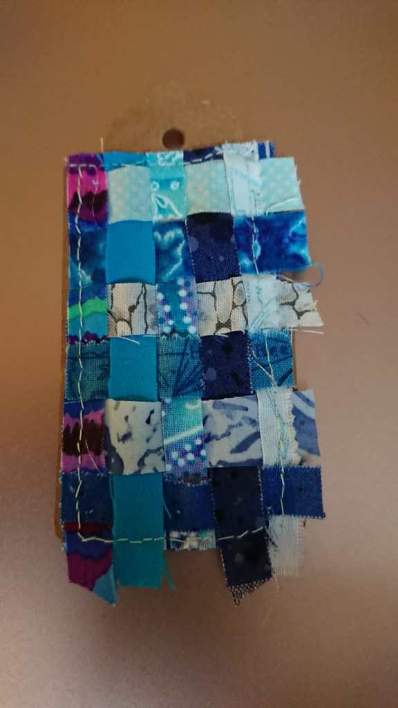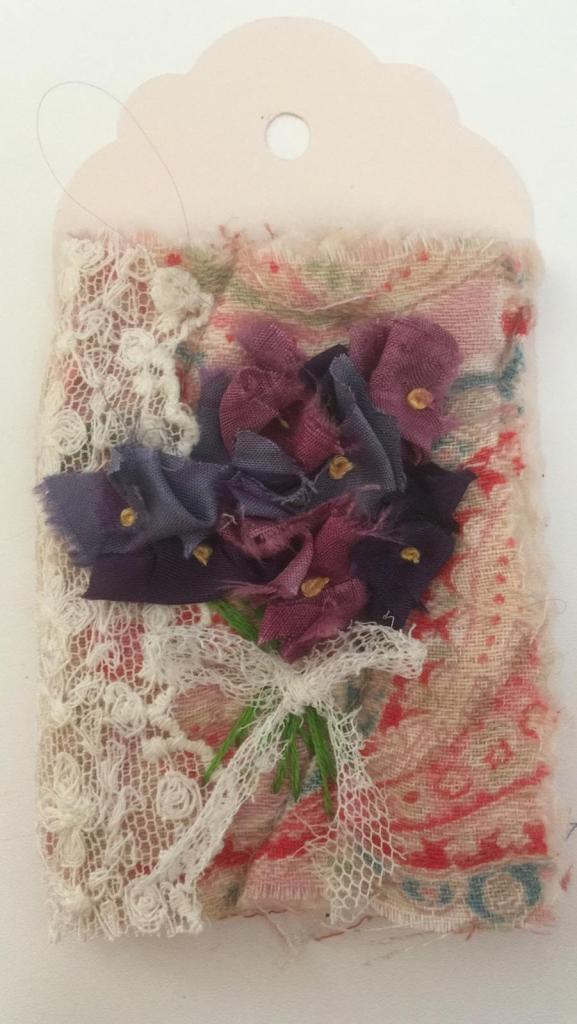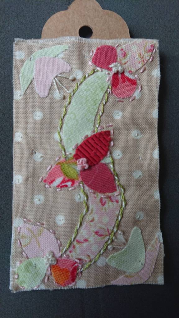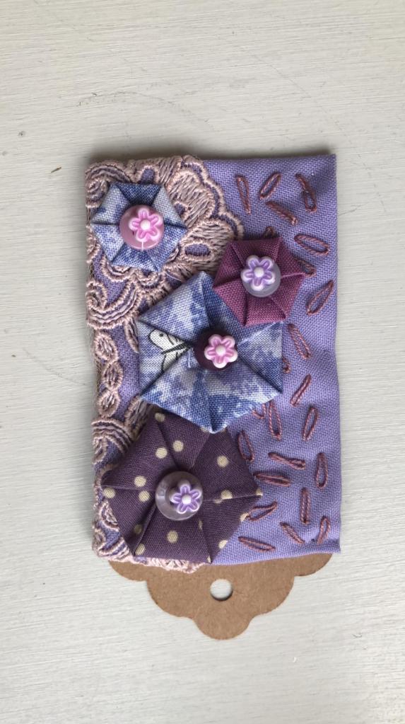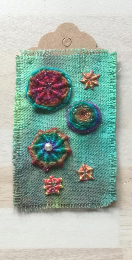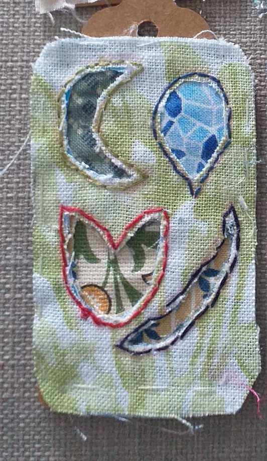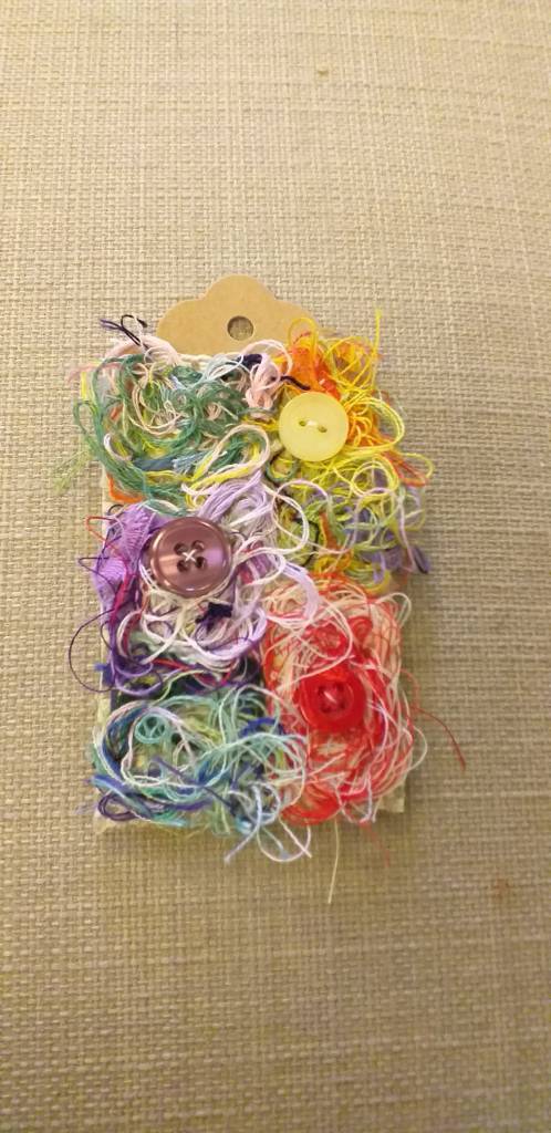 Our 2021 project was based on a challenge set by textile artist Anne Brooke, Sue V coordinated the project for our group. We created a series of mini stitched pieces, one a week for 52 weeks, each with a theme given by Anne Brooke which we attached to a luggage label or similar with the date and a memory of that week written on the reverse of the label.