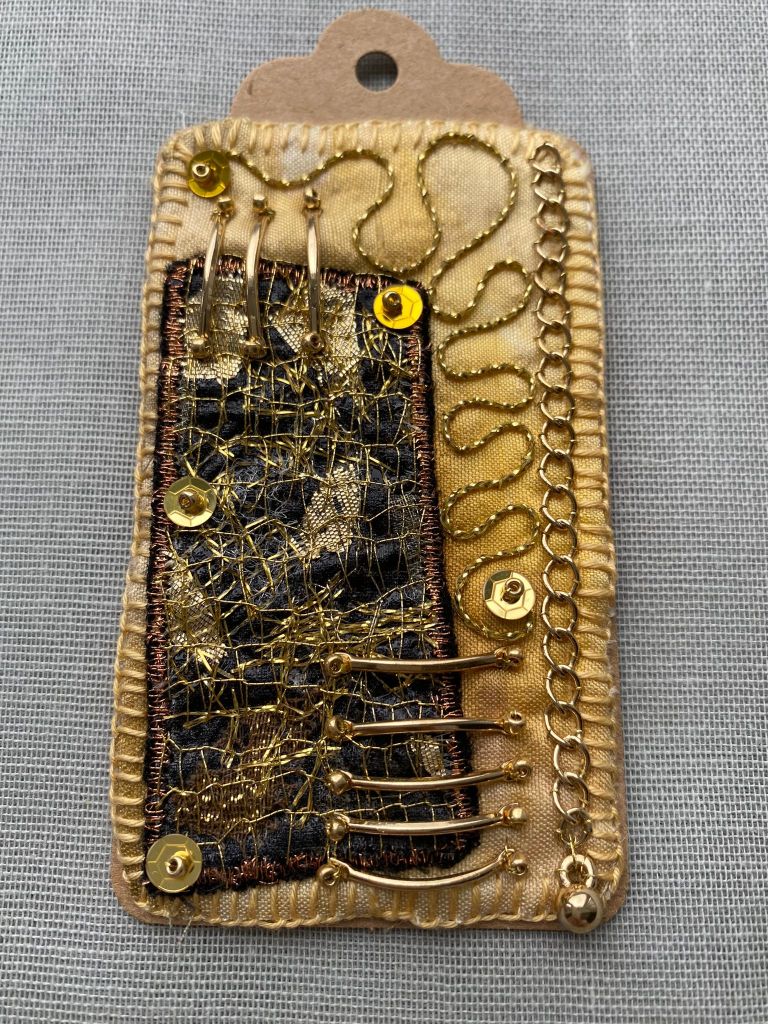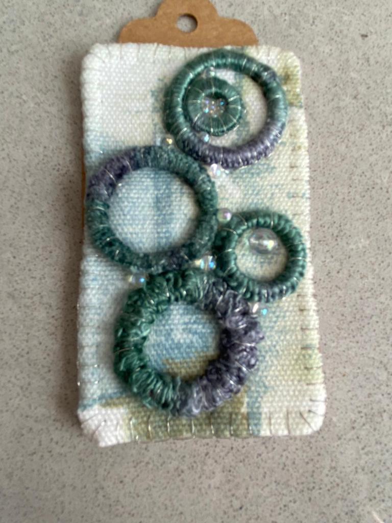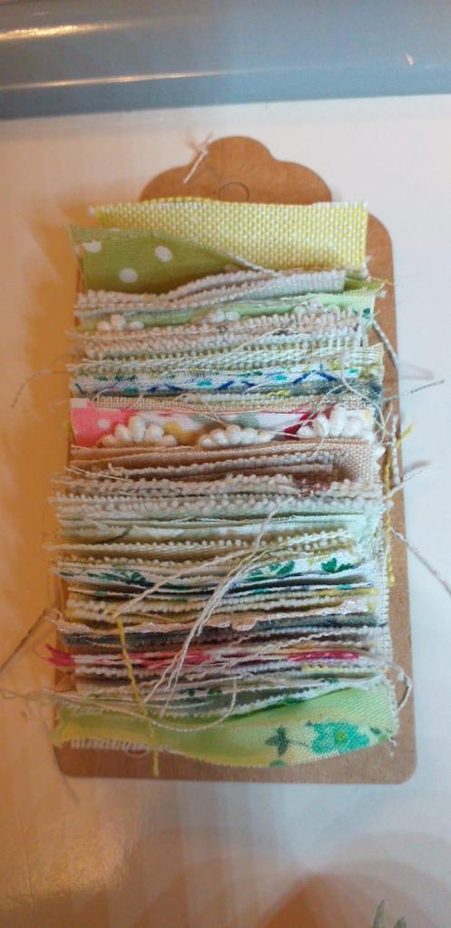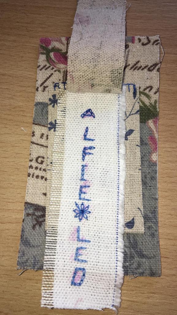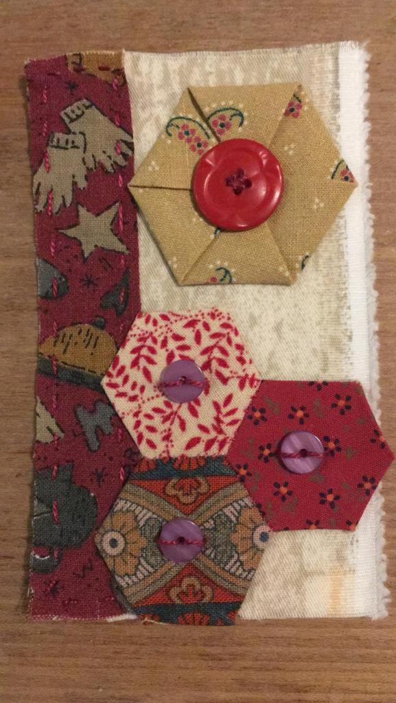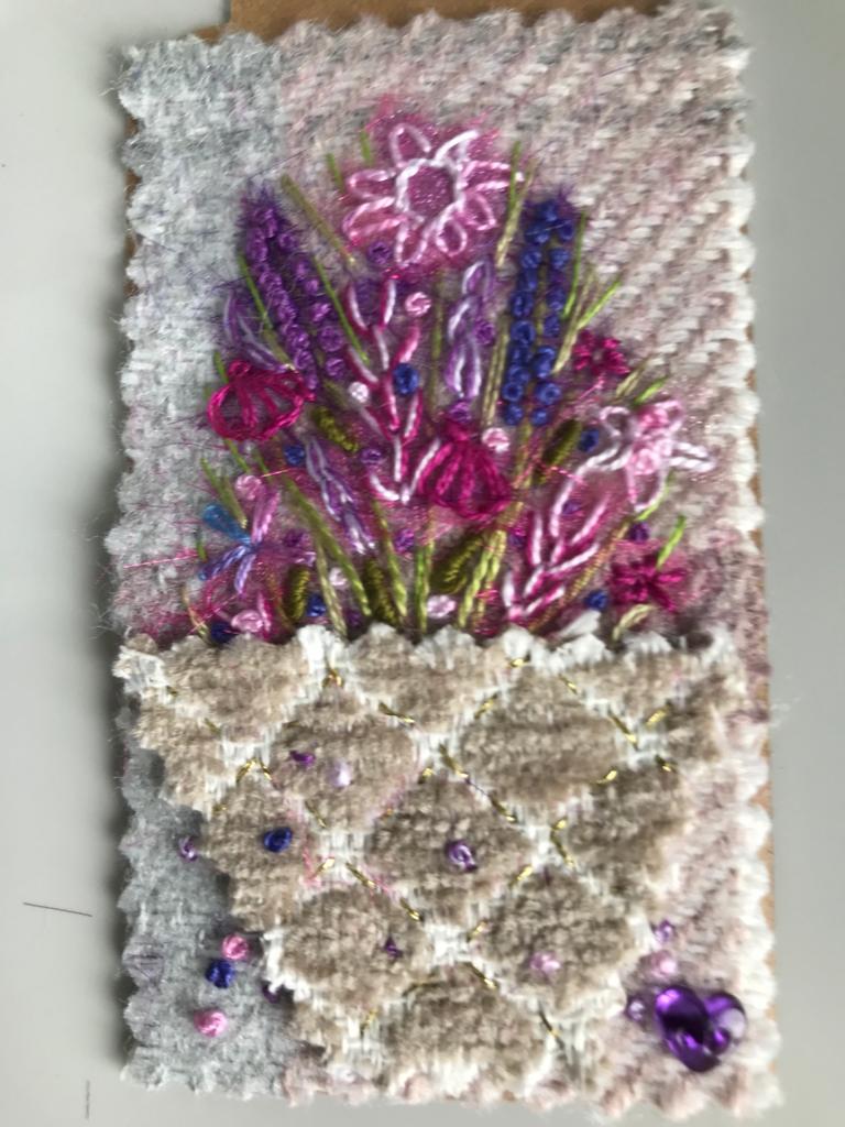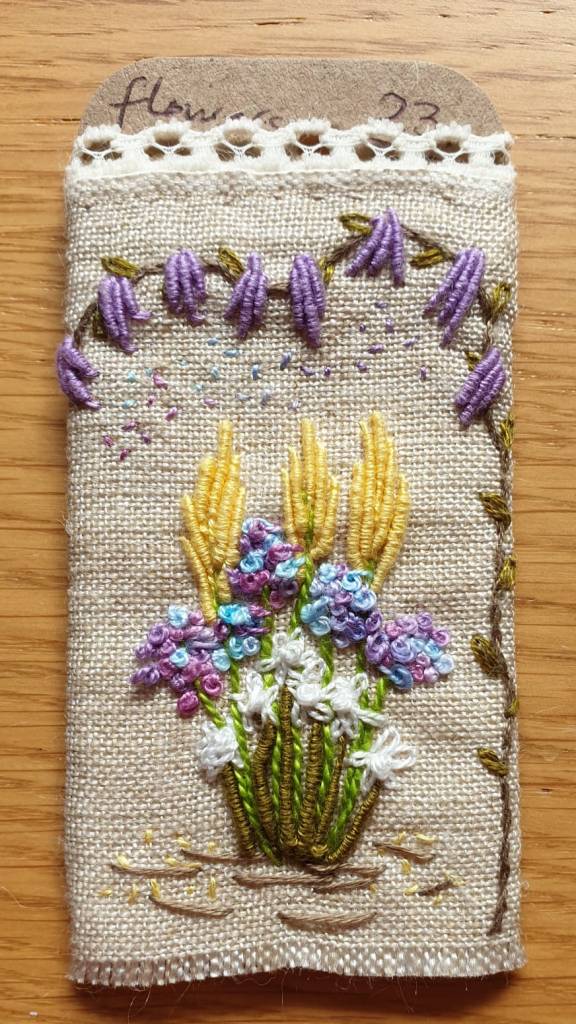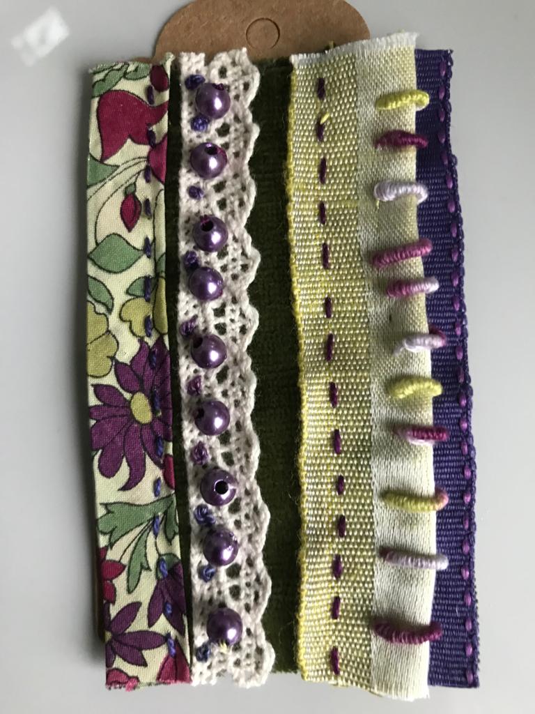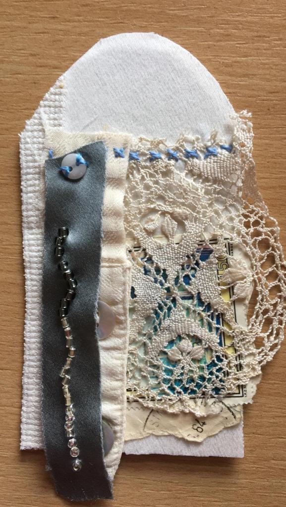 Our 2021 project was based on a challenge set by textile artist Anne Brooke, Sue V coordinated the project for our group. We created a series of mini stitched pieces, one a week for 52 weeks, each with a theme given by Anne Brooke which we attached to a luggage label or similar with the date and a memory of that week written on the reverse of the label.