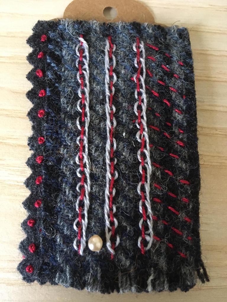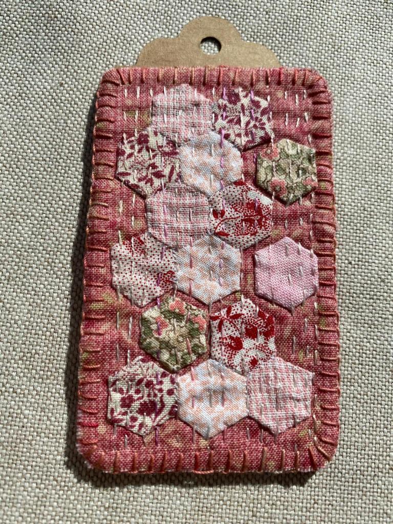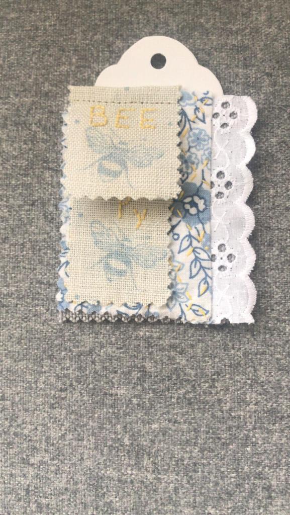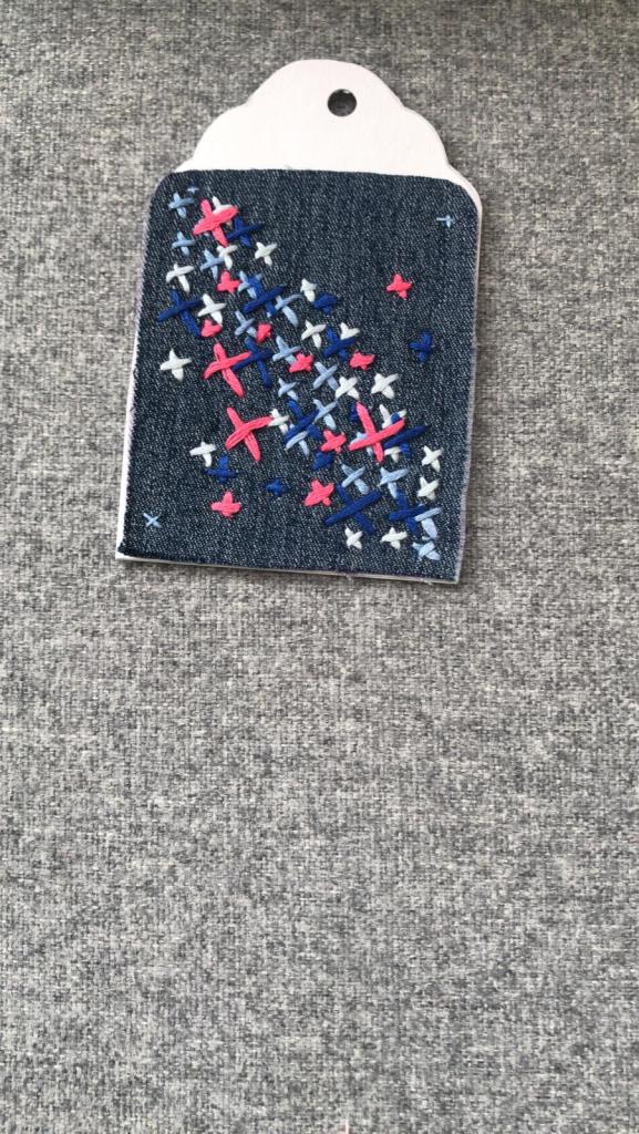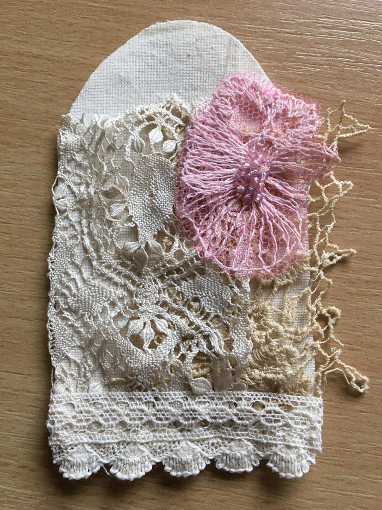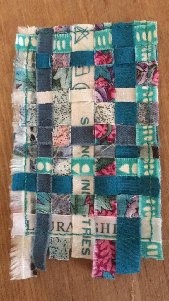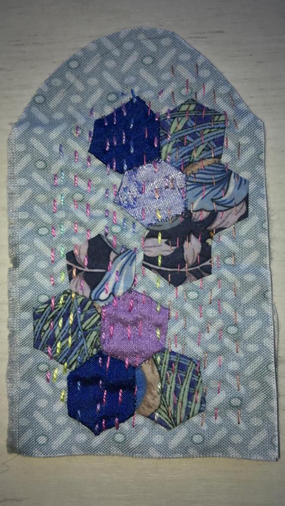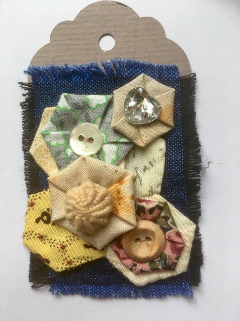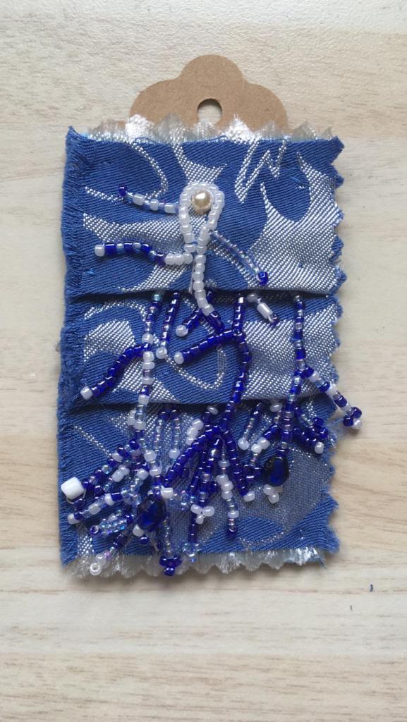 Our 2021 project was based on a challenge set by textile artist Anne Brooke, Sue V coordinated the project for our group. We created a series of mini stitched pieces, one a week for 52 weeks, each with a theme given by Anne Brooke which we attached to a luggage label or similar with the date and a memory of that week written on the reverse of the label.
