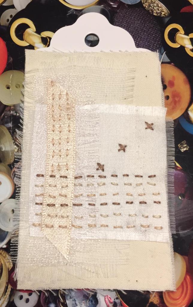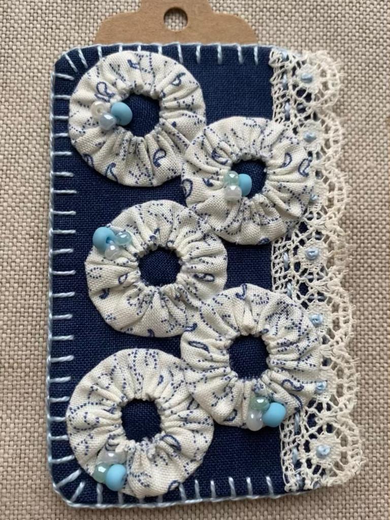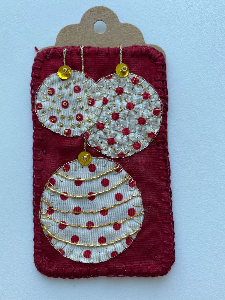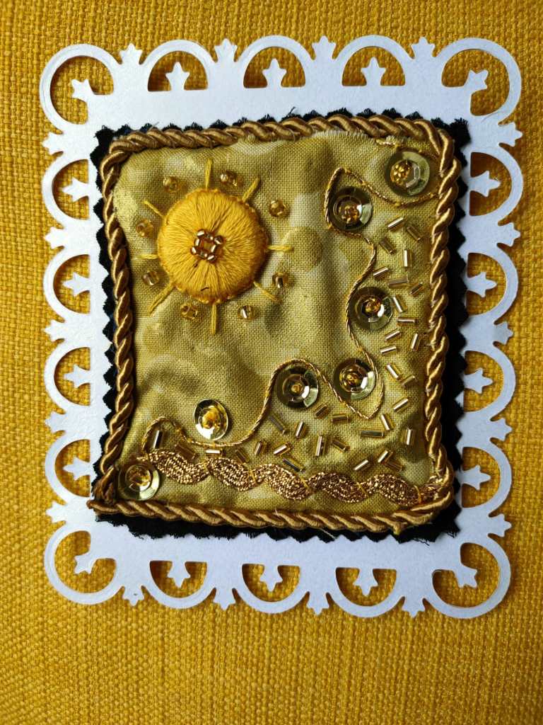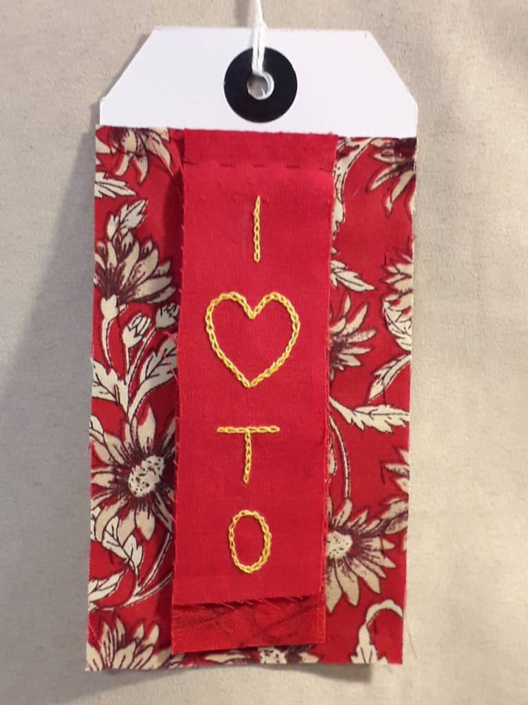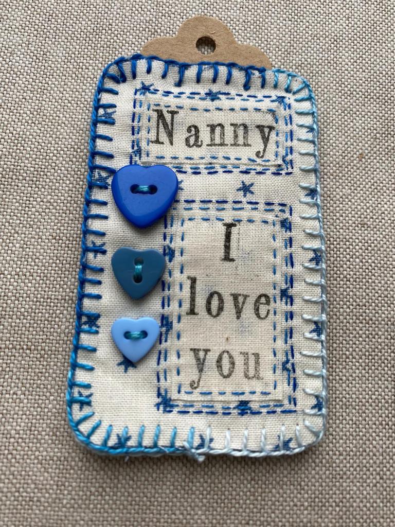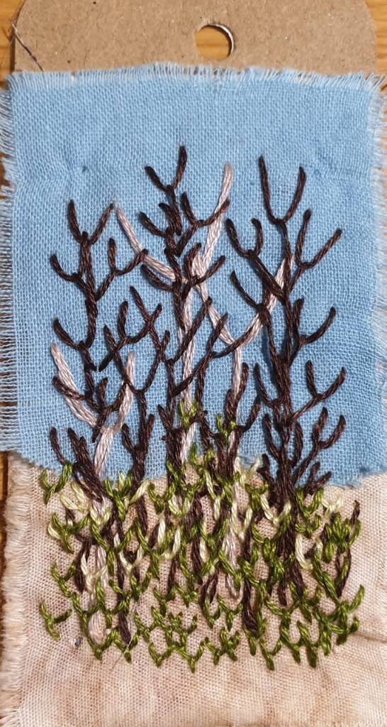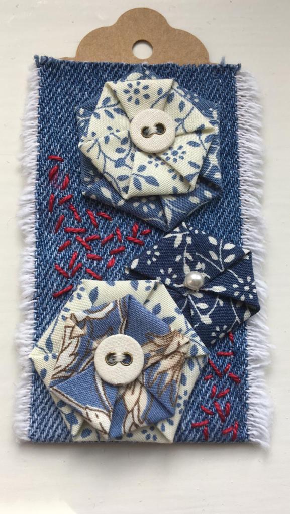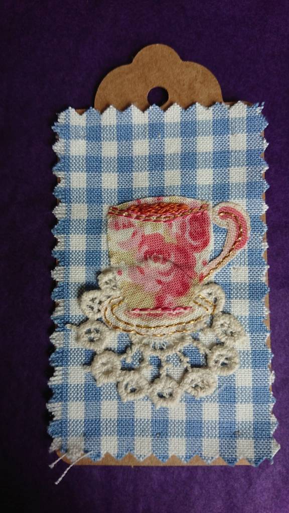 Our 2021 project was based on a challenge set by textile artist Anne Brooke, Sue V coordinated the project for our group. We created a series of mini stitched pieces, one a week for 52 weeks, each with a theme given by Anne Brooke which we attached to a luggage label or similar with the date and a memory of that week written on the reverse of the label.