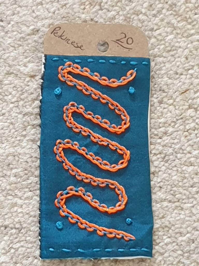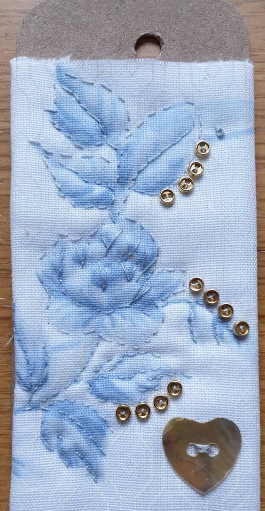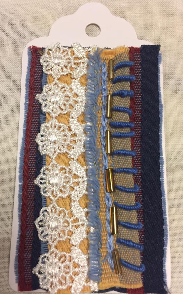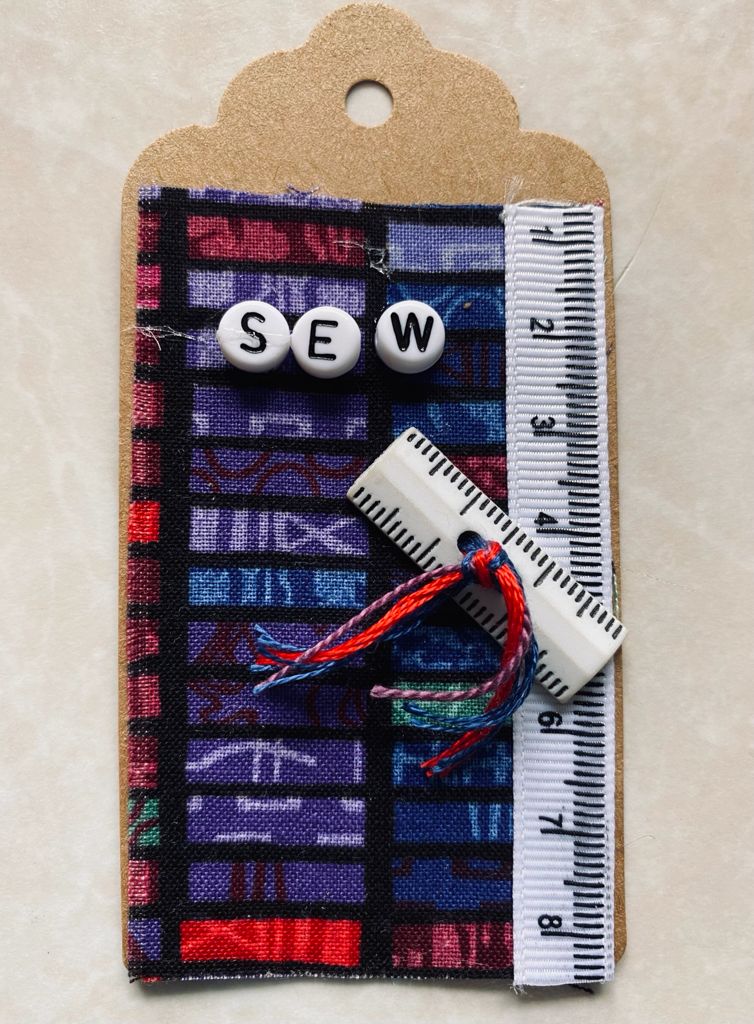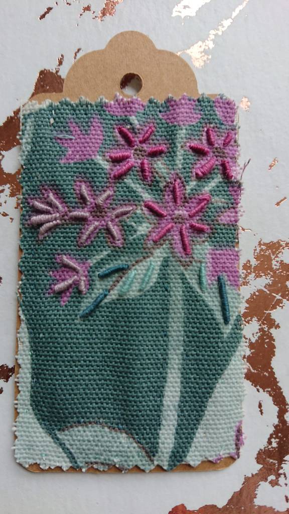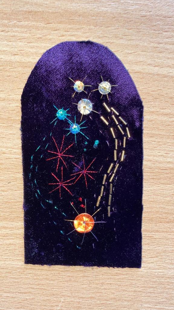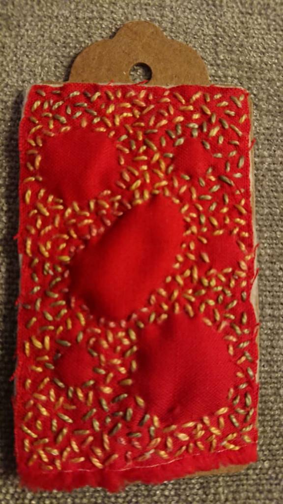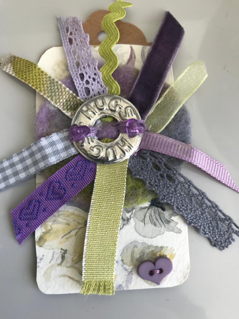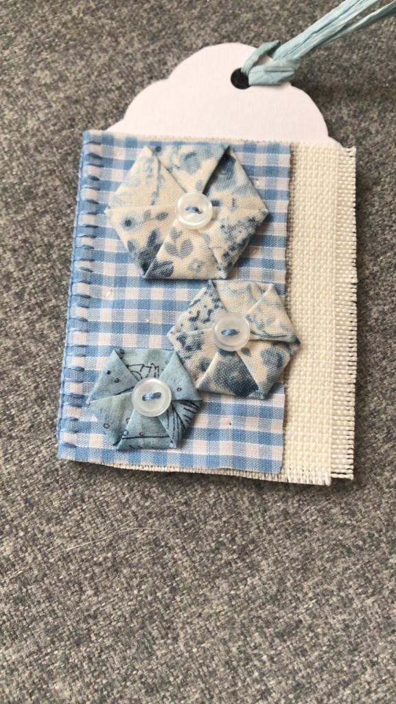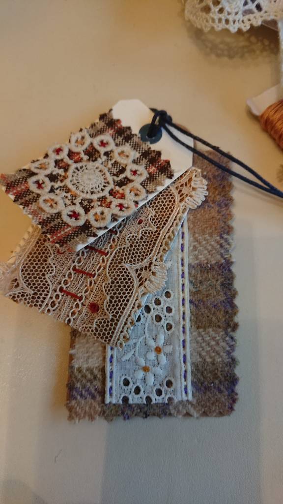 Our 2021 project was based on a challenge set by textile artist Anne Brooke, Sue V coordinated the project for our group. We created a series of mini stitched pieces, one a week for 52 weeks, each with a theme given by Anne Brooke which we attached to a luggage label or similar with the date and a memory of that week written on the reverse of the label.