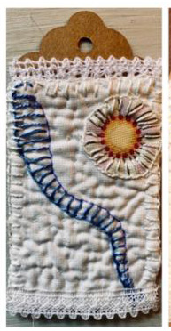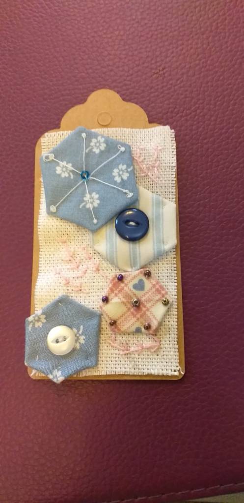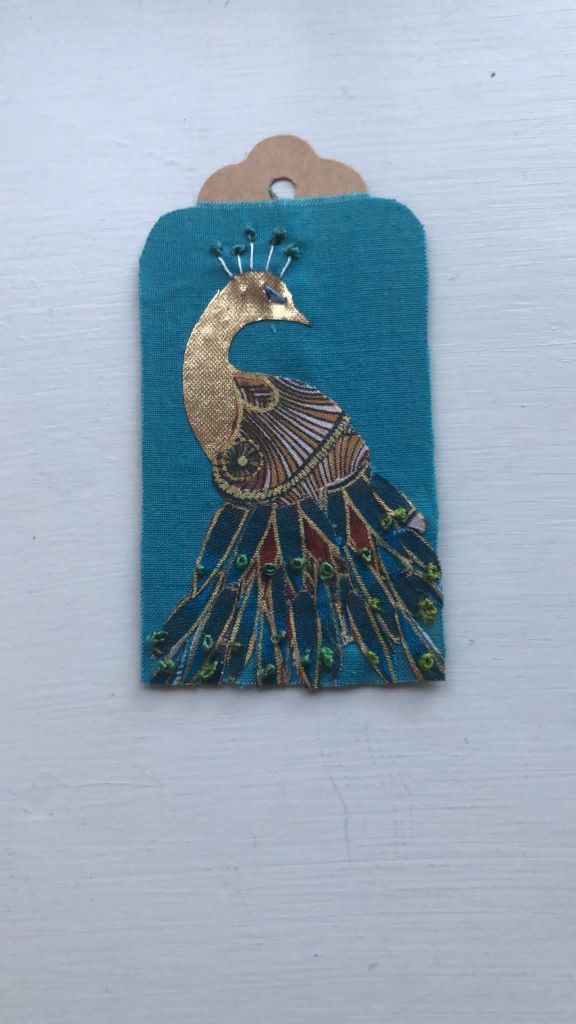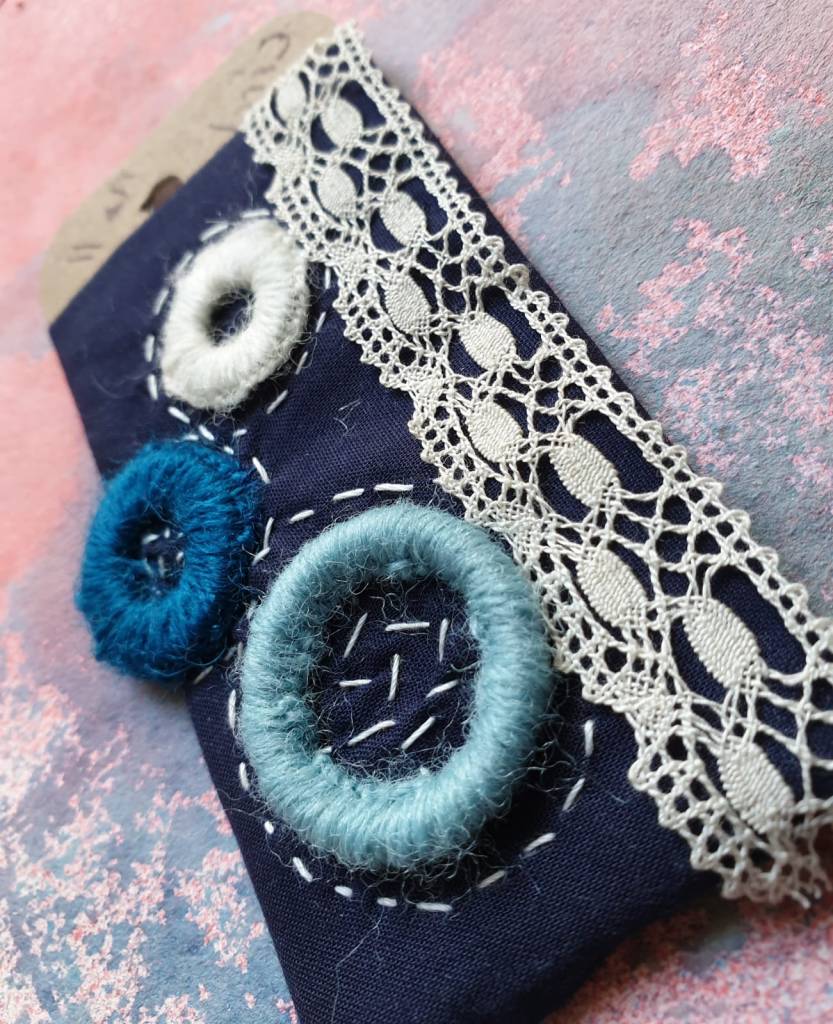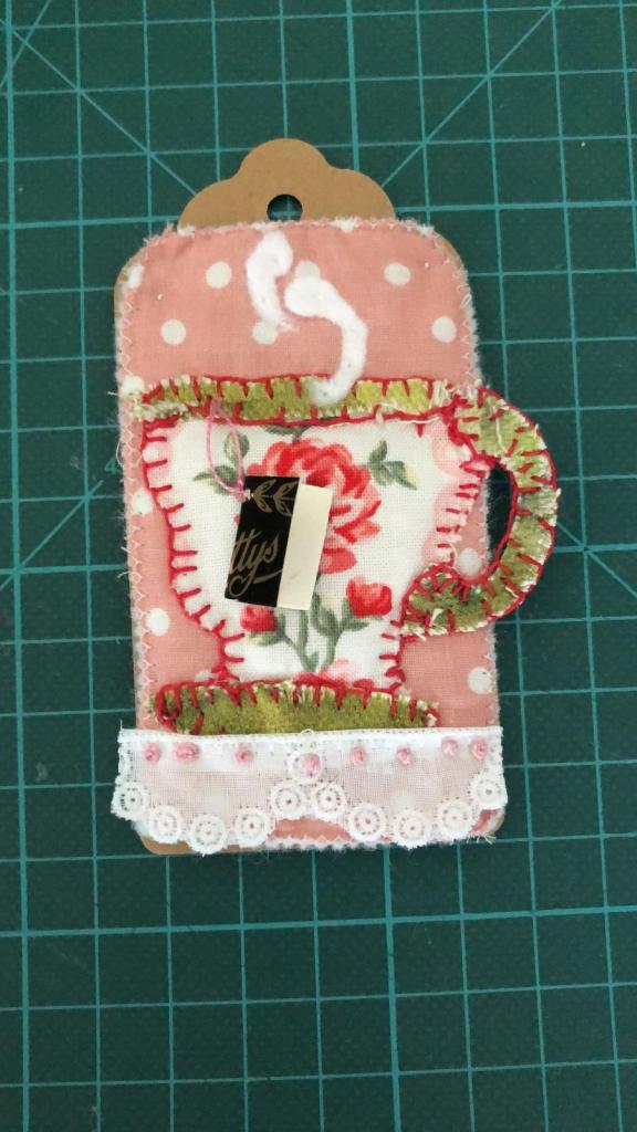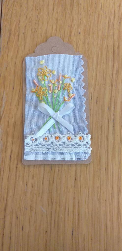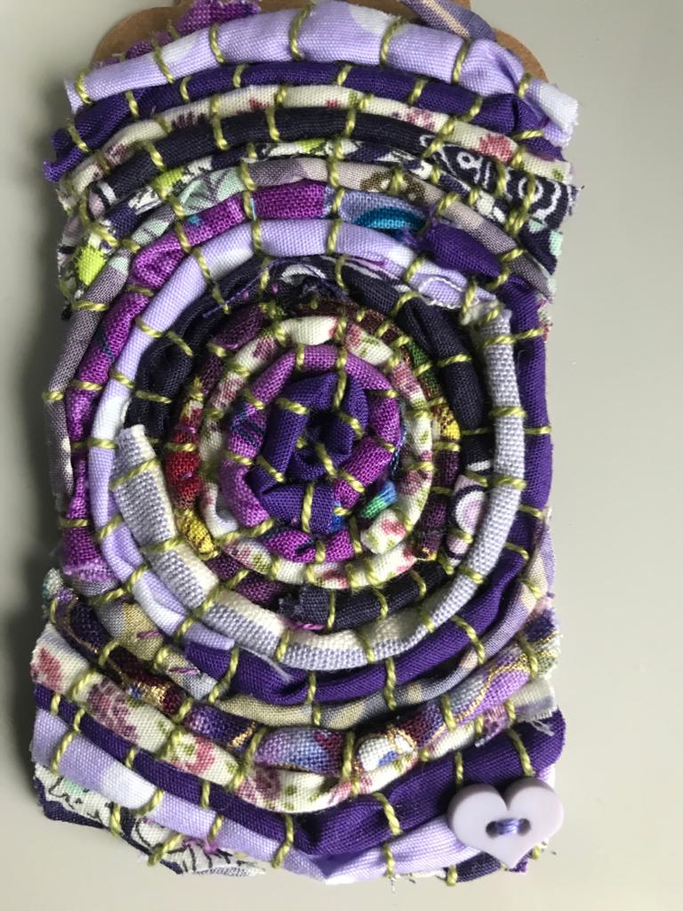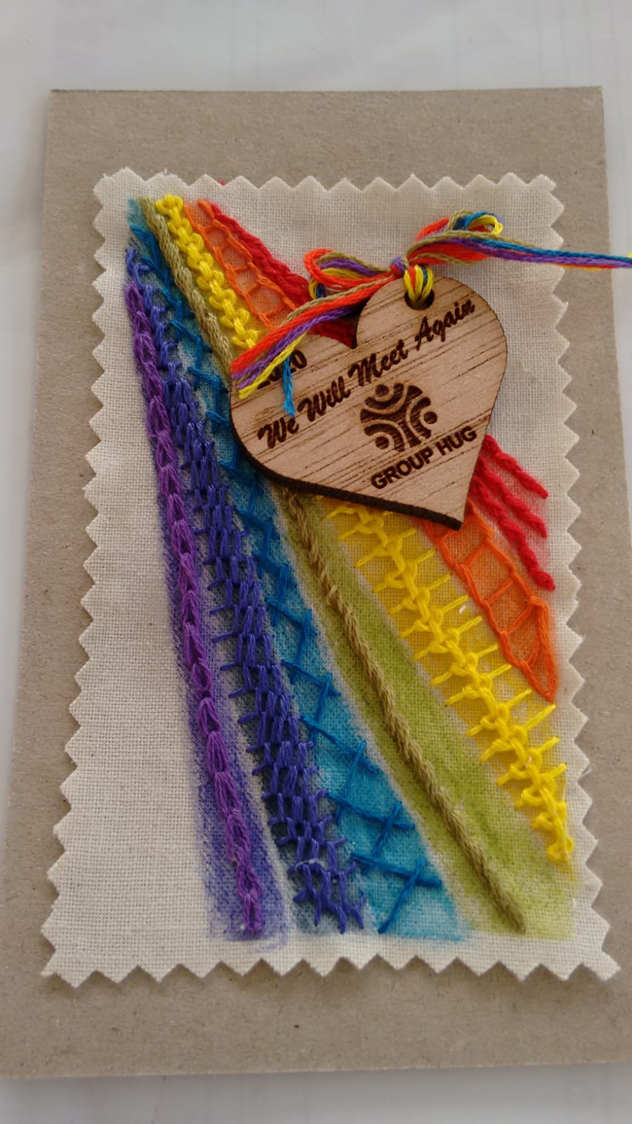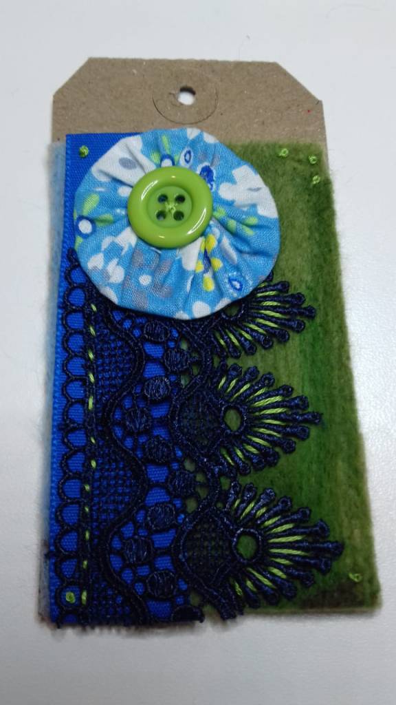 Our 2021 project was based on a challenge set by textile artist Anne Brooke, Sue V coordinated the project for our group. We created a series of mini stitched pieces, one a week for 52 weeks, each with a theme given by Anne Brooke which we attached to a luggage label or similar with the date and a memory of that week written on the reverse of the label.