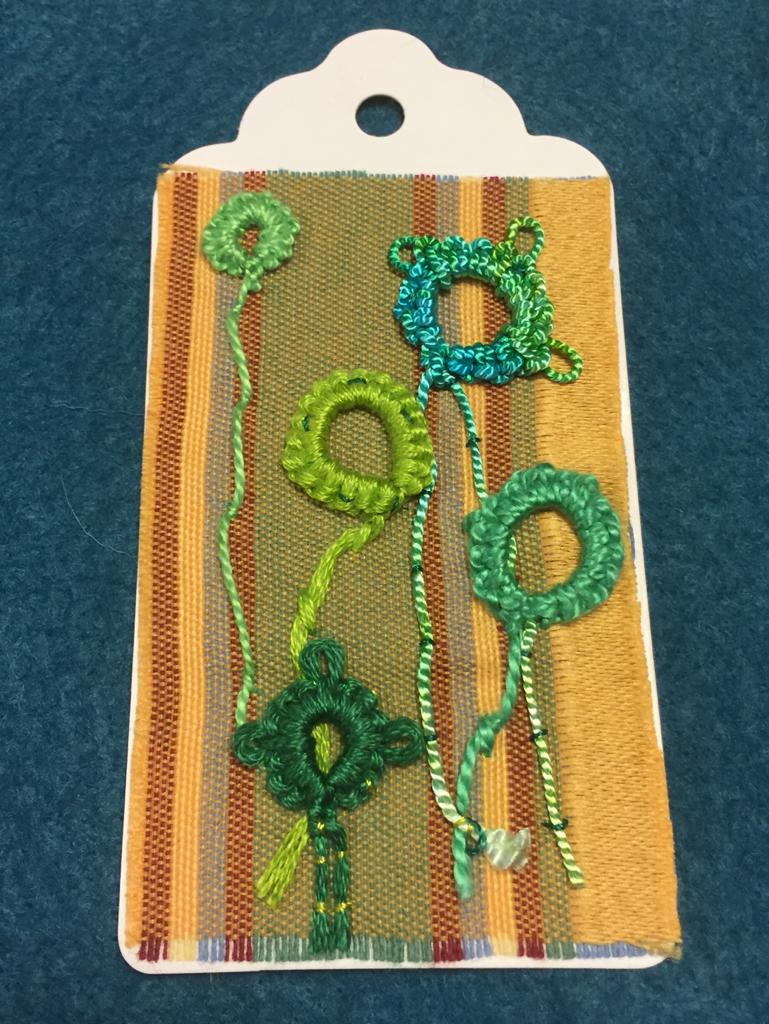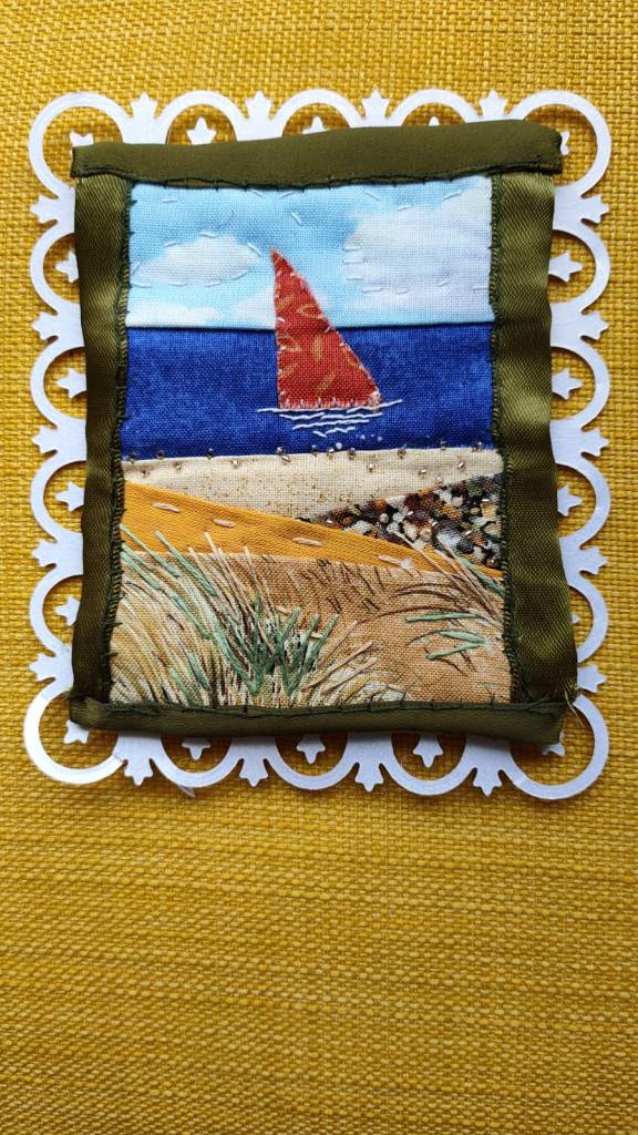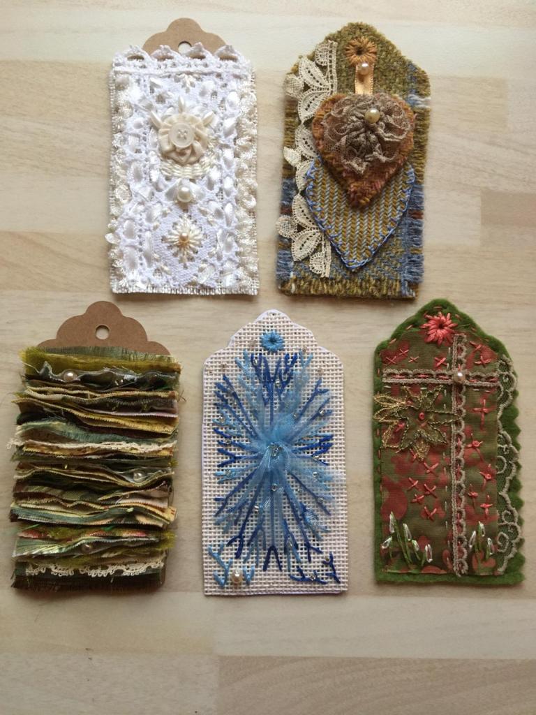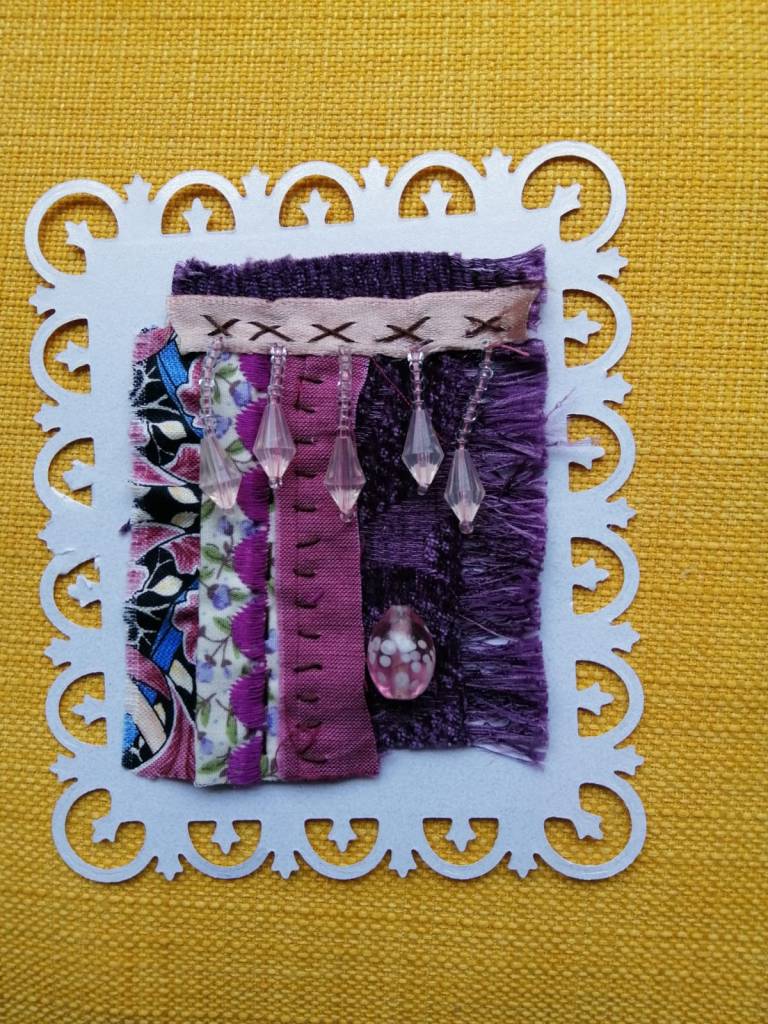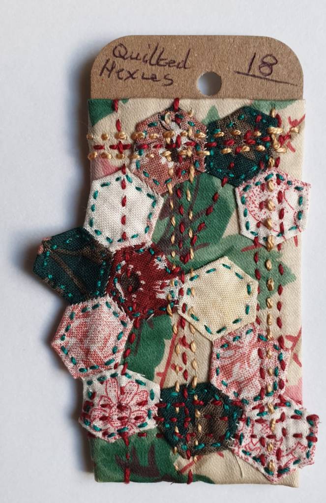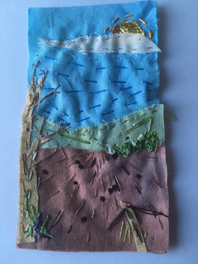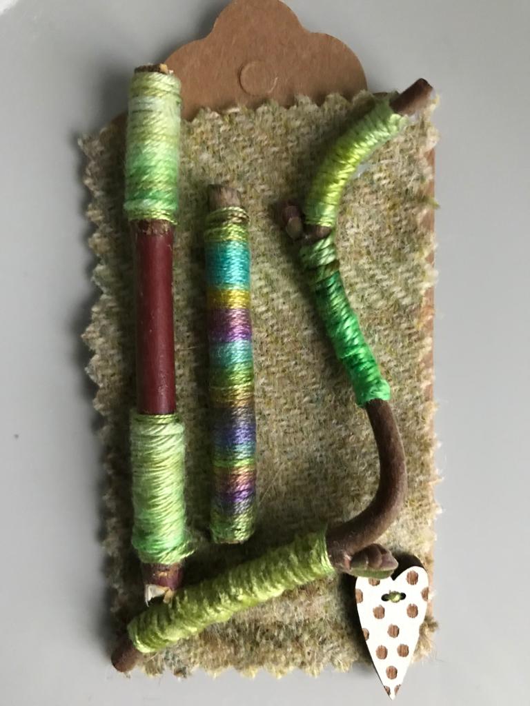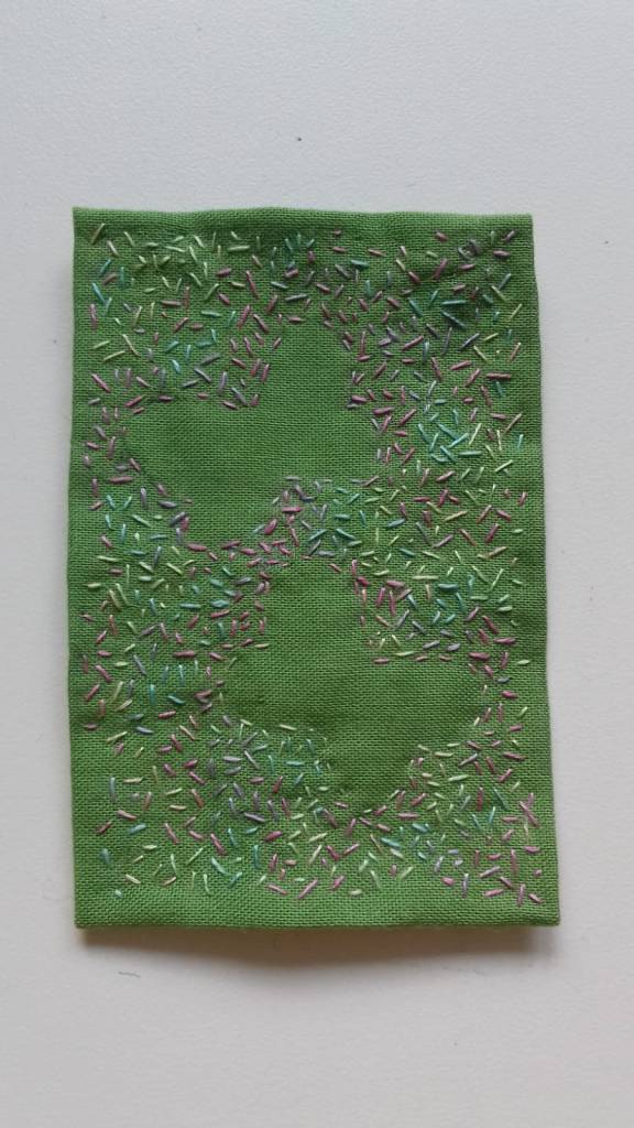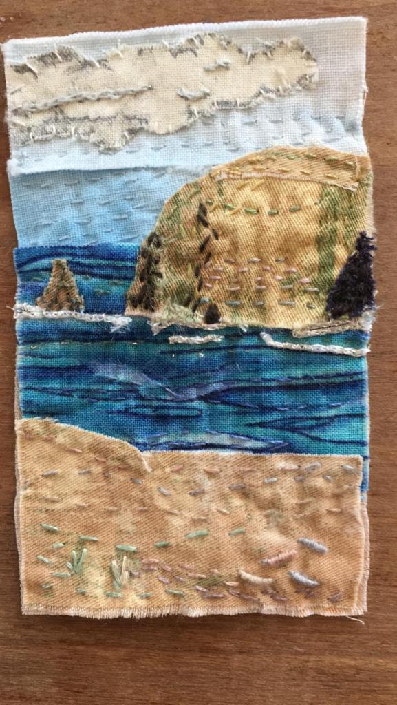 Our 2021 project was based on a challenge set by textile artist Anne Brooke, Sue V coordinated the project for our group. We created a series of mini stitched pieces, one a week for 52 weeks, each with a theme given by Anne Brooke which we attached to a luggage label or similar with the date and a memory of that week written on the reverse of the label.