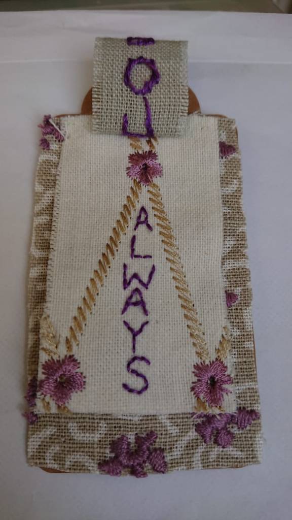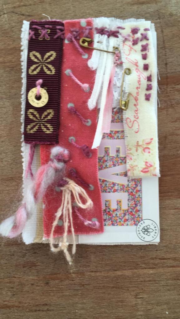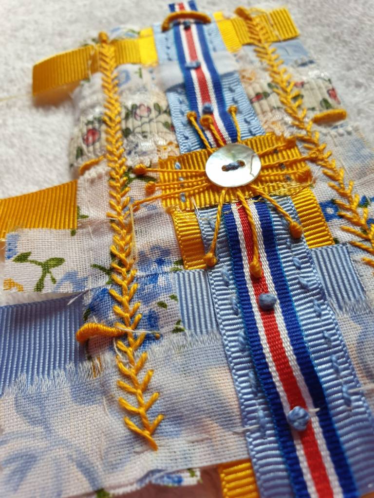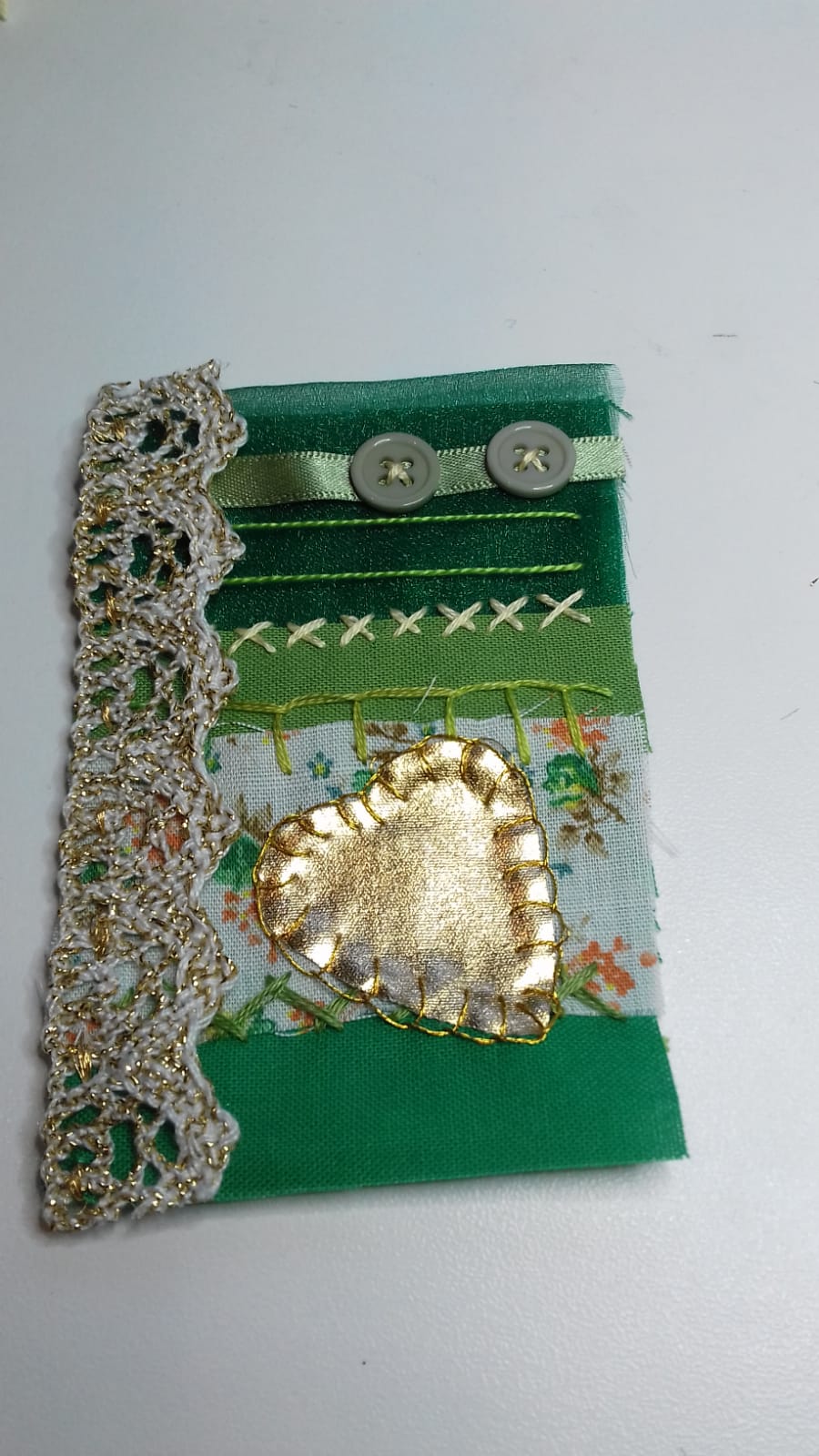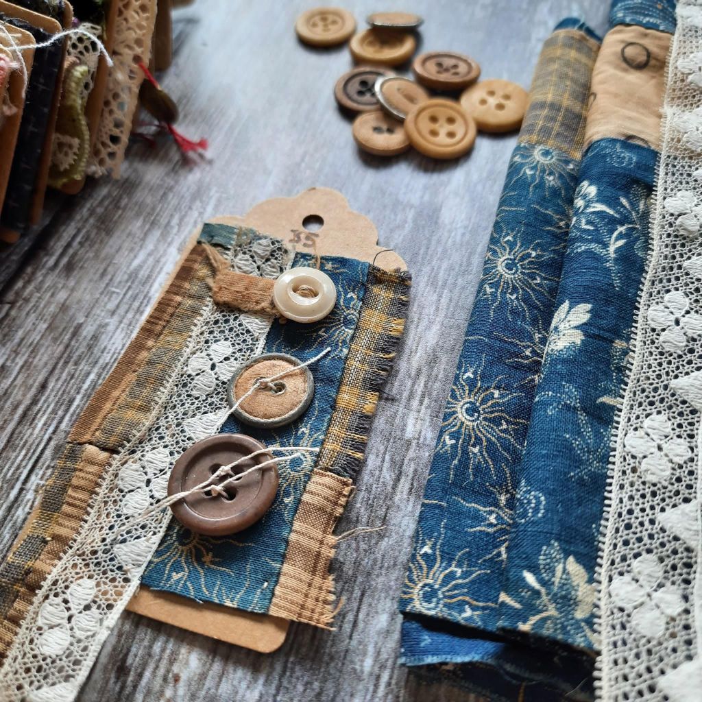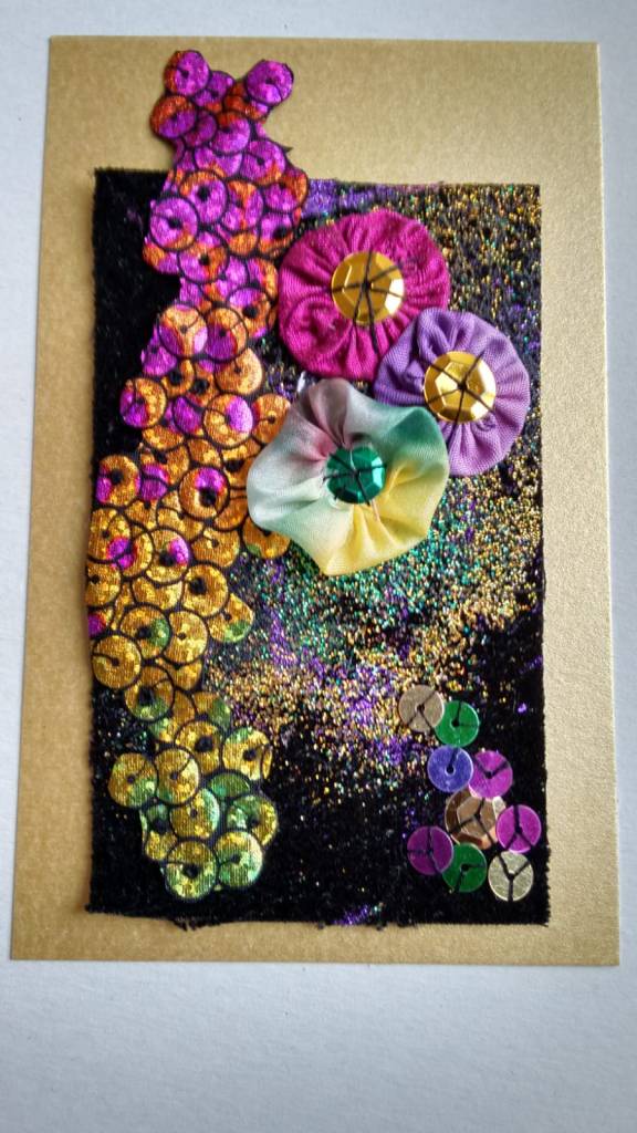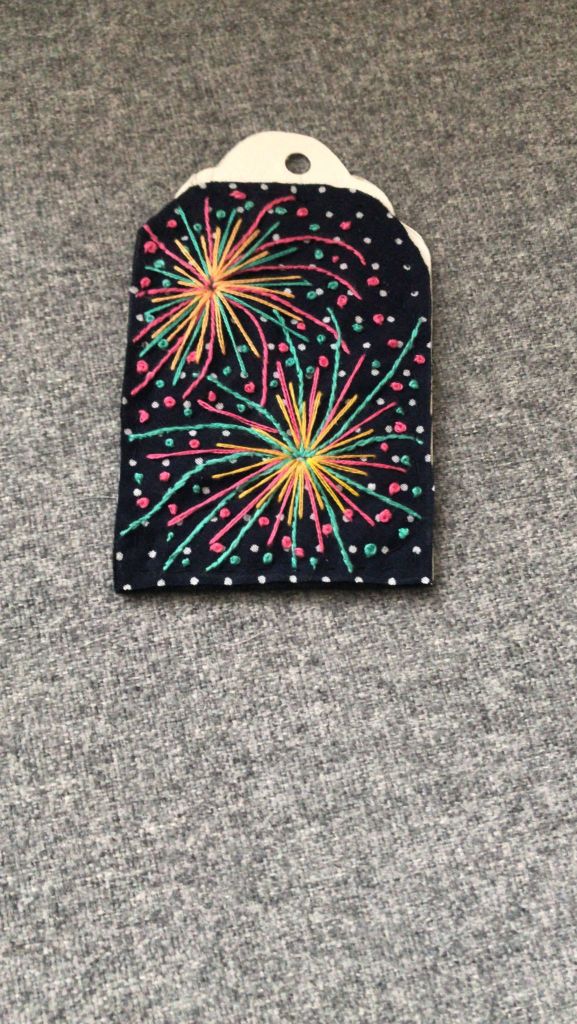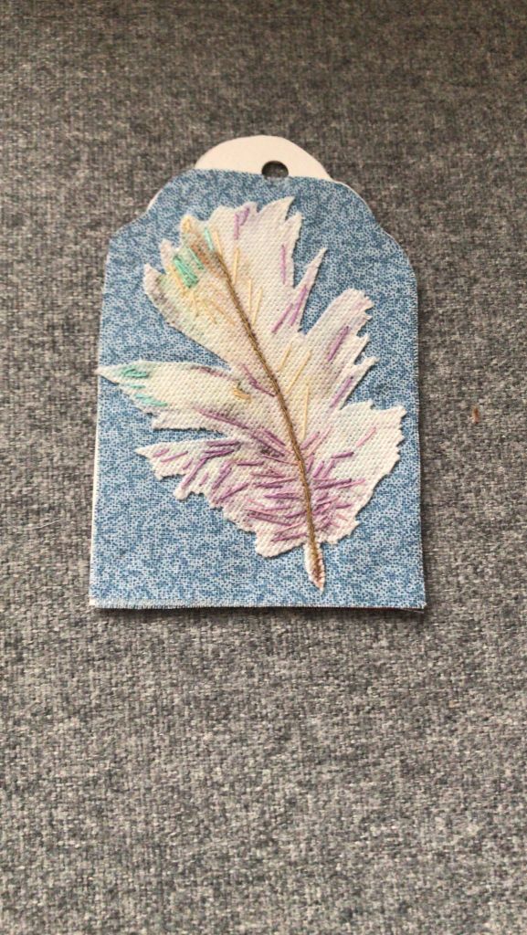 Our 2021 project was based on a challenge set by textile artist Anne Brooke, Sue V coordinated the project for our group. We created a series of mini stitched pieces, one a week for 52 weeks, each with a theme given by Anne Brooke which we attached to a luggage label or similar with the date and a memory of that week written on the reverse of the label.