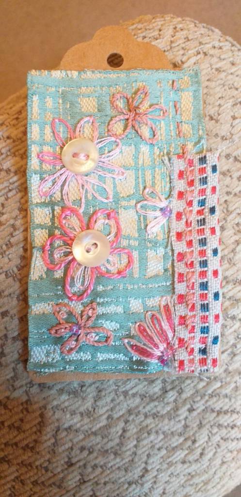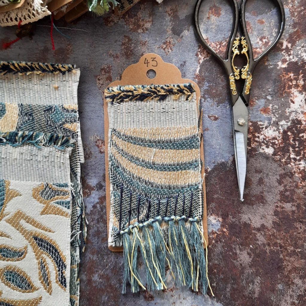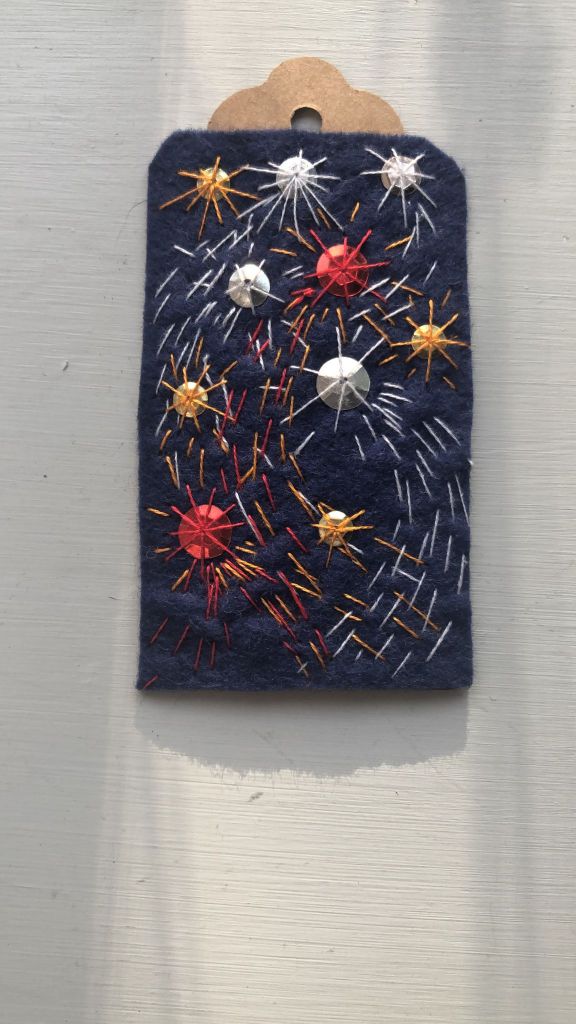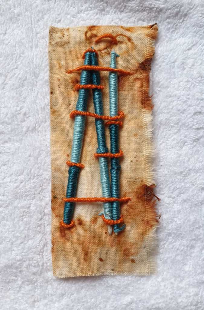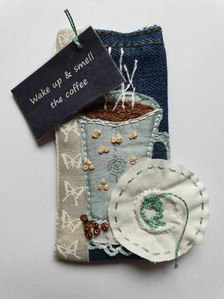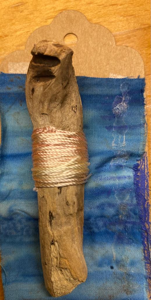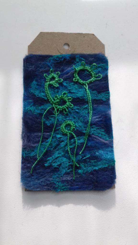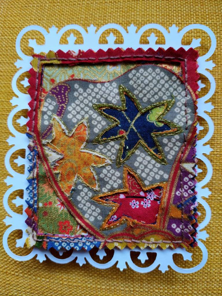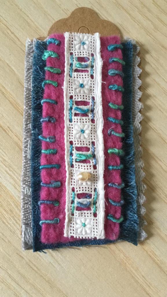 Our 2021 project was based on a challenge set by textile artist Anne Brooke, Sue V coordinated the project for our group. We created a series of mini stitched pieces, one a week for 52 weeks, each with a theme given by Anne Brooke which we attached to a luggage label or similar with the date and a memory of that week written on the reverse of the label.