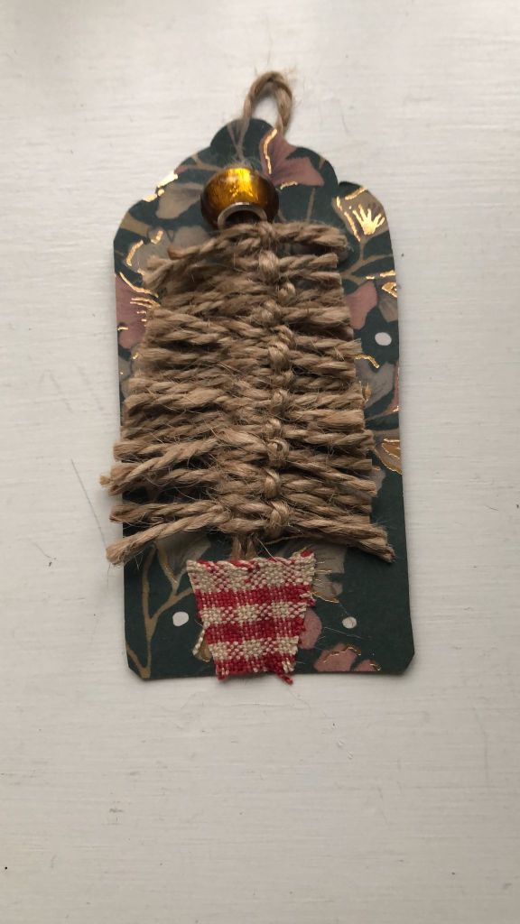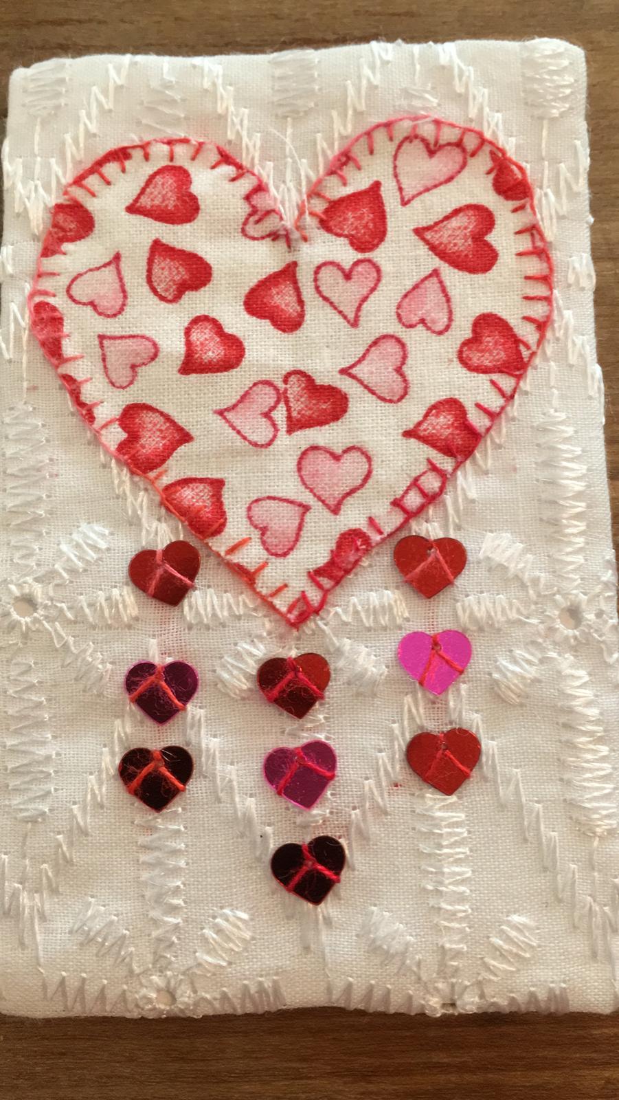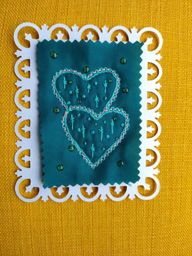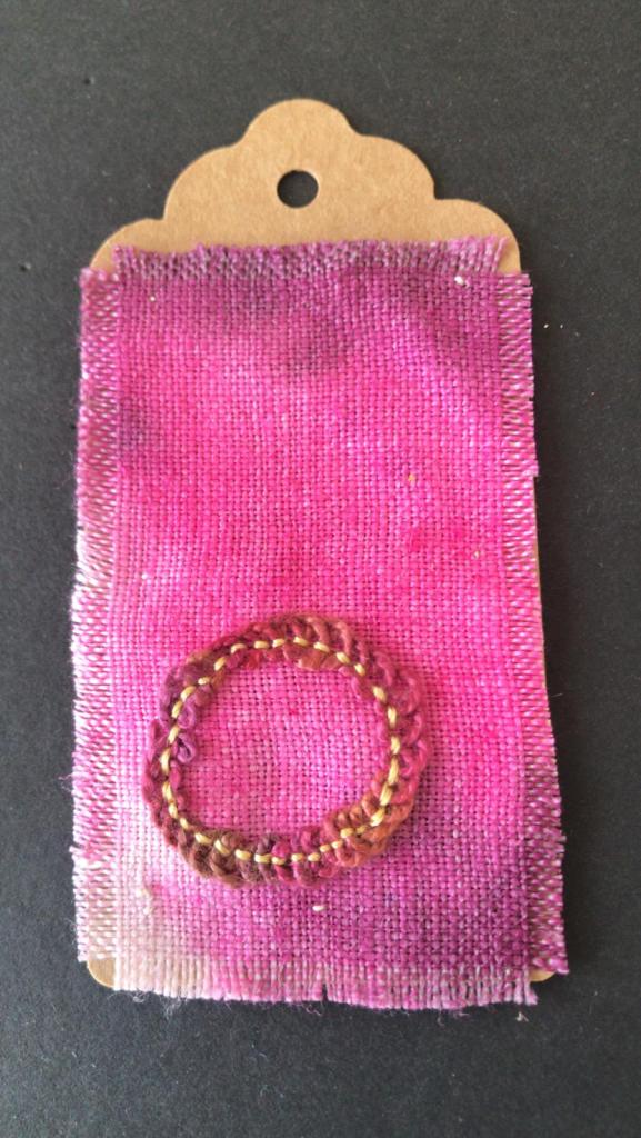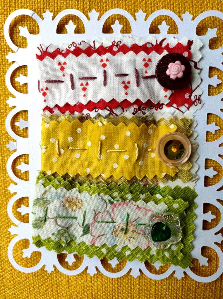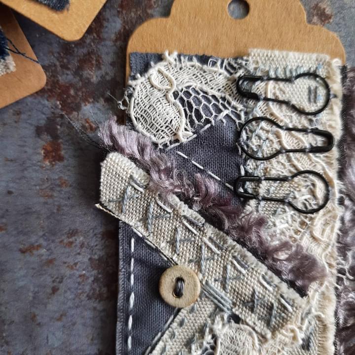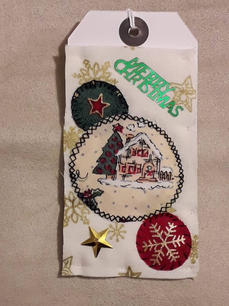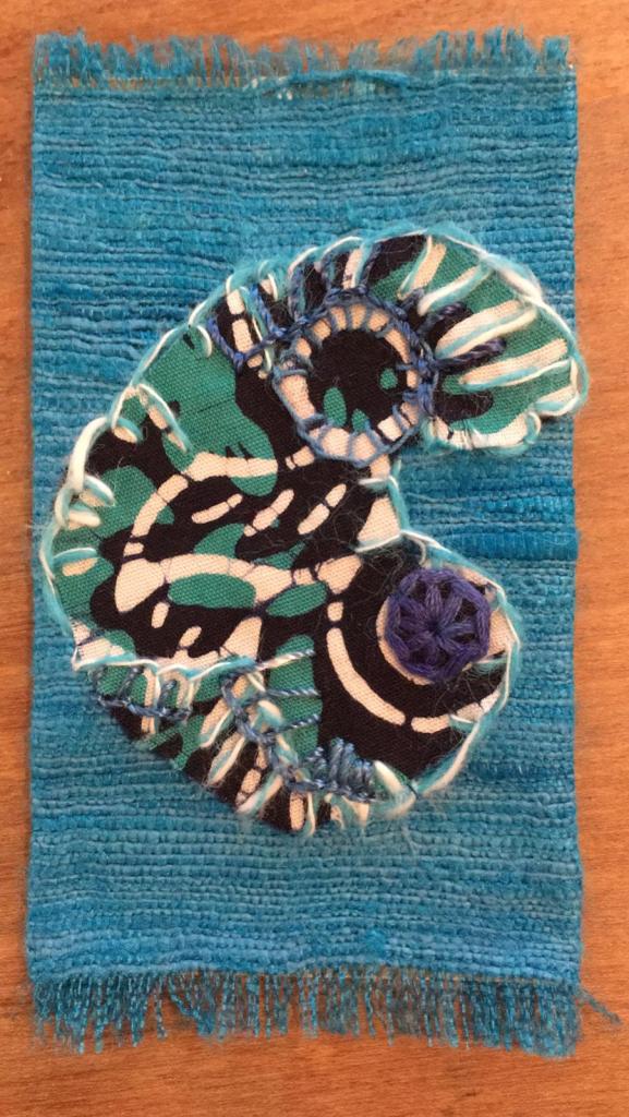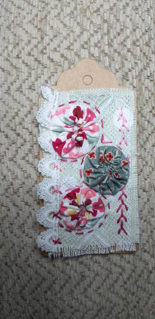 Our 2021 project was based on a challenge set by textile artist Anne Brooke, Sue V coordinated the project for our group. We created a series of mini stitched pieces, one a week for 52 weeks, each with a theme given by Anne Brooke which we attached to a luggage label or similar with the date and a memory of that week written on the reverse of the label.