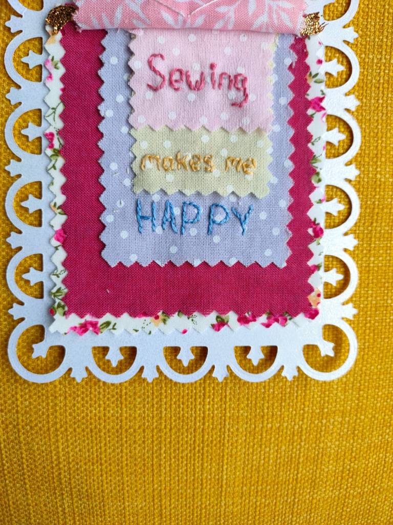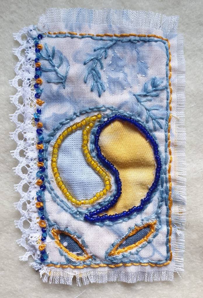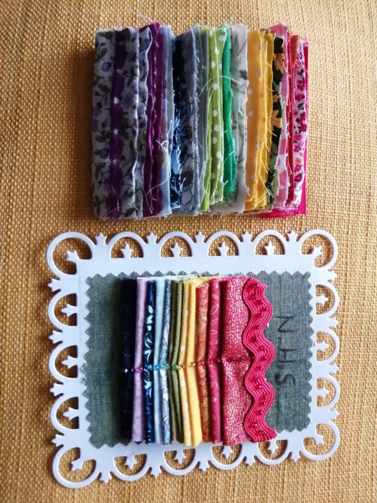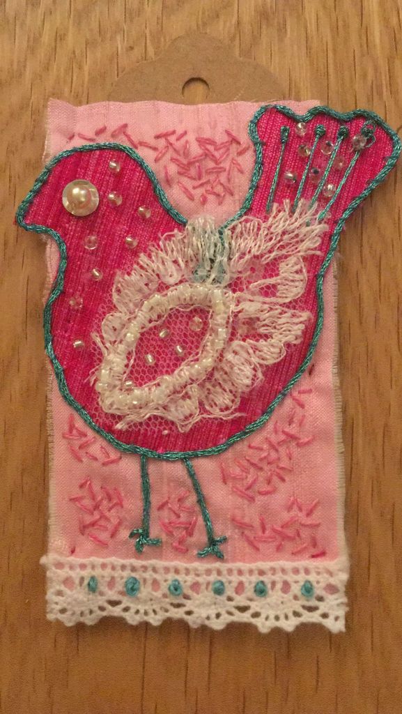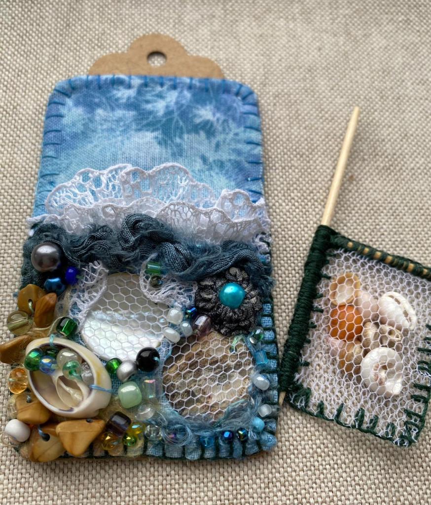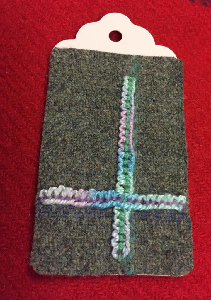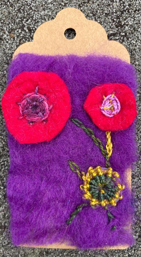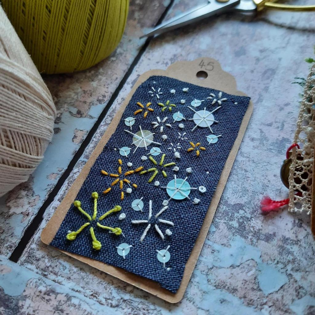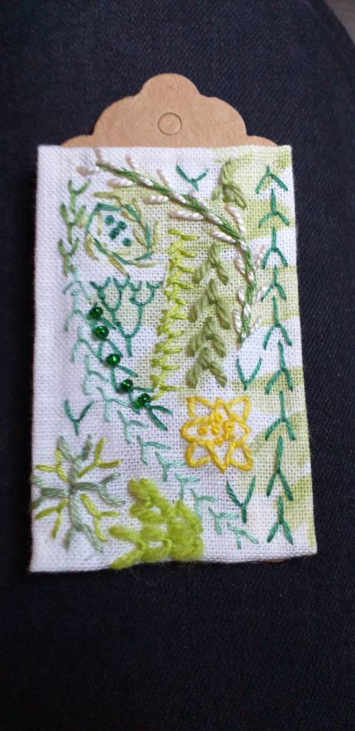 Our 2021 project was based on a challenge set by textile artist Anne Brooke, Sue V coordinated the project for our group. We created a series of mini stitched pieces, one a week for 52 weeks, each with a theme given by Anne Brooke which we attached to a luggage label or similar with the date and a memory of that week written on the reverse of the label.