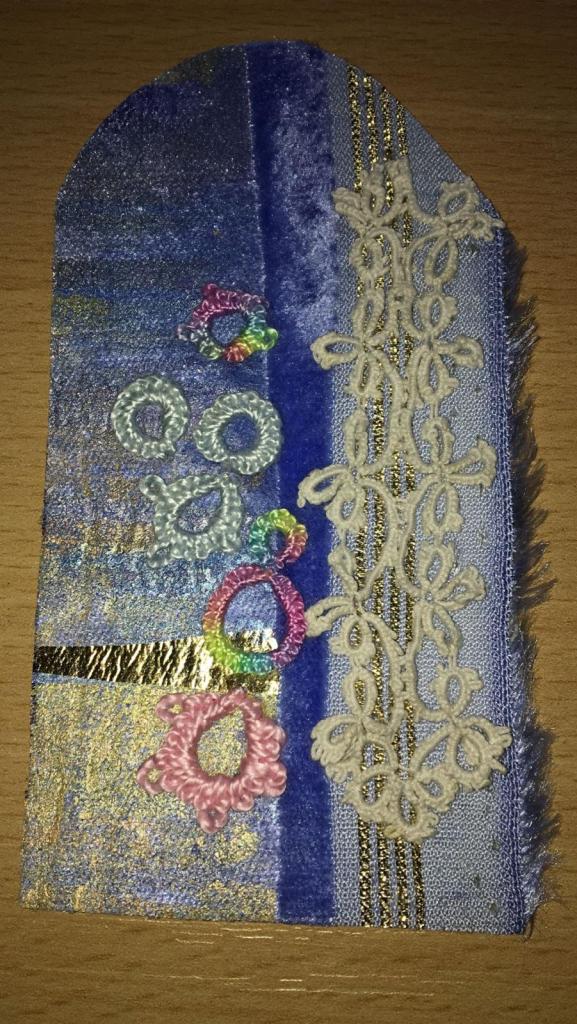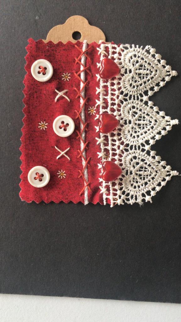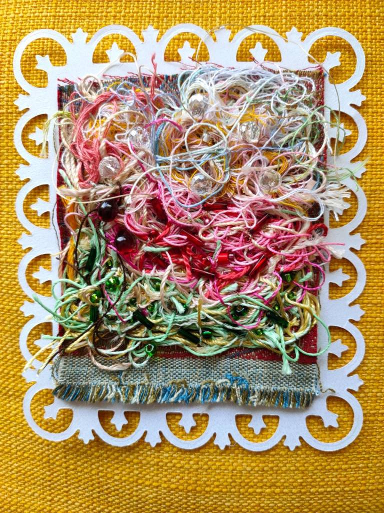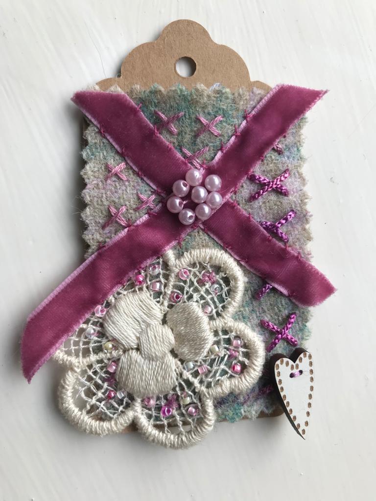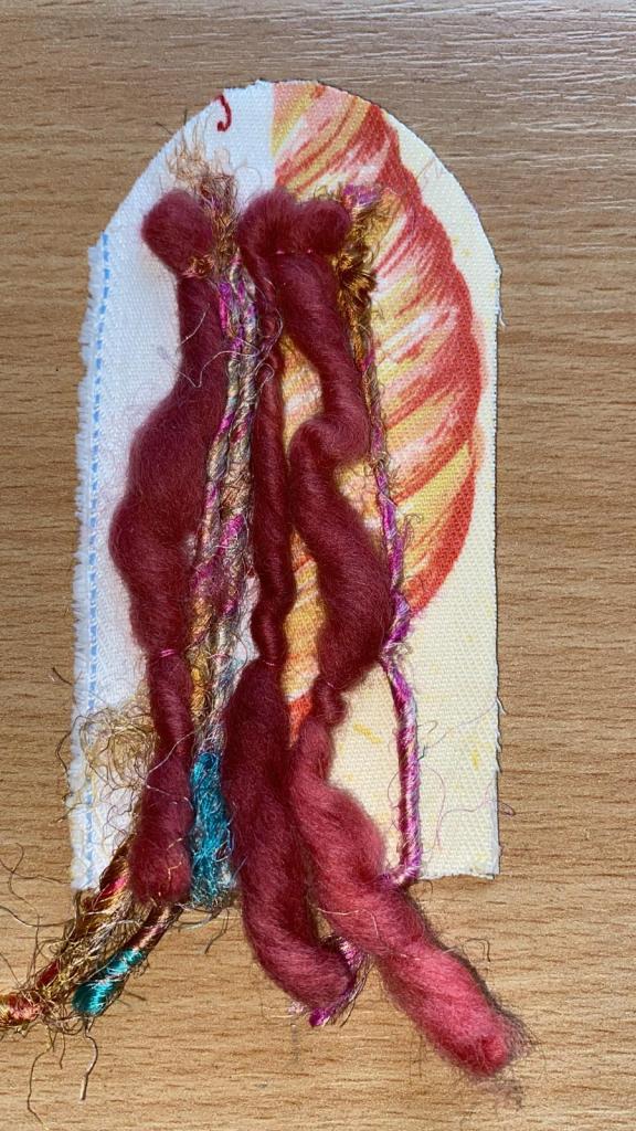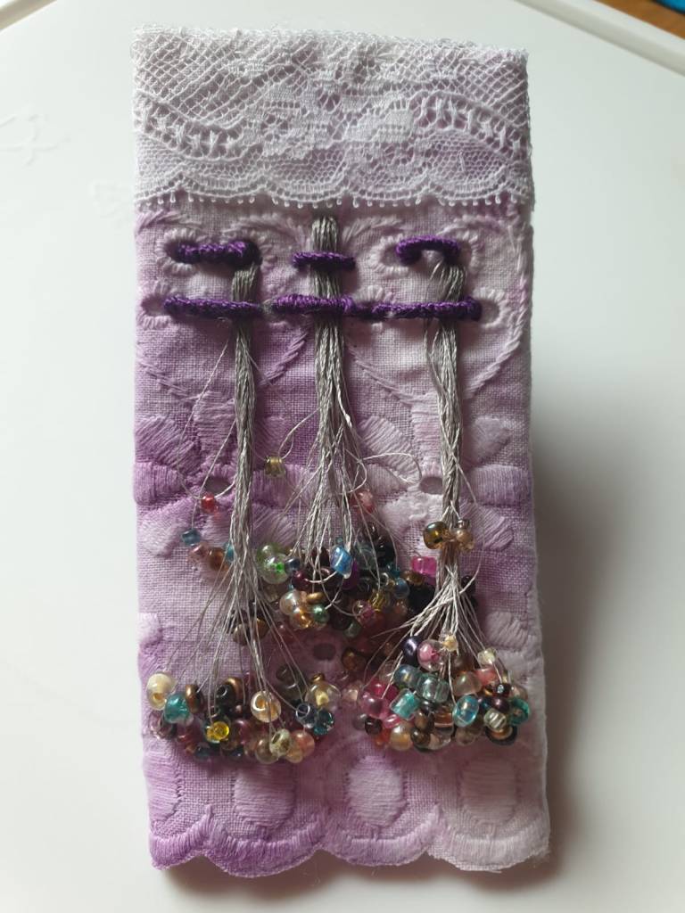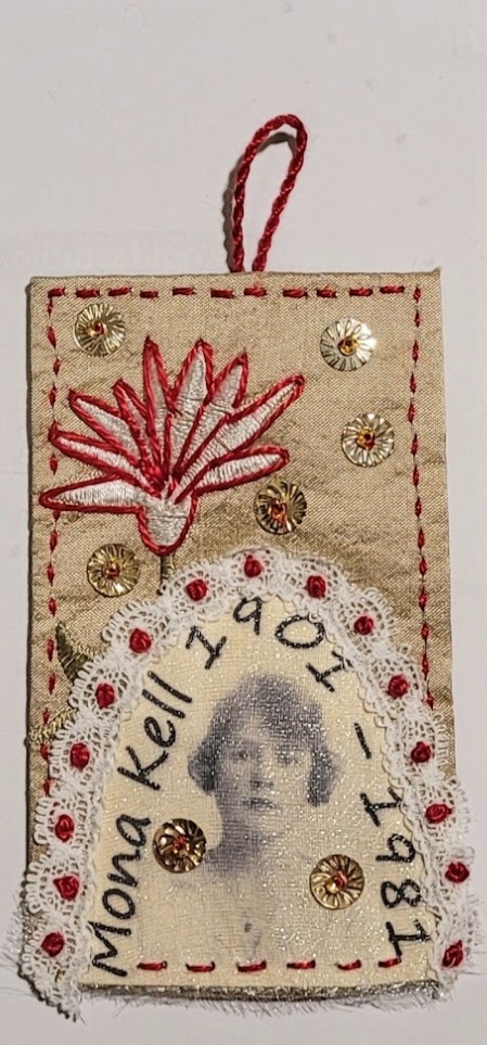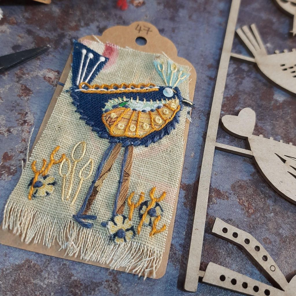 Our 2021 project was based on a challenge set by textile artist Anne Brooke, Sue V coordinated the project for our group. We created a series of mini stitched pieces, one a week for 52 weeks, each with a theme given by Anne Brooke which we attached to a luggage label or similar with the date and a memory of that week written on the reverse of the label.