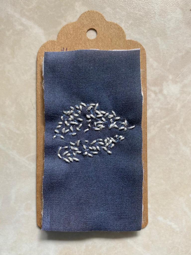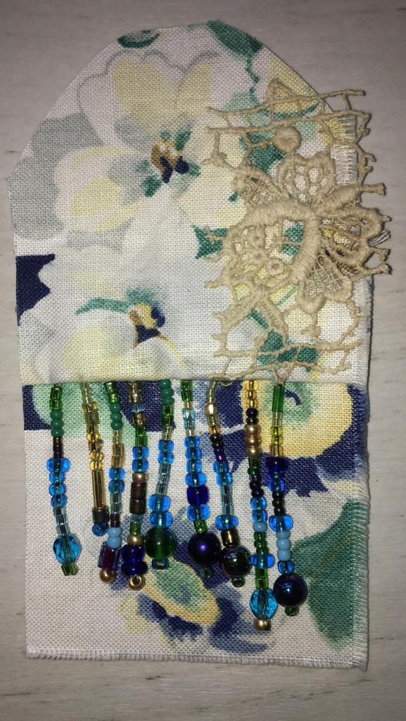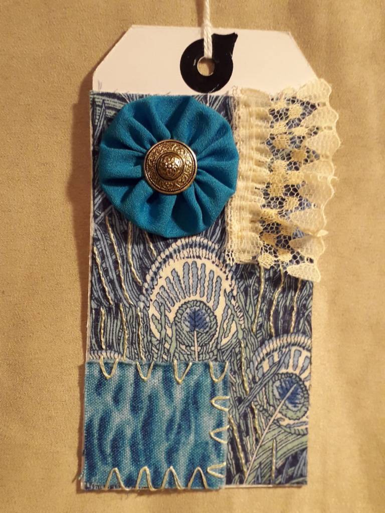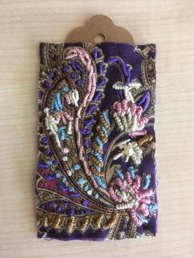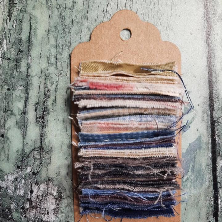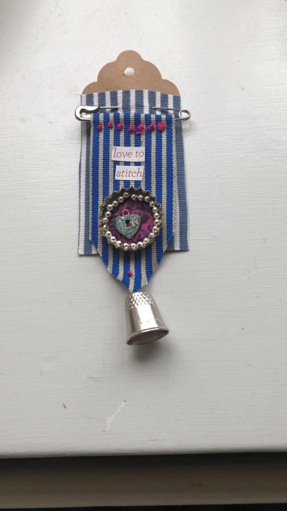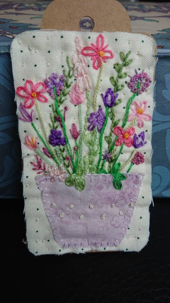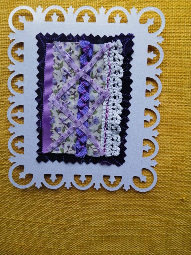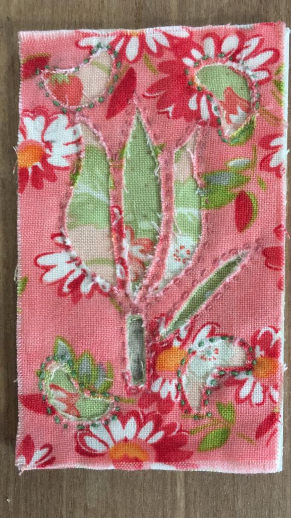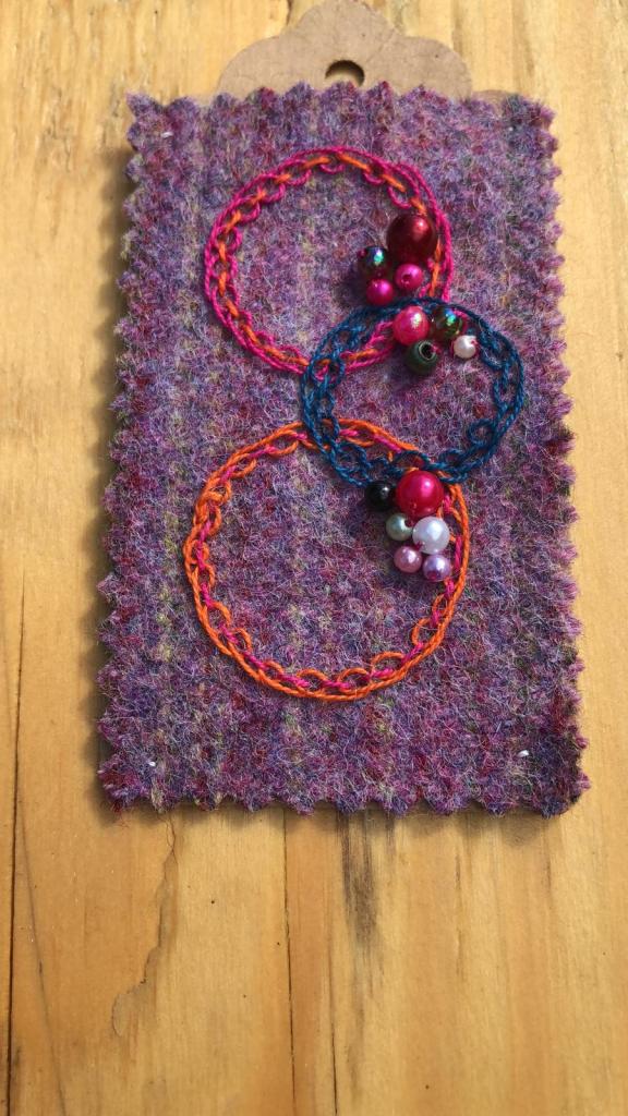 Our 2021 project was based on a challenge set by textile artist Anne Brooke, Sue V coordinated the project for our group. We created a series of mini stitched pieces, one a week for 52 weeks, each with a theme given by Anne Brooke which we attached to a luggage label or similar with the date and a memory of that week written on the reverse of the label.
