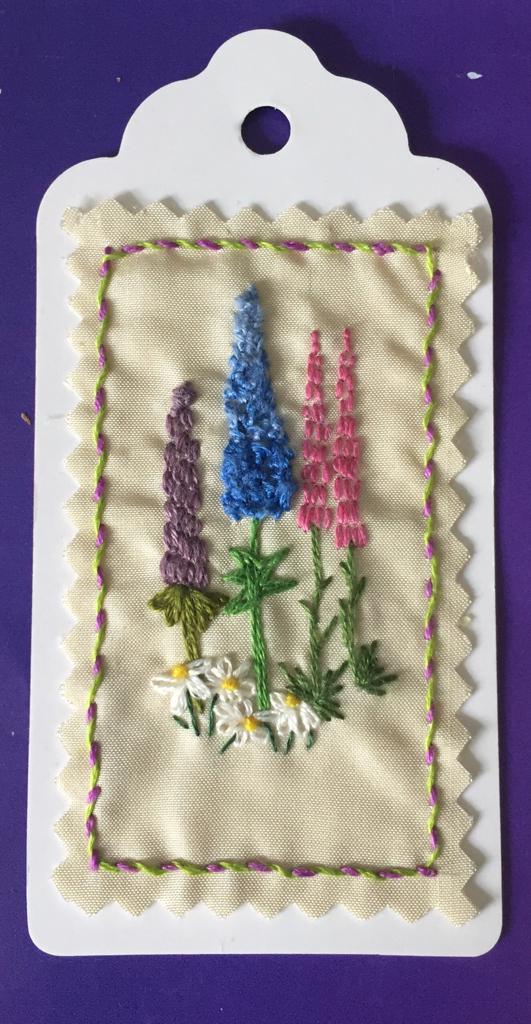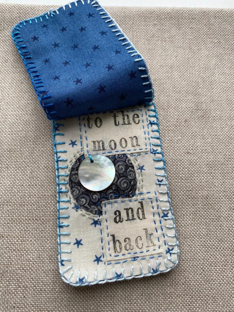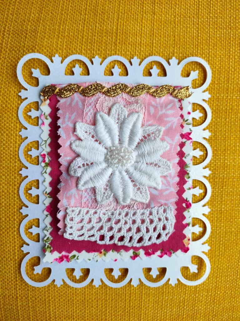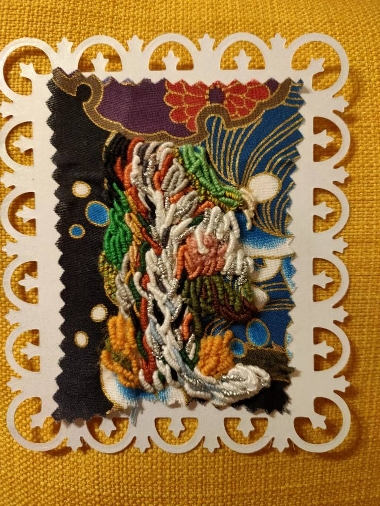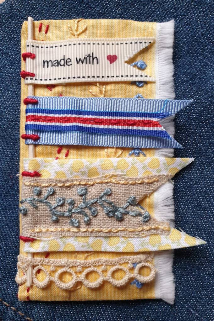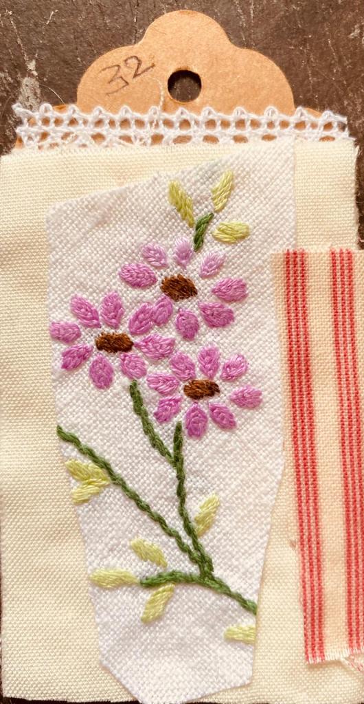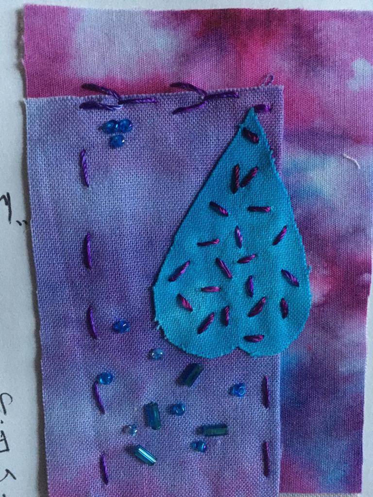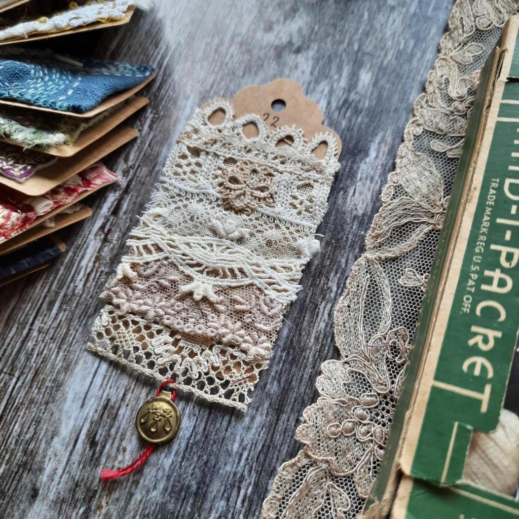 Our 2021 project was based on a challenge set by textile artist Anne Brooke, Sue V coordinated the project for our group. We created a series of mini stitched pieces, one a week for 52 weeks, each with a theme given by Anne Brooke which we attached to a luggage label or similar with the date and a memory of that week written on the reverse of the label.