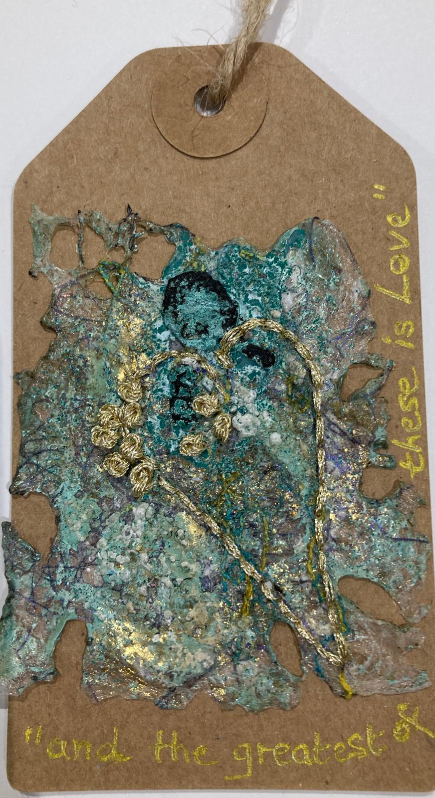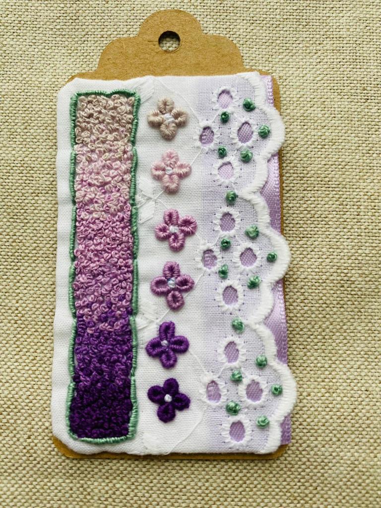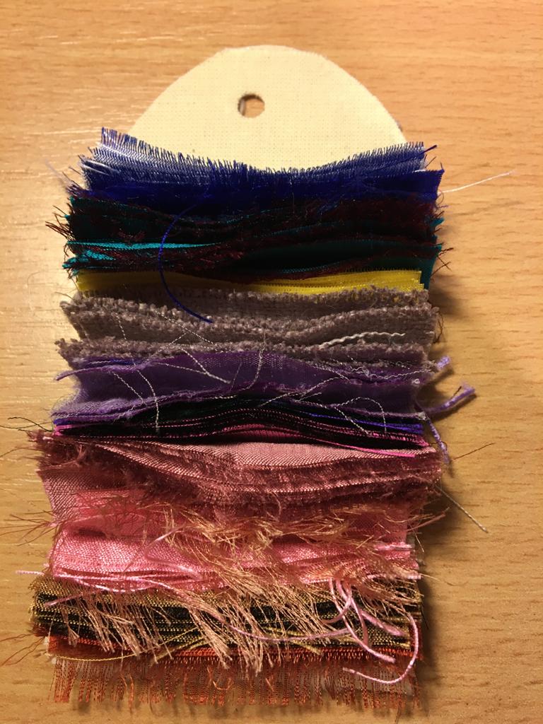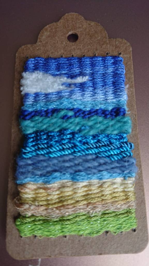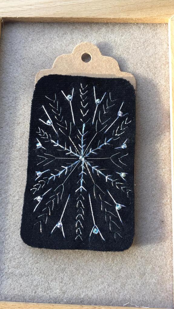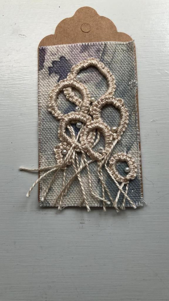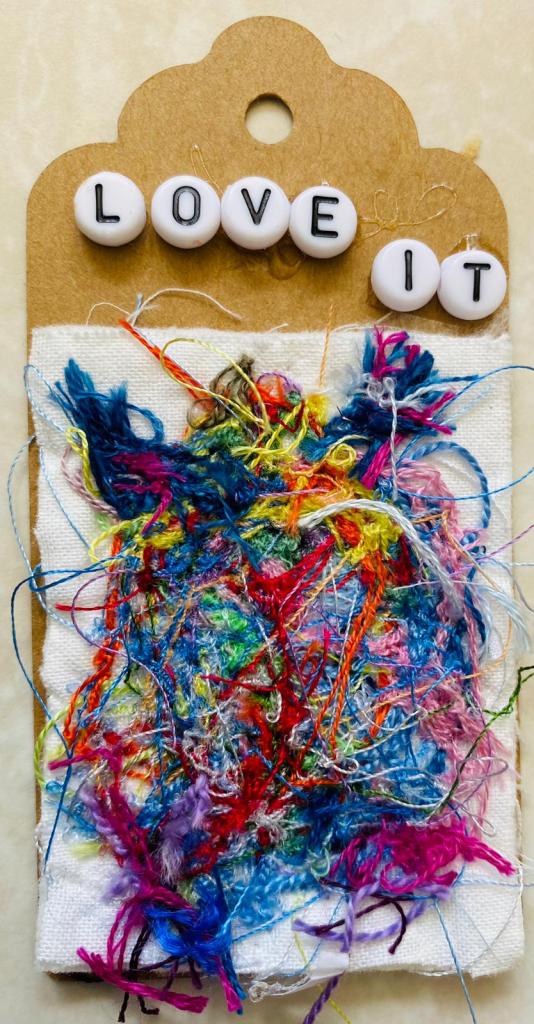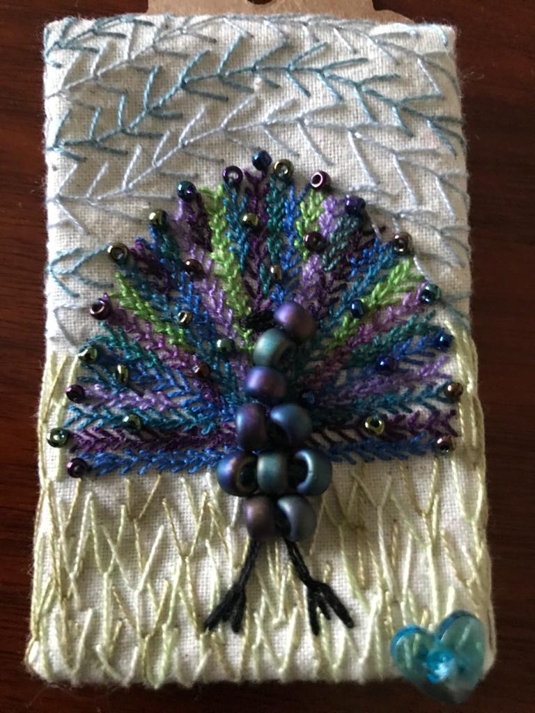 Our 2021 project was based on a challenge set by textile artist Anne Brooke, Sue V coordinated the project for our group. We created a series of mini stitched pieces, one a week for 52 weeks, each with a theme given by Anne Brooke which we attached to a luggage label or similar with the date and a memory of that week written on the reverse of the label.