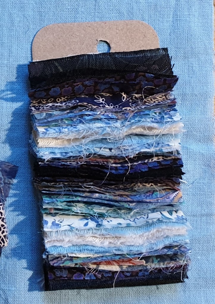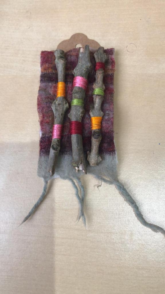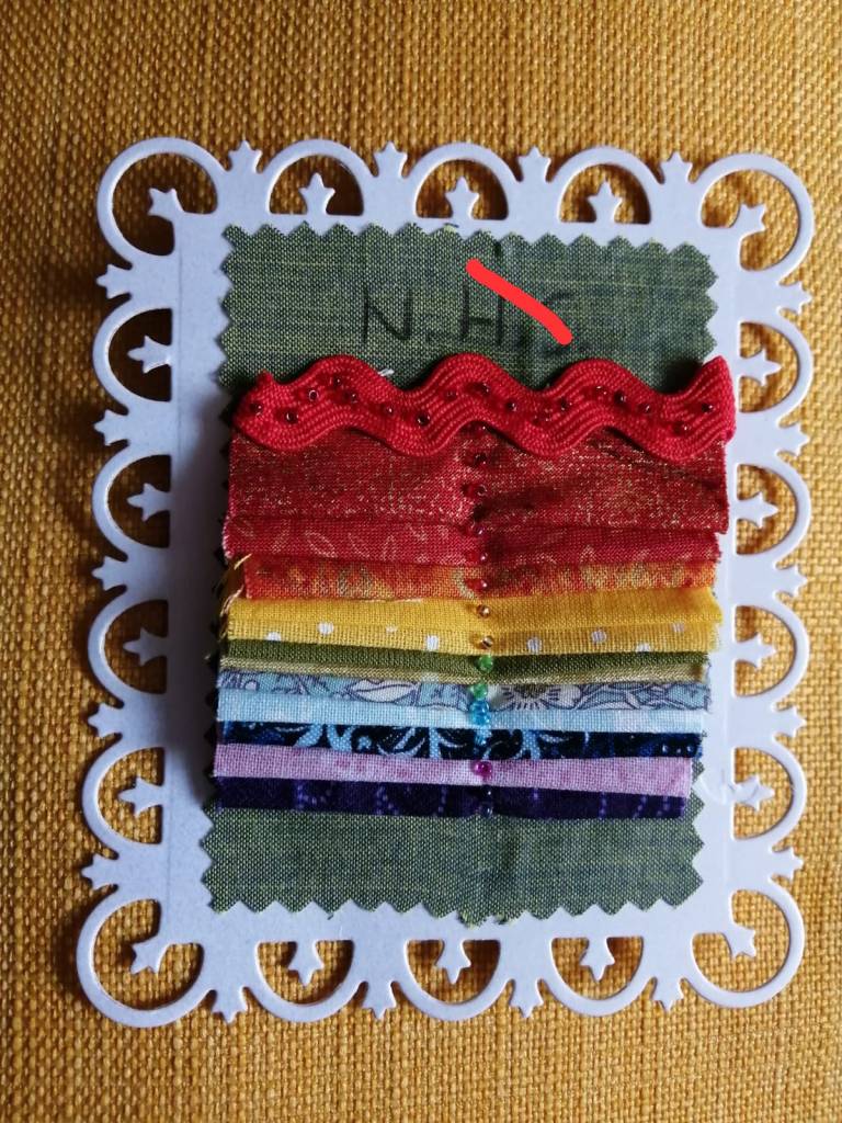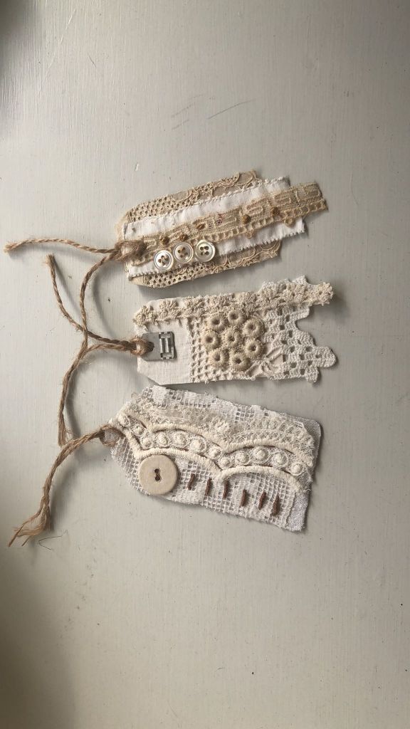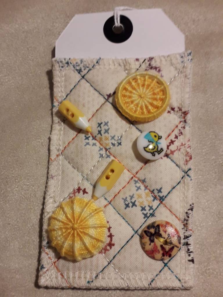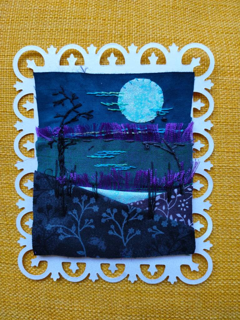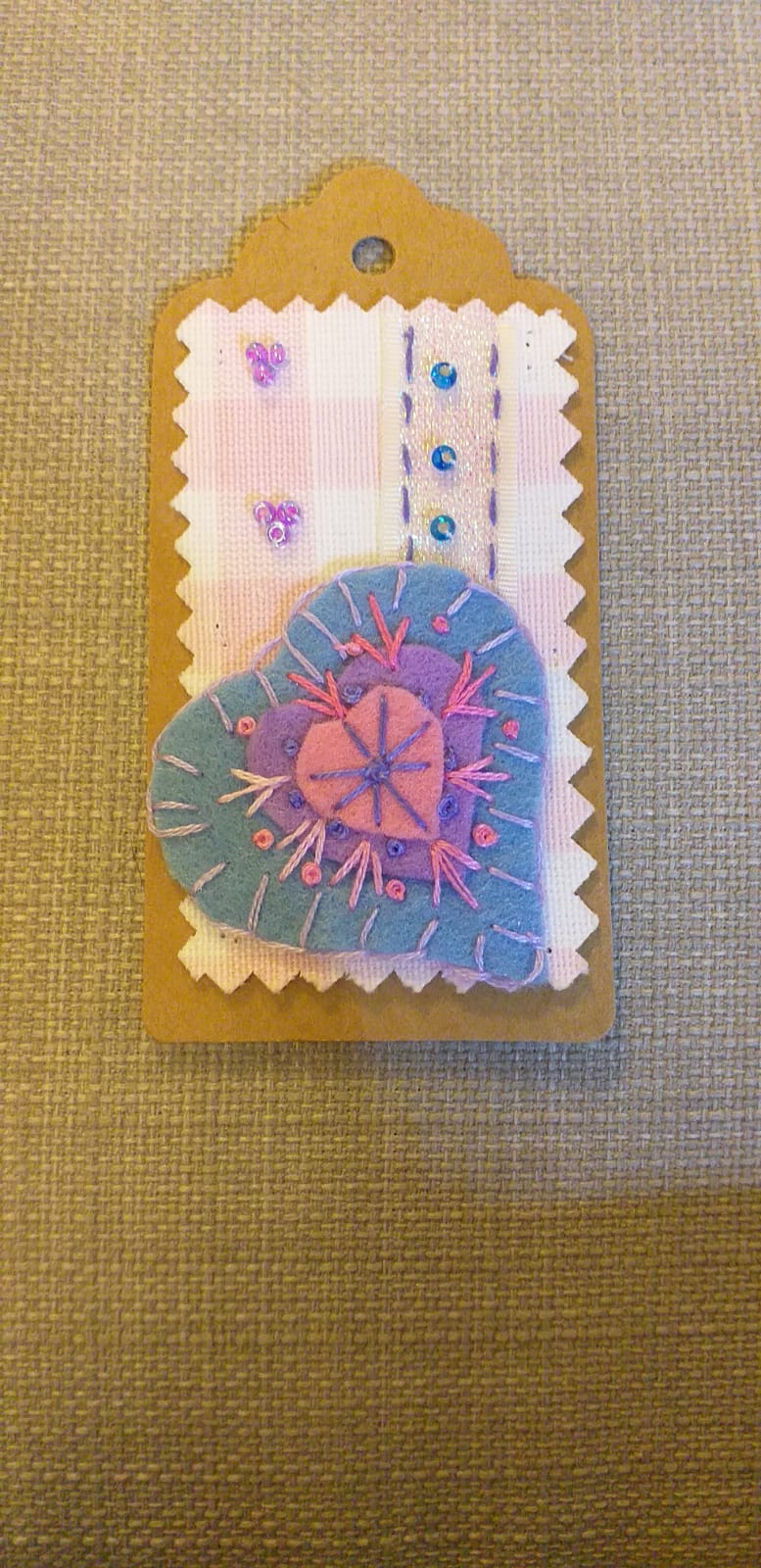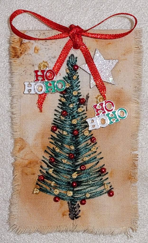 Our 2021 project was based on a challenge set by textile artist Anne Brooke, Sue V coordinated the project for our group. We created a series of mini stitched pieces, one a week for 52 weeks, each with a theme given by Anne Brooke which we attached to a luggage label or similar with the date and a memory of that week written on the reverse of the label.