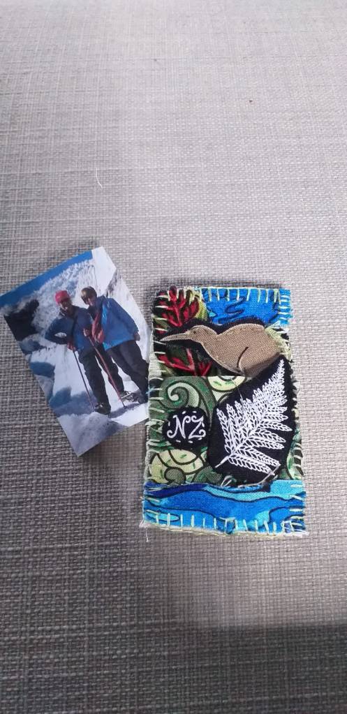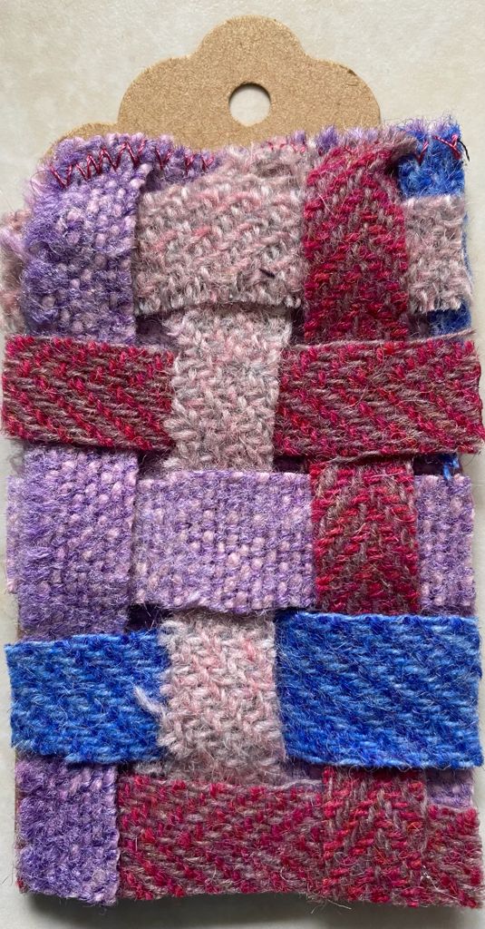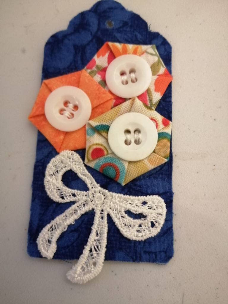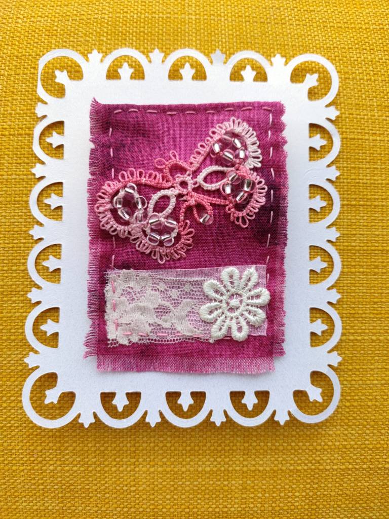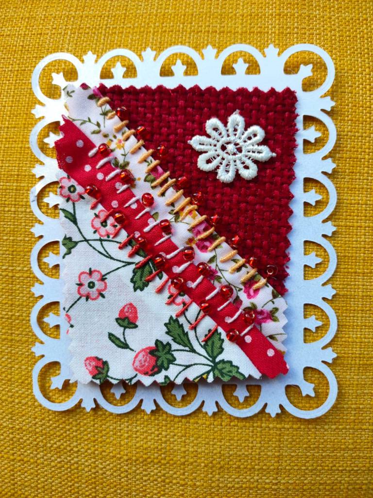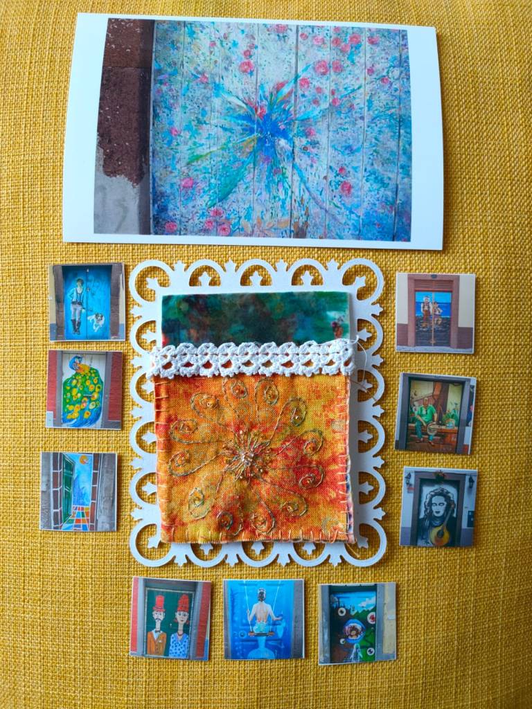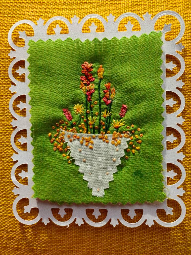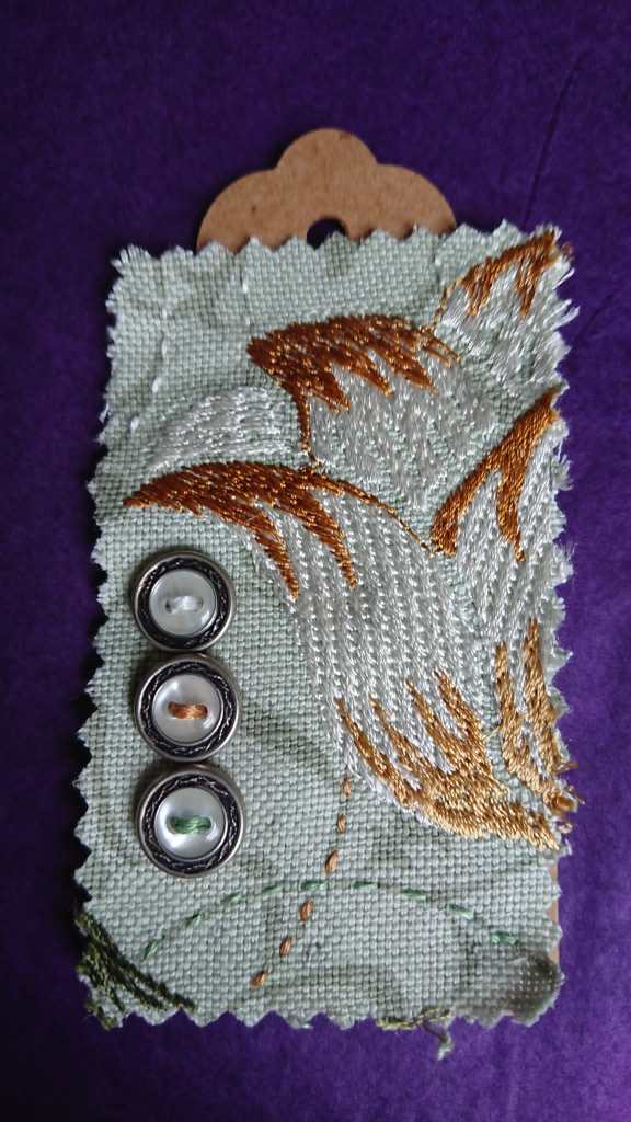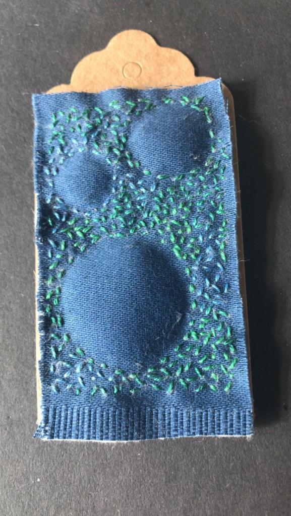 Our 2021 project was based on a challenge set by textile artist Anne Brooke, Sue V coordinated the project for our group. We created a series of mini stitched pieces, one a week for 52 weeks, each with a theme given by Anne Brooke which we attached to a luggage label or similar with the date and a memory of that week written on the reverse of the label.