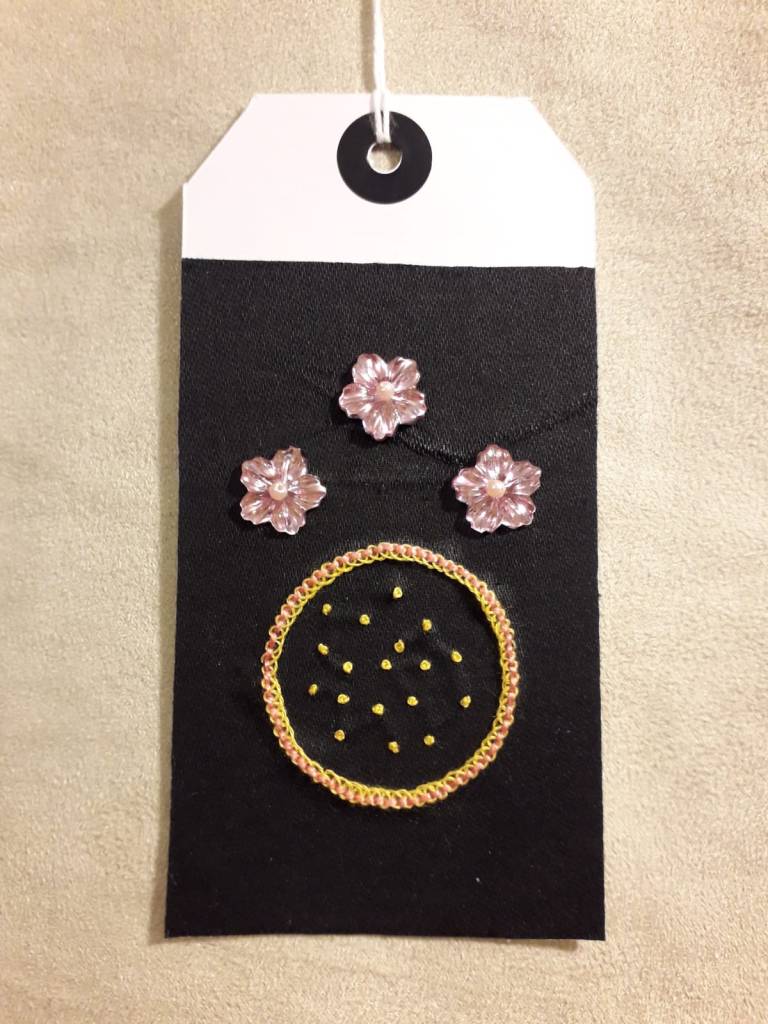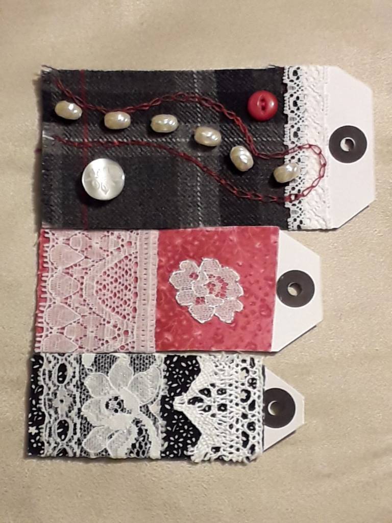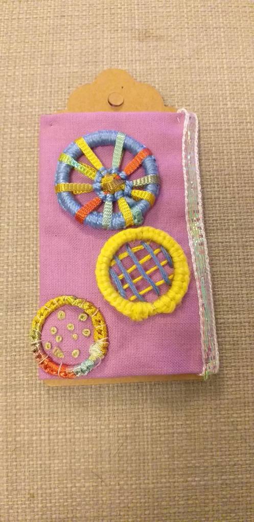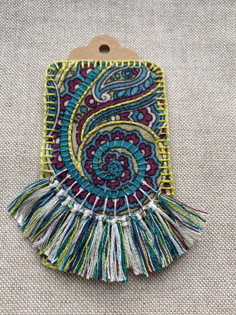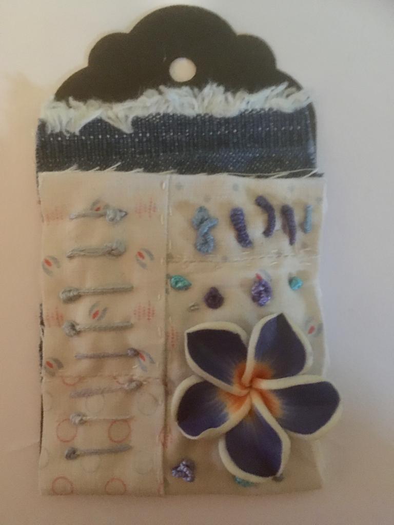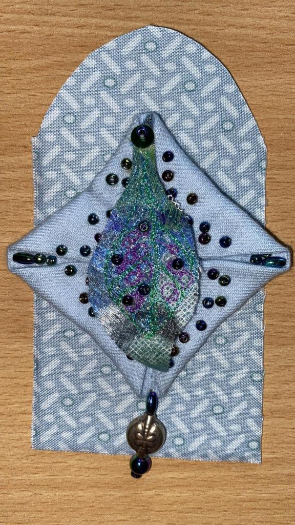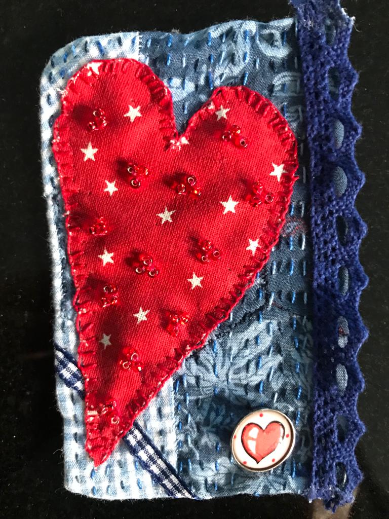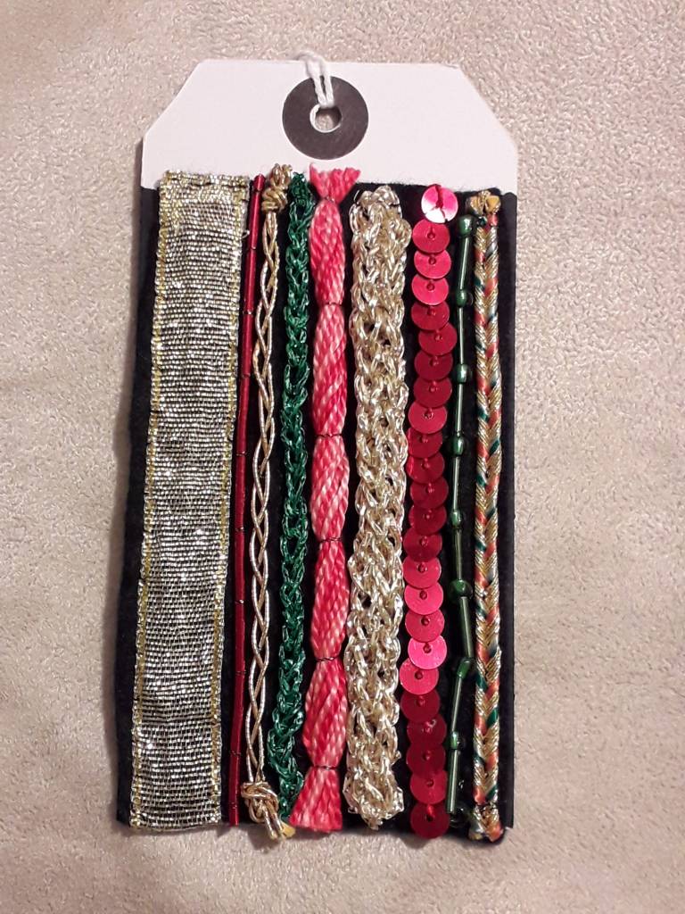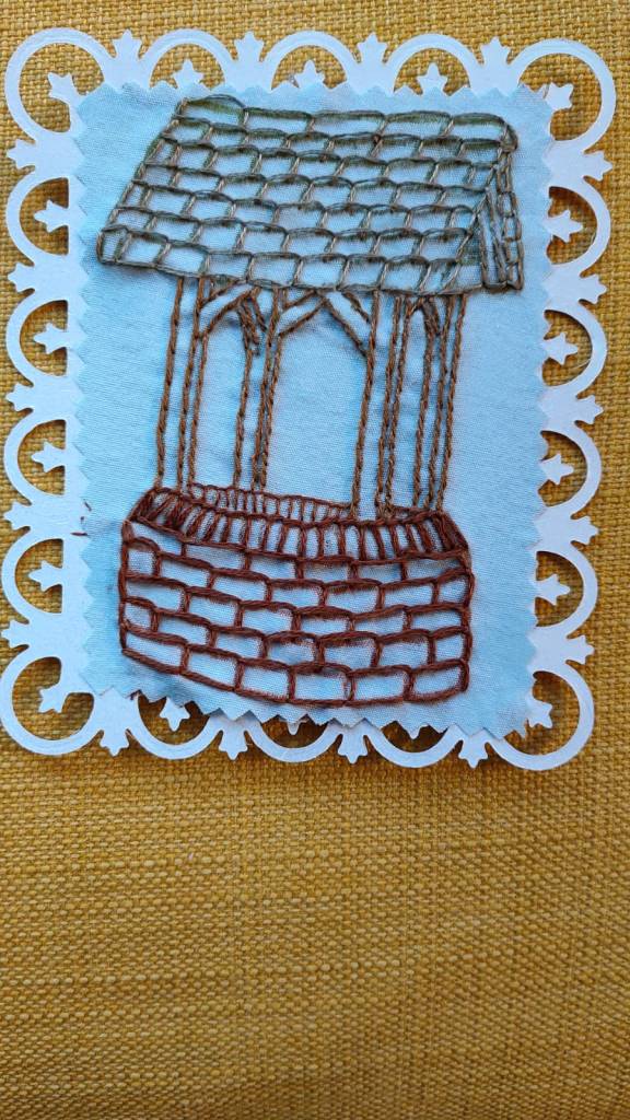 Our 2021 project was based on a challenge set by textile artist Anne Brooke, Sue V coordinated the project for our group. We created a series of mini stitched pieces, one a week for 52 weeks, each with a theme given by Anne Brooke which we attached to a luggage label or similar with the date and a memory of that week written on the reverse of the label.
